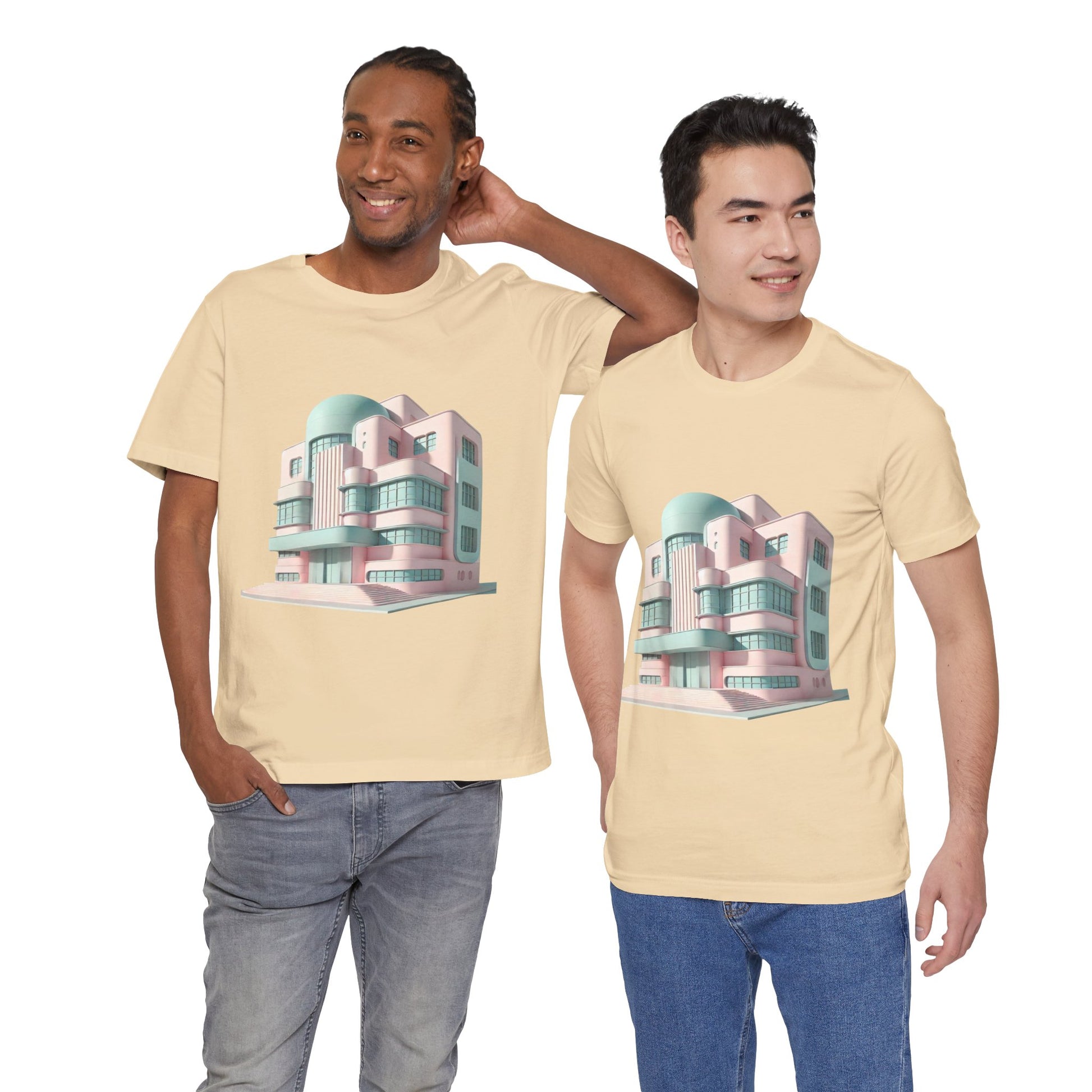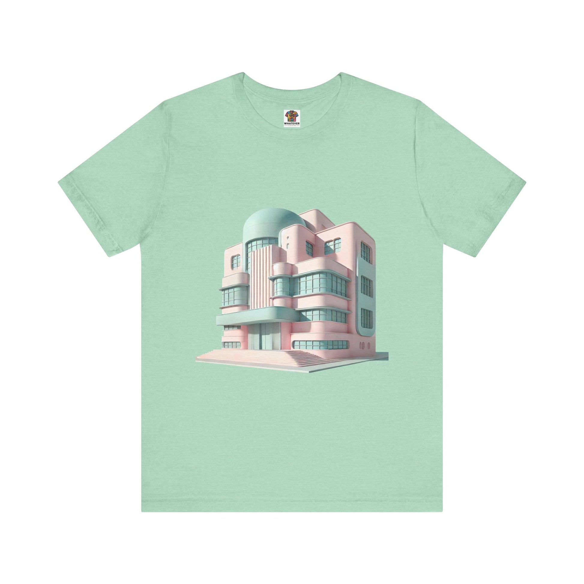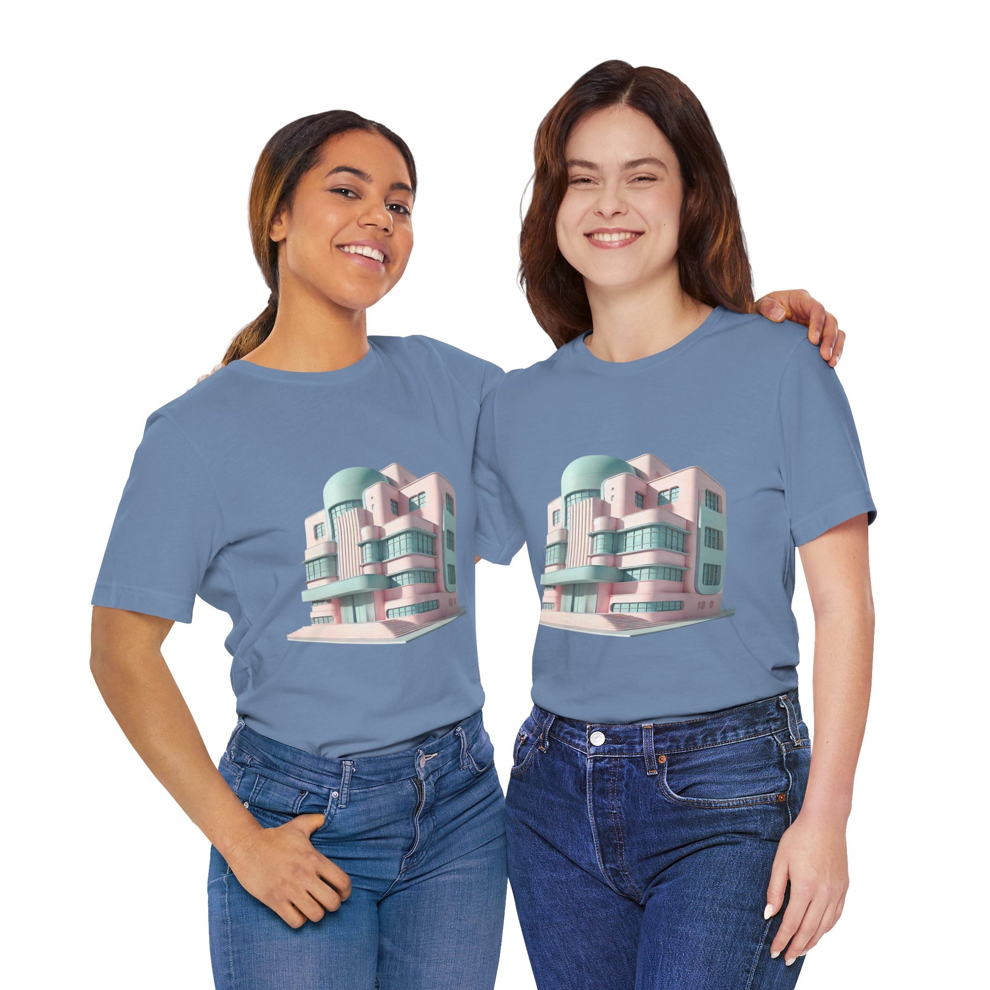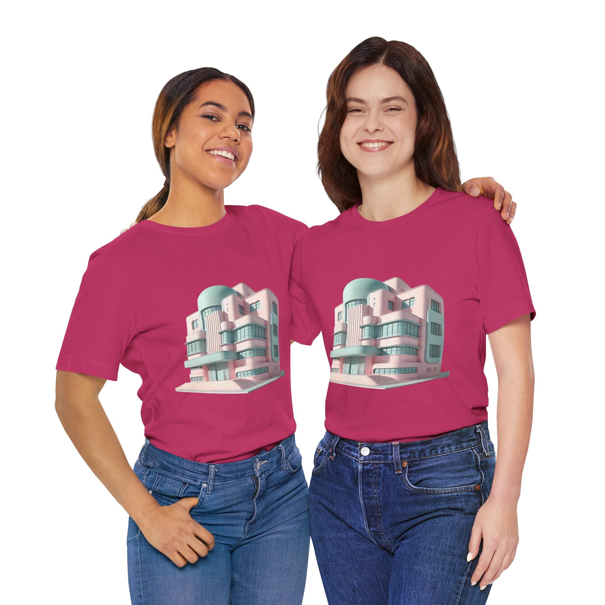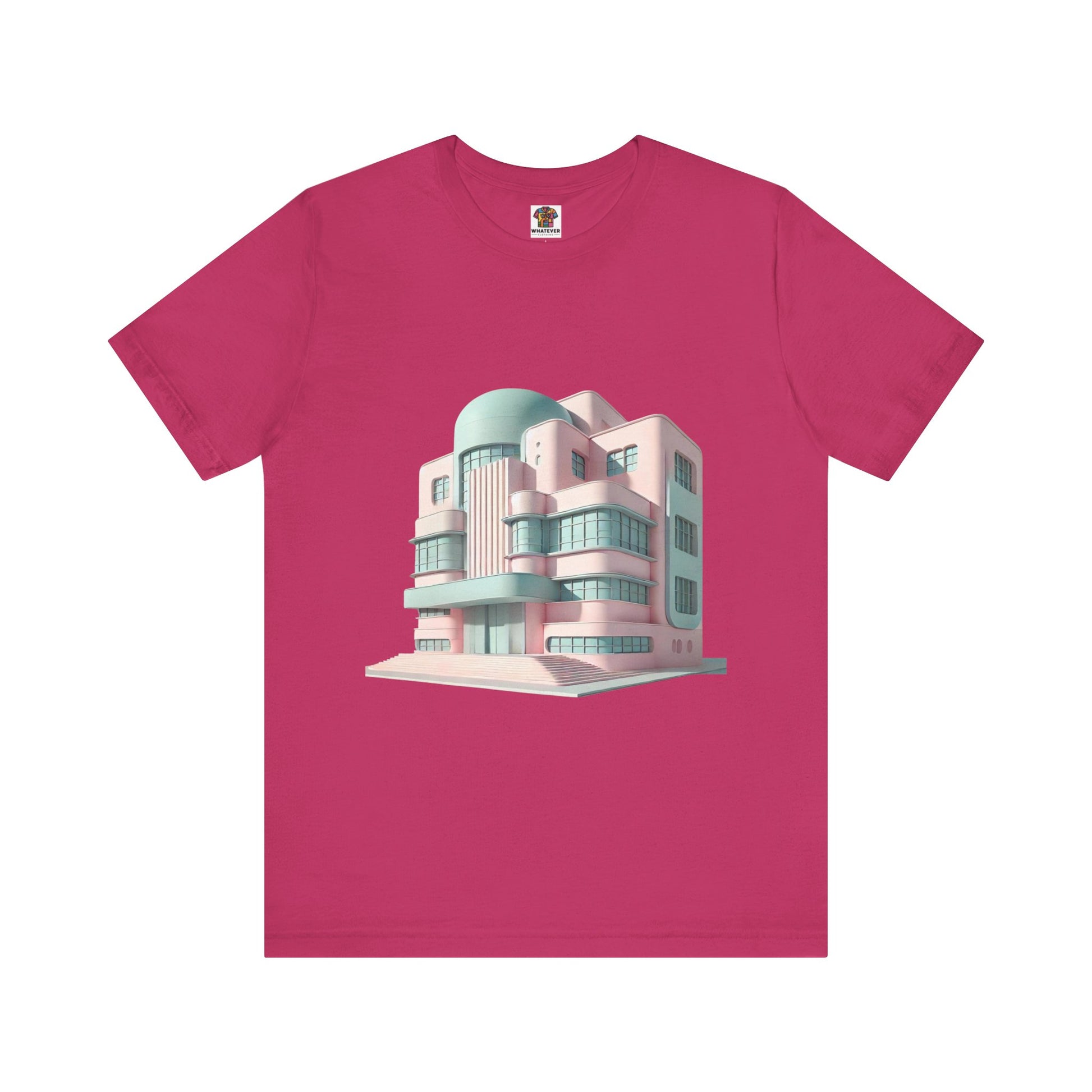 A geometric, futuristic building in soft pastel colors with bold lines and smooth surfaces, evoking a retro-futuristic vibe for art prints.