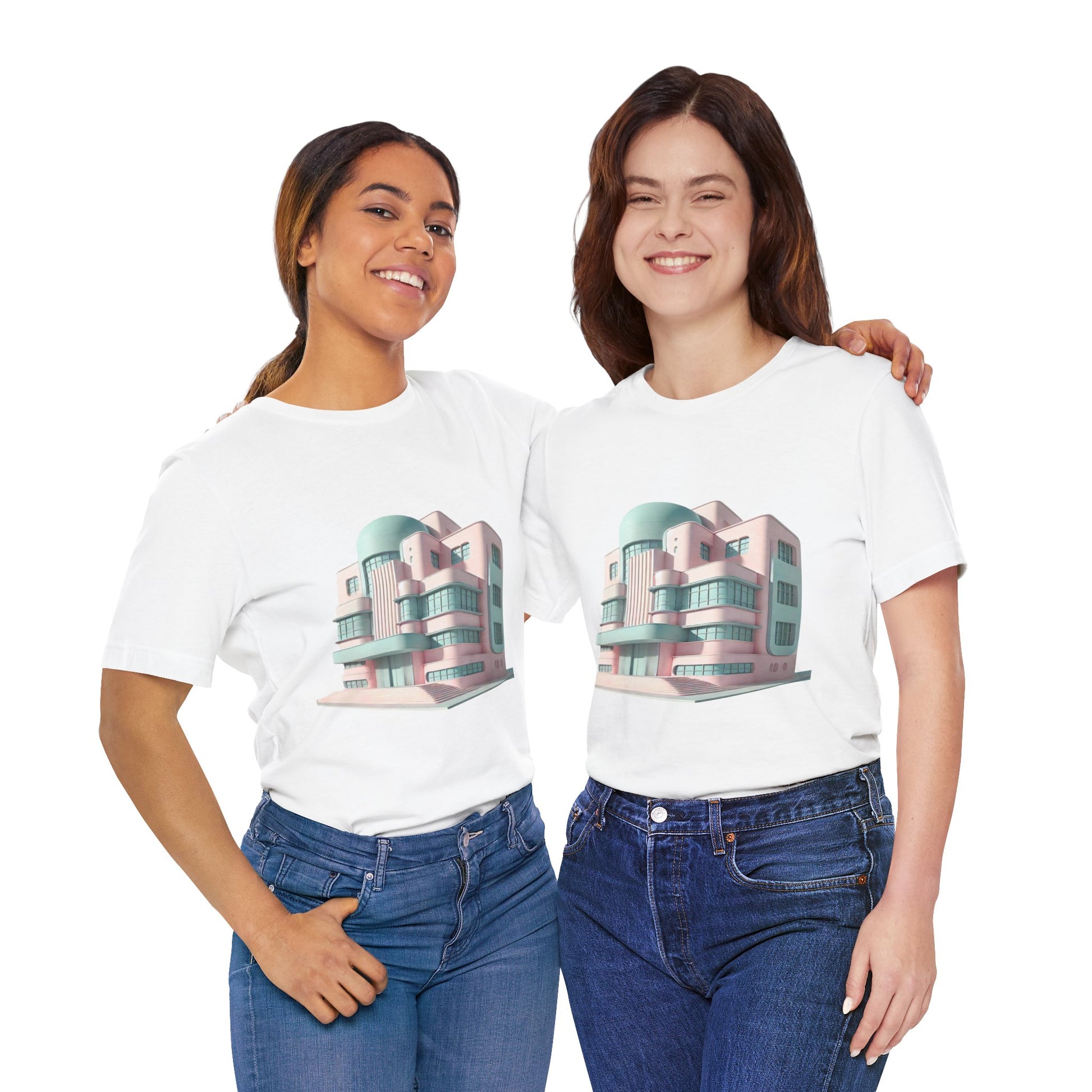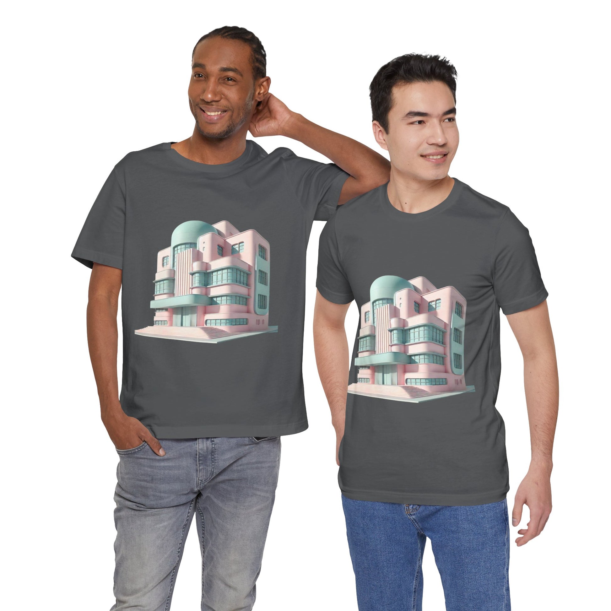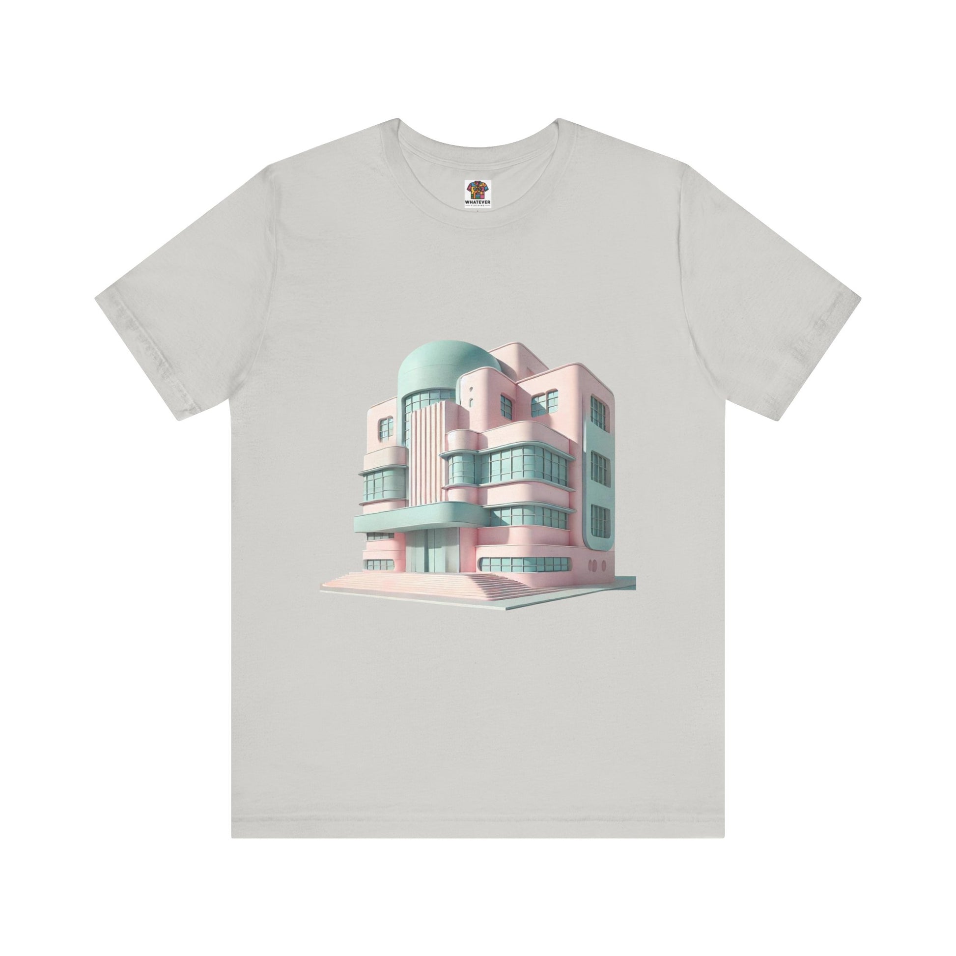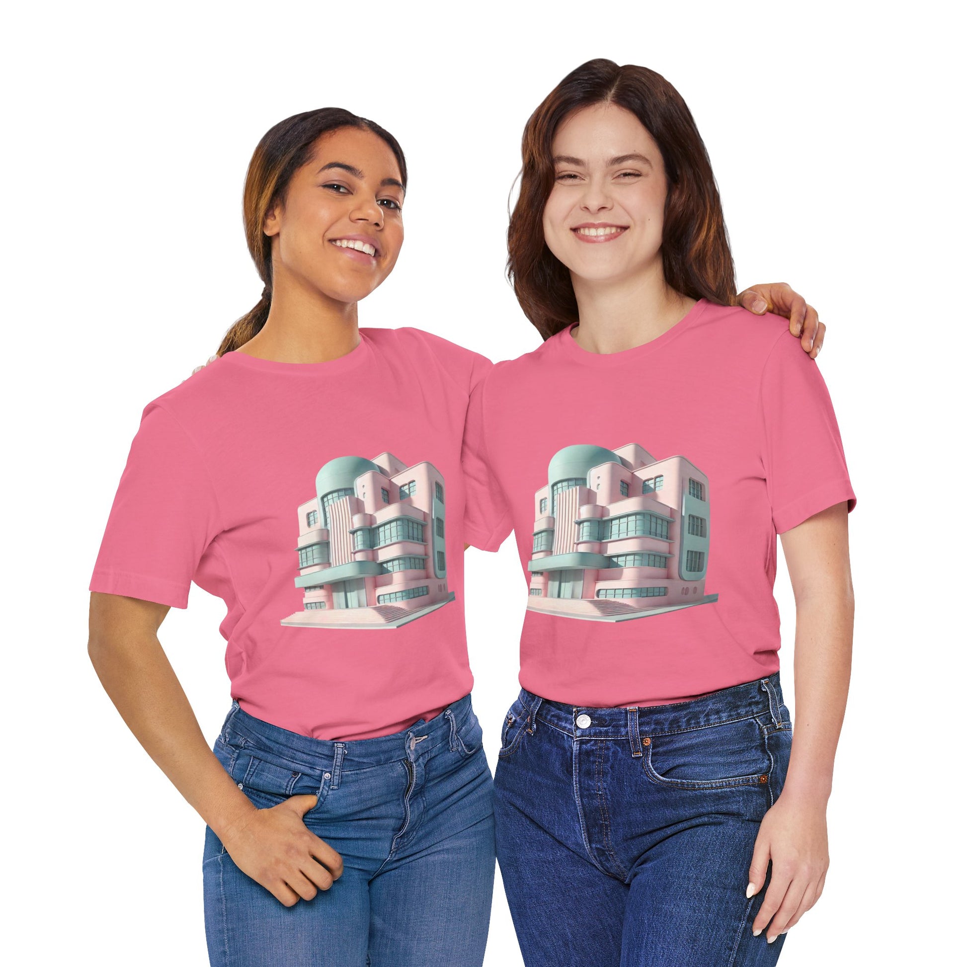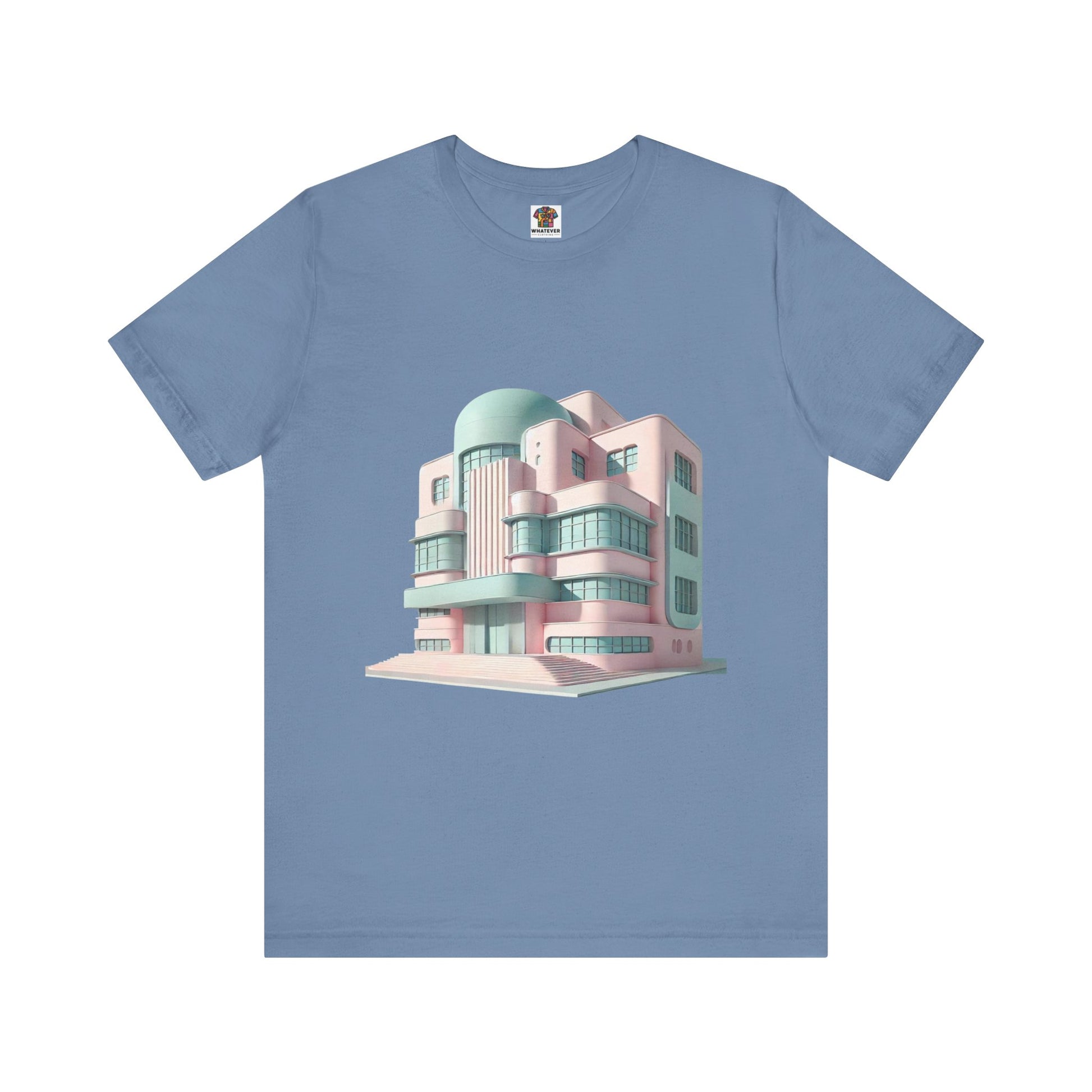 A geometric, futuristic building in soft pastel colors with bold lines and smooth surfaces, evoking a retro-futuristic vibe for art prints.
