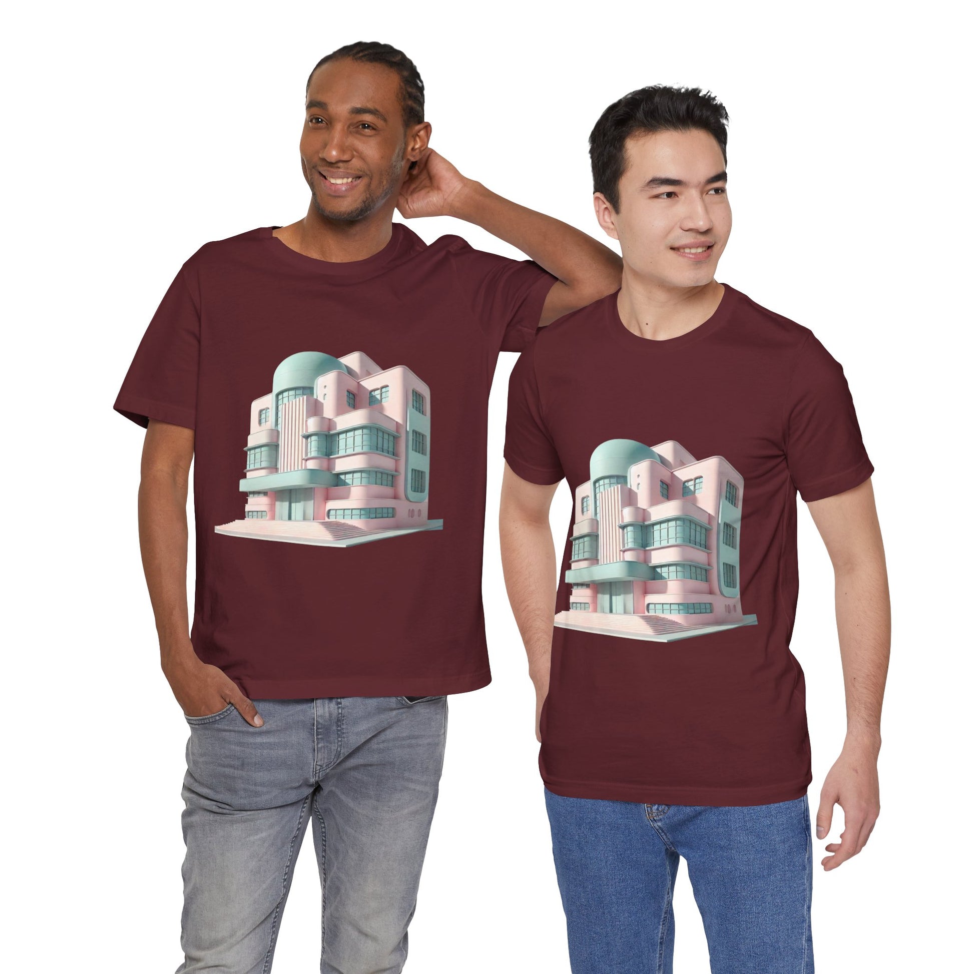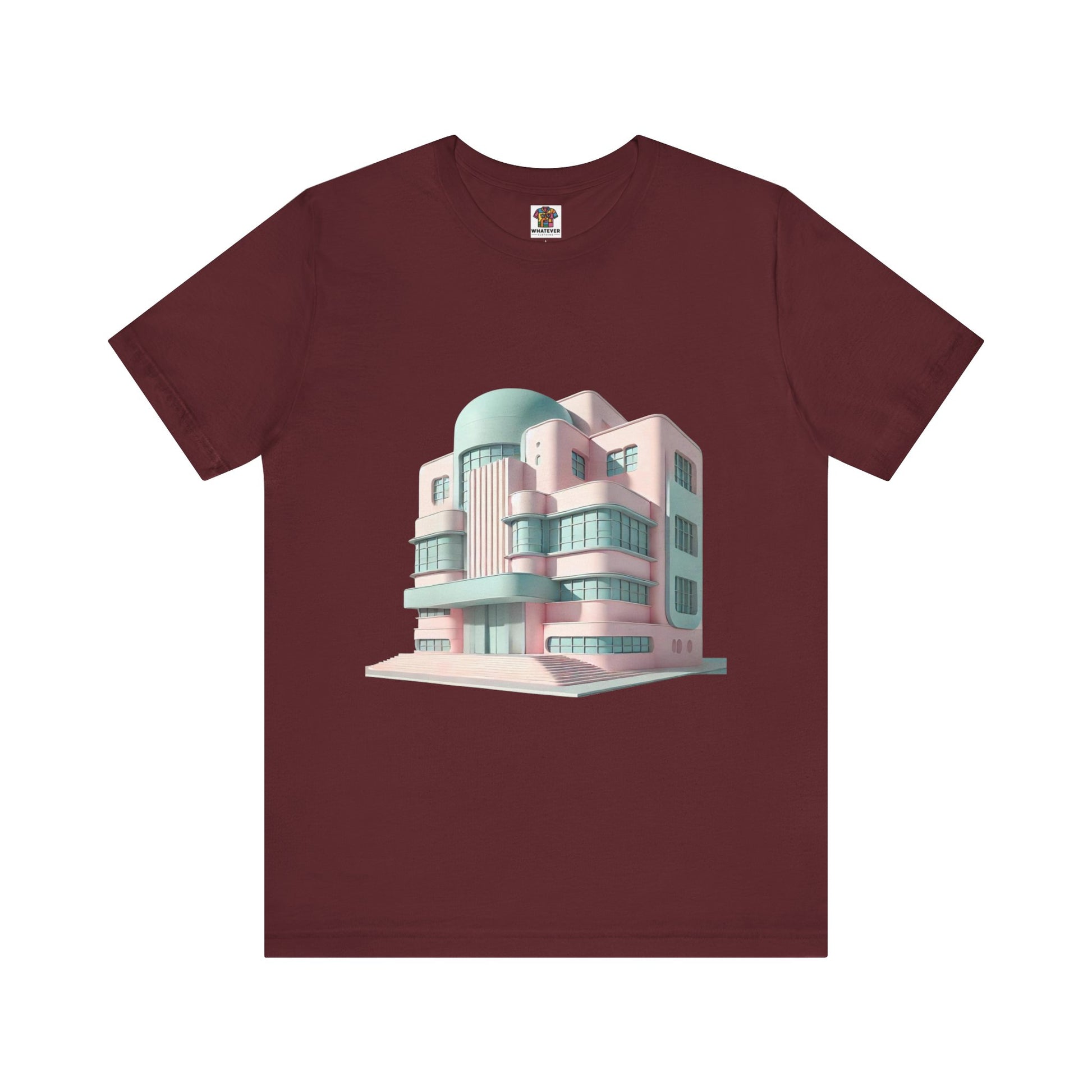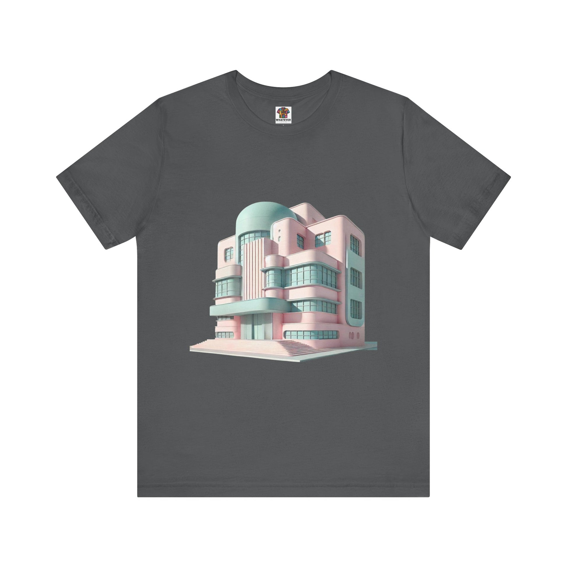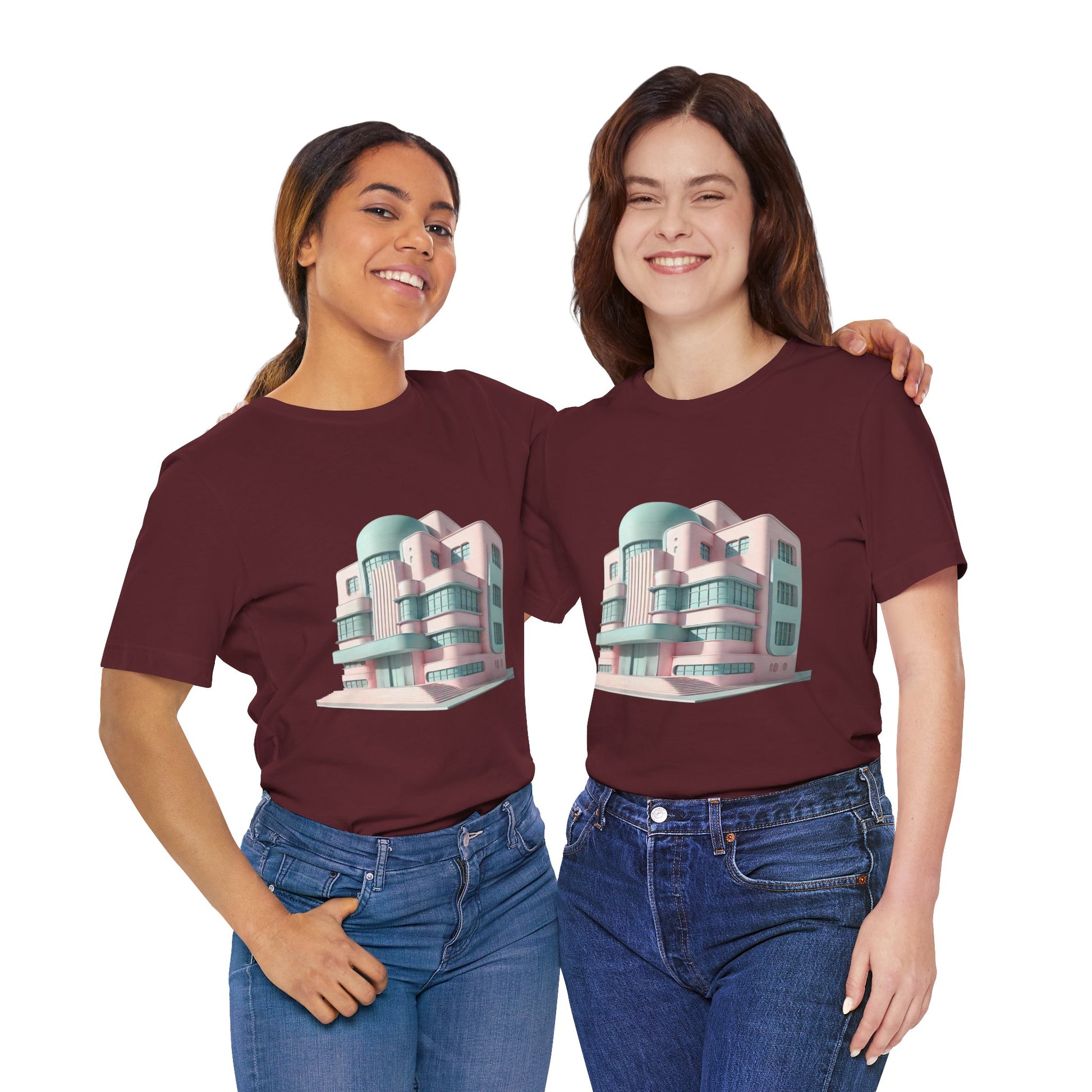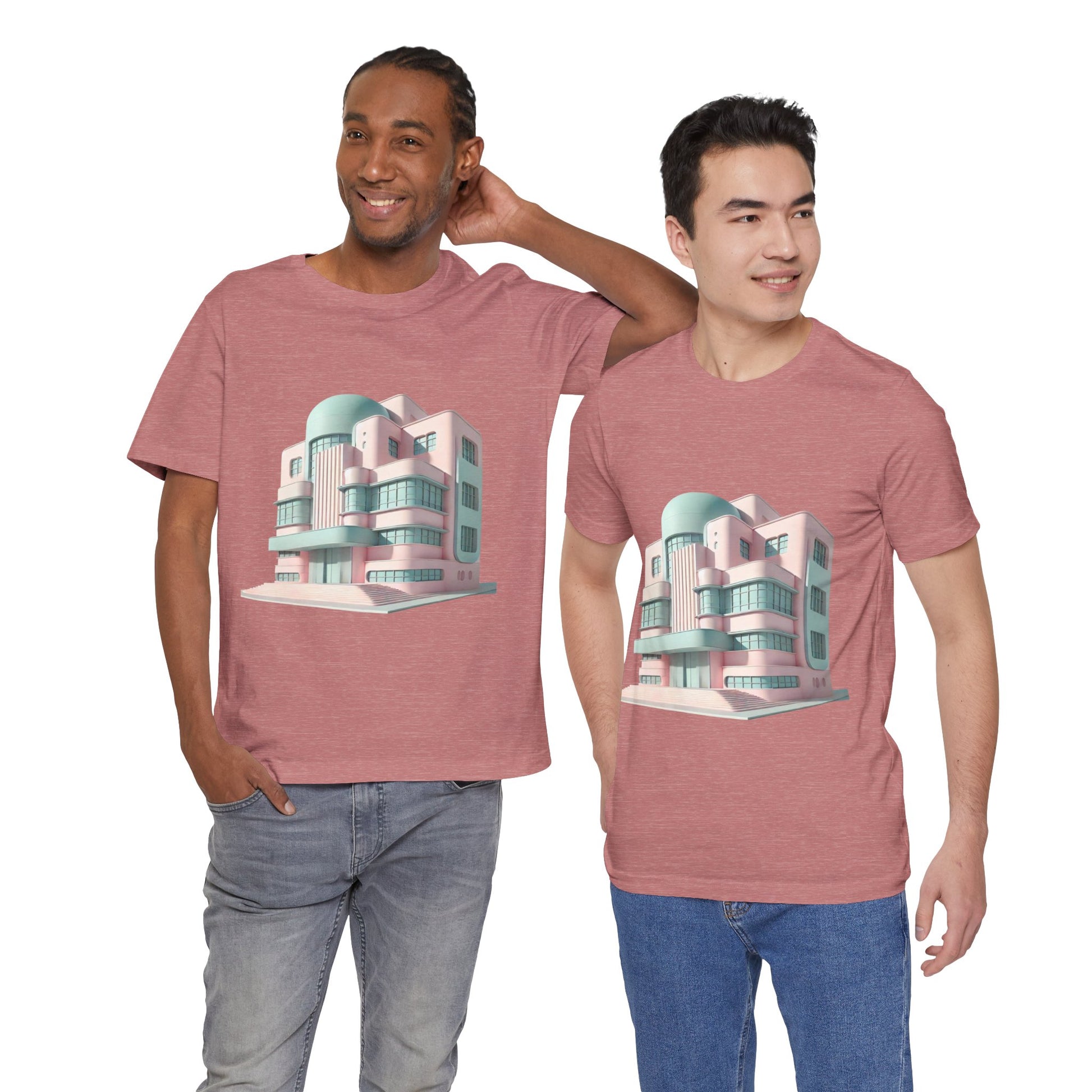 A geometric, futuristic building in soft pastel colors with bold lines and smooth surfaces, evoking a retro-futuristic vibe for art prints.