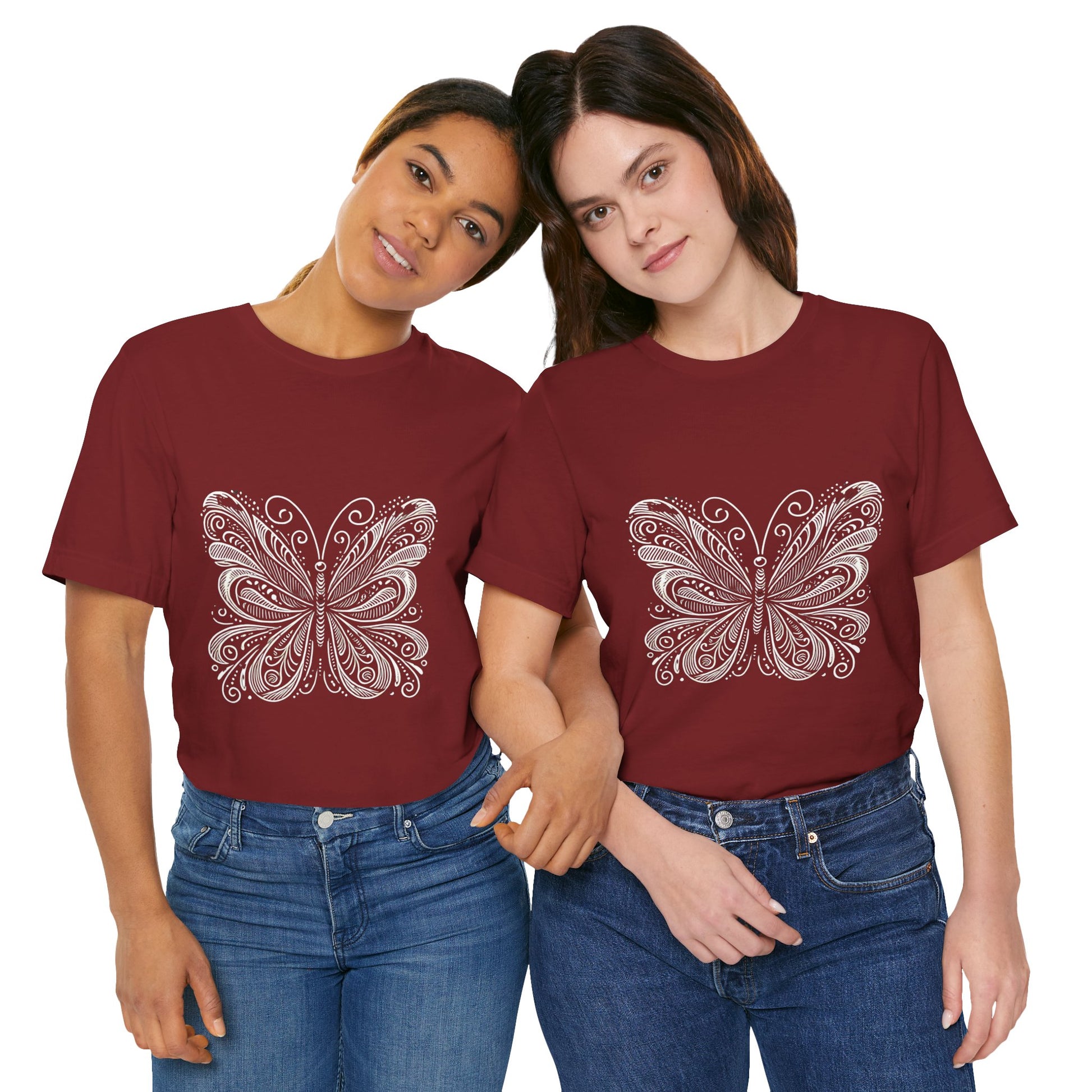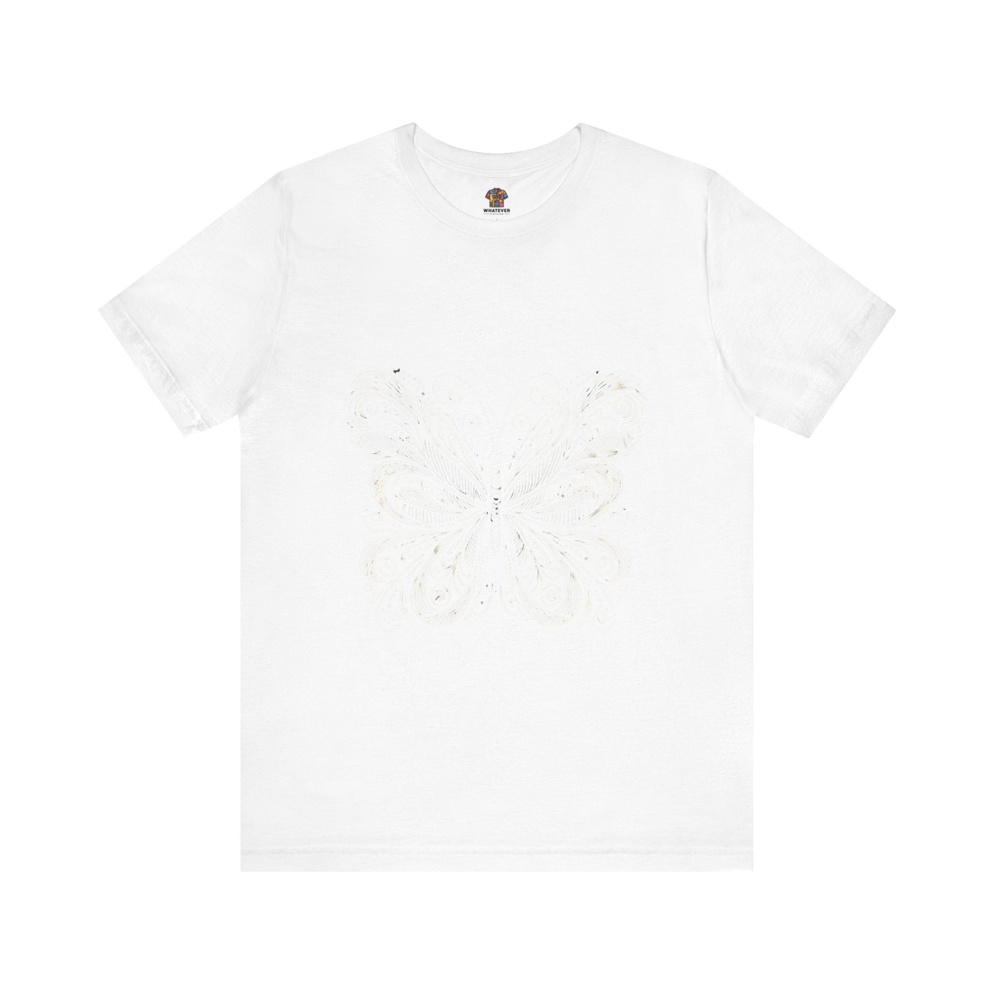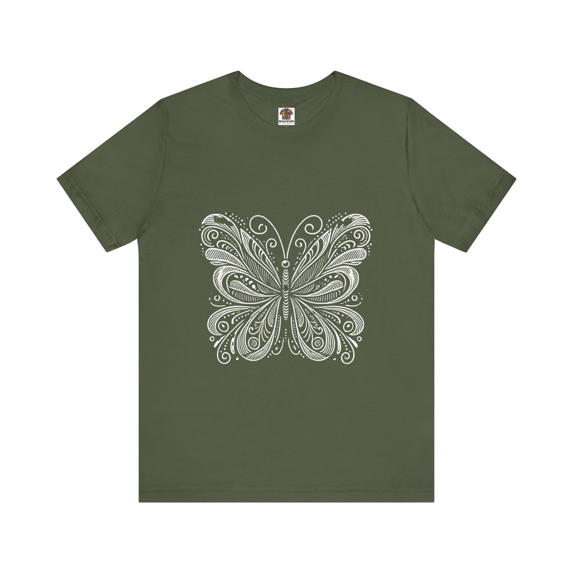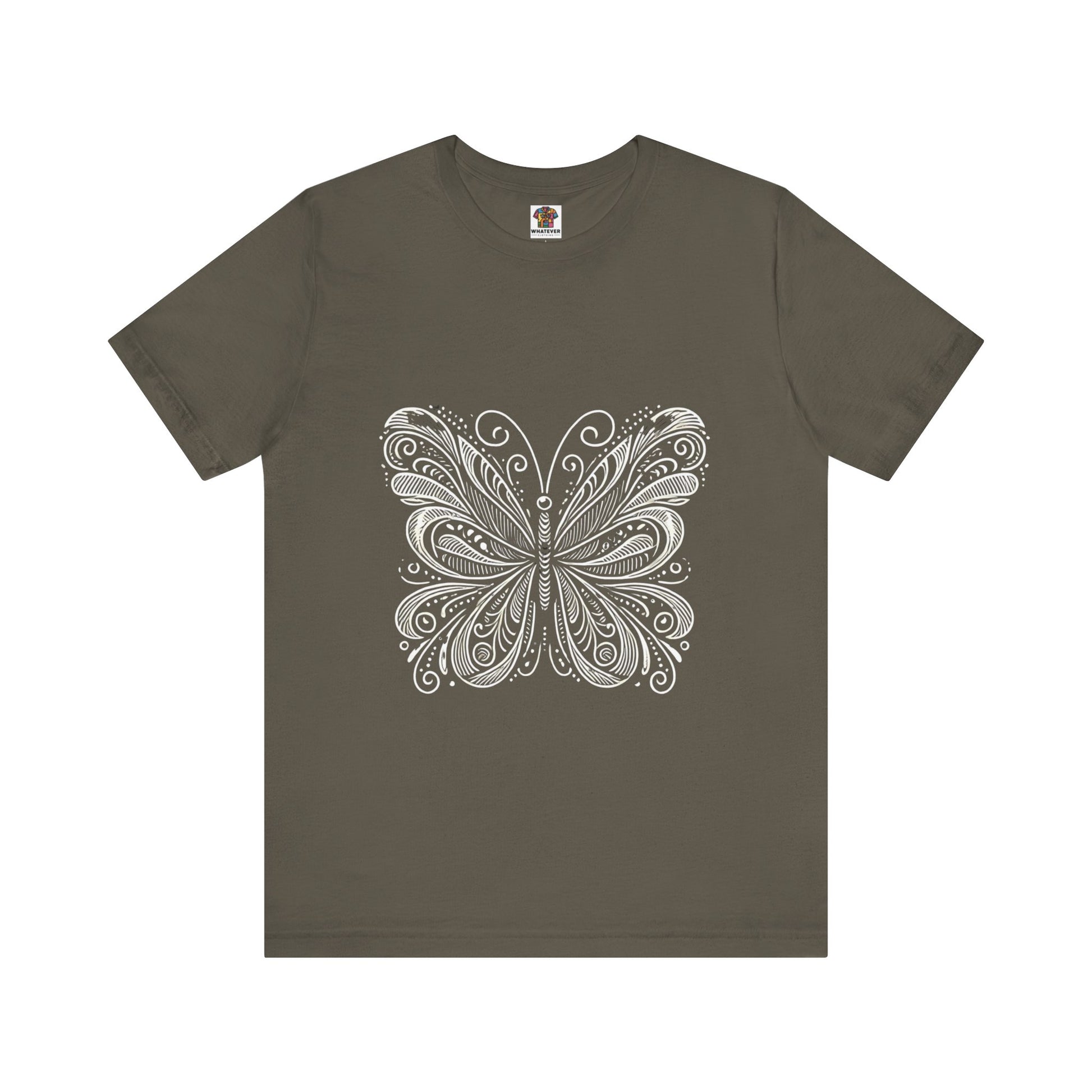 A butterfly with intricately detailed wings and curved lines, inspired by floral patterns, perfect for nature-themed fashion.