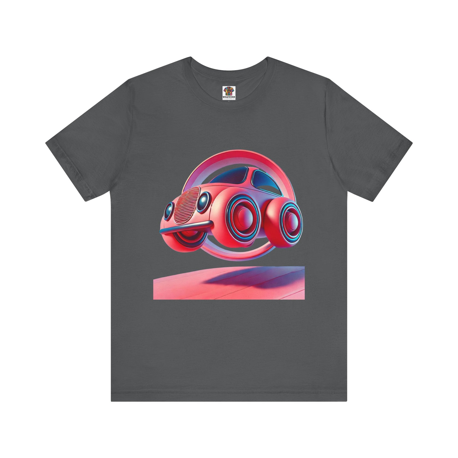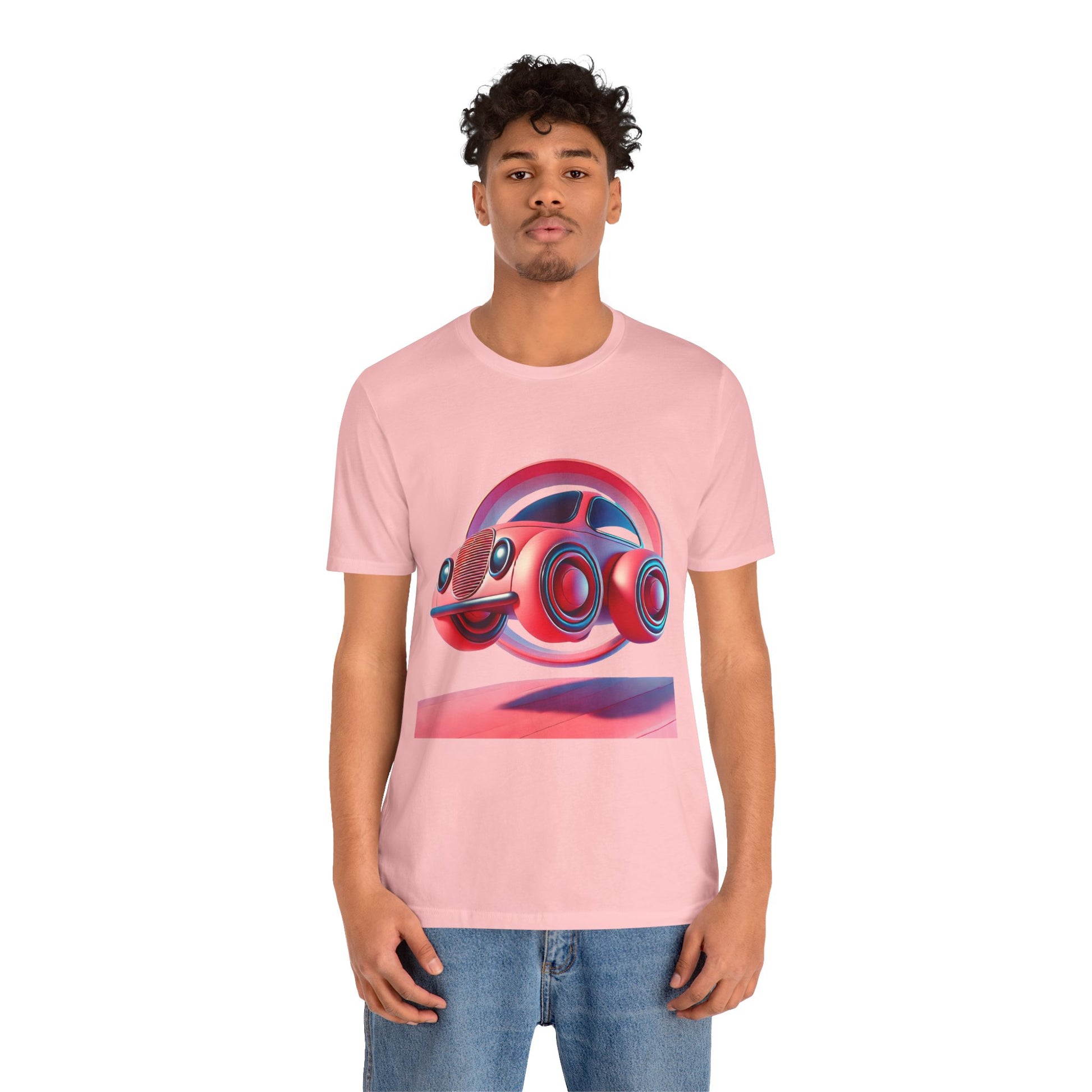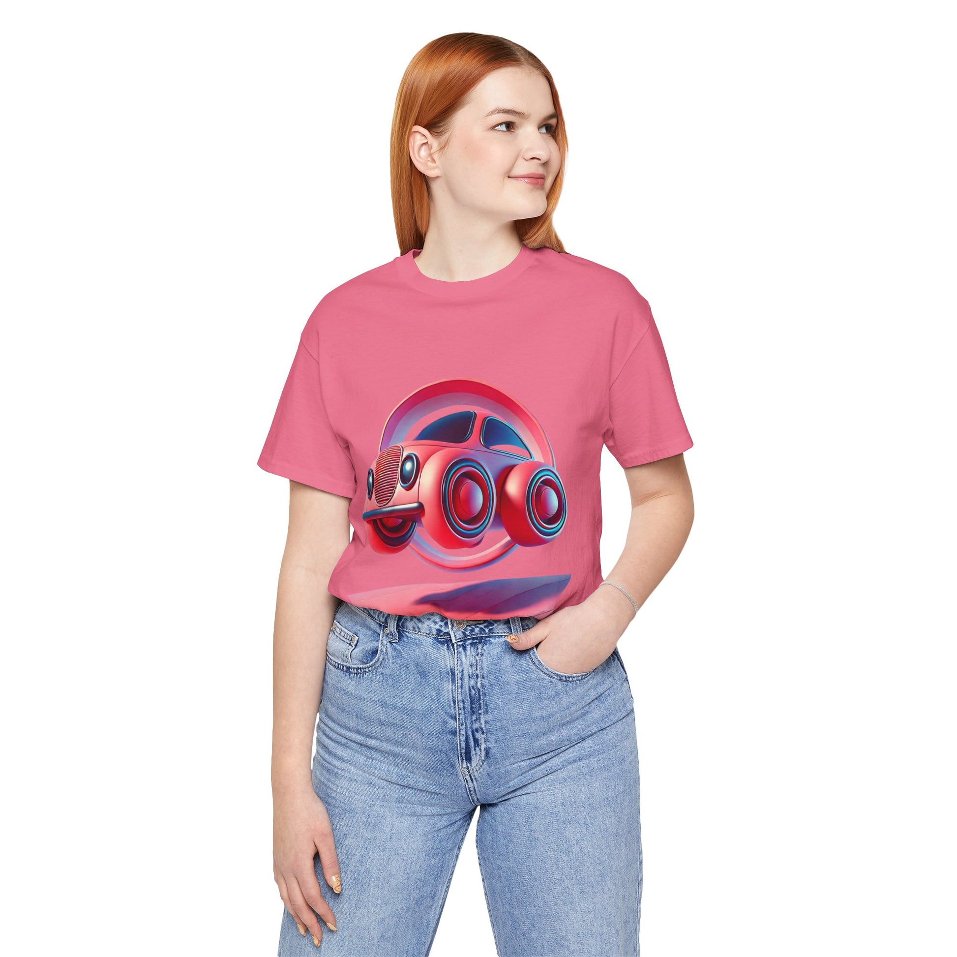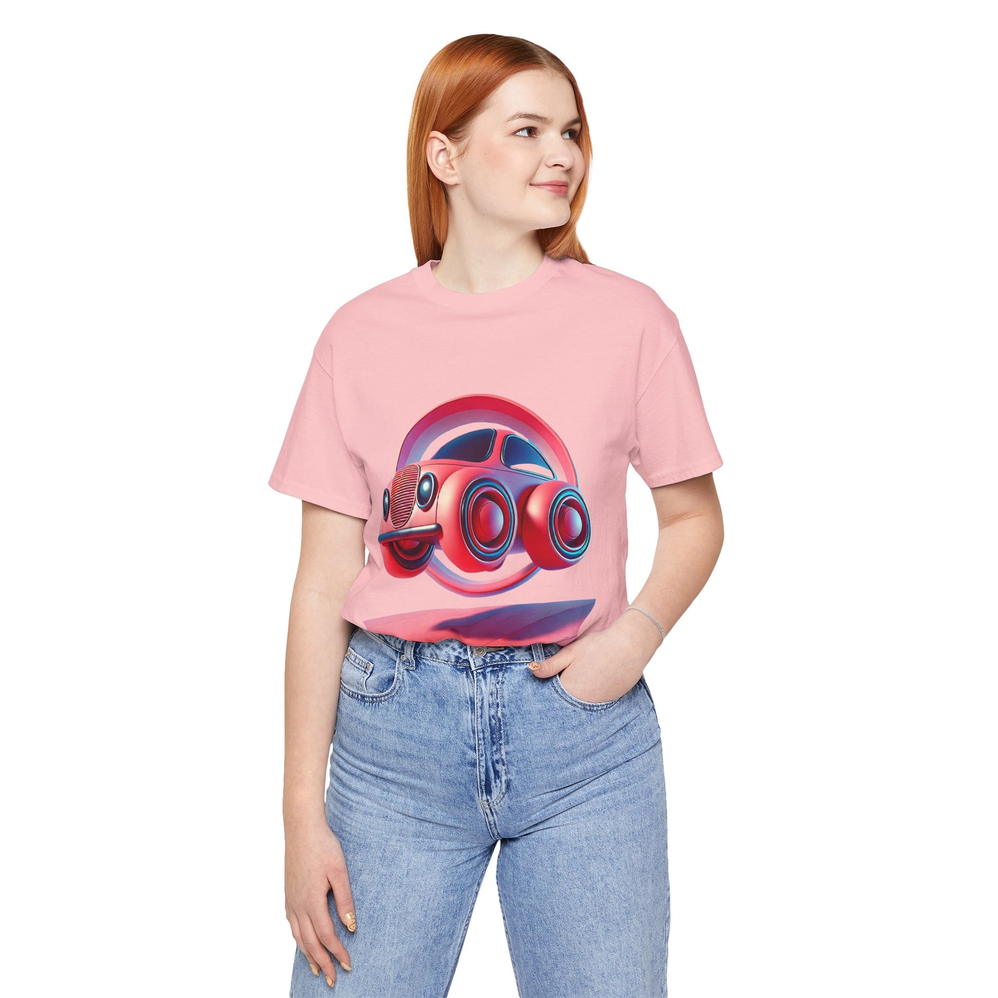 A stylized car with exaggerated curves and circular windows, rendered in pinks and reds, floating above a bright blue background.