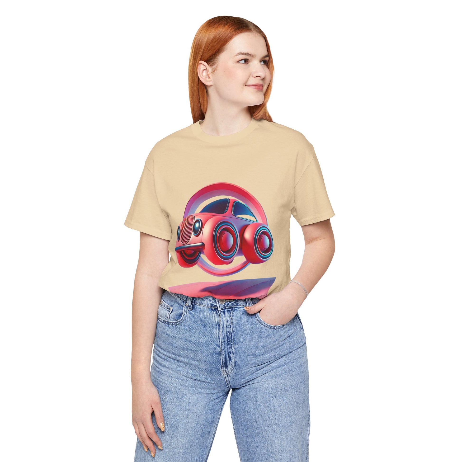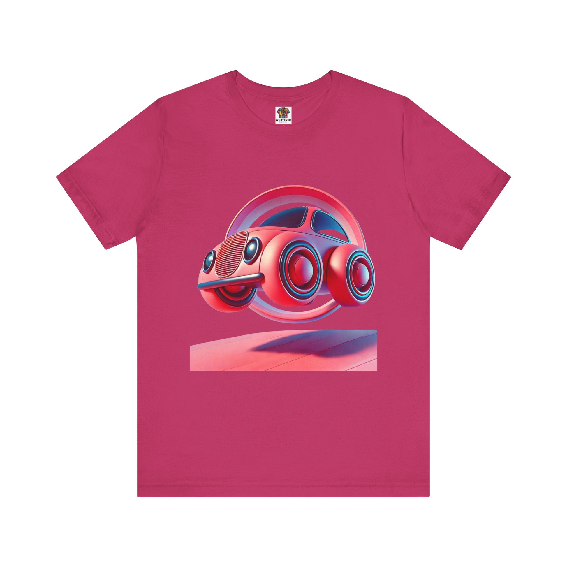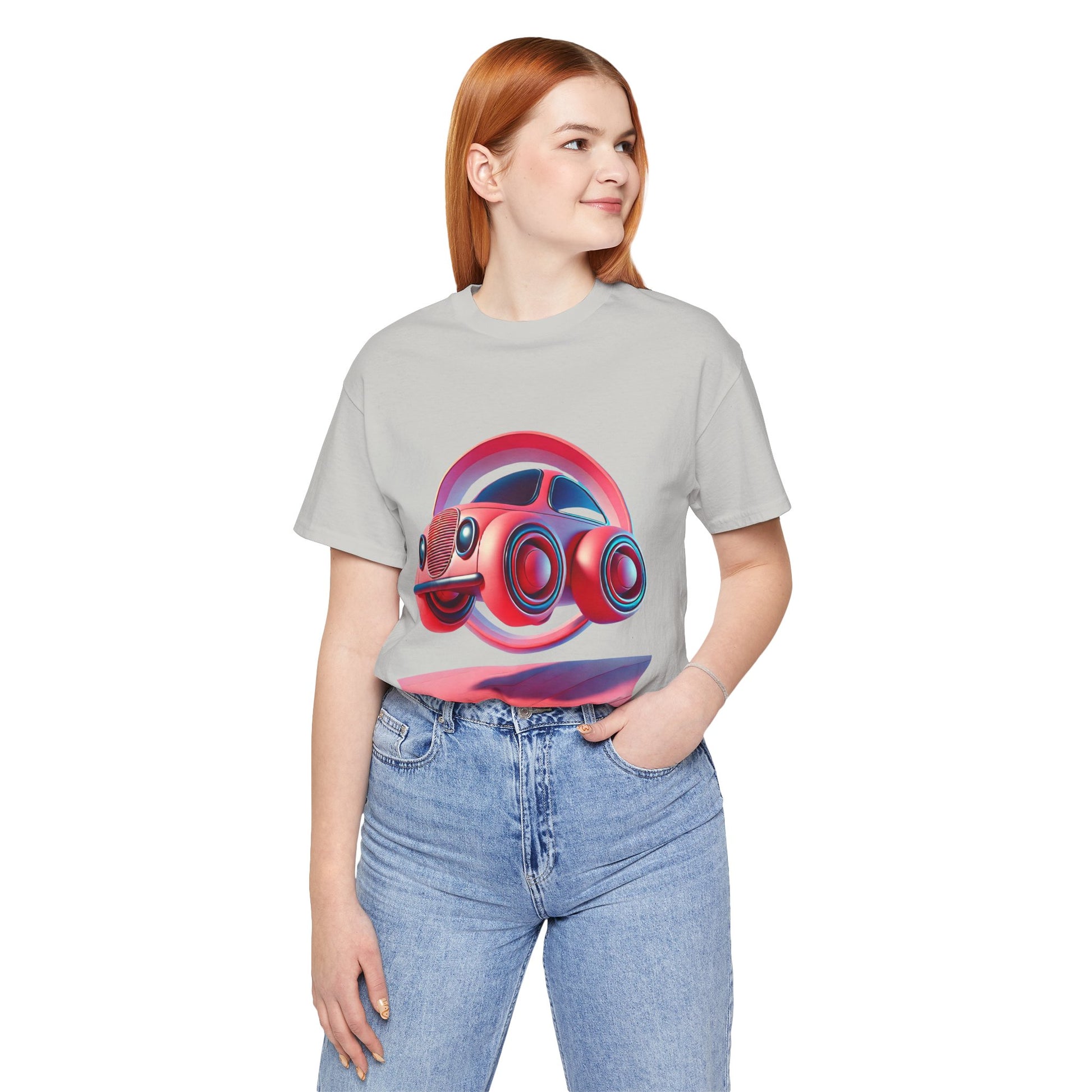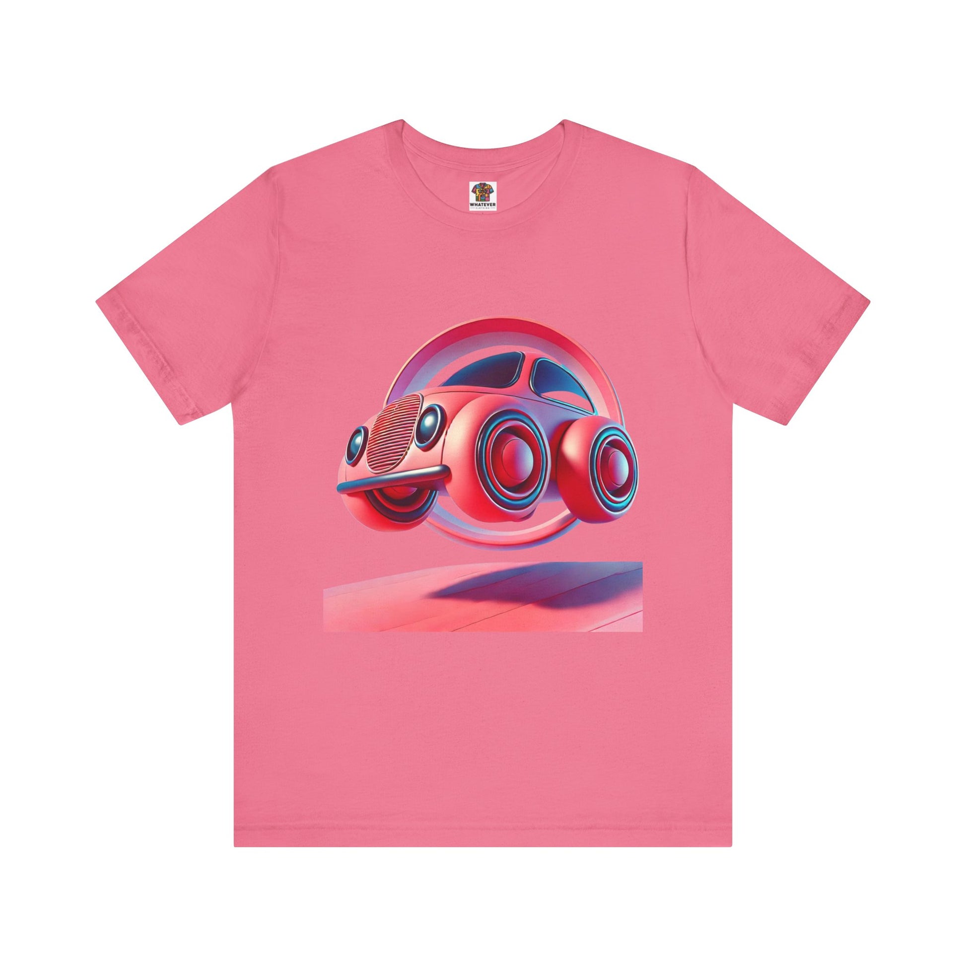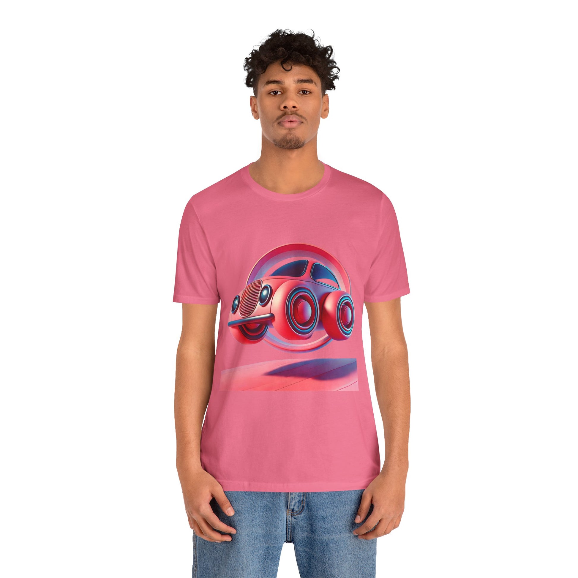 A stylized car with exaggerated curves and circular windows, rendered in pinks and reds, floating above a bright blue background.