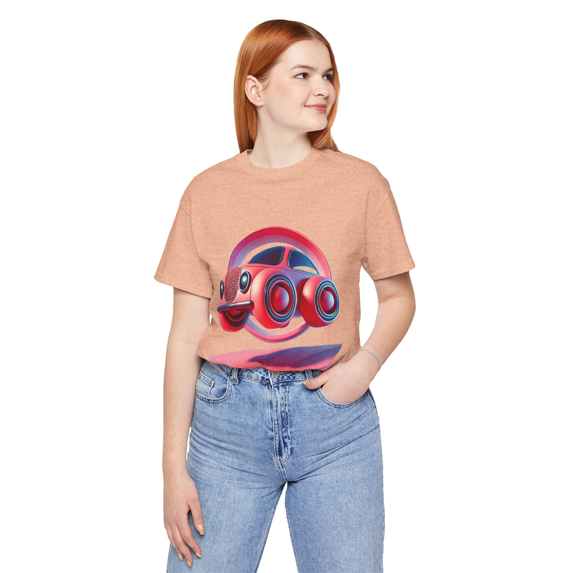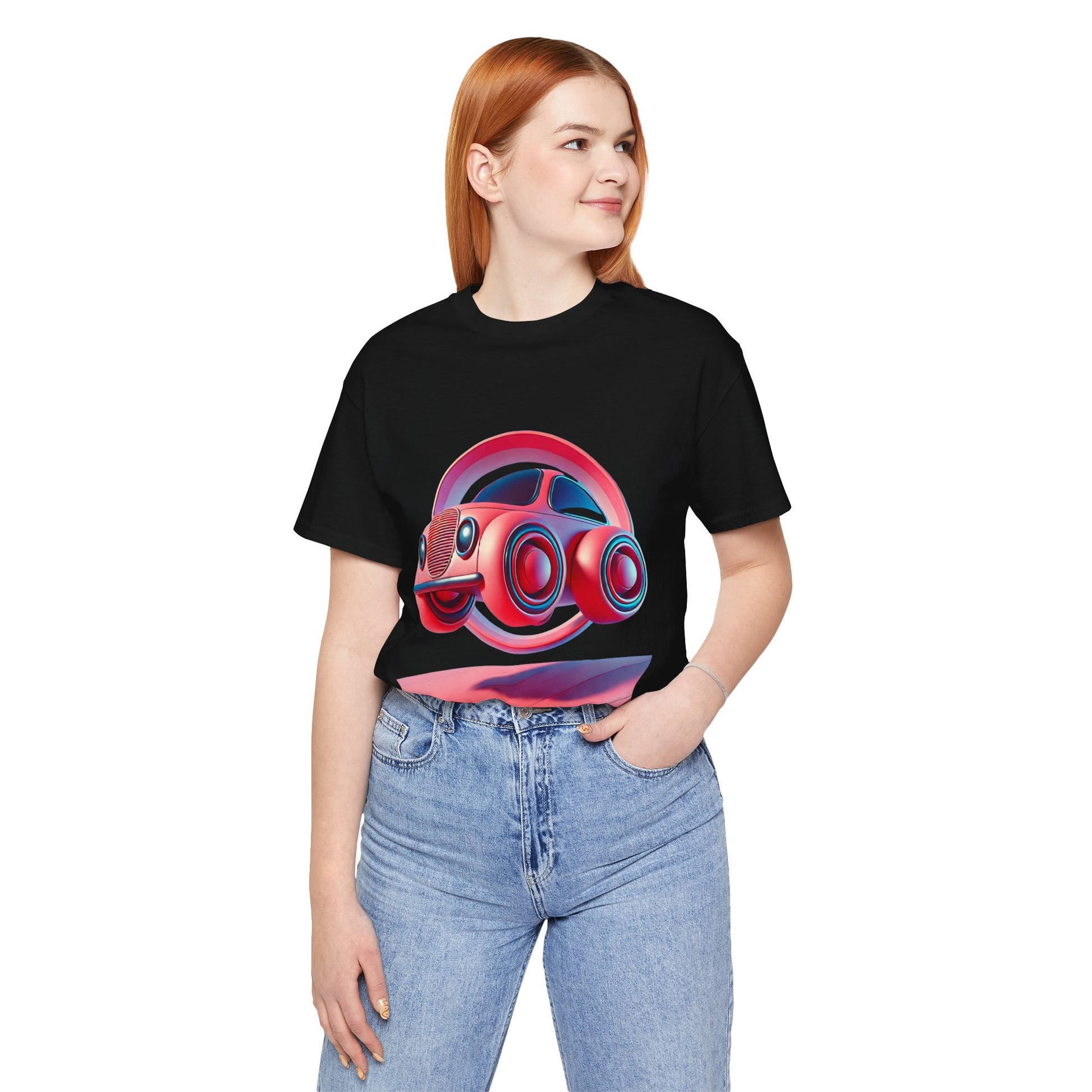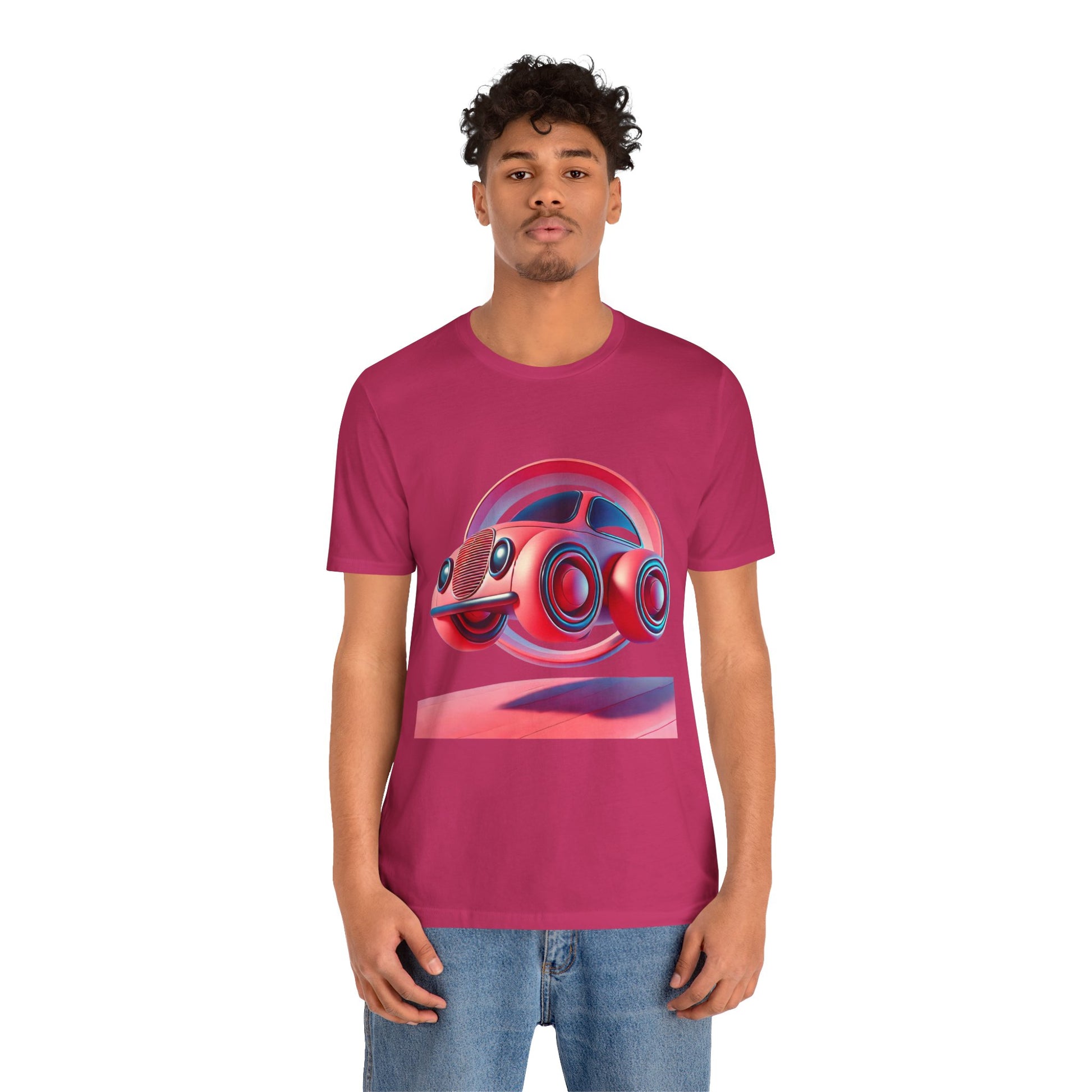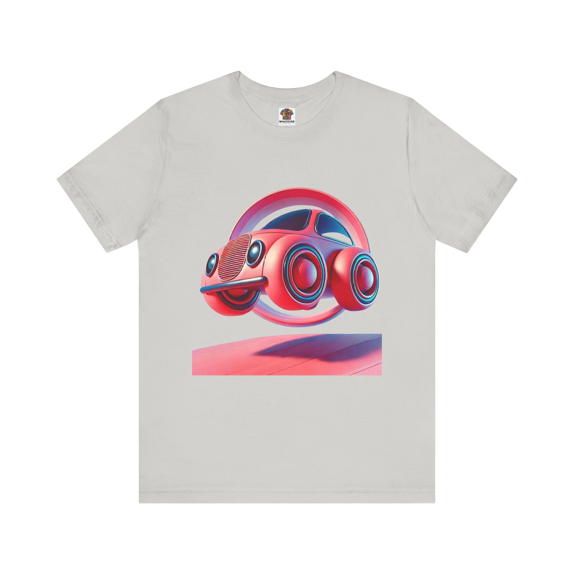 A stylized car with exaggerated curves and circular windows, rendered in pinks and reds, floating above a bright blue background.