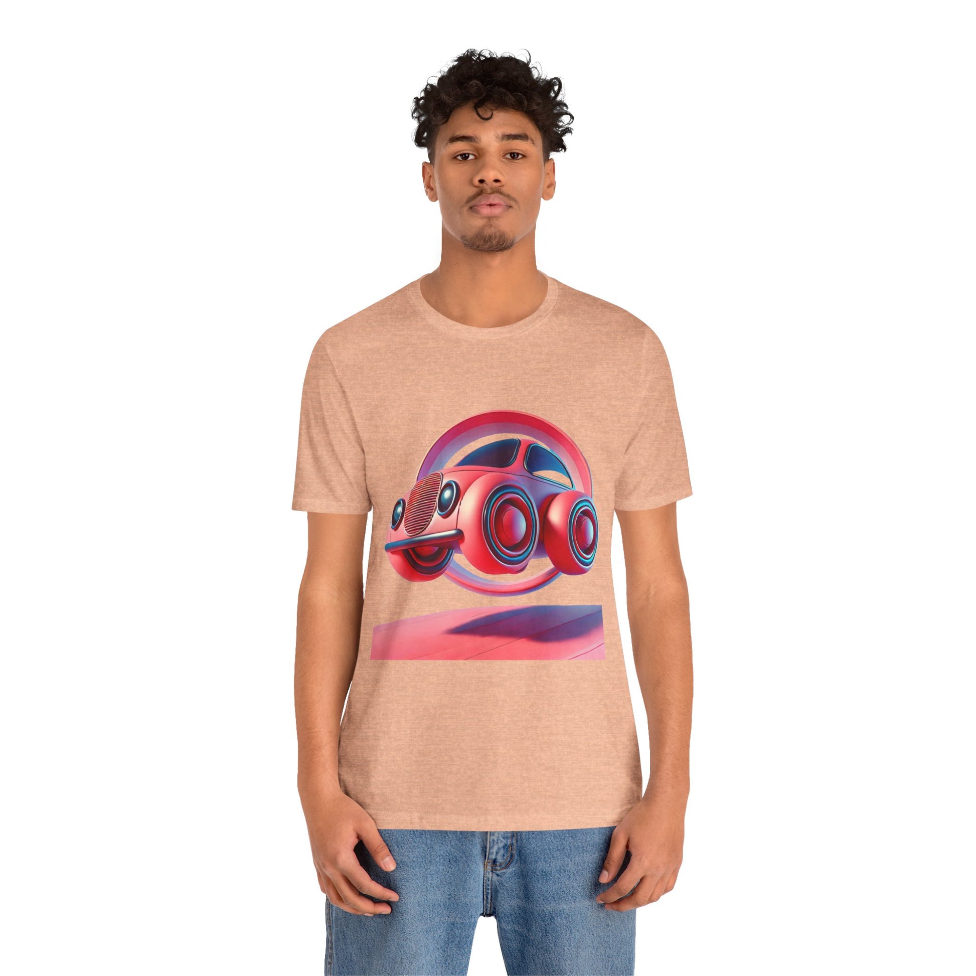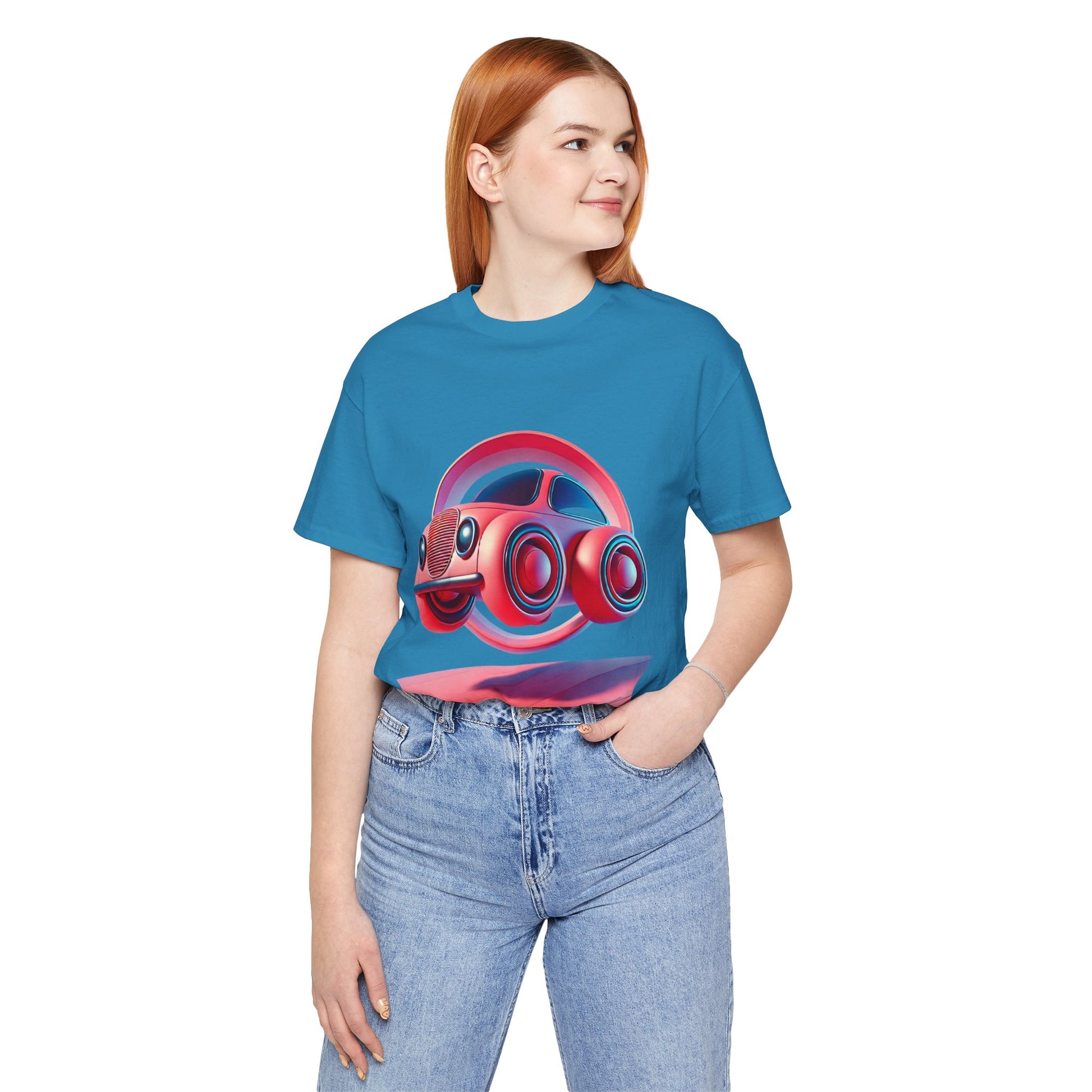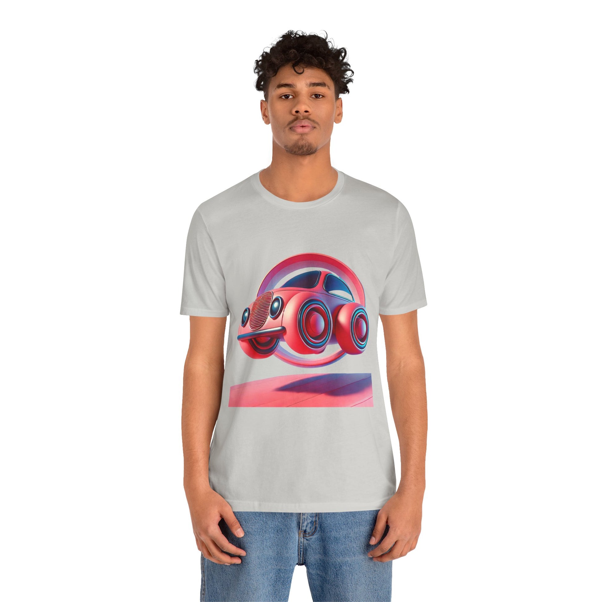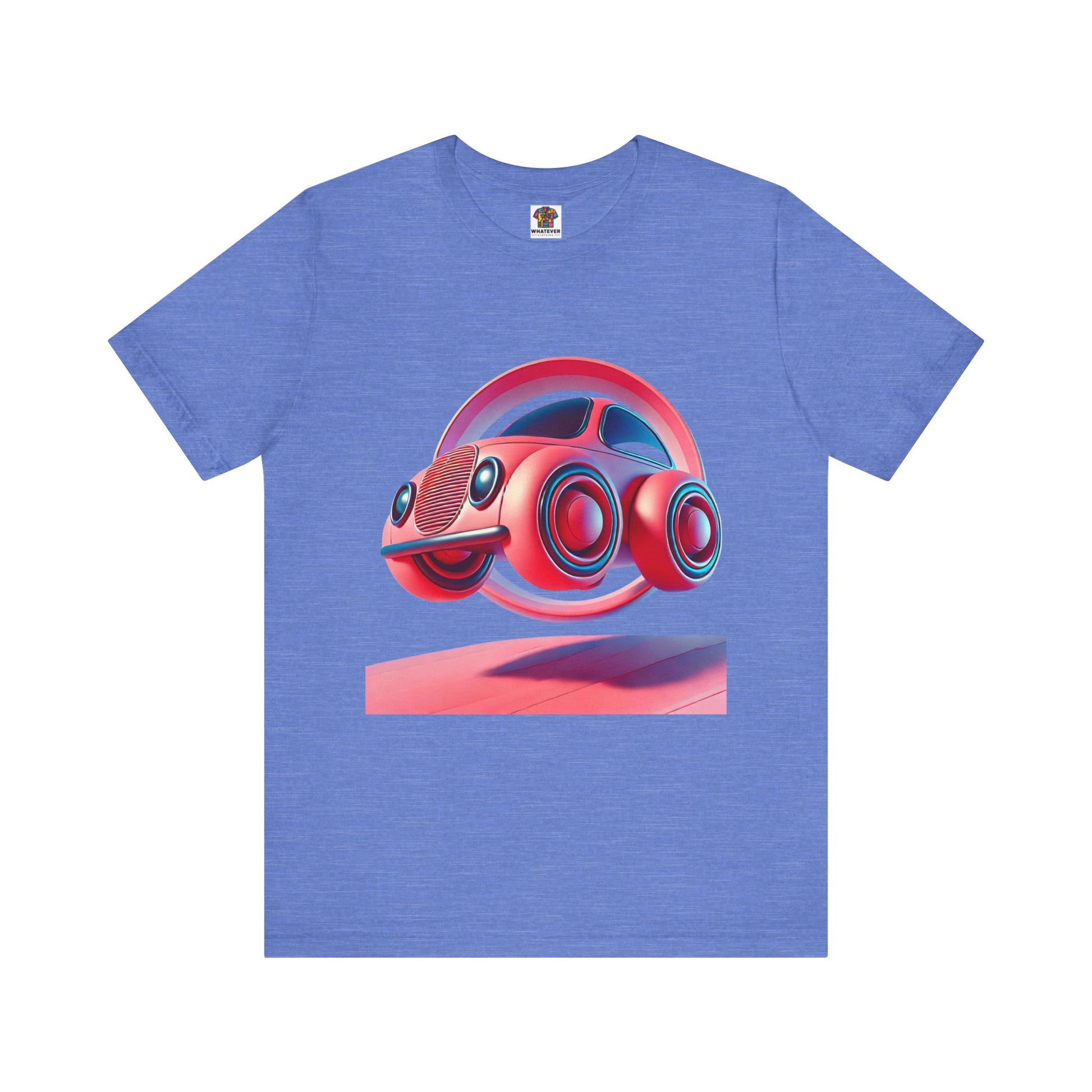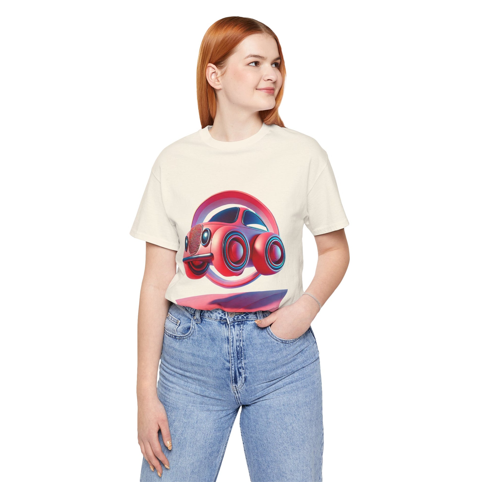 A stylized car with exaggerated curves and circular windows, rendered in pinks and reds, floating above a bright blue background.