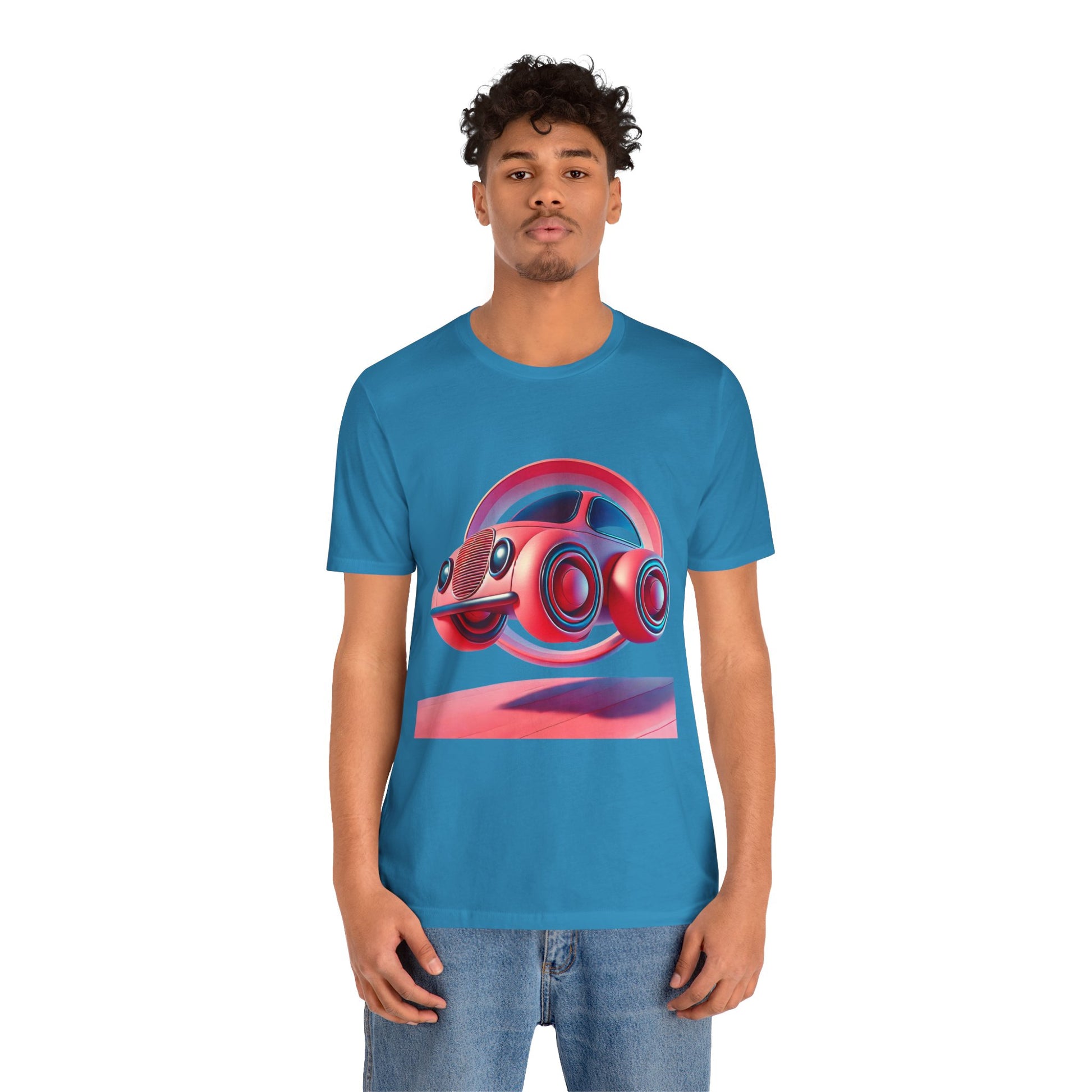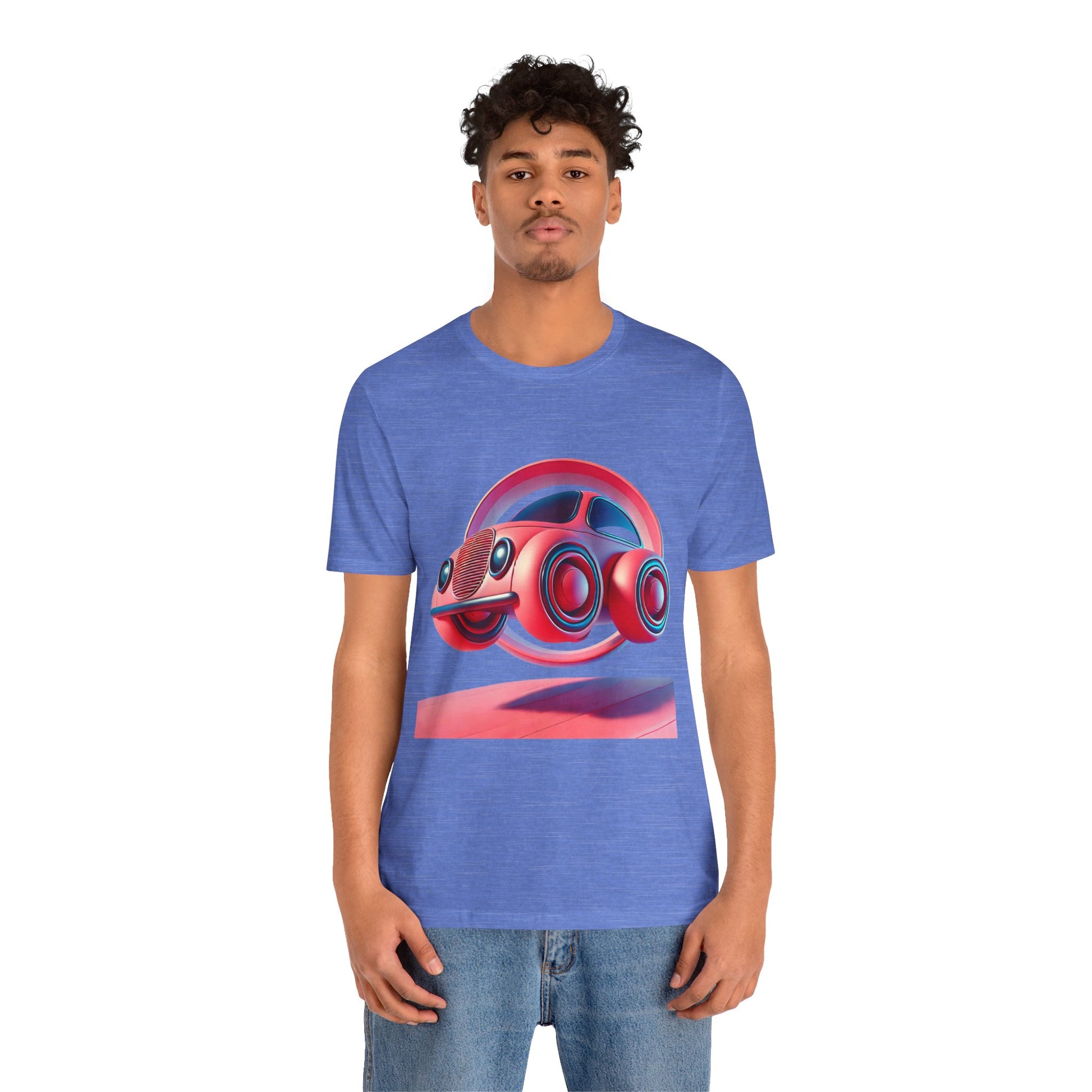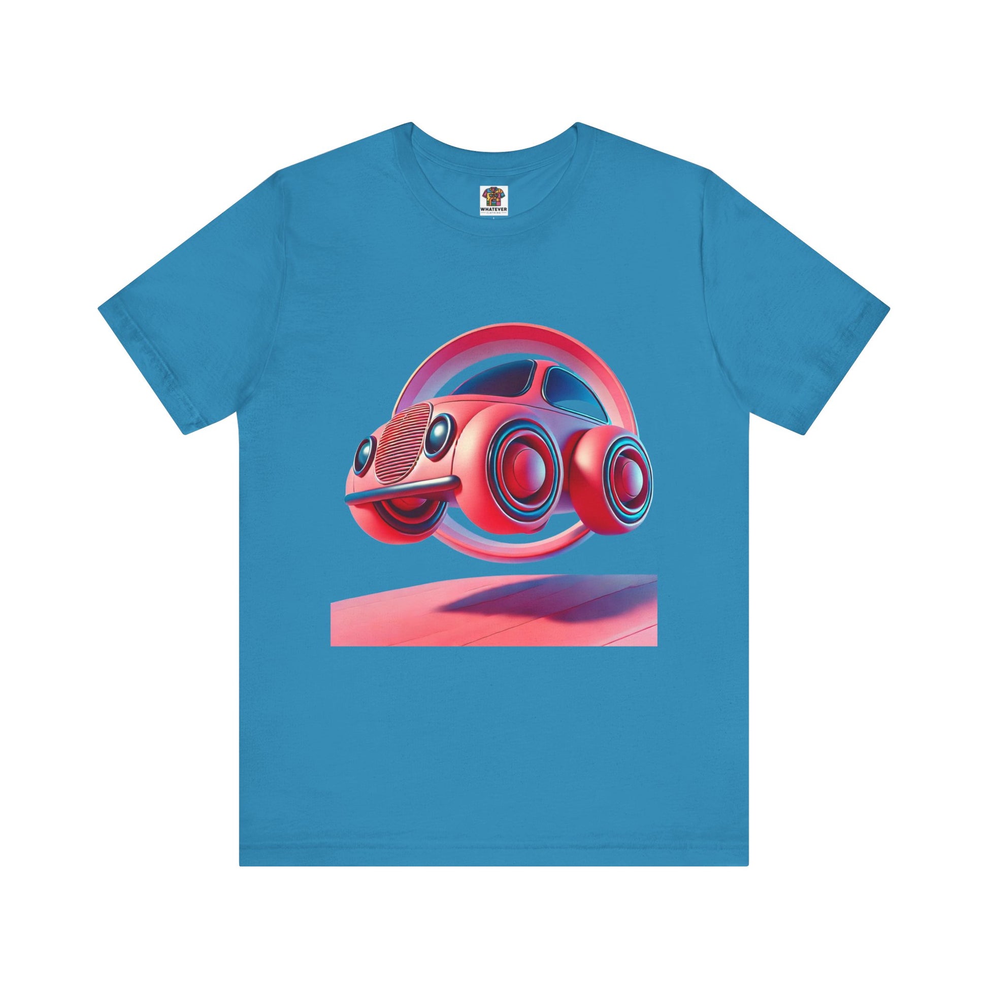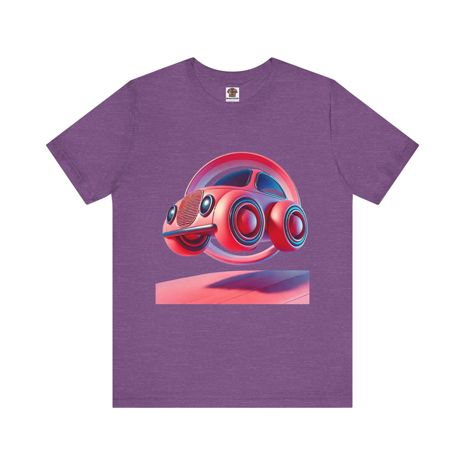 A stylized car with exaggerated curves and circular windows, rendered in pinks and reds, floating above a bright blue background.