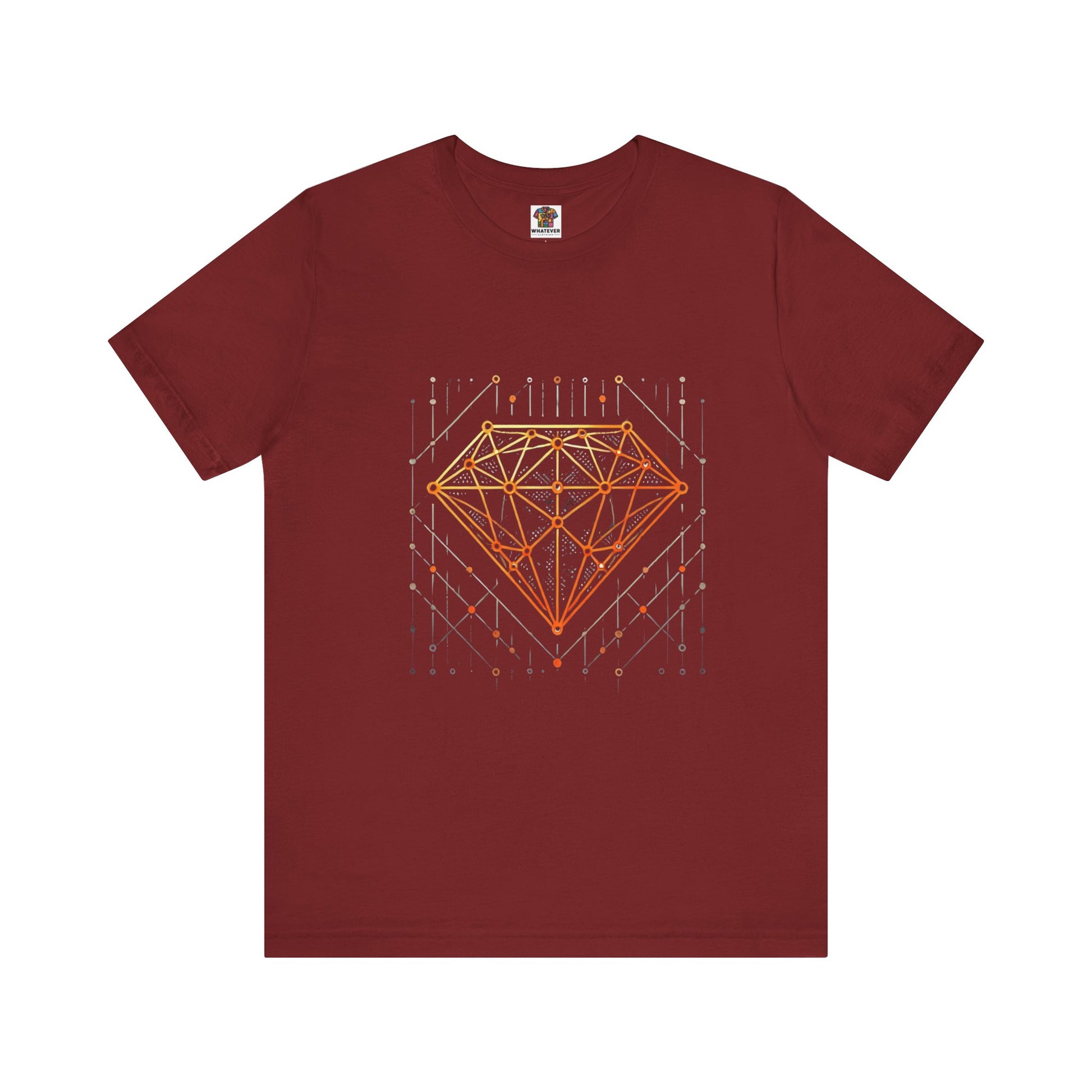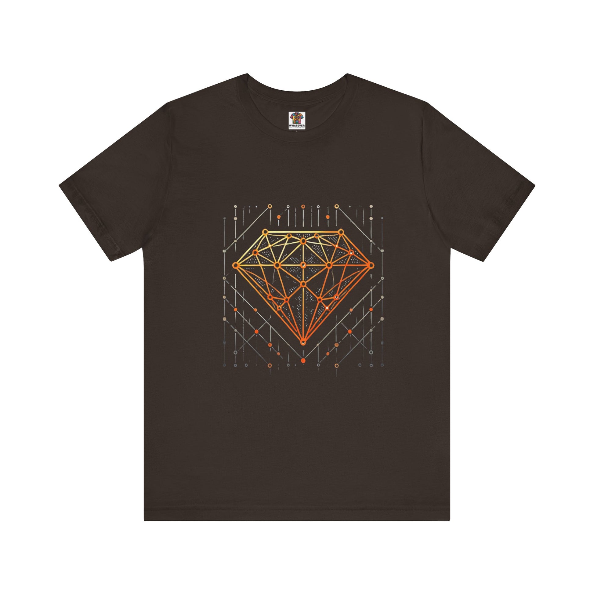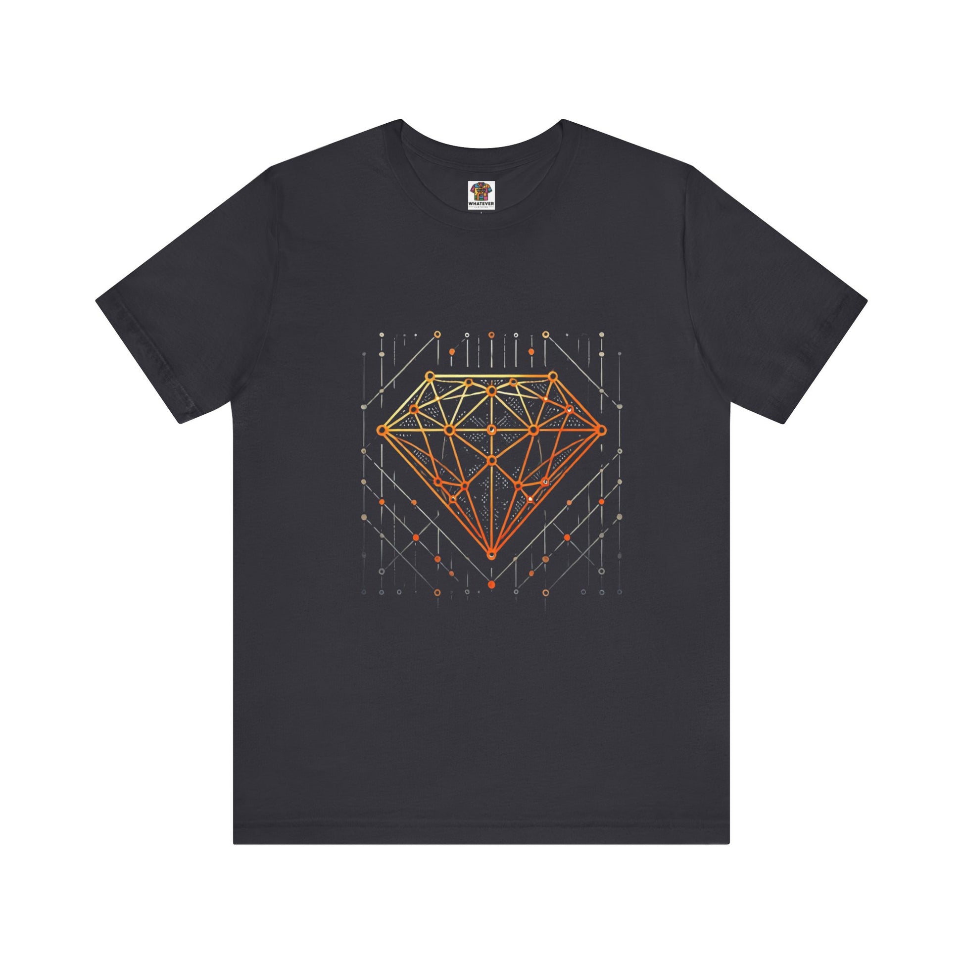 A diamond shape made of interconnected facets and lines, glowing with bold orange accents.