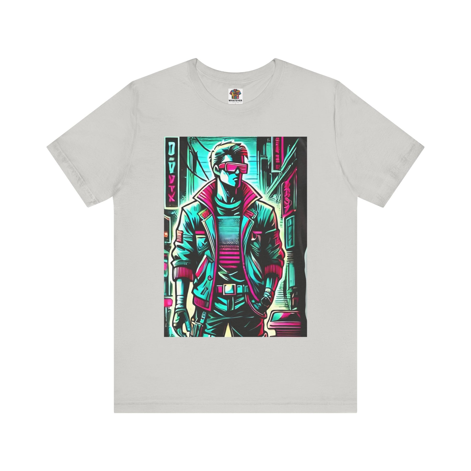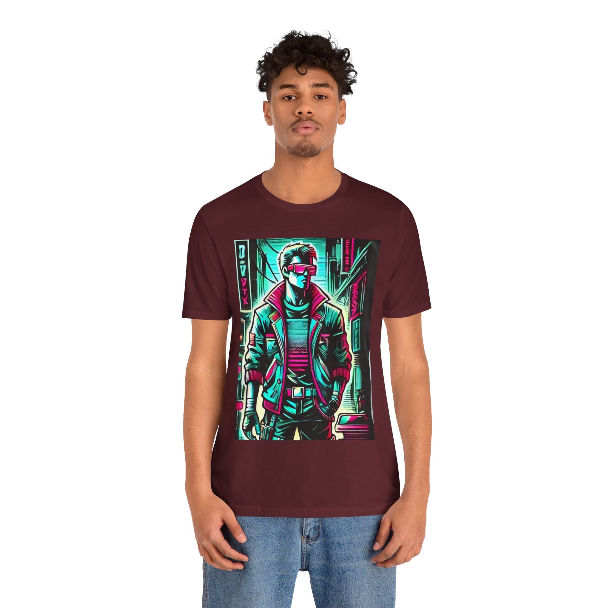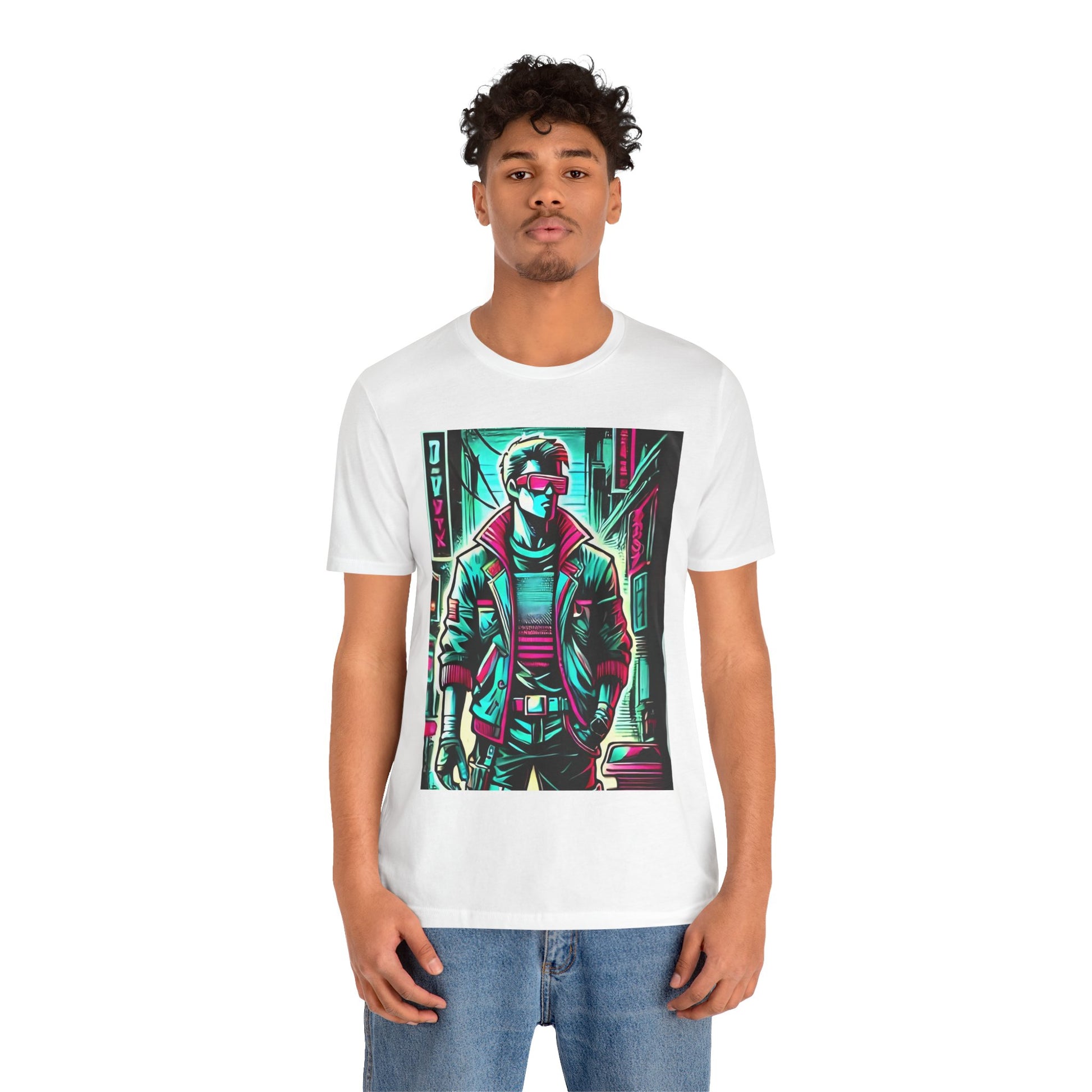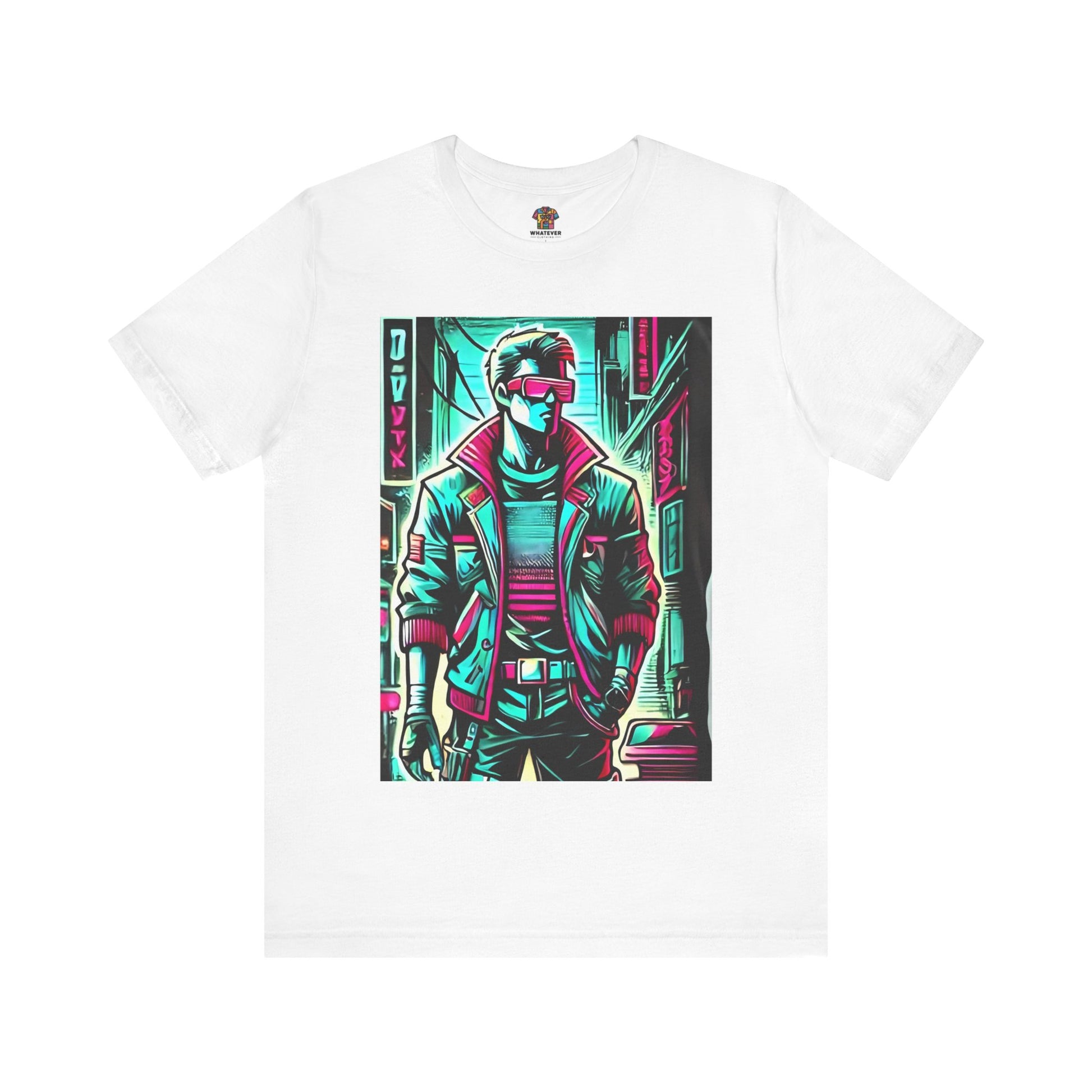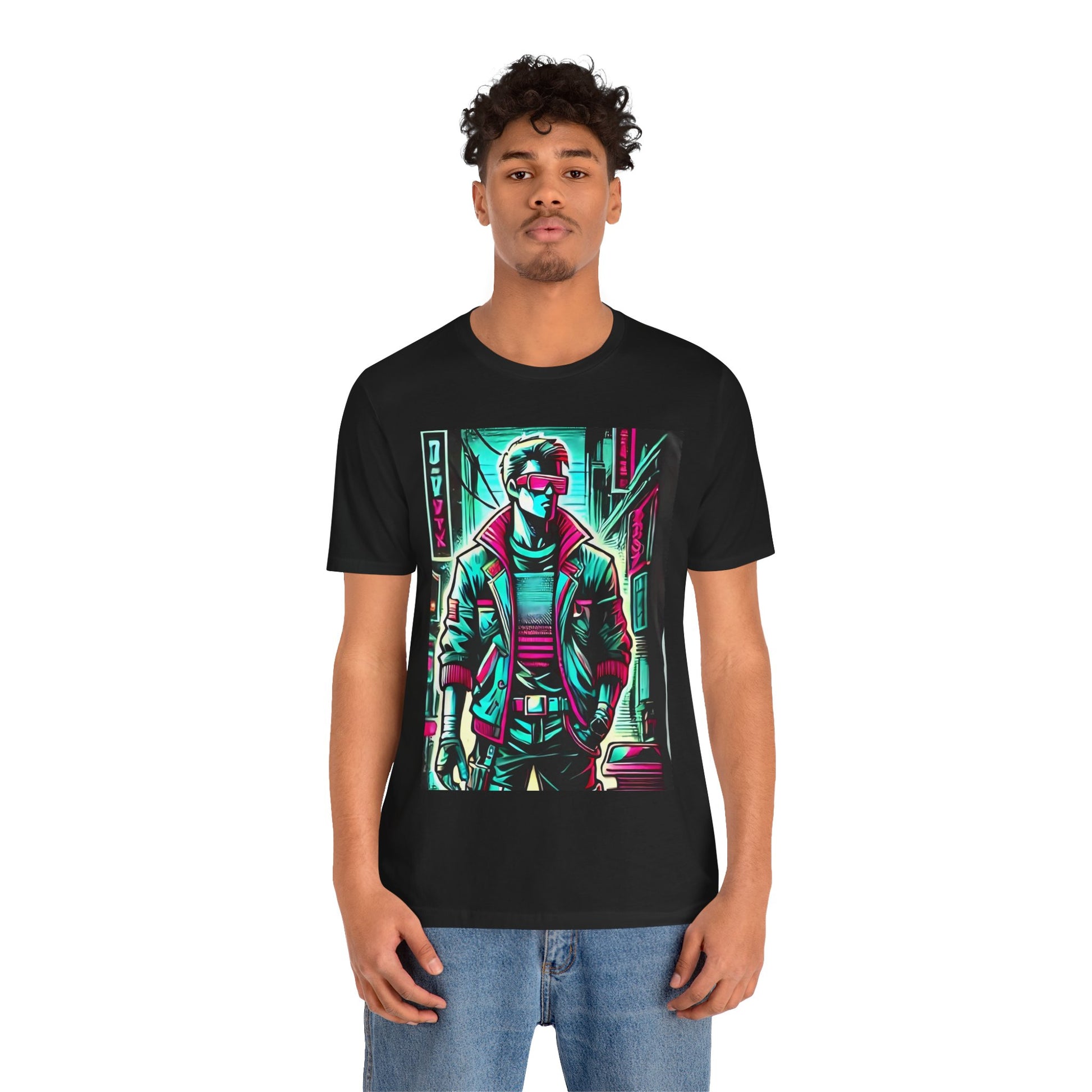 A stylized figure in a mix of modern and 80s-style streetwear, glowing with neon accents, set against a gritty cyberpunk backdrop.