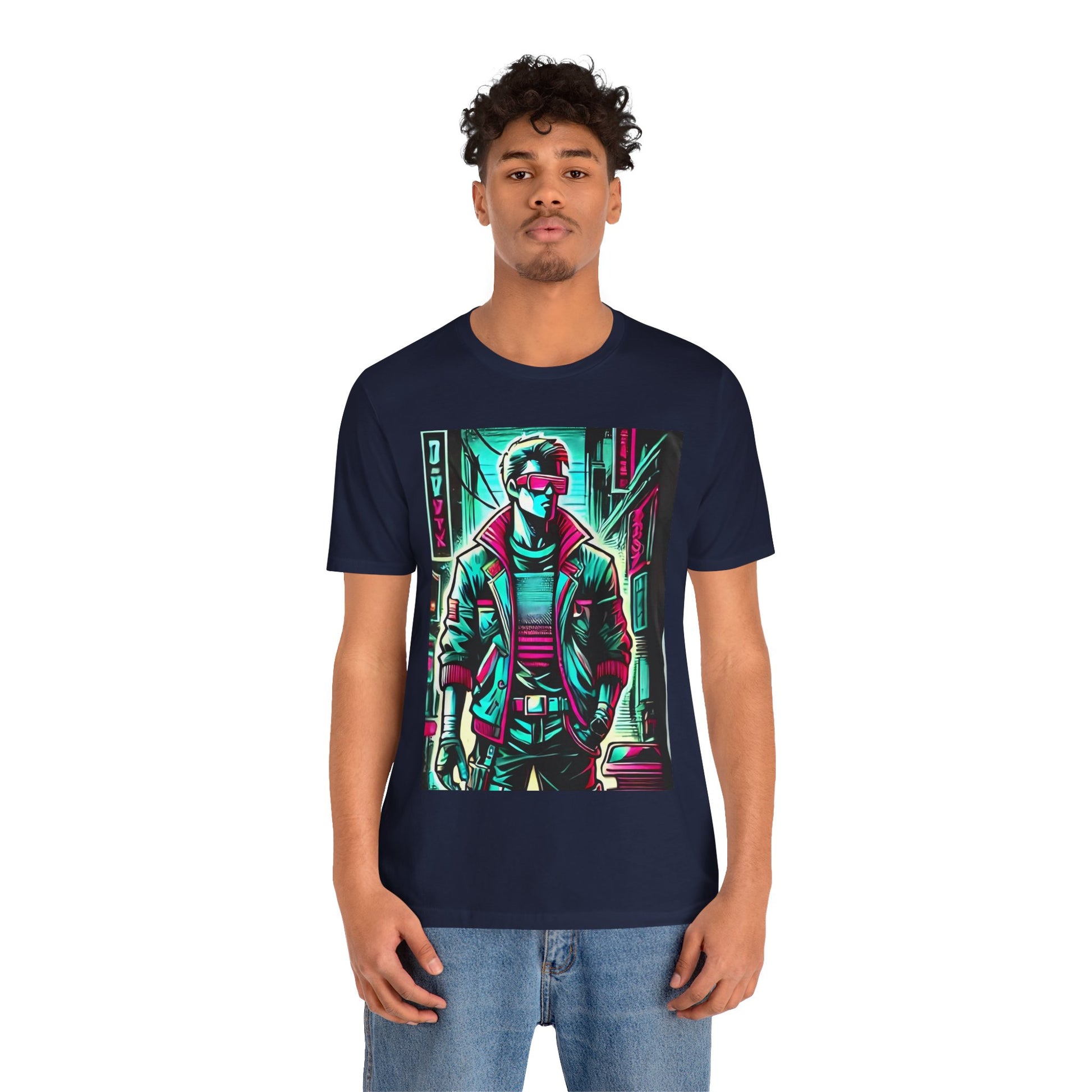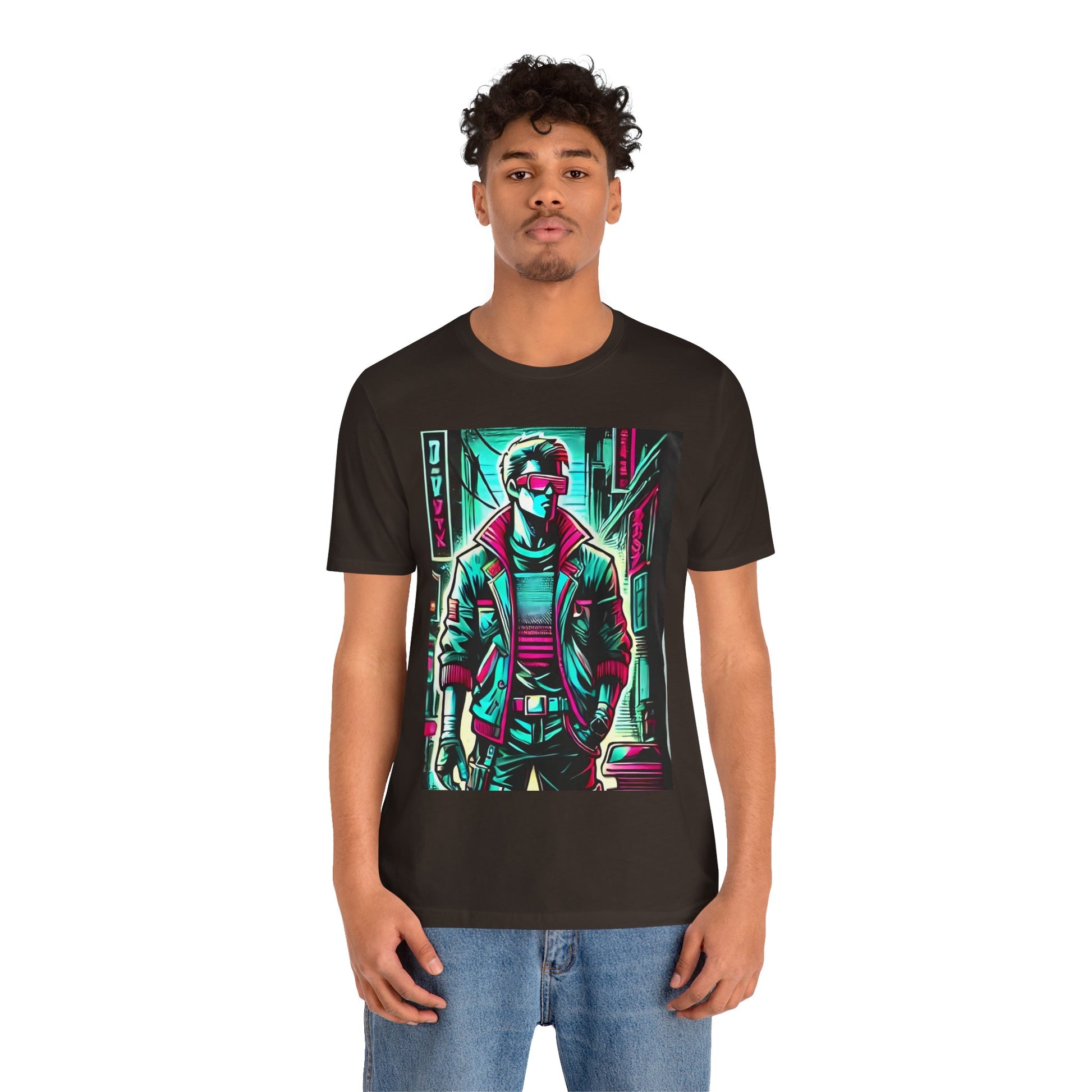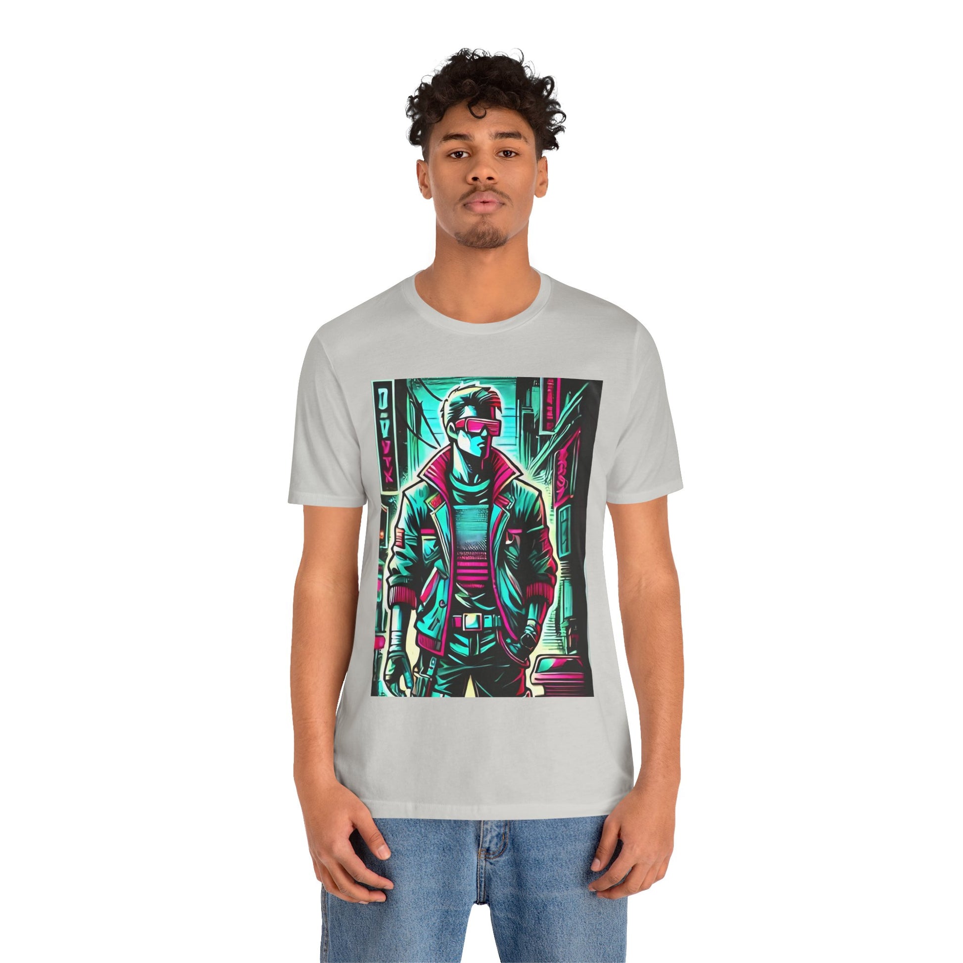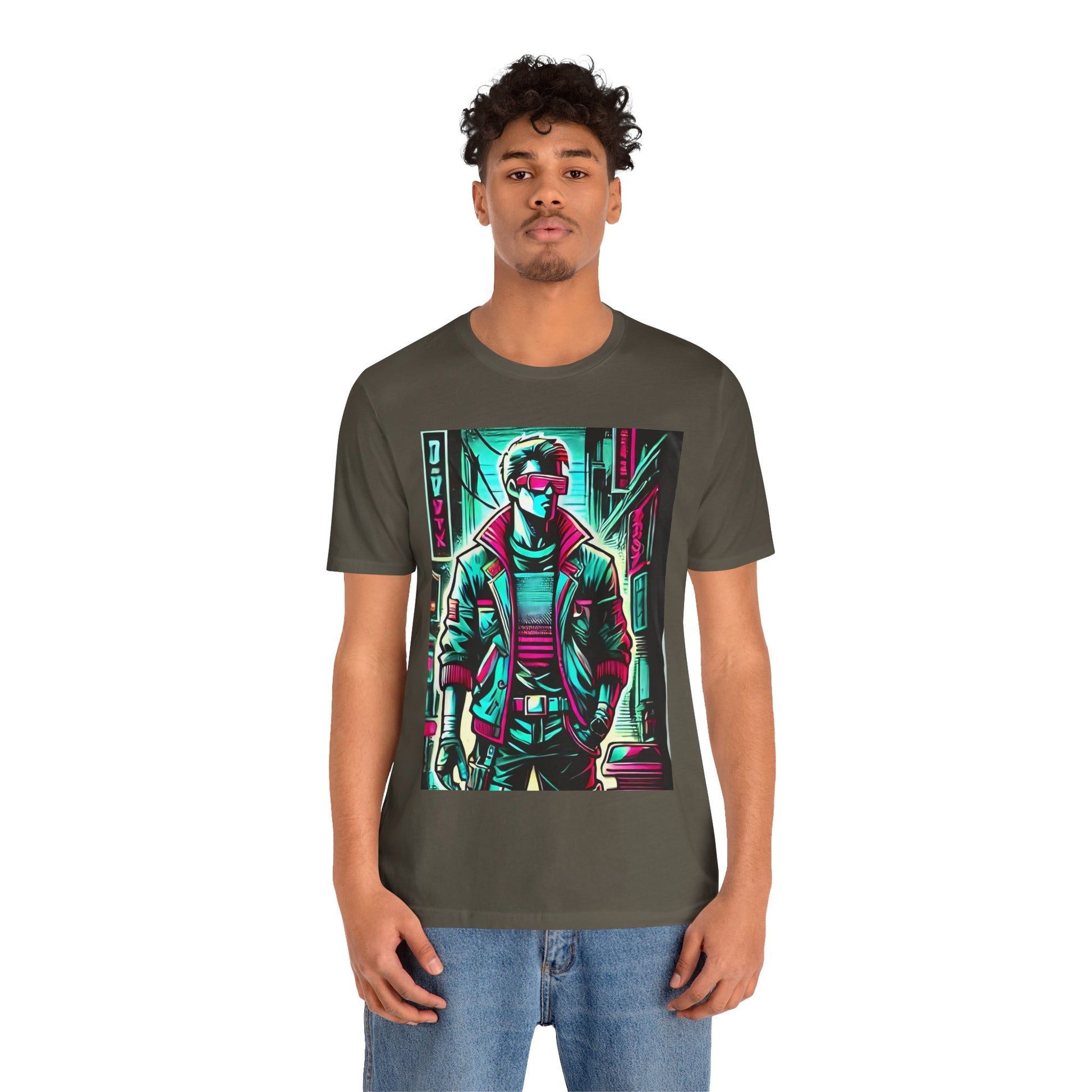 A stylized figure in a mix of modern and 80s-style streetwear, glowing with neon accents, set against a gritty cyberpunk backdrop.