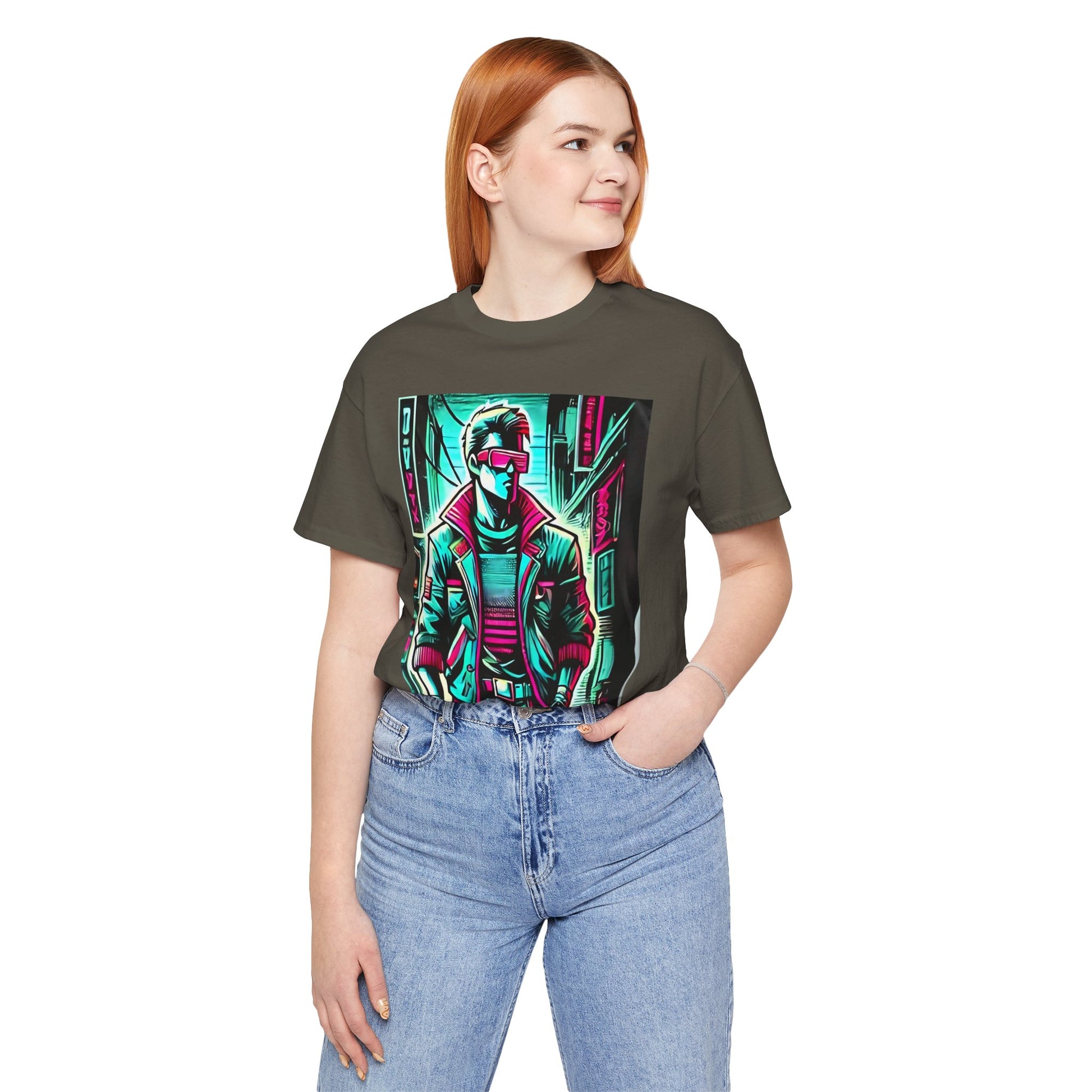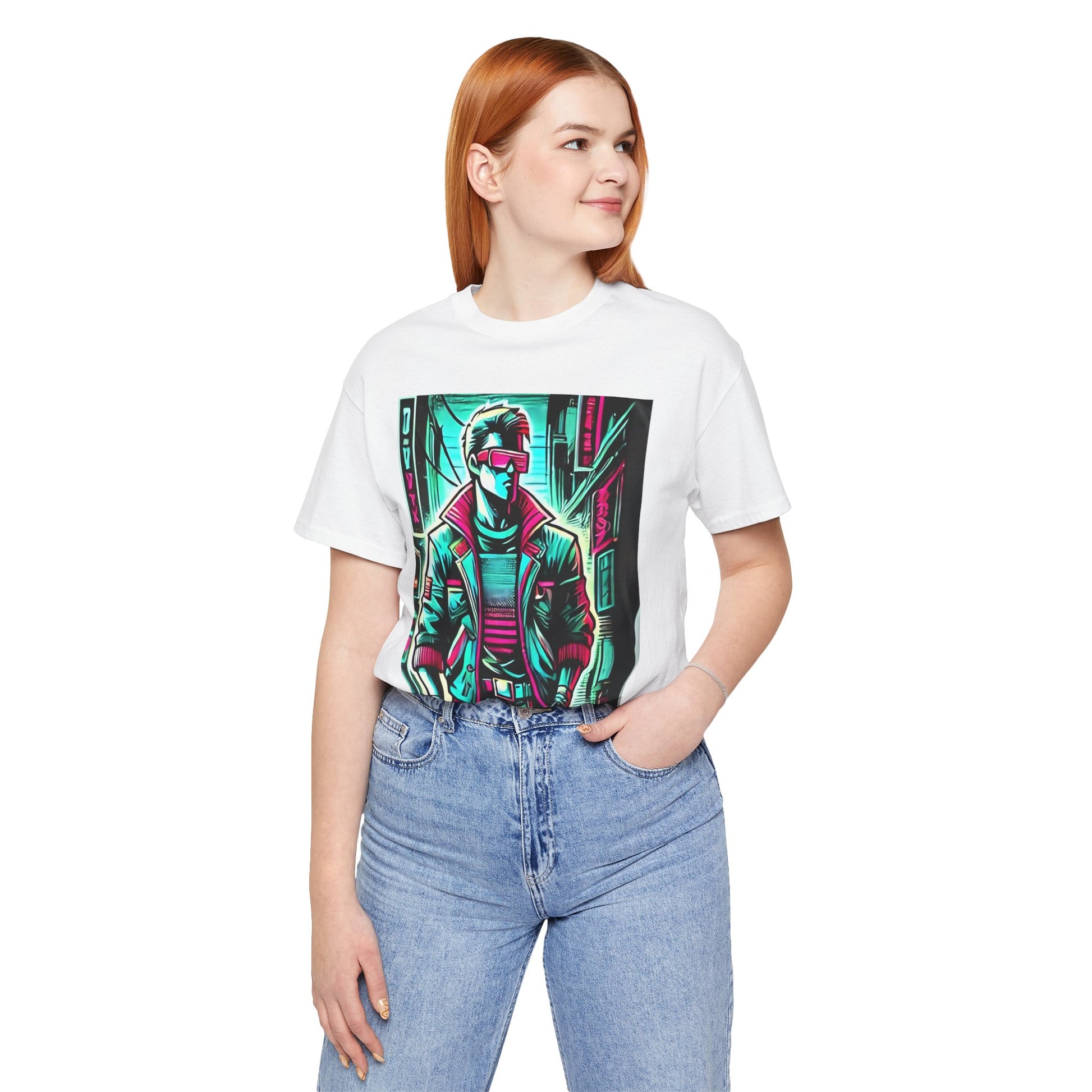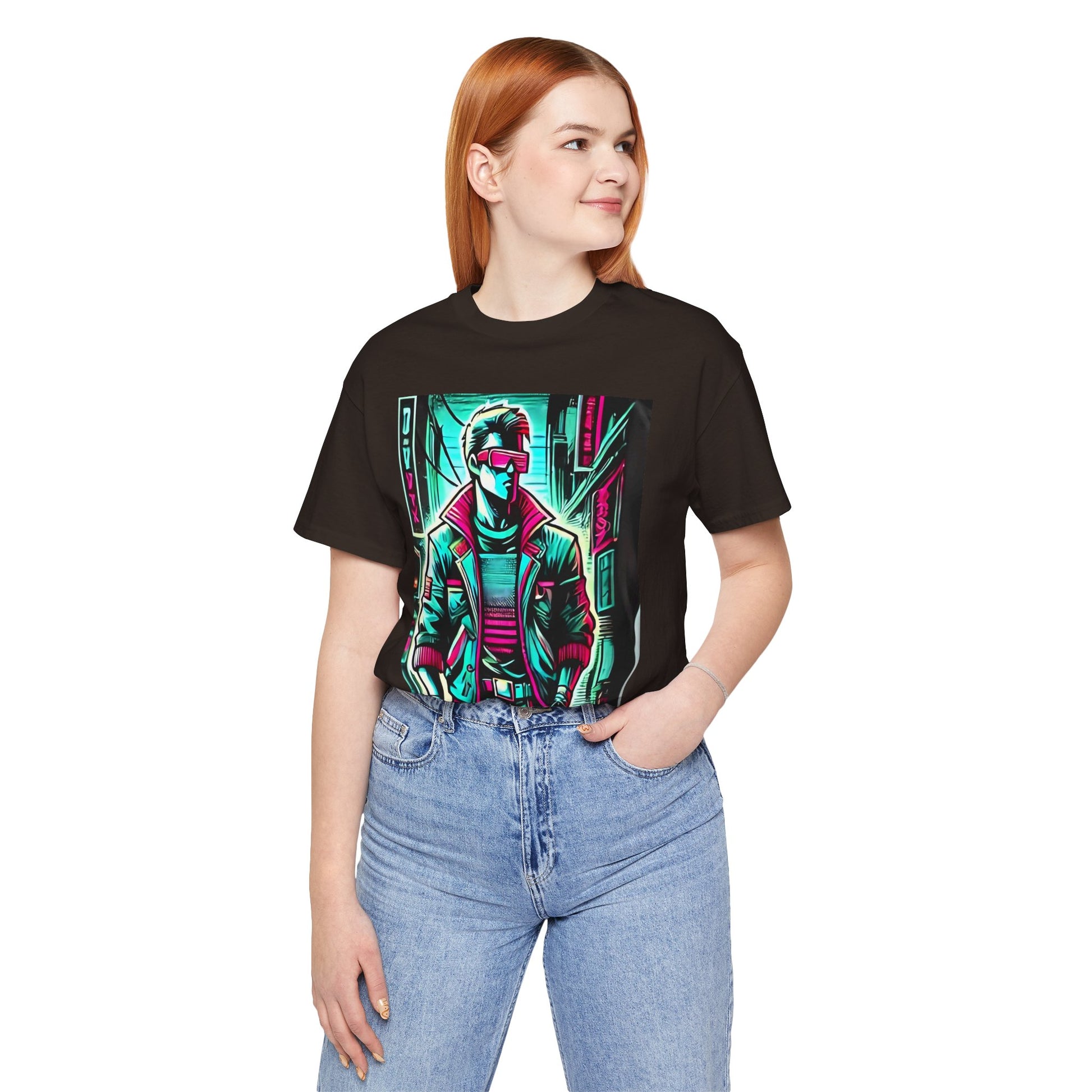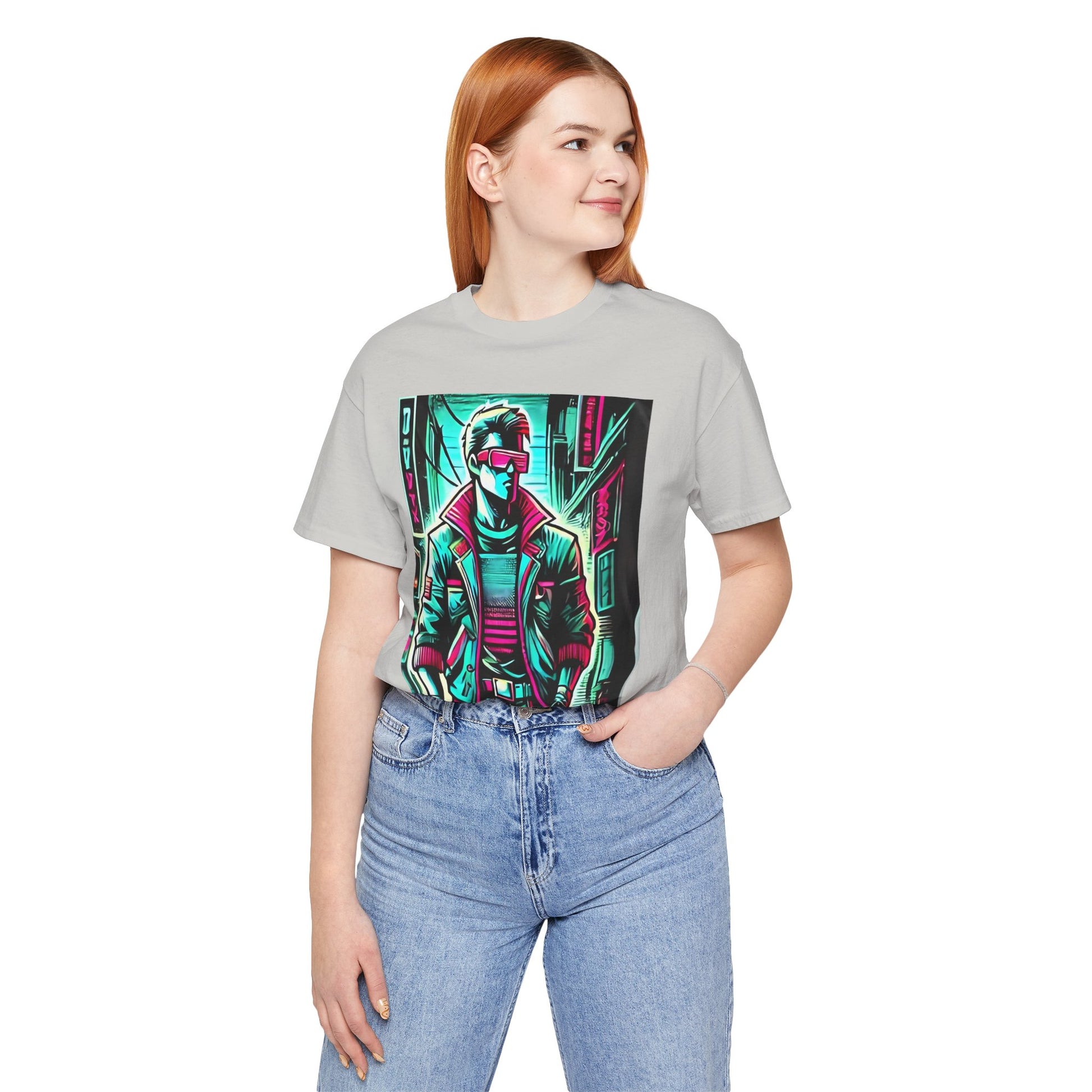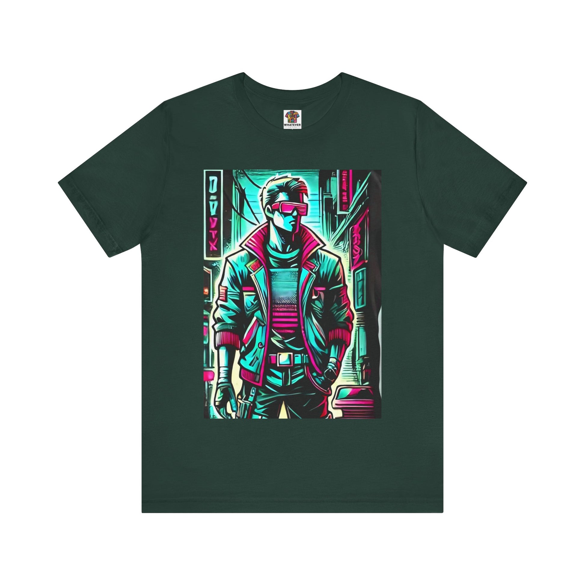 A stylized figure in a mix of modern and 80s-style streetwear, glowing with neon accents, set against a gritty cyberpunk backdrop.