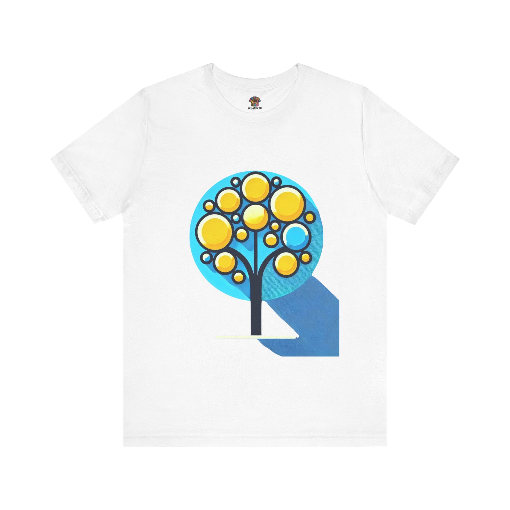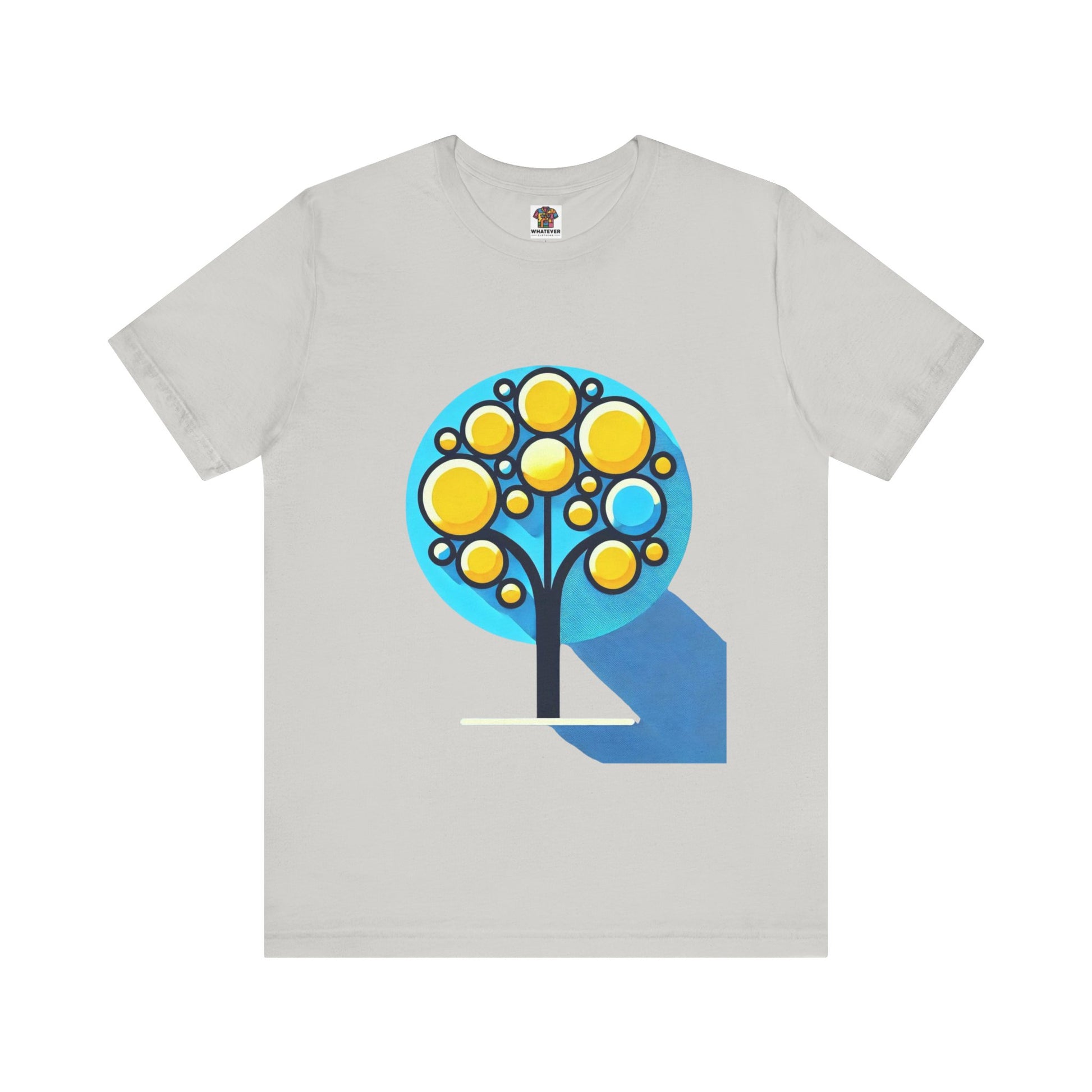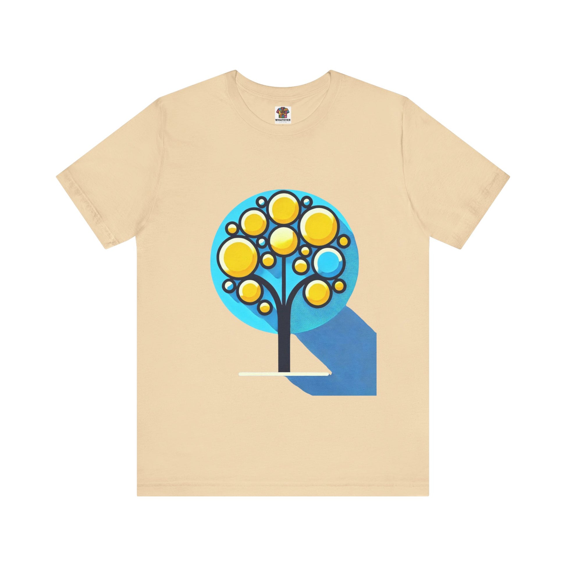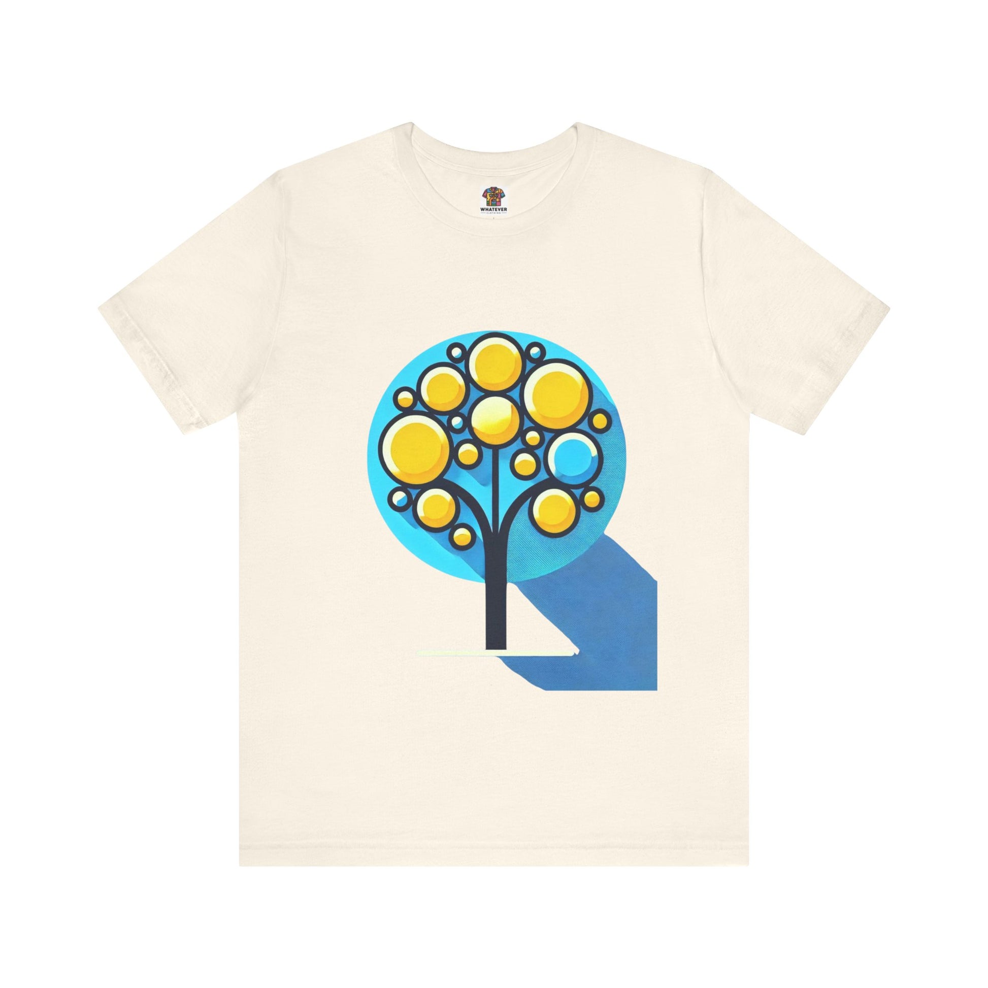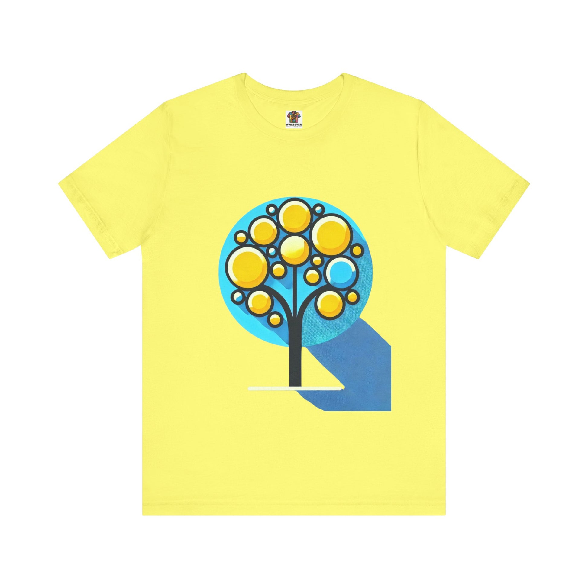 A stylized tree with circular yellow leaves and a thin, elongated trunk, against a blue background, featuring bold shapes.