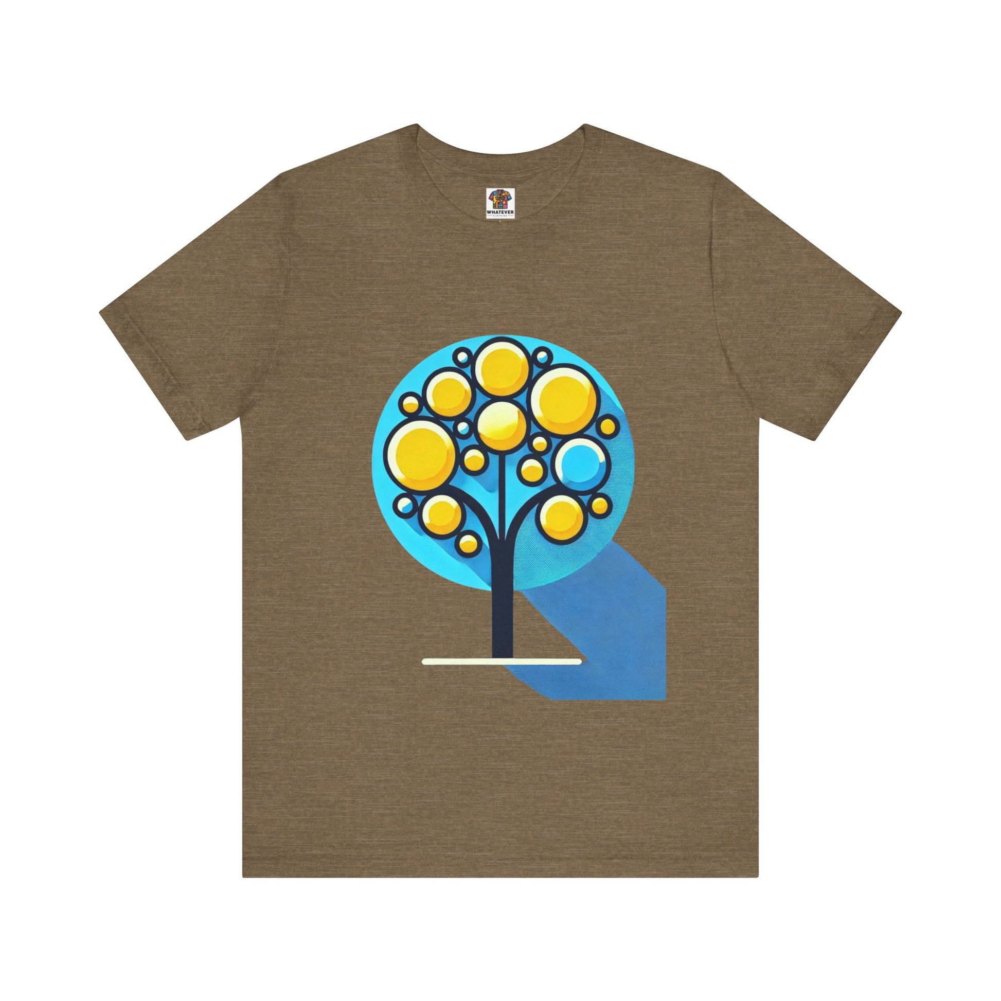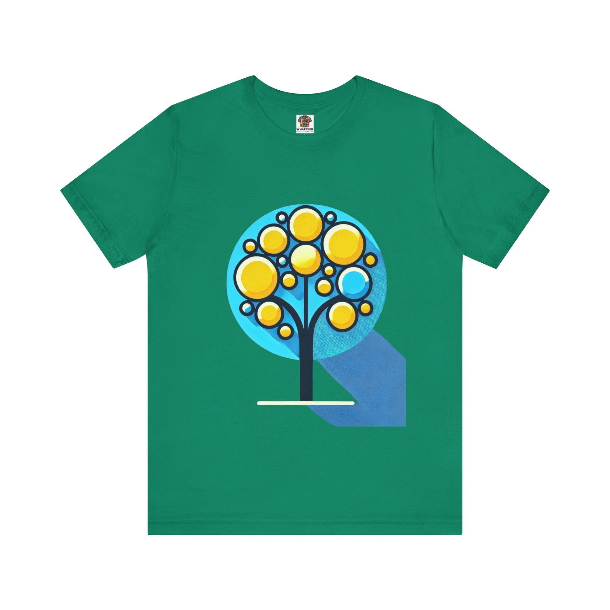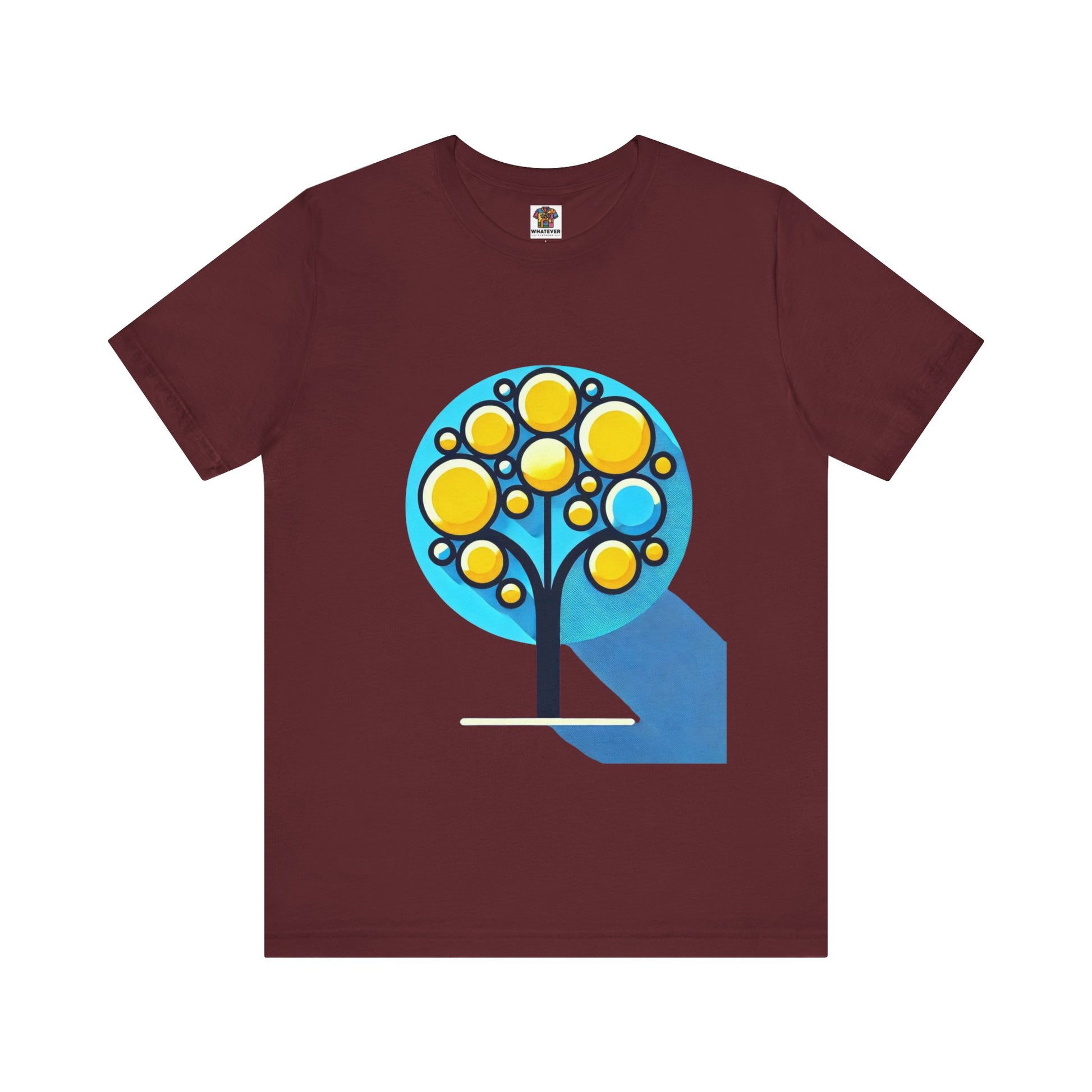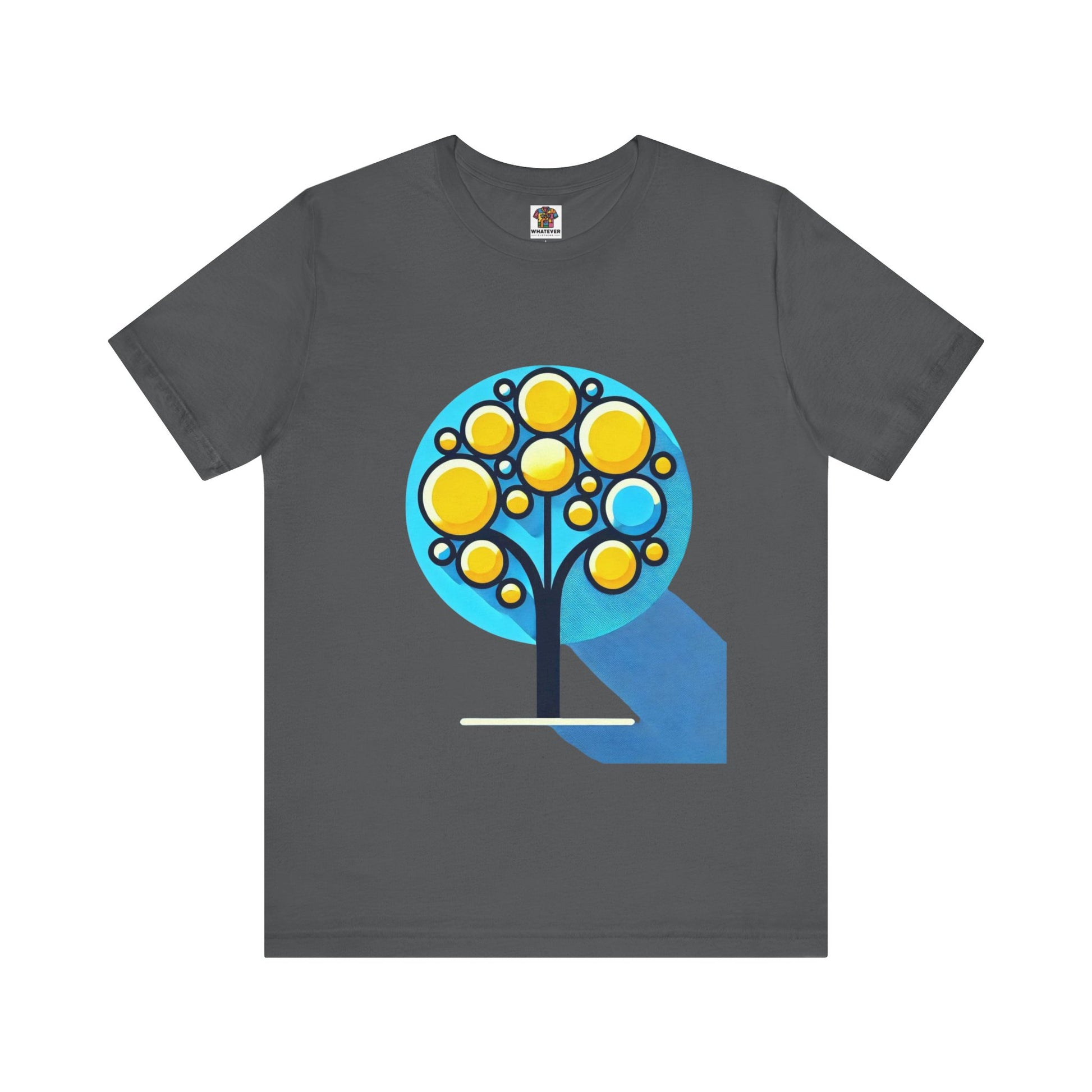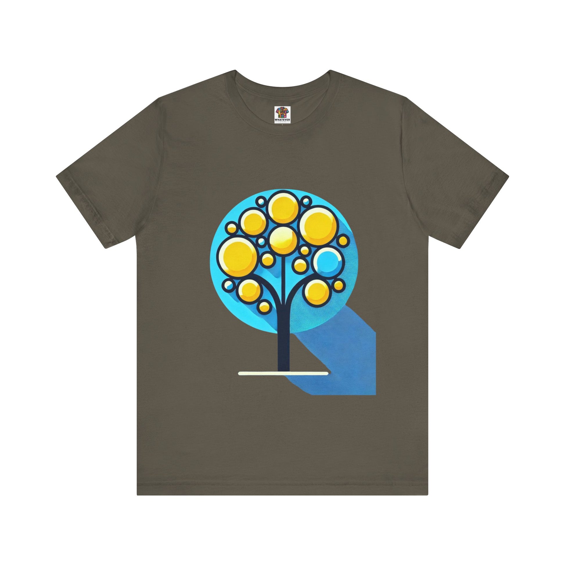 A stylized tree with circular yellow leaves and a thin, elongated trunk, against a blue background, featuring bold shapes.
