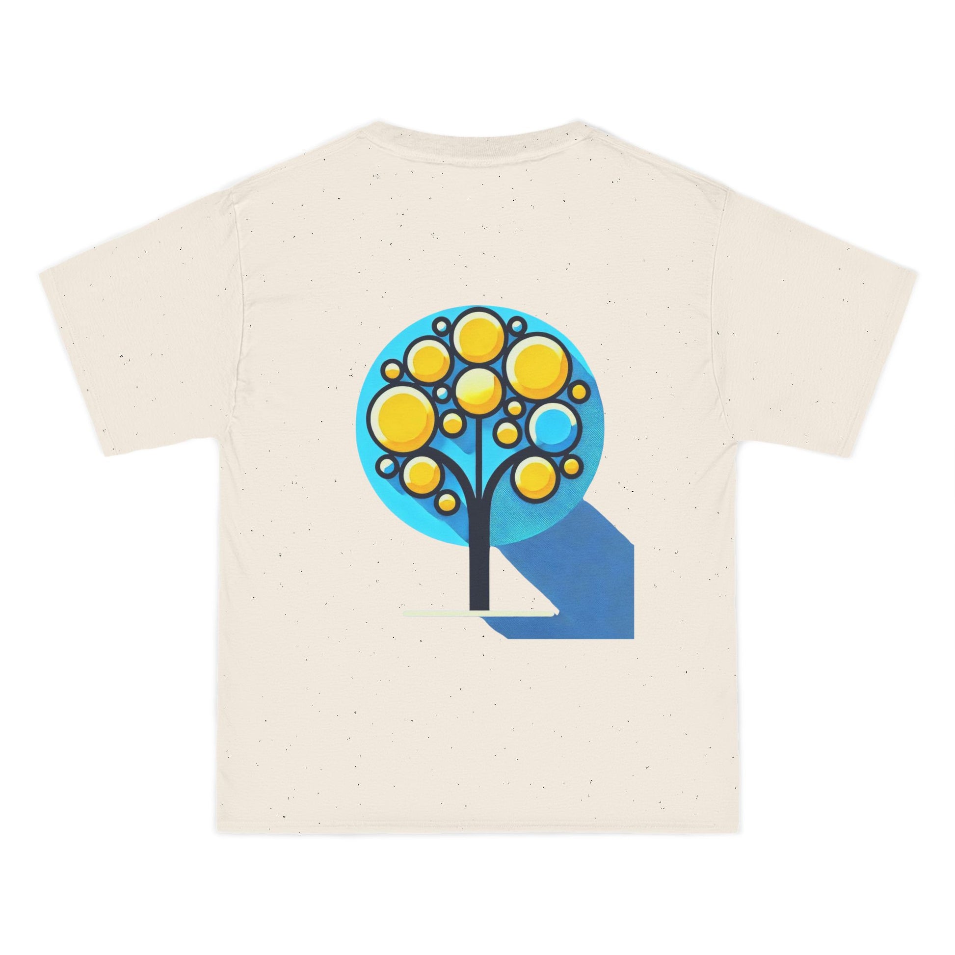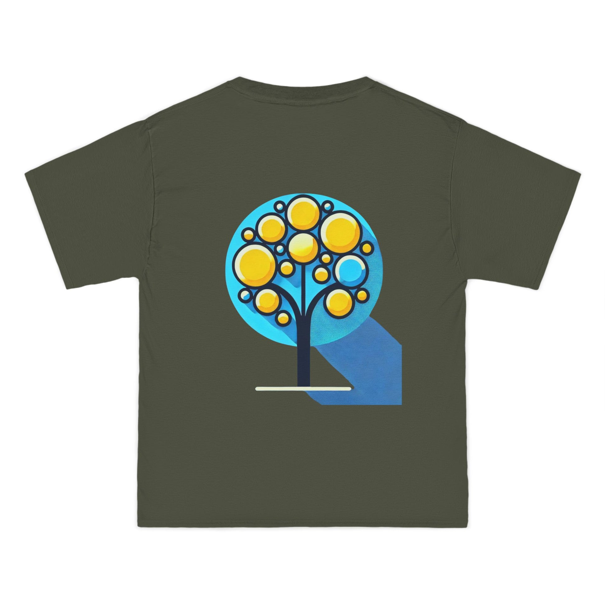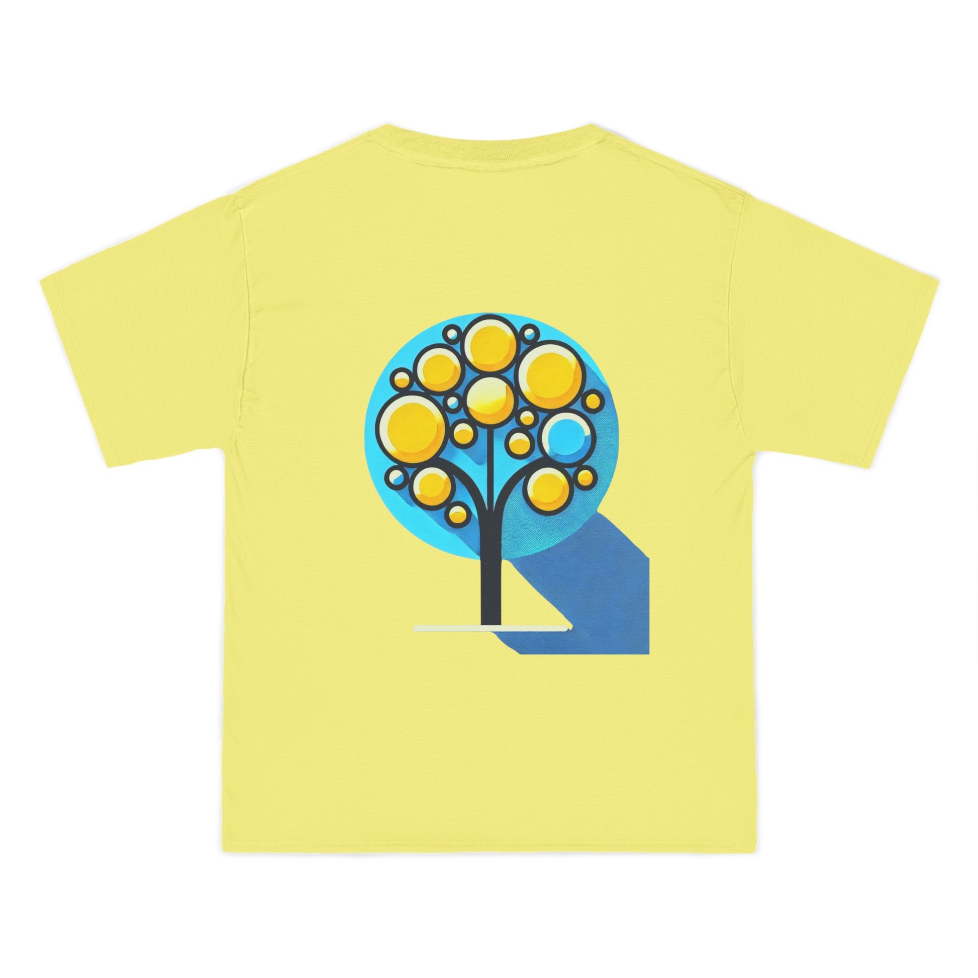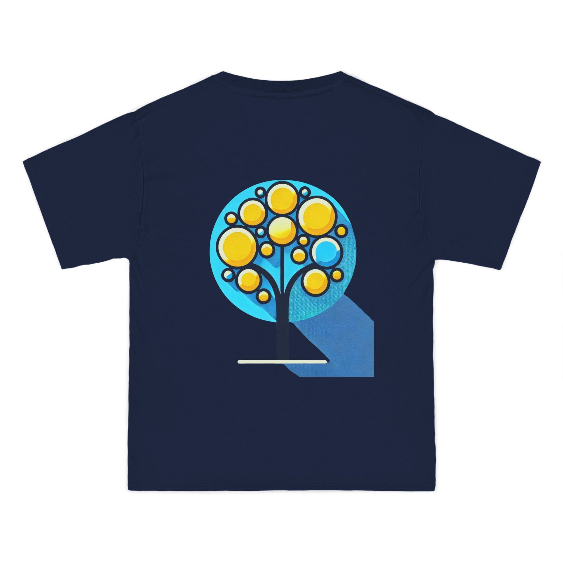 Unleash your creativity and wear your world with our Stylized Tree: Surreal Minimalism tee. This piece of wearable art features a surrealistic tree, its elongated trunk reaching for the sky, with circular yellow leaves that twinkle like stars against the backdrop of a serene blue canvas. The bold, minimalist shapes offer a fresh twist on nature's beauty, and the design's vibrant colors are sure to turn heads.