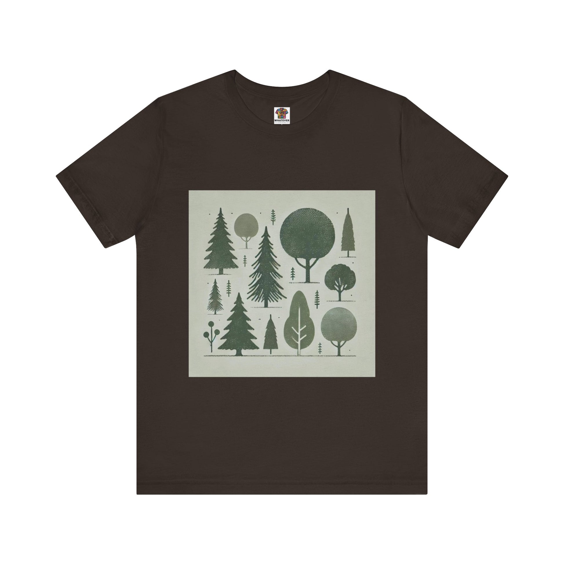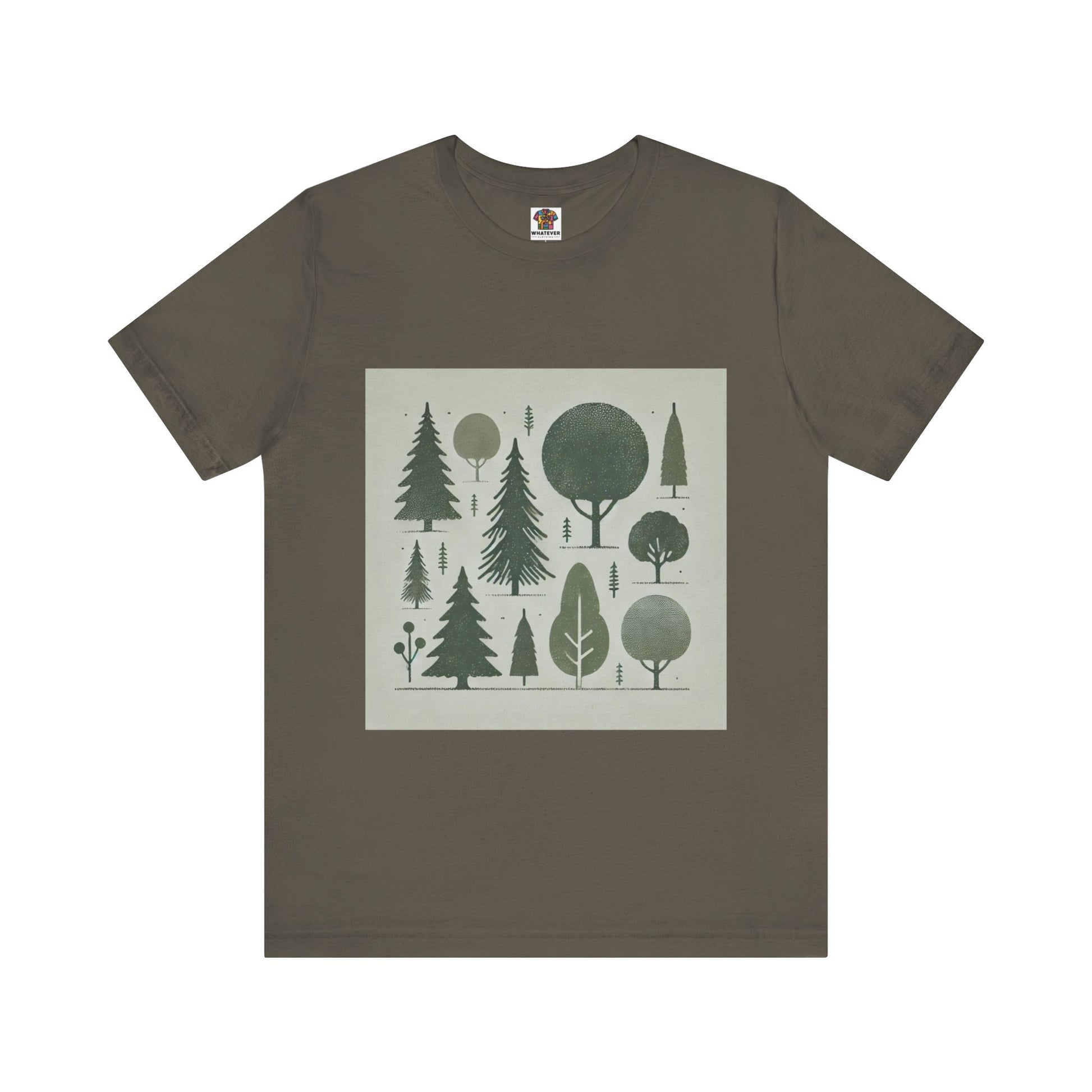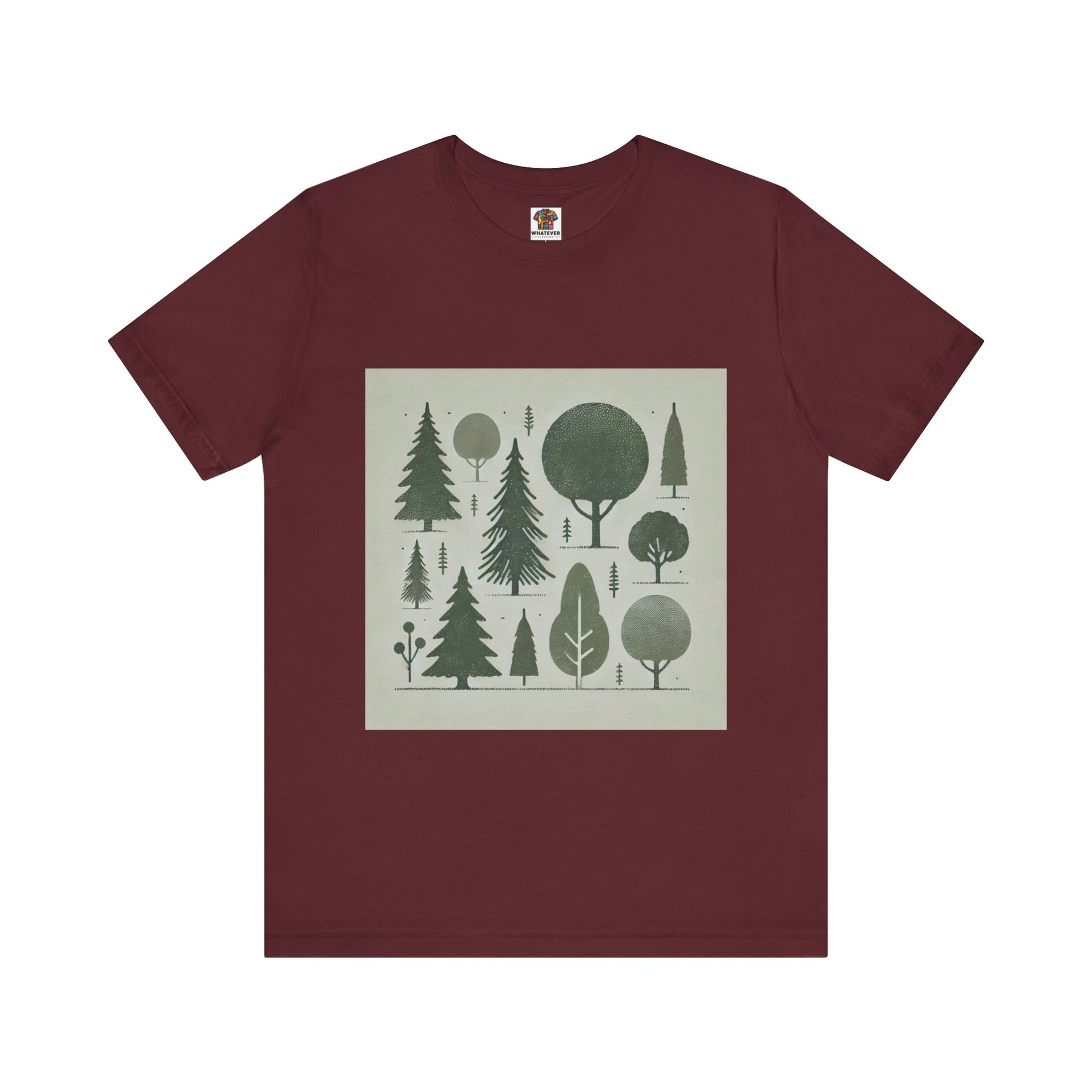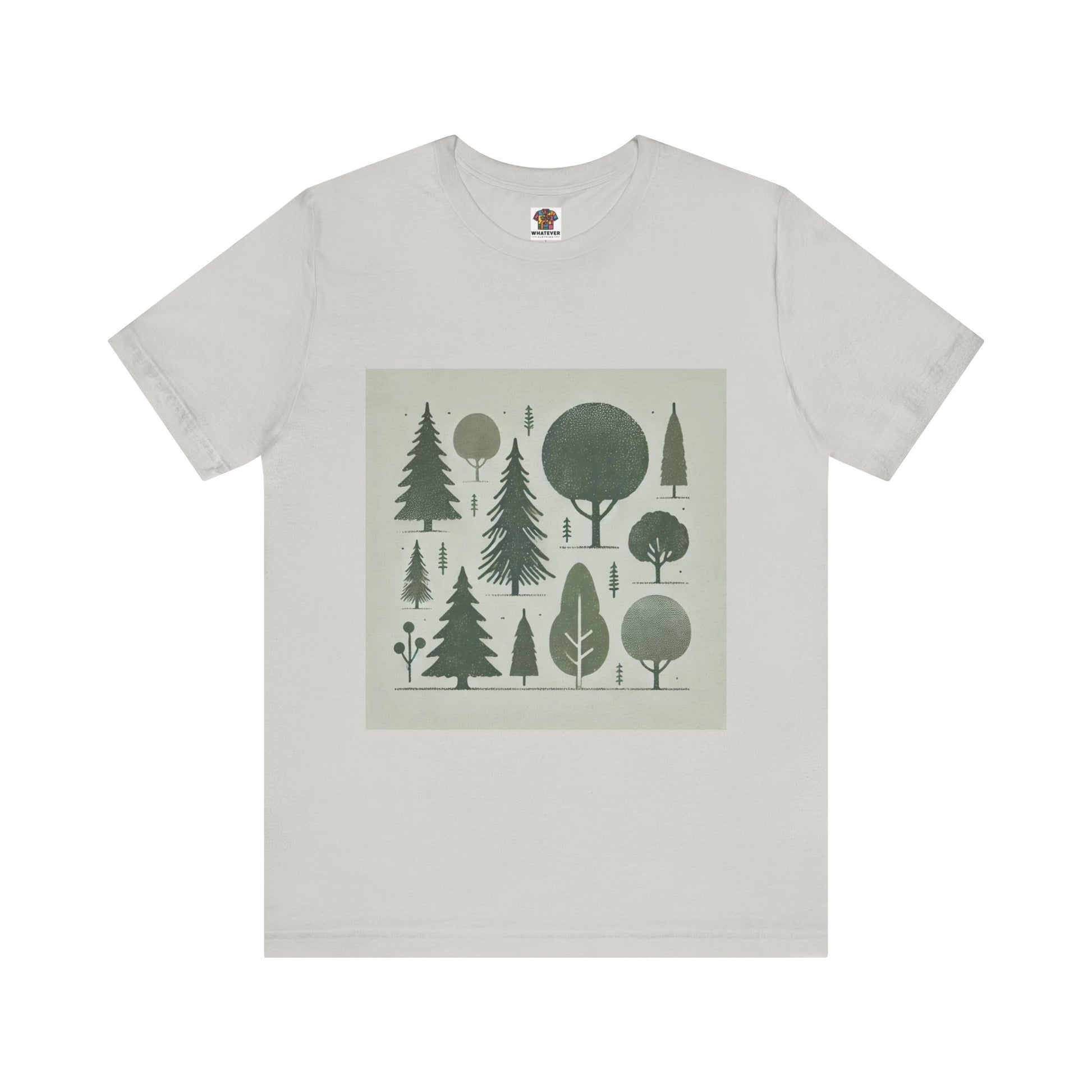 Various tree shapes like pines and oaks, with soft, simple outlines in muted tones, fitting a natural, rustic theme.