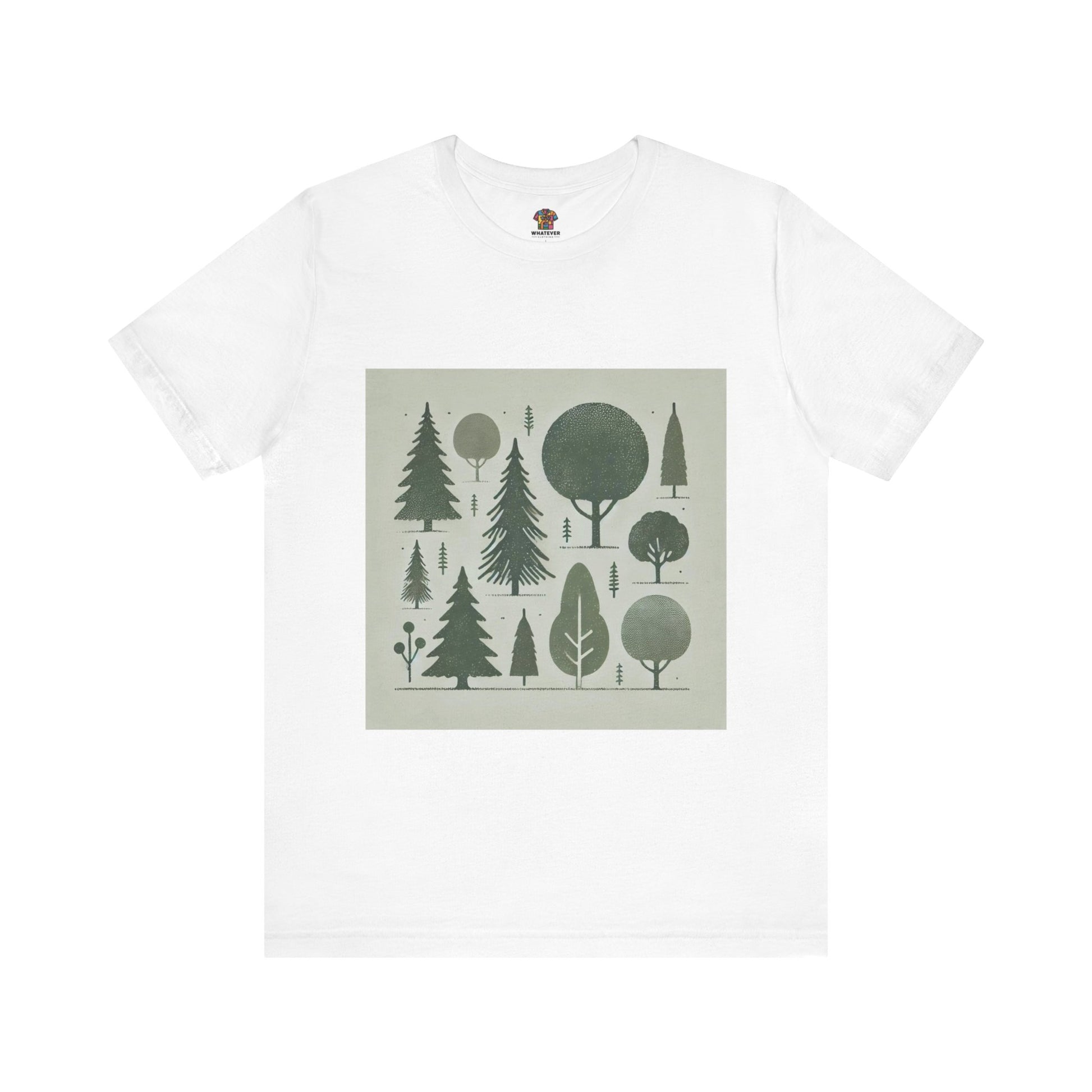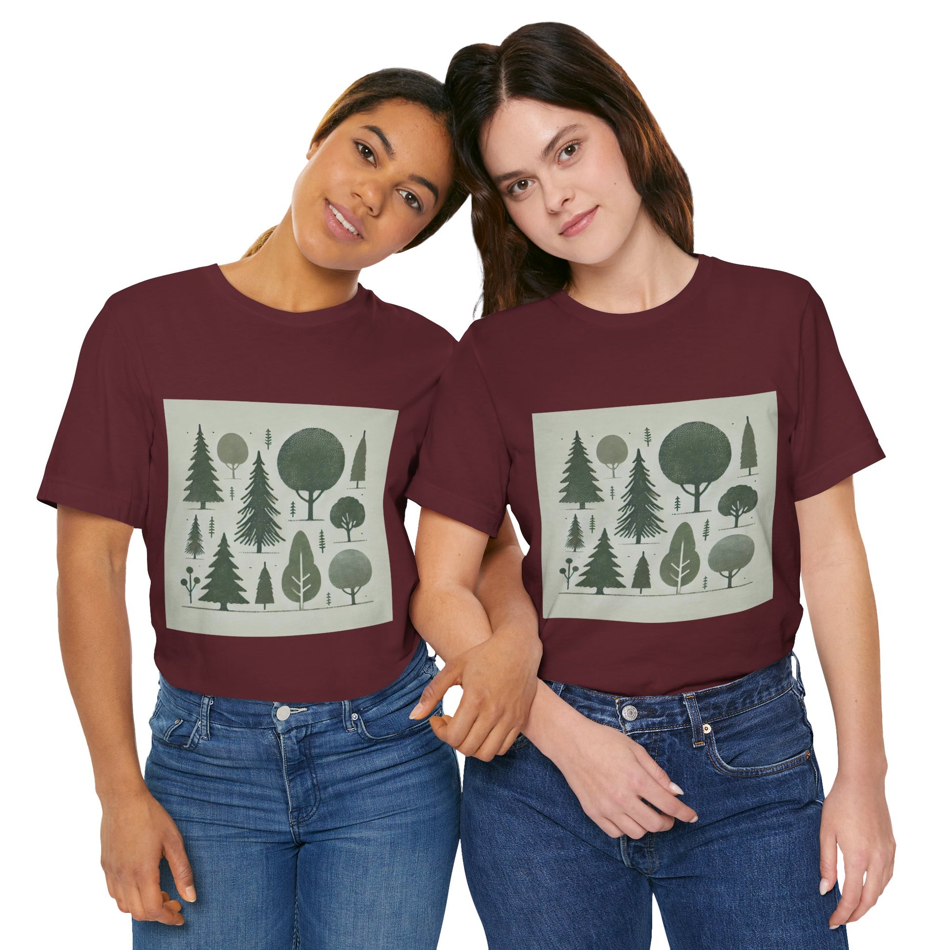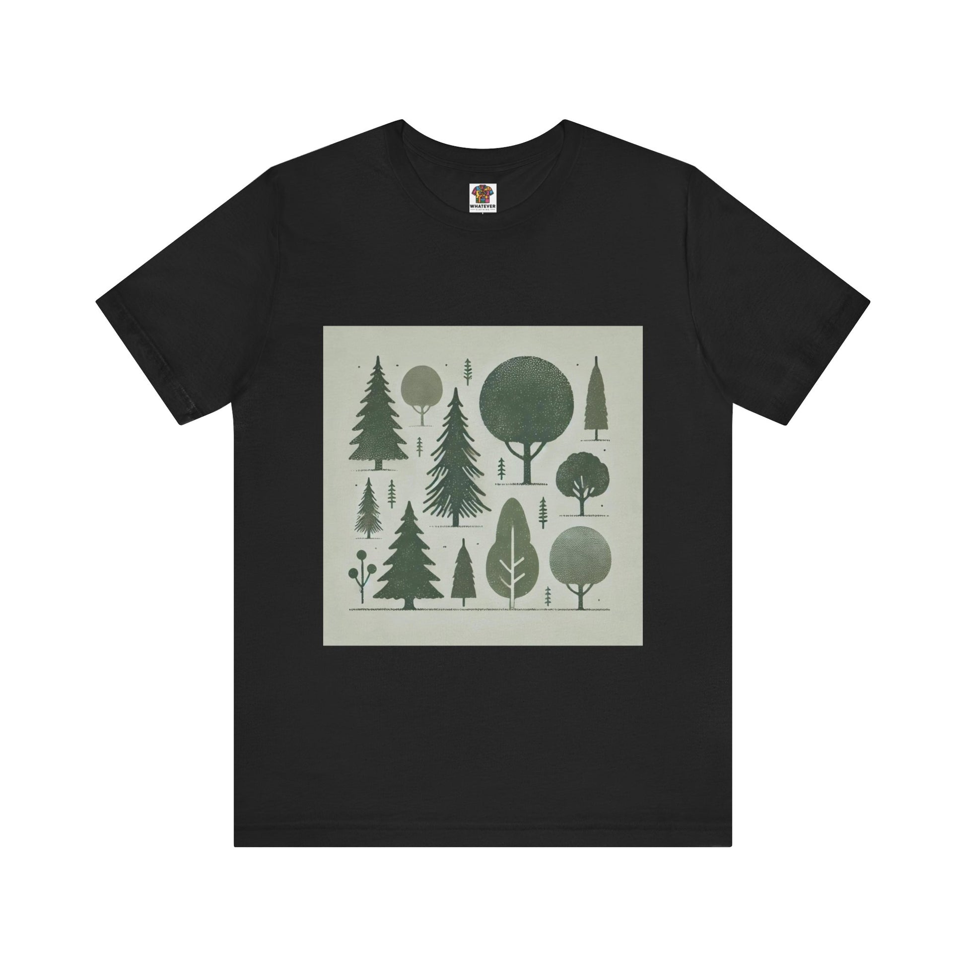Various tree shapes like pines and oaks, with soft, simple outlines in muted tones, fitting a natural, rustic theme.