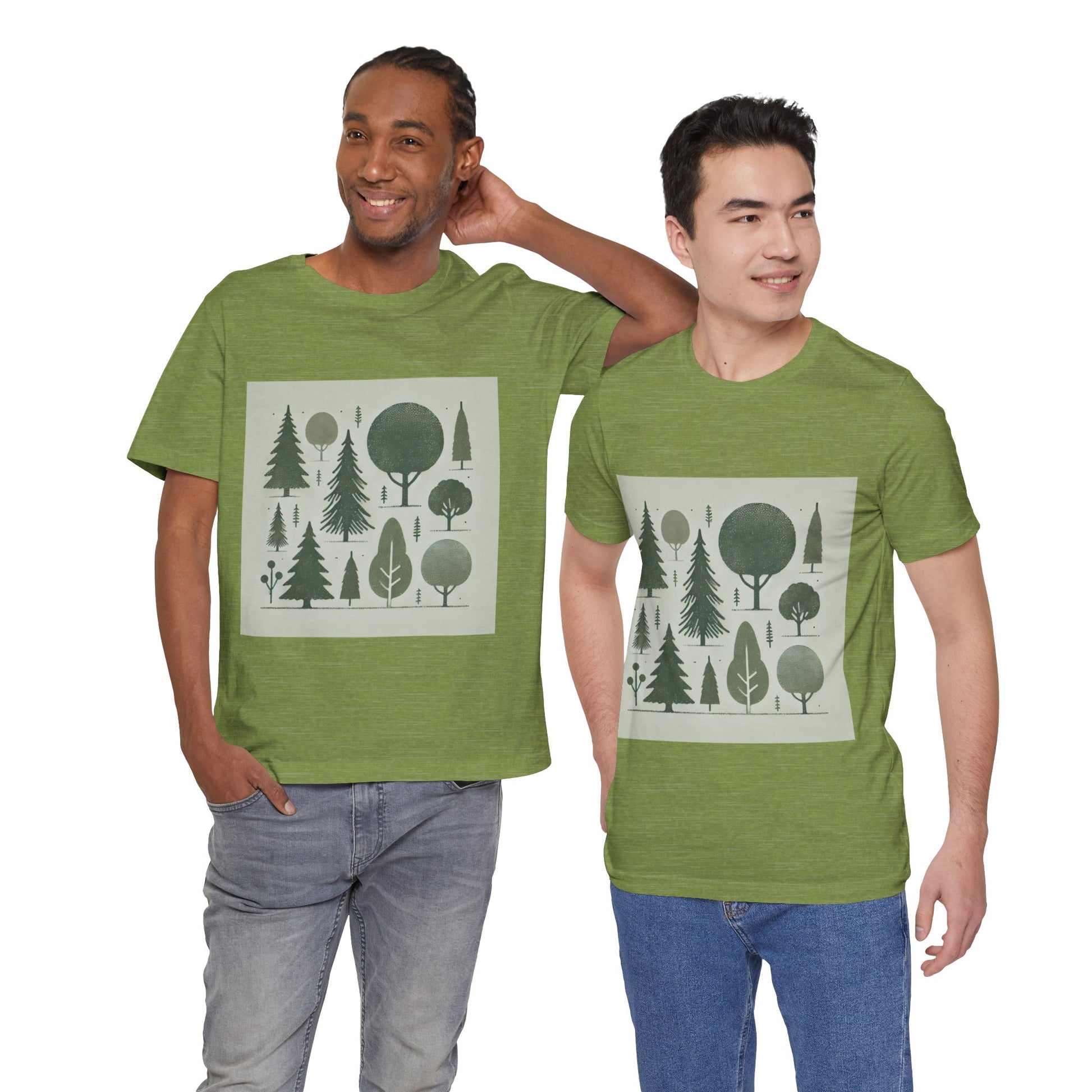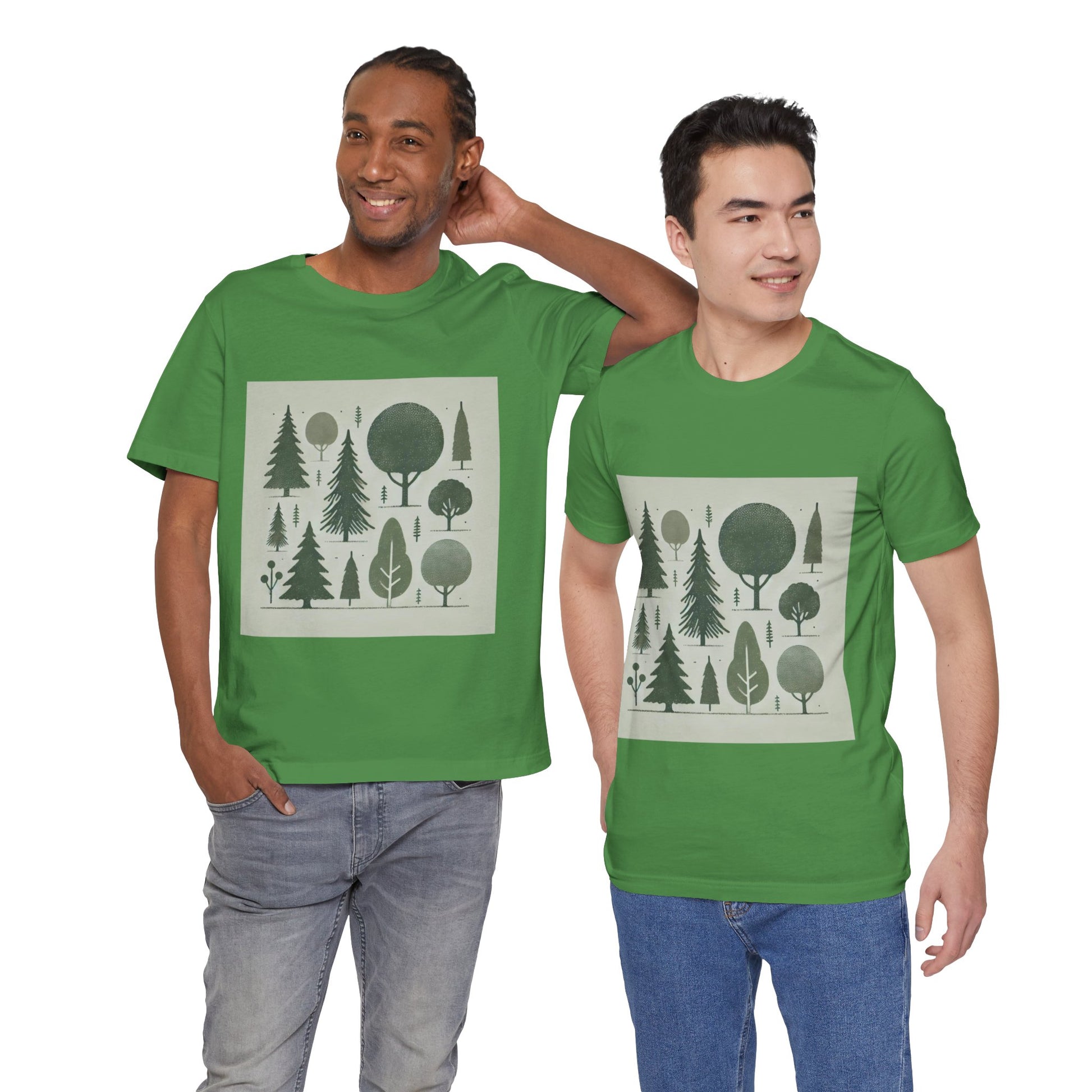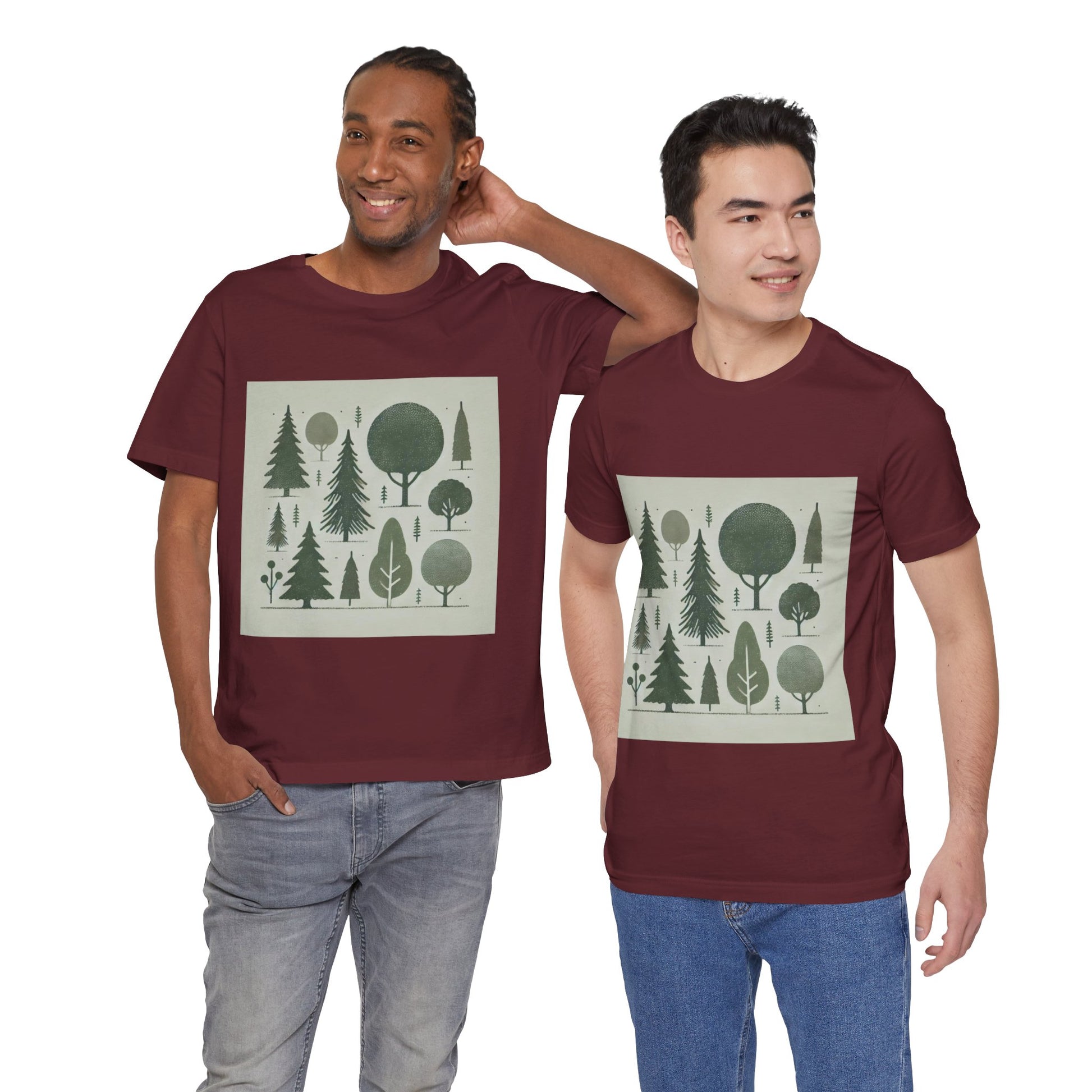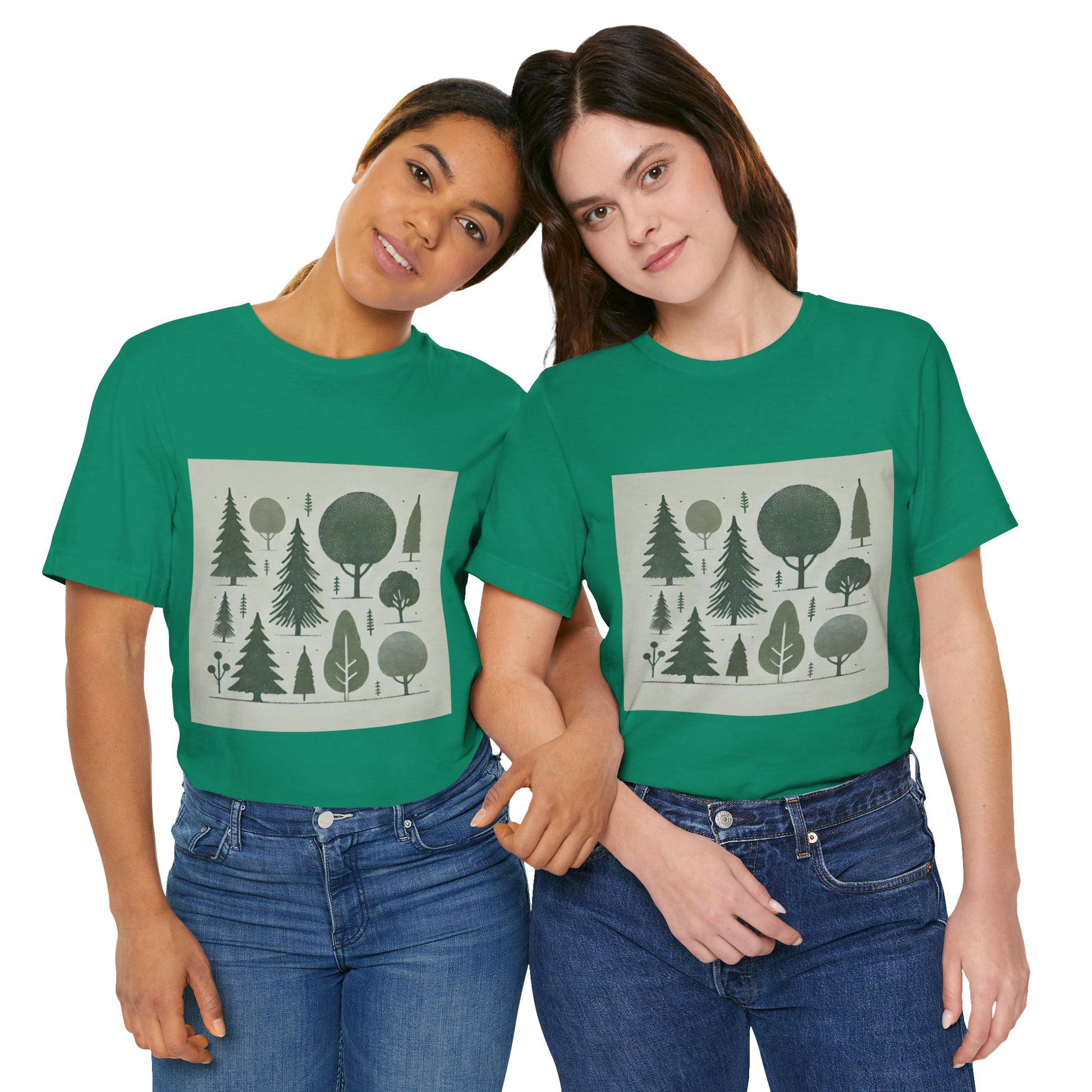 Various tree shapes like pines and oaks, with soft, simple outlines in muted tones, fitting a natural, rustic theme.