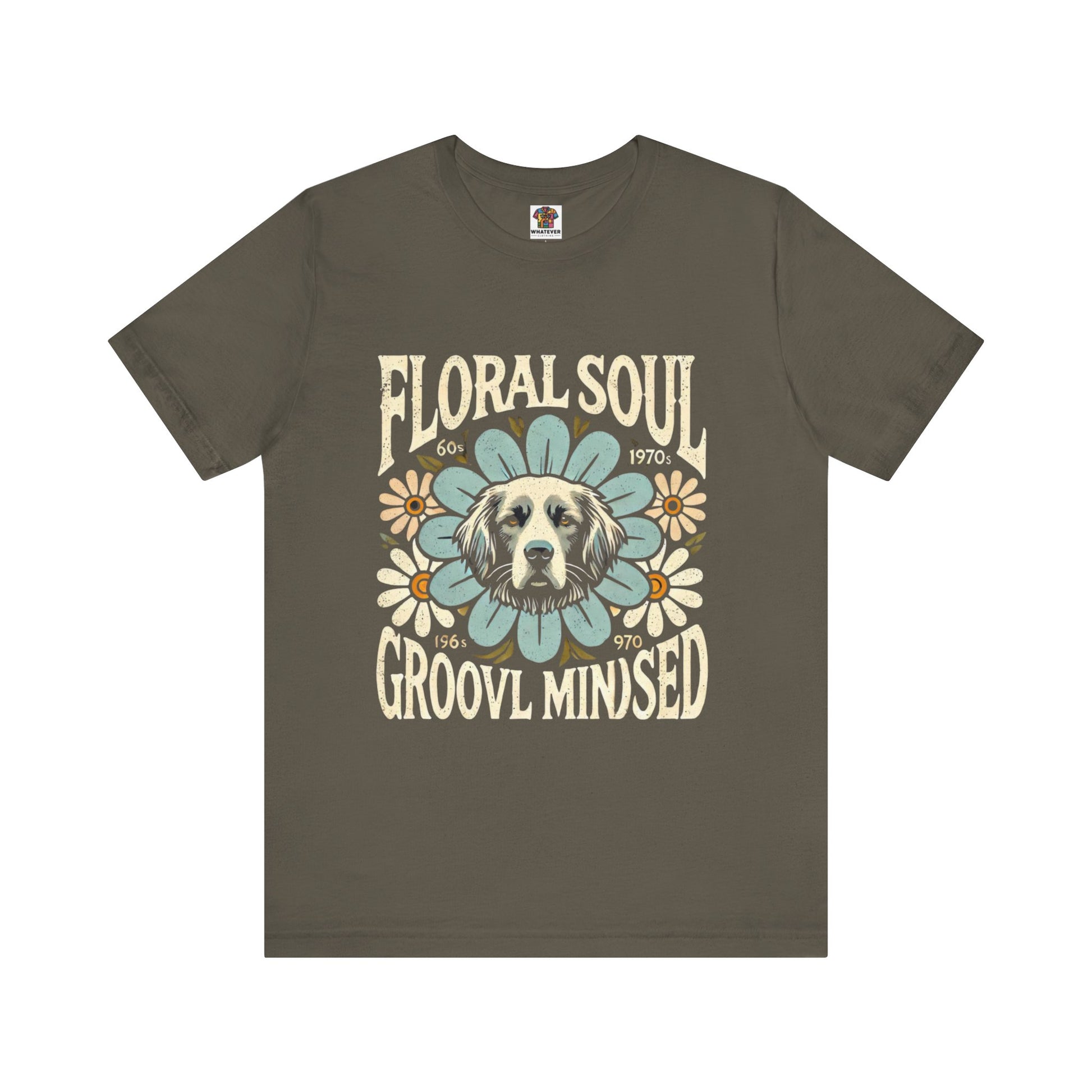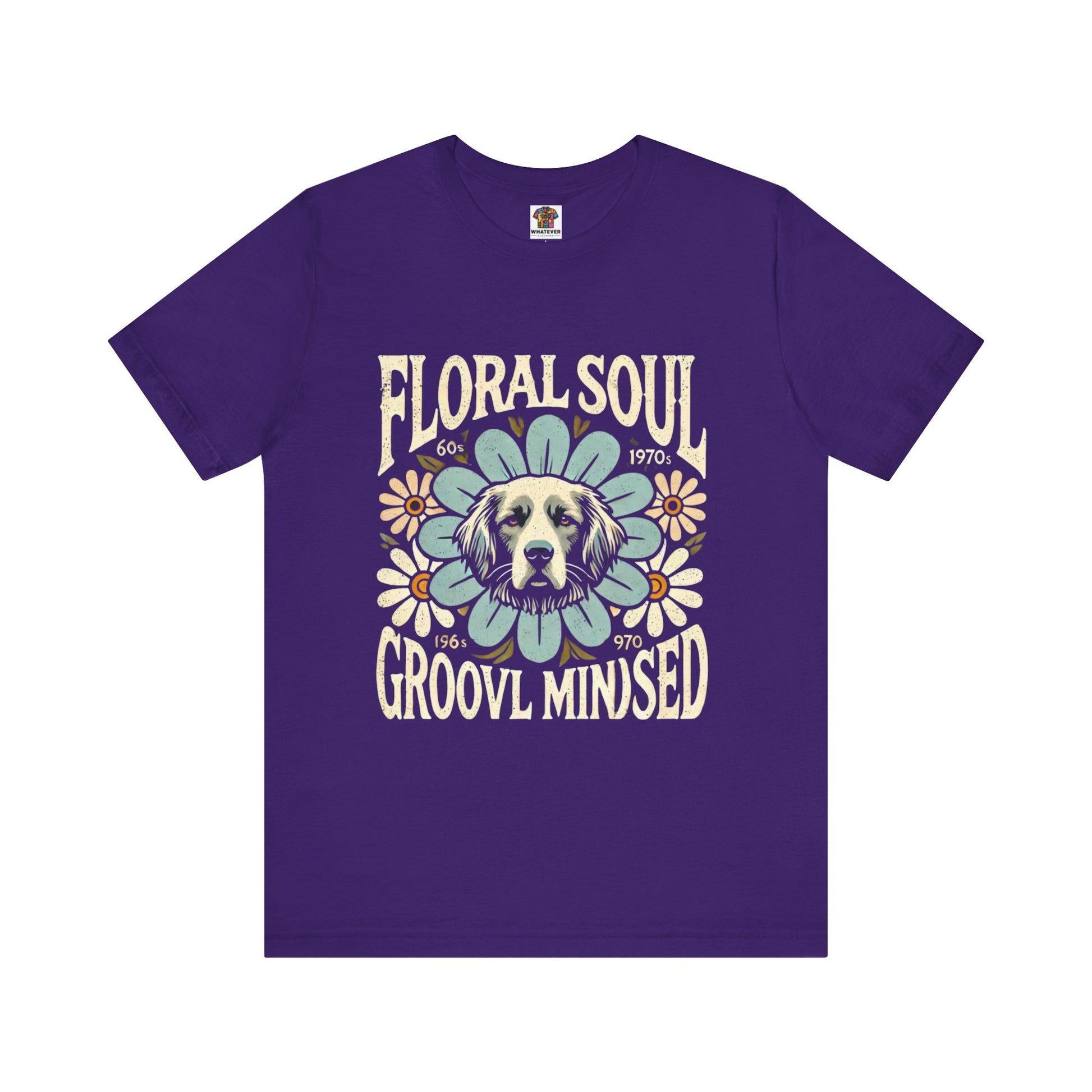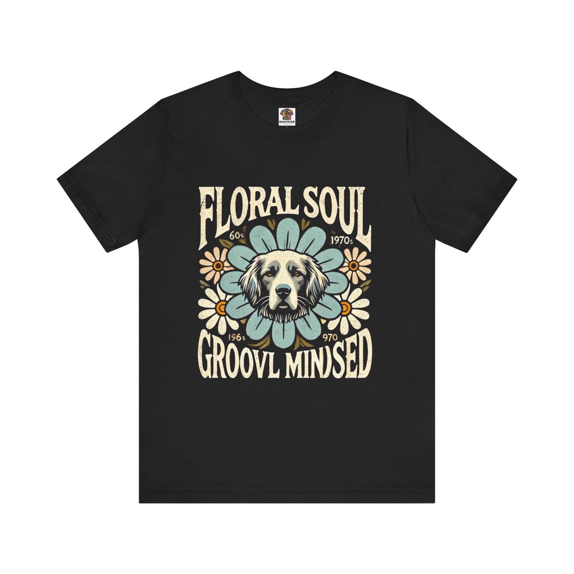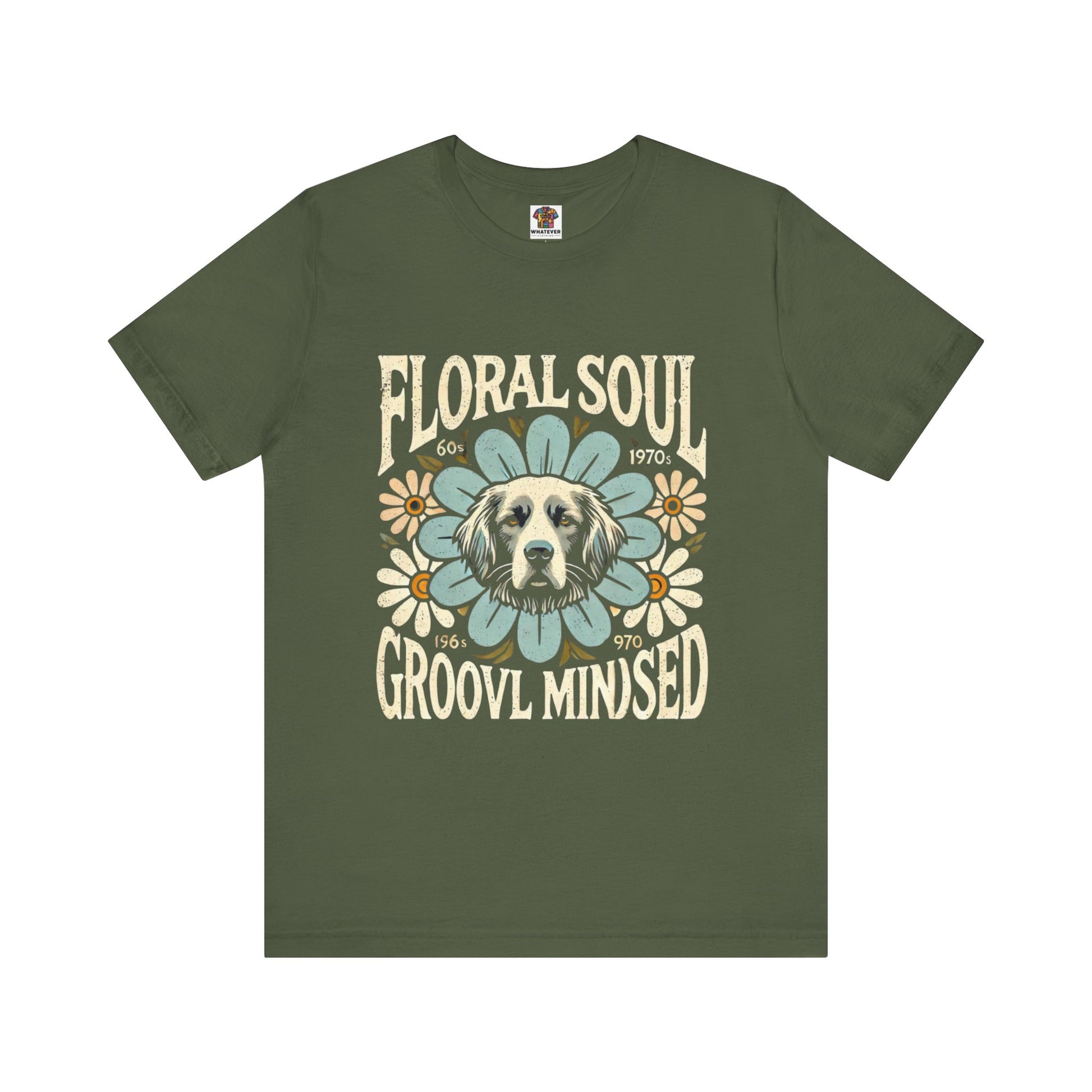 A groovy retro t-shirt design featuring a dog’s face centered within a large stylized flower. The design includes bold text saying "FLORAL SOUL" and "GROOVY MINDSET," and smaller text referencing the 1960s and 1970s. The color palette is pastel tones, with distressed textures for a vintage feel.