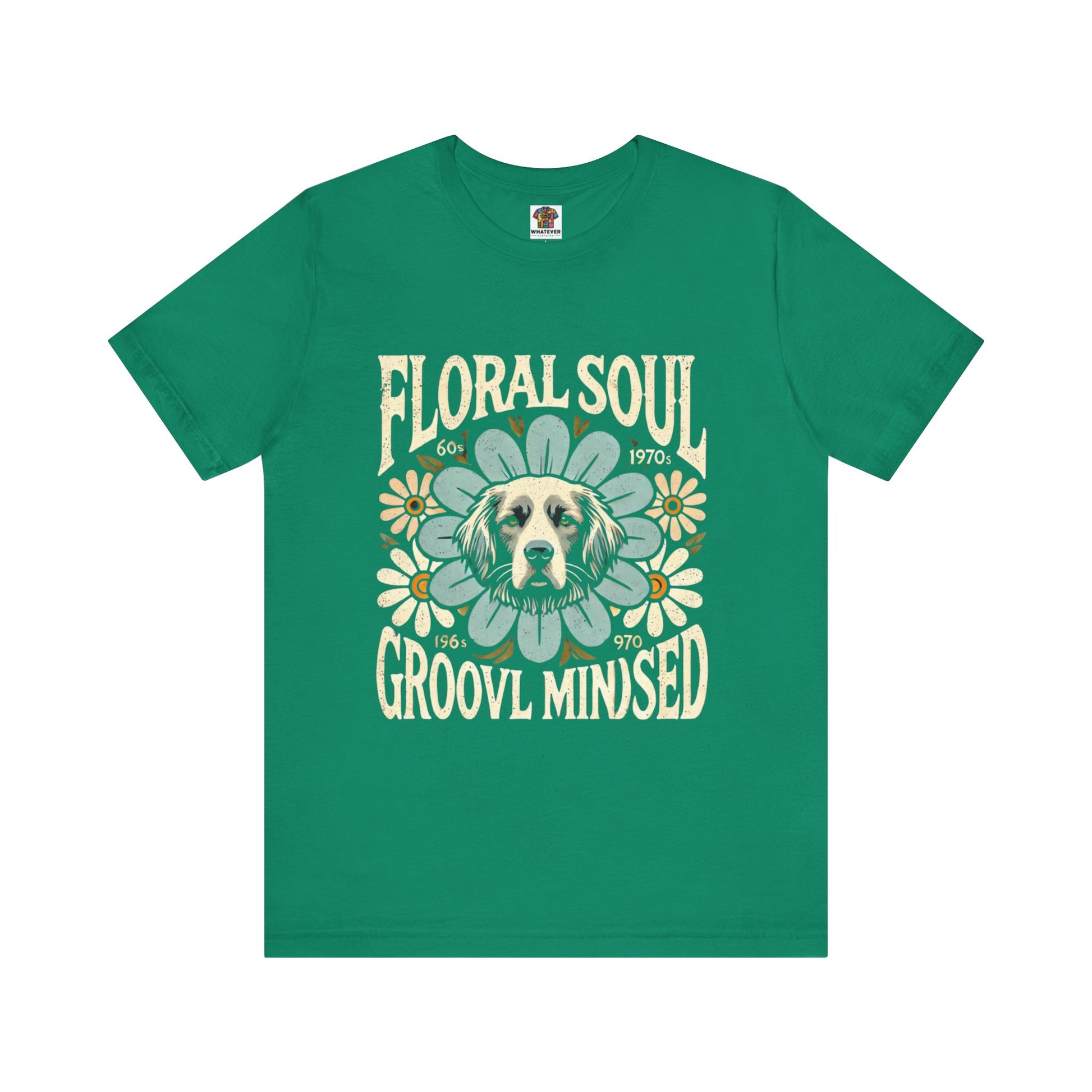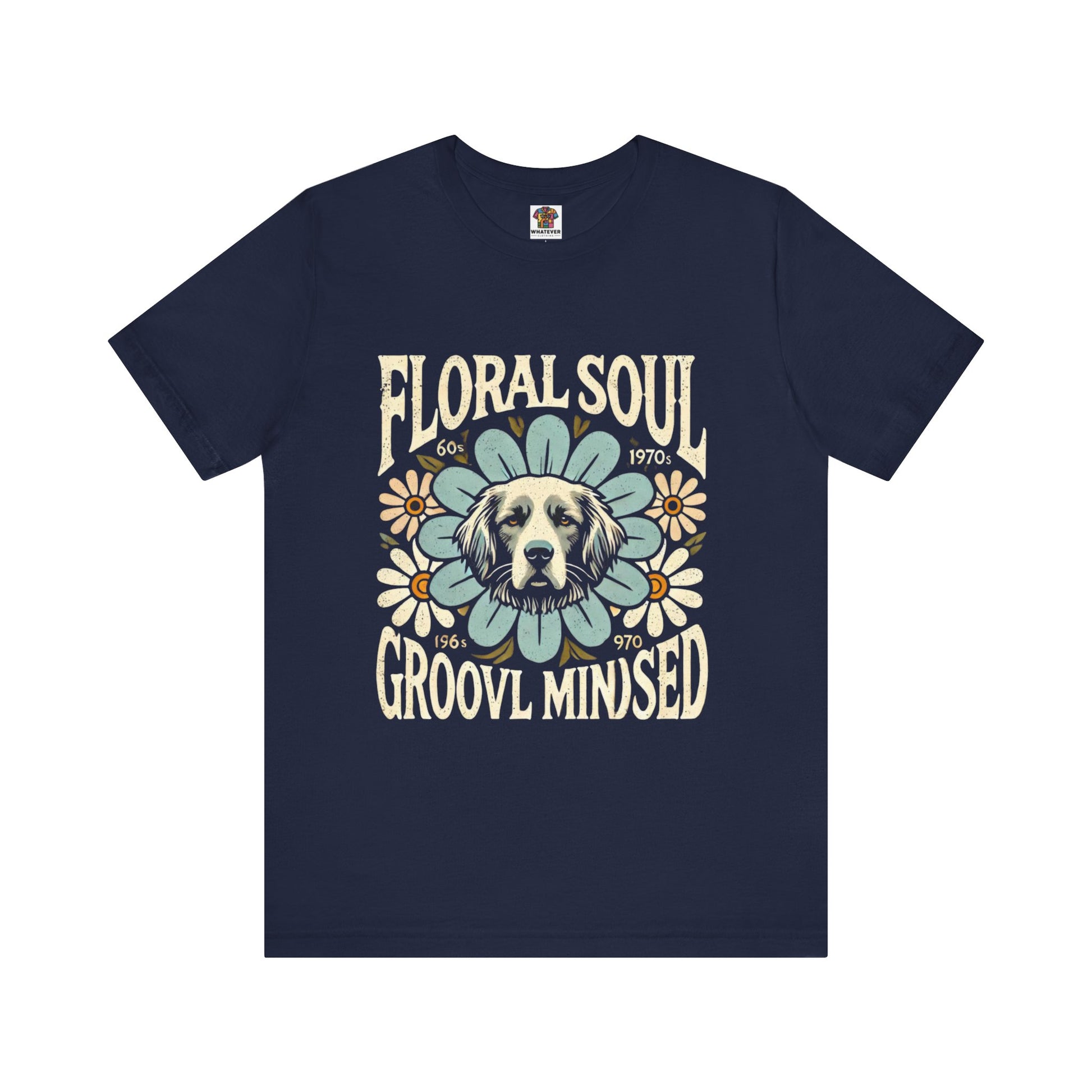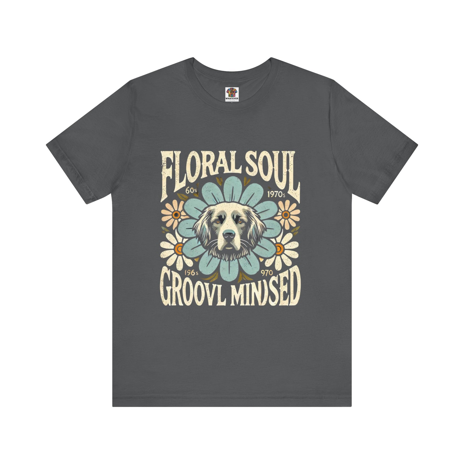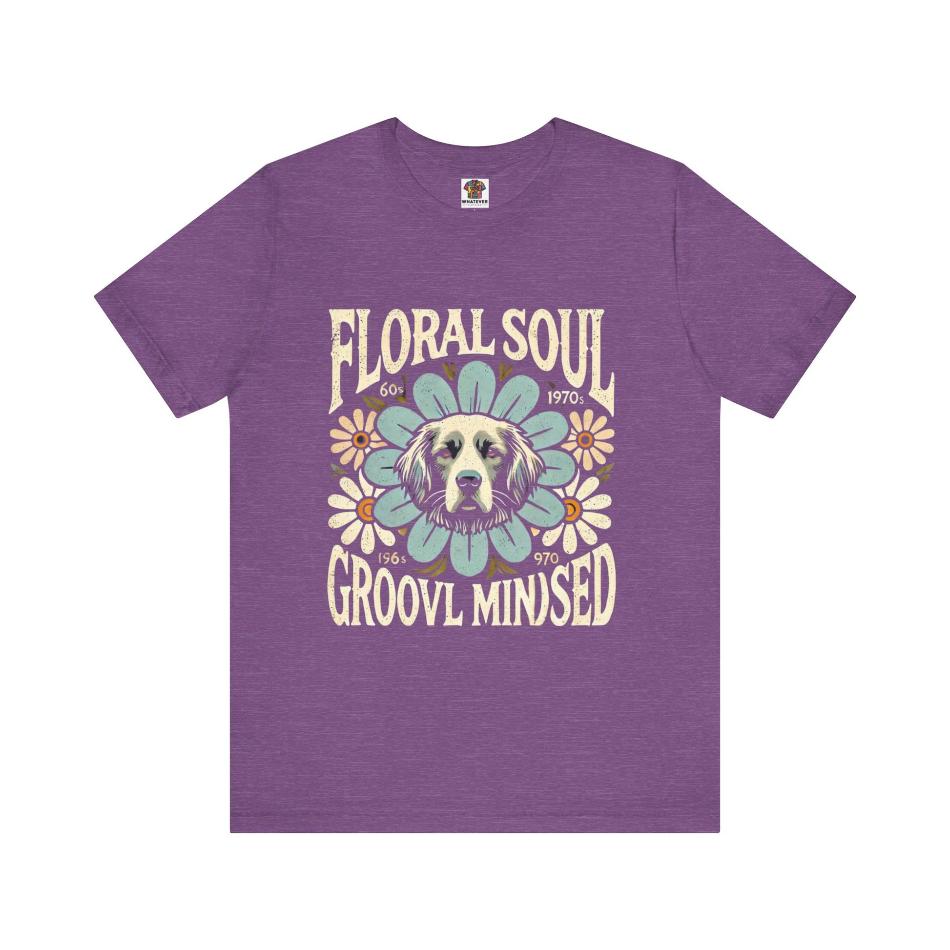 A groovy retro t-shirt design featuring a dog’s face centered within a large stylized flower. The design includes bold text saying "FLORAL SOUL" and "GROOVY MINDSET," and smaller text referencing the 1960s and 1970s. The color palette is pastel tones, with distressed textures for a vintage feel.