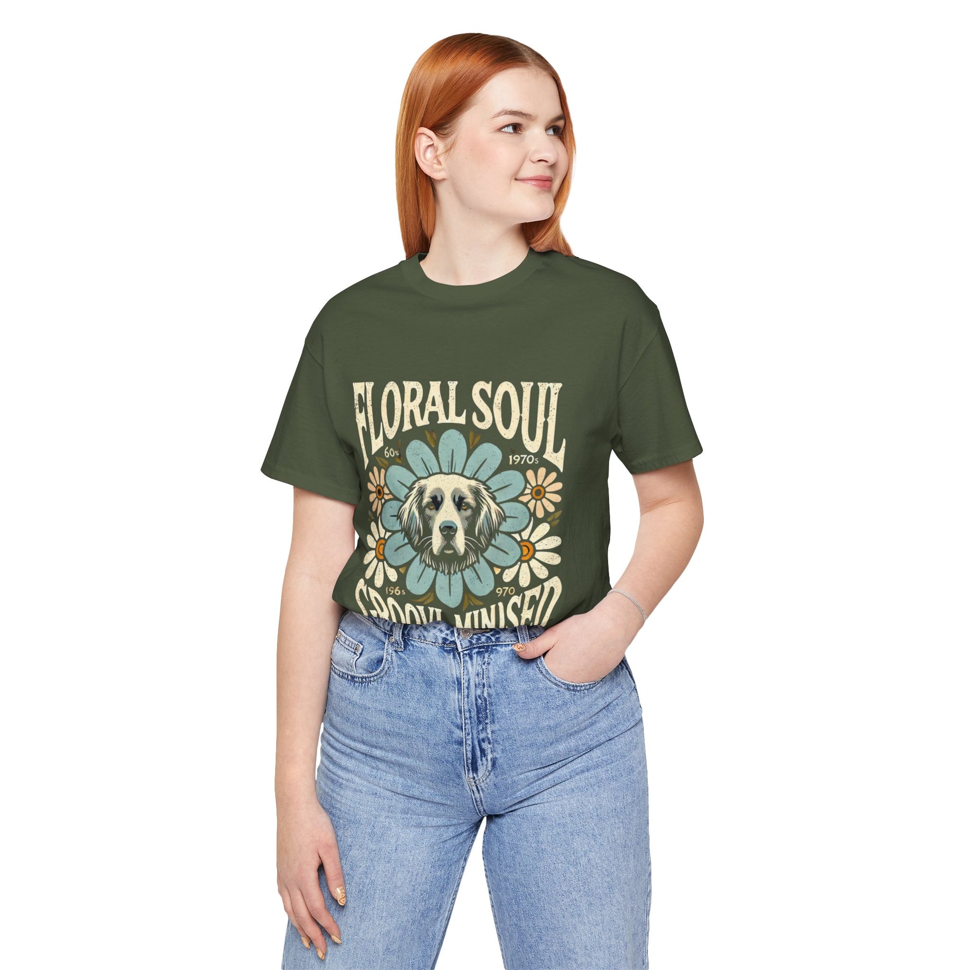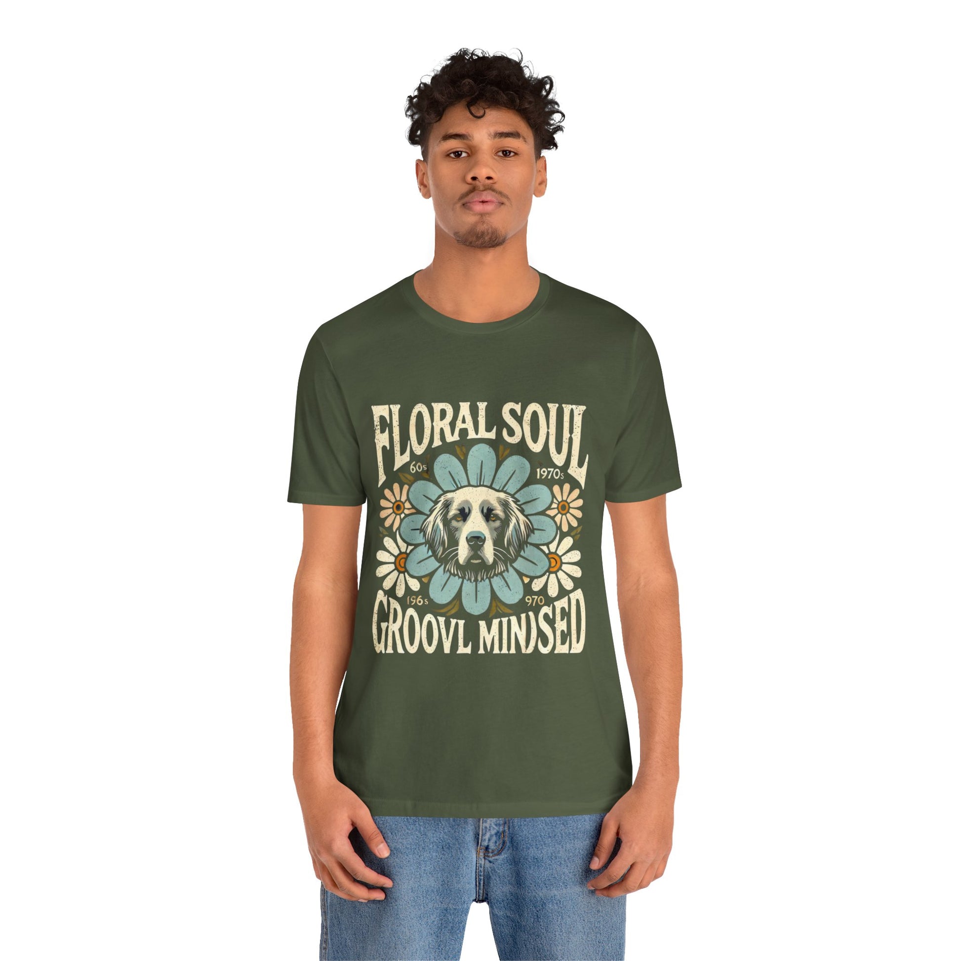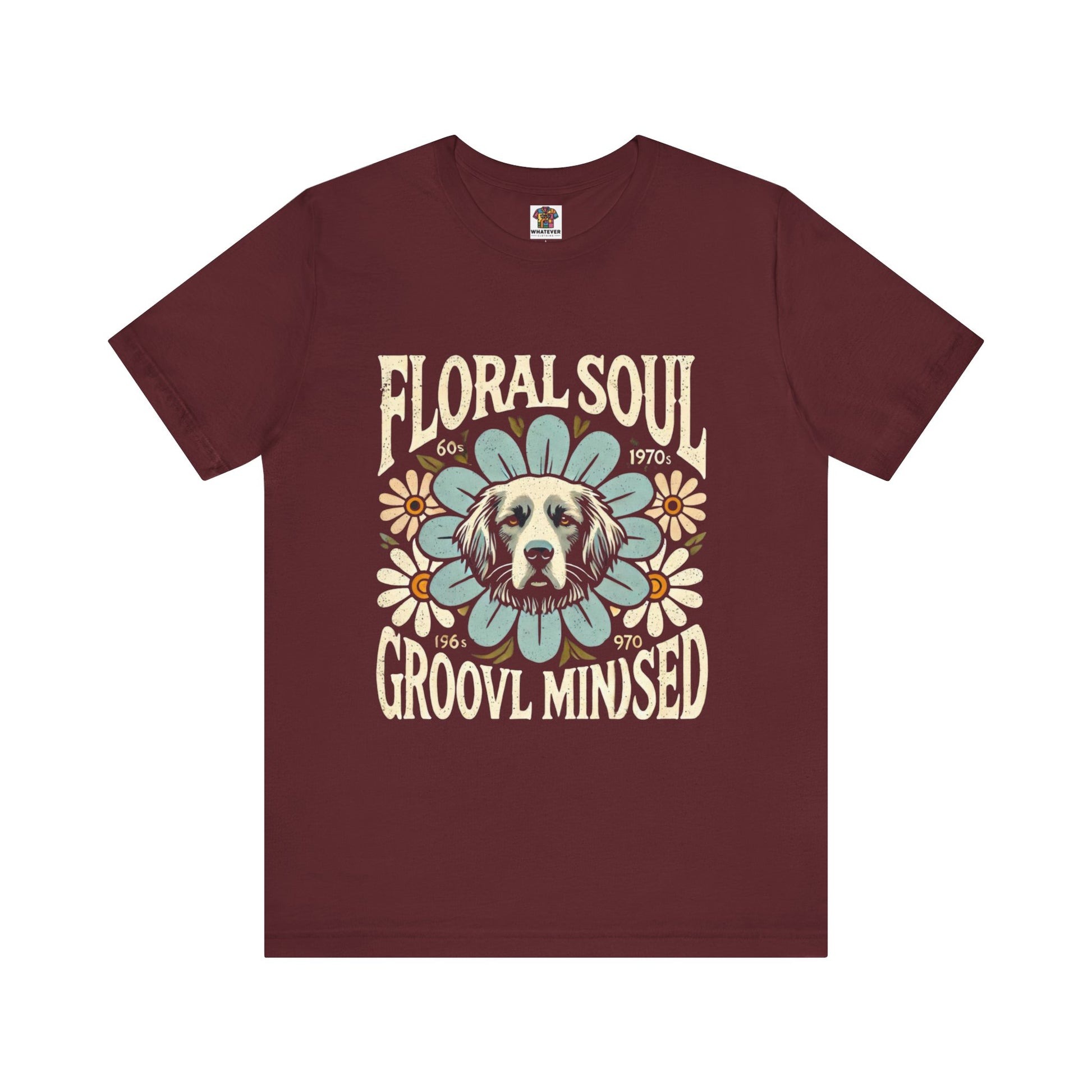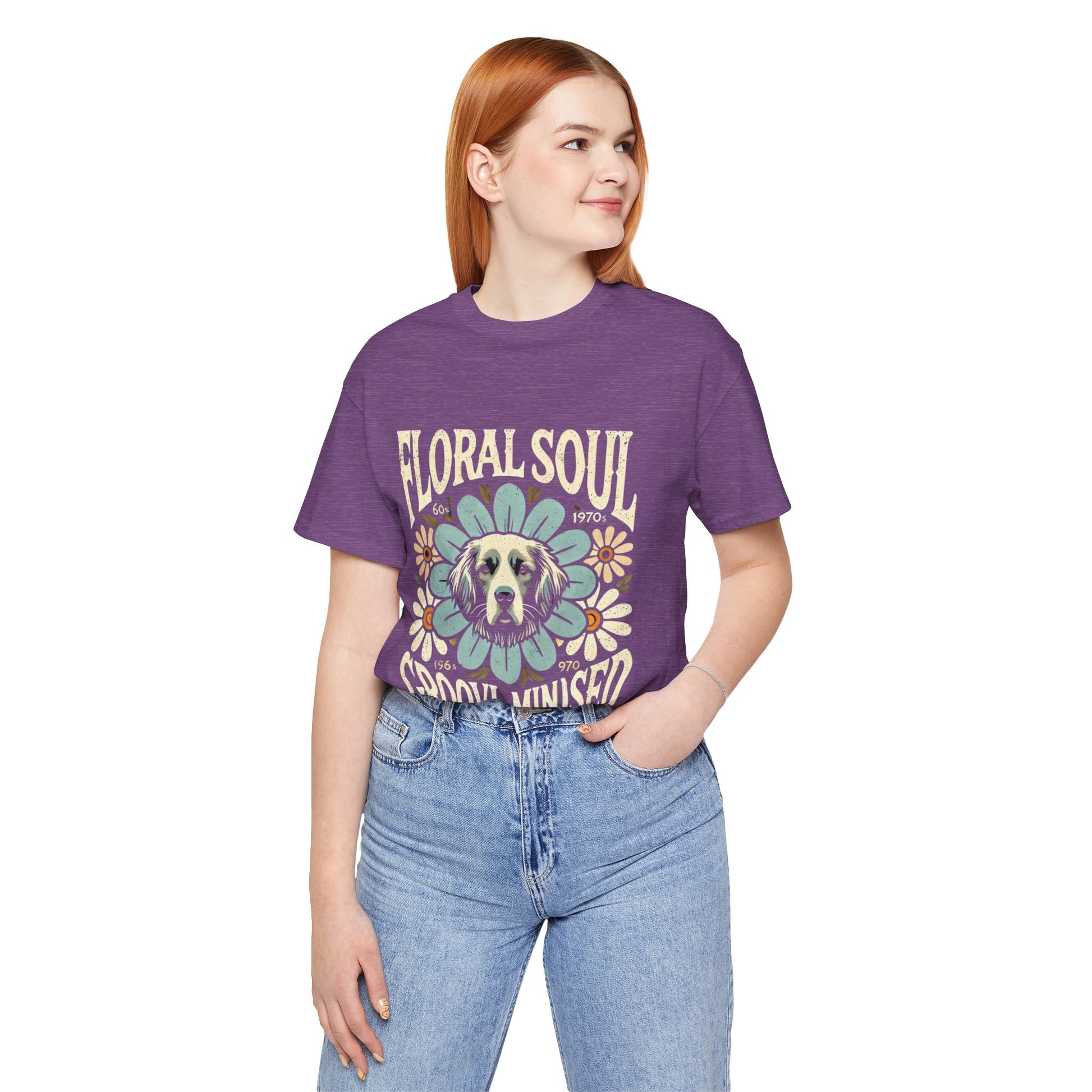A groovy retro t-shirt design featuring a dog’s face centered within a large stylized flower. The design includes bold text saying "FLORAL SOUL" and "GROOVY MINDSET," and smaller text referencing the 1960s and 1970s. The color palette is pastel tones, with distressed textures for a vintage feel.