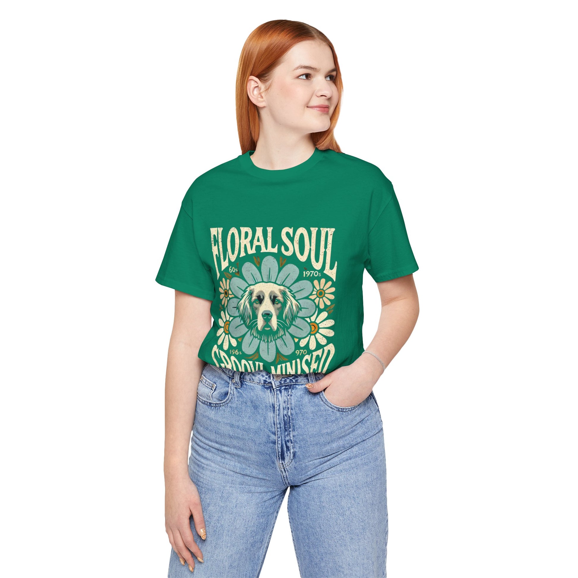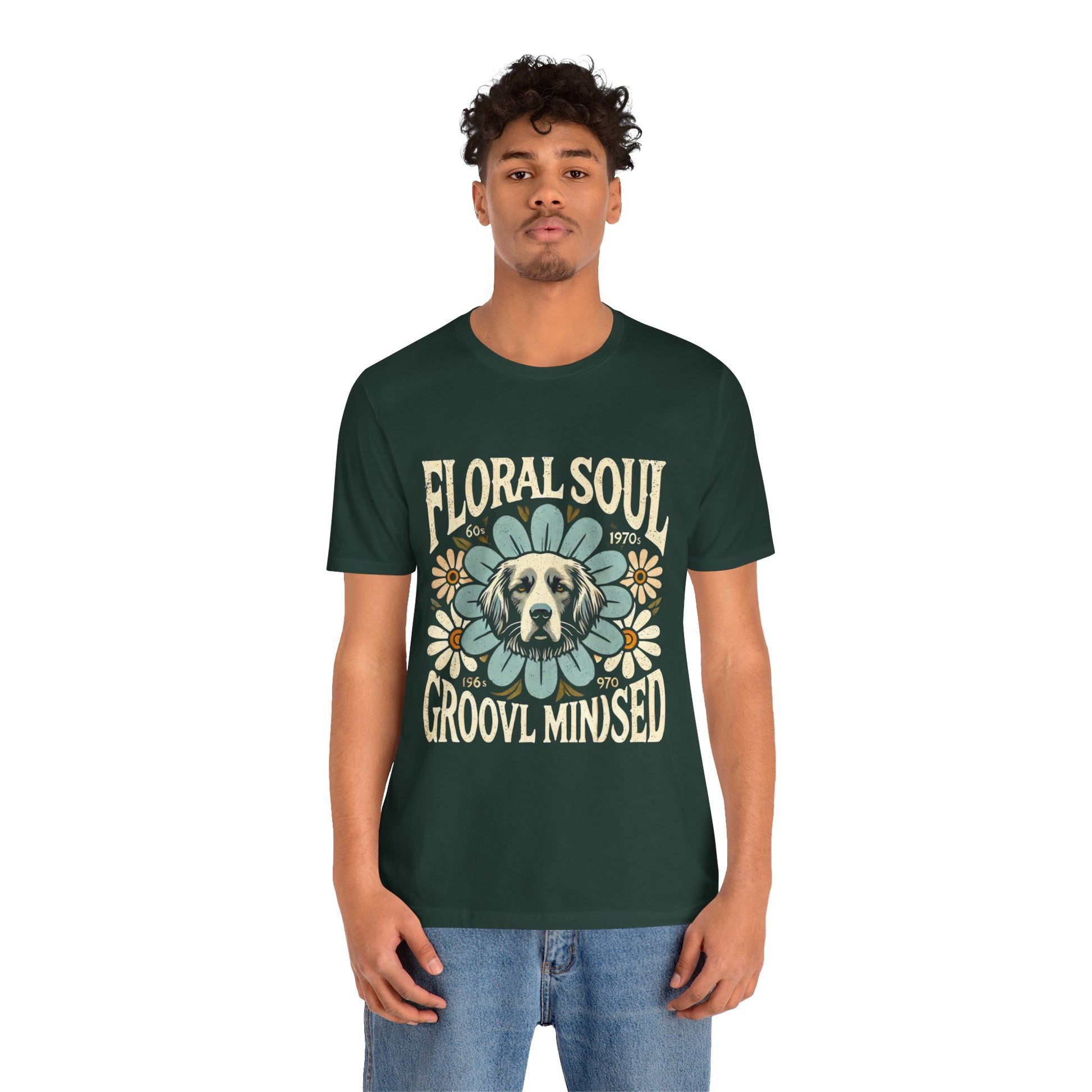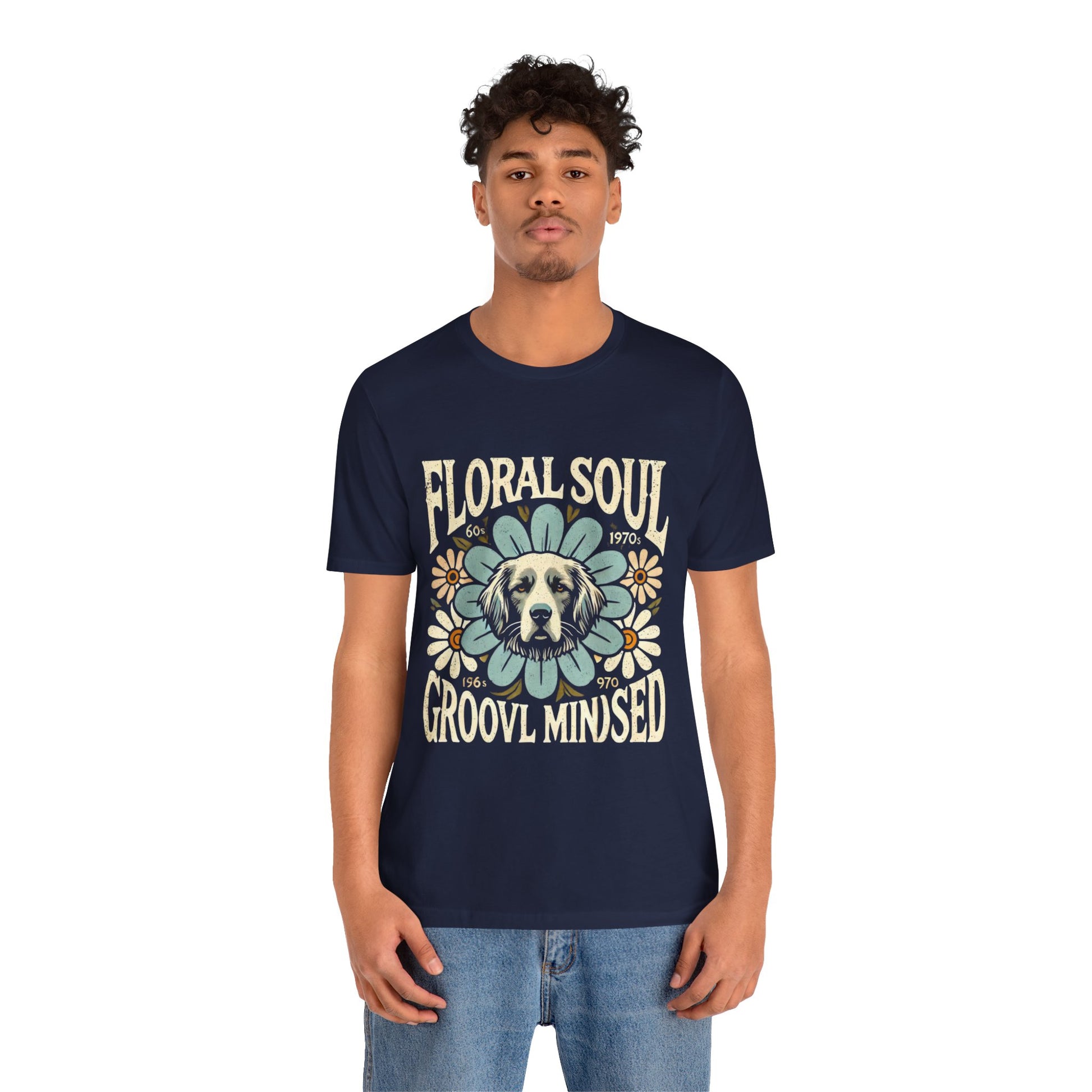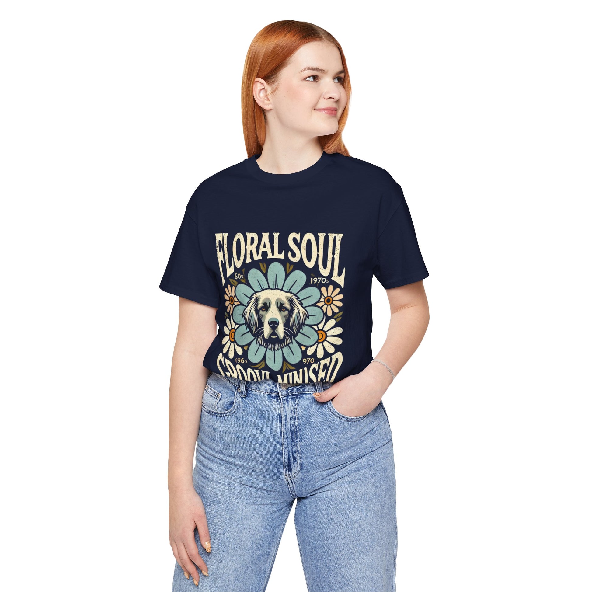 A groovy retro t-shirt design featuring a dog’s face centered within a large stylized flower. The design includes bold text saying "FLORAL SOUL" and "GROOVY MINDSET," and smaller text referencing the 1960s and 1970s. The color palette is pastel tones, with distressed textures for a vintage feel.