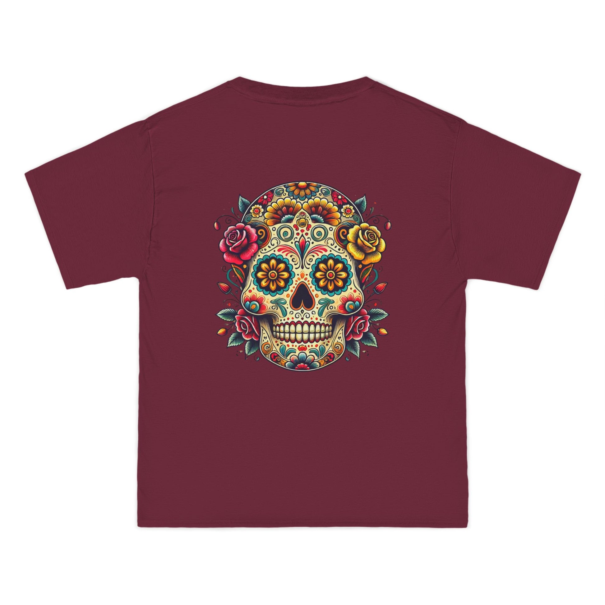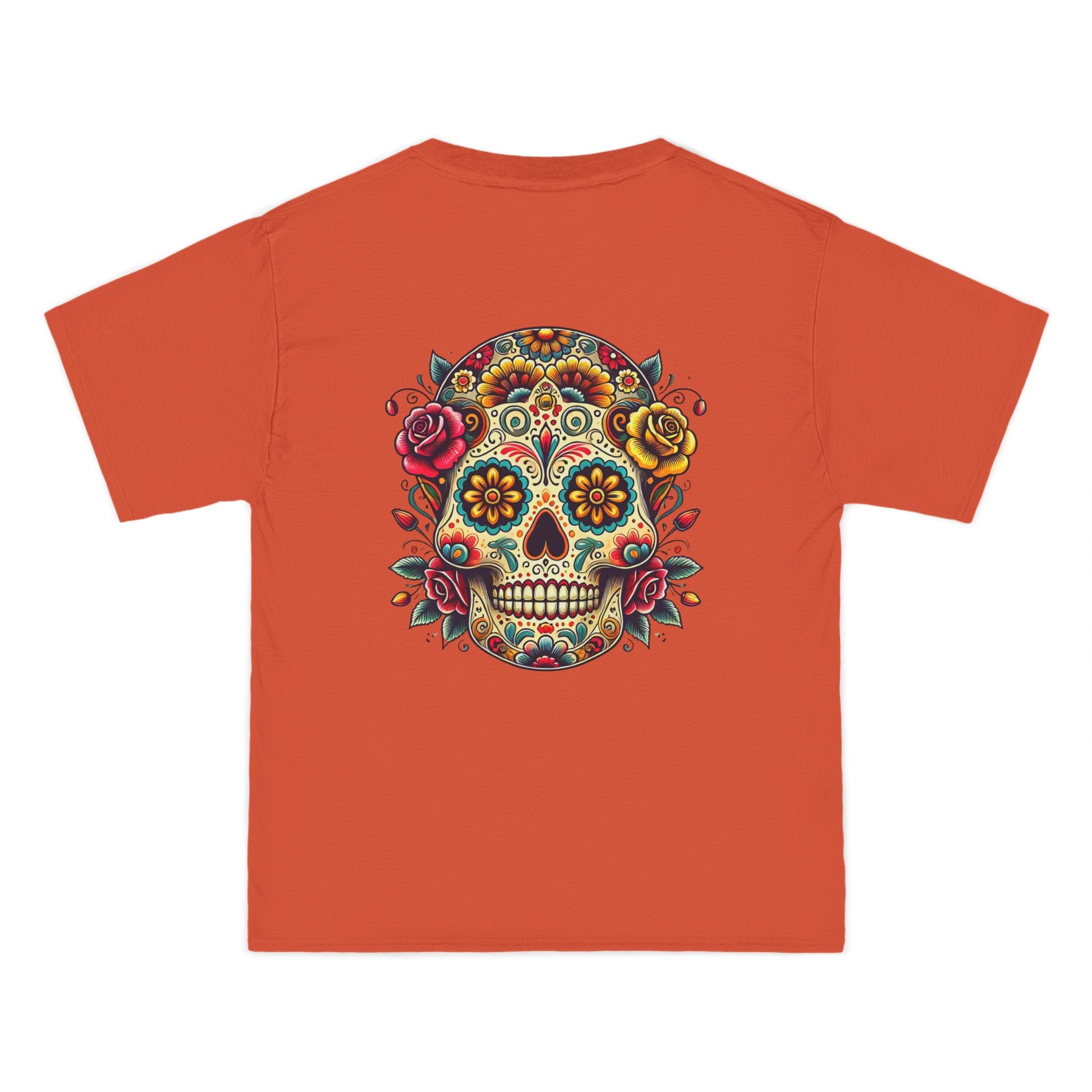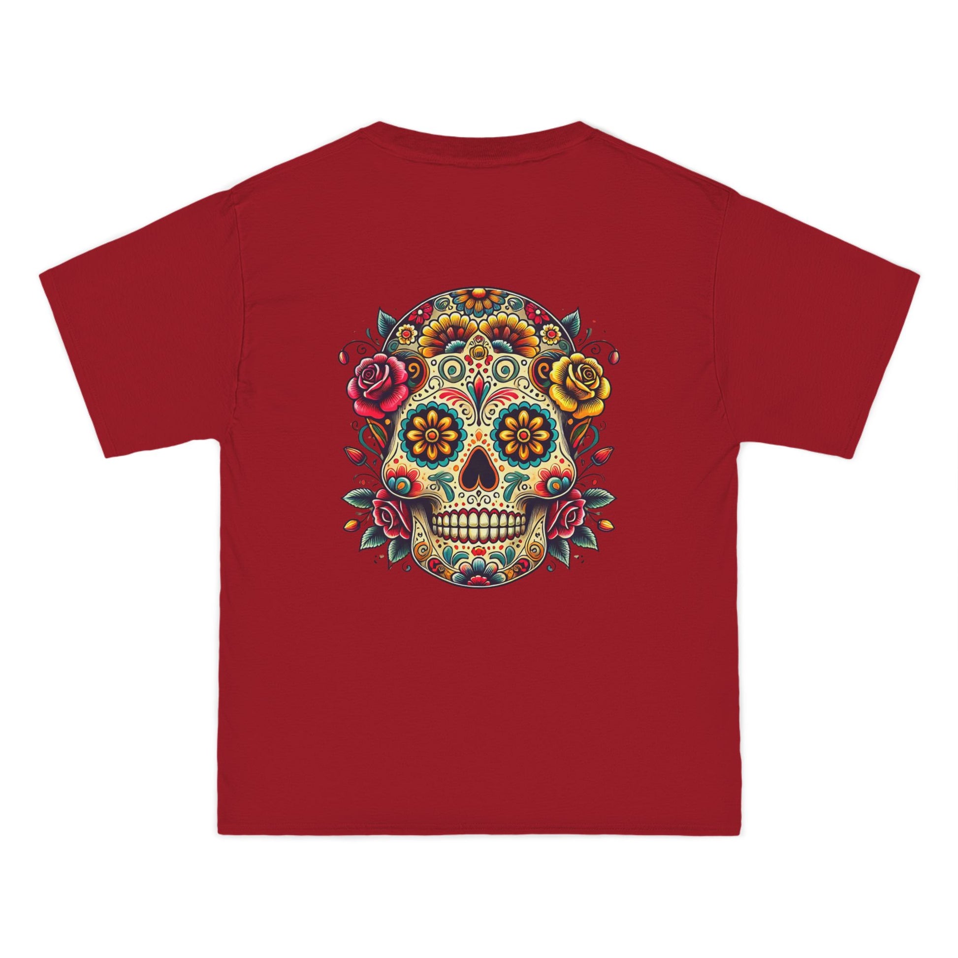 Every inch of this tee is a riot of robust colors, a canvas of red, blue, green, yellow, and orange that comes together in a stunning sugar skull design. The floral patterns and geometric detailing weave a whimsical tale of Mexican heritage, inviting you to wear your world on your sleeve—literally.