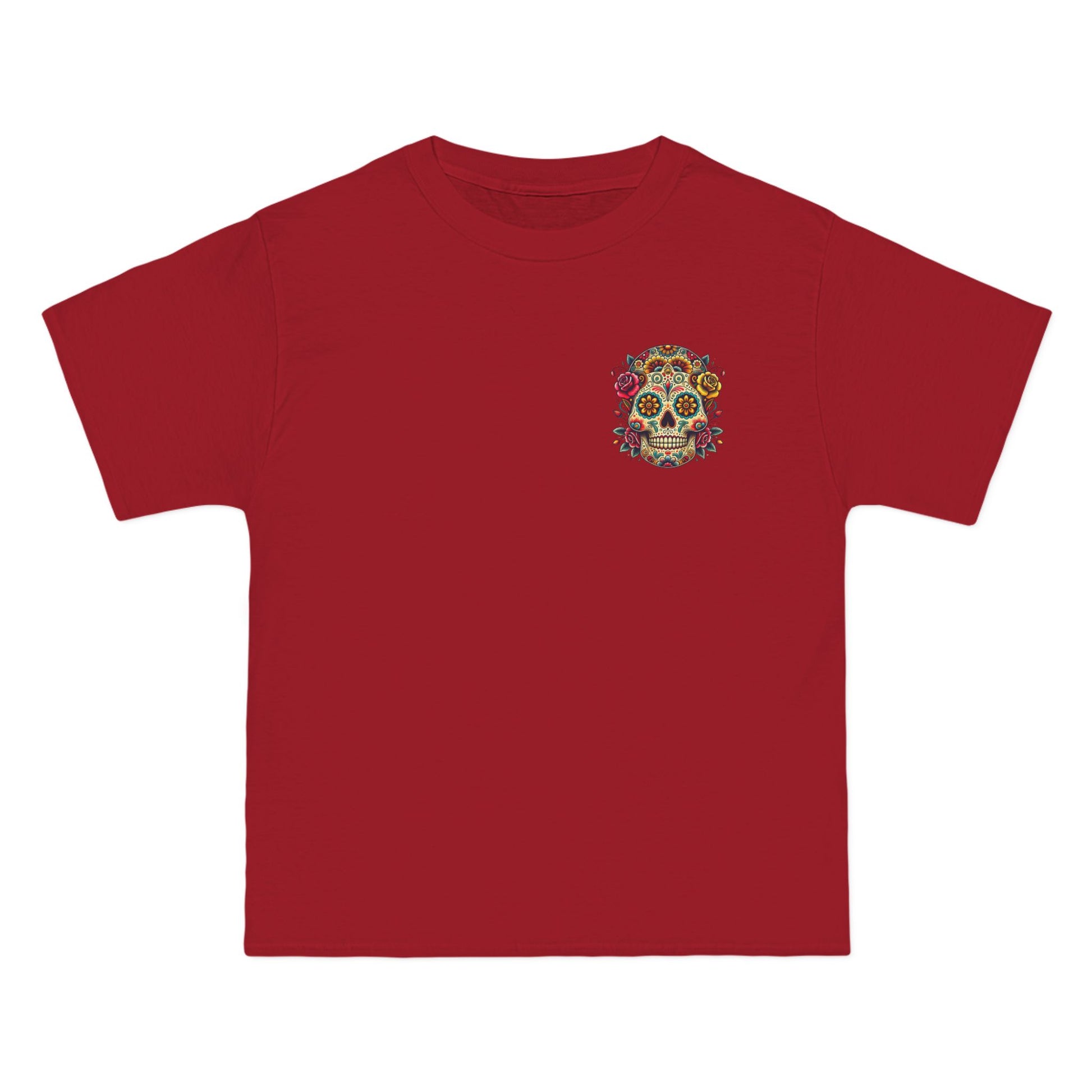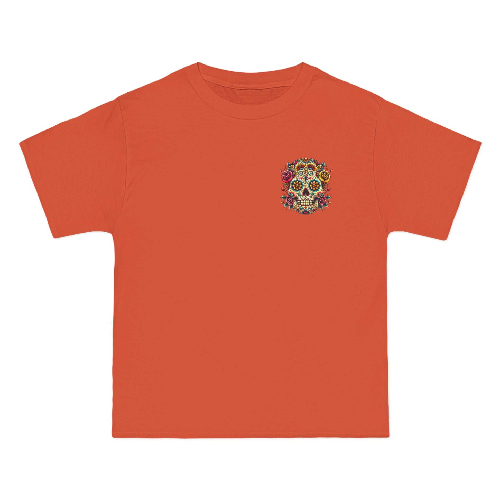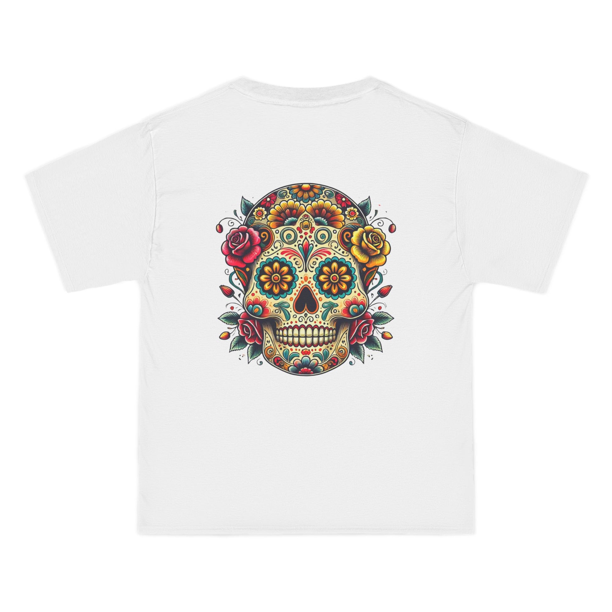 Every inch of this tee is a riot of robust colors, a canvas of red, blue, green, yellow, and orange that comes together in a stunning sugar skull design. The floral patterns and geometric detailing weave a whimsical tale of Mexican heritage, inviting you to wear your world on your sleeve—literally.