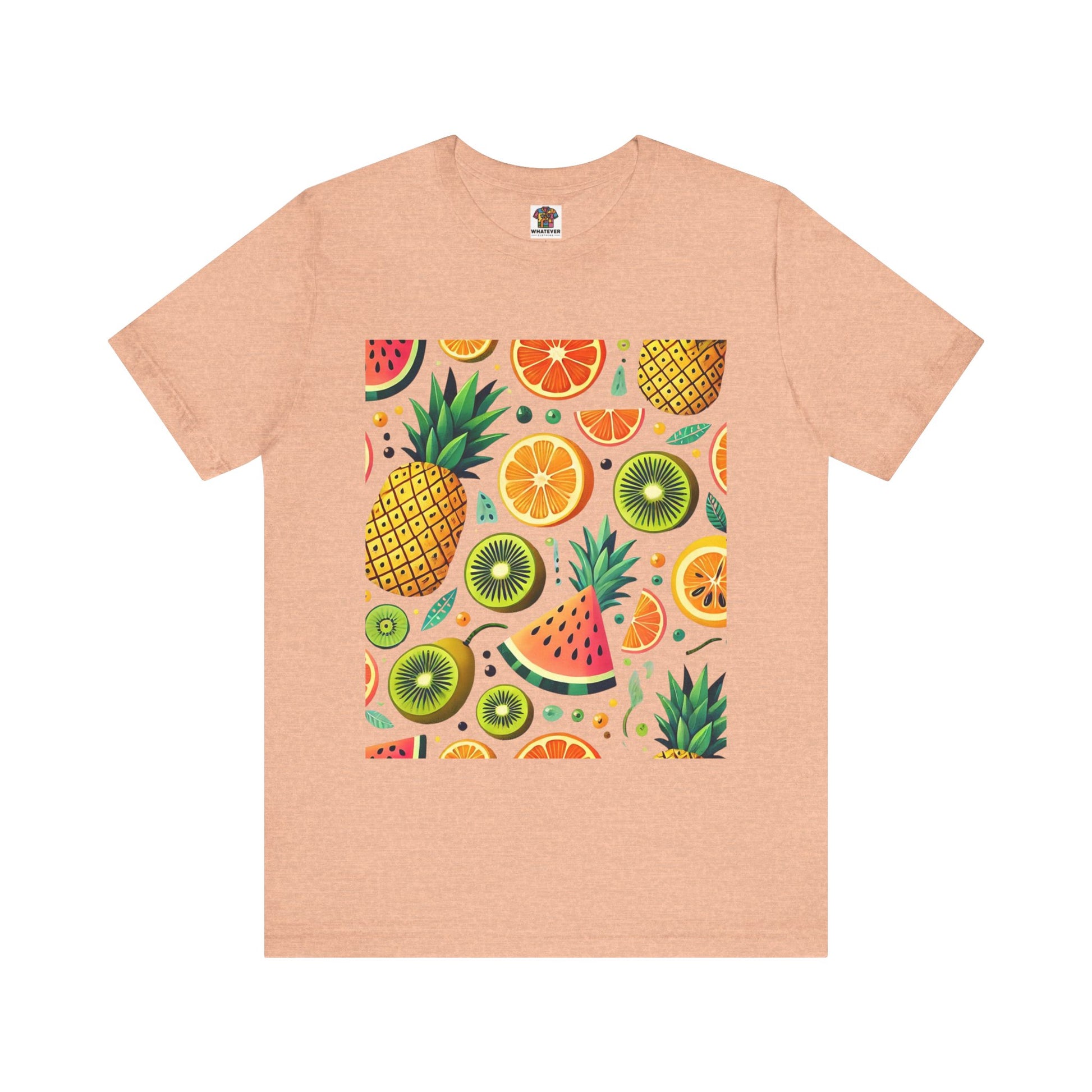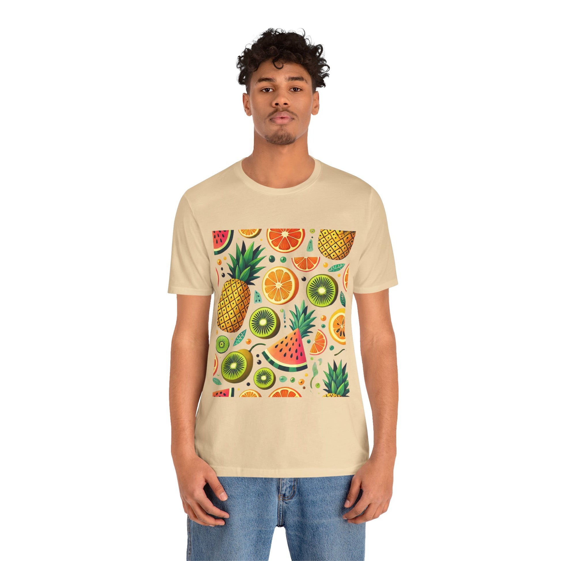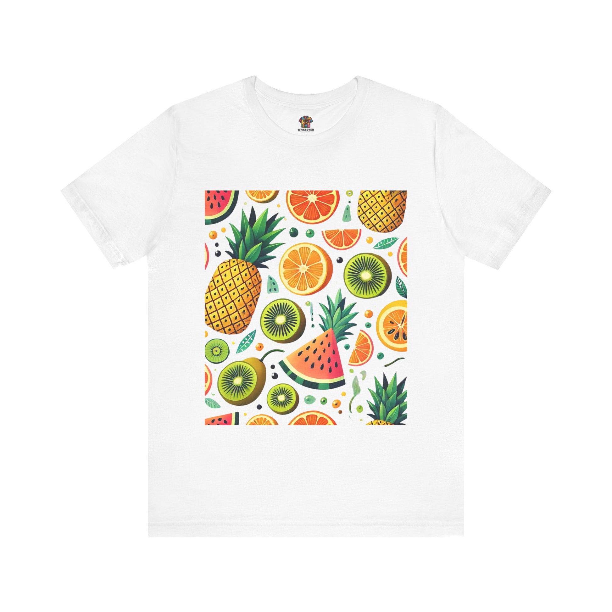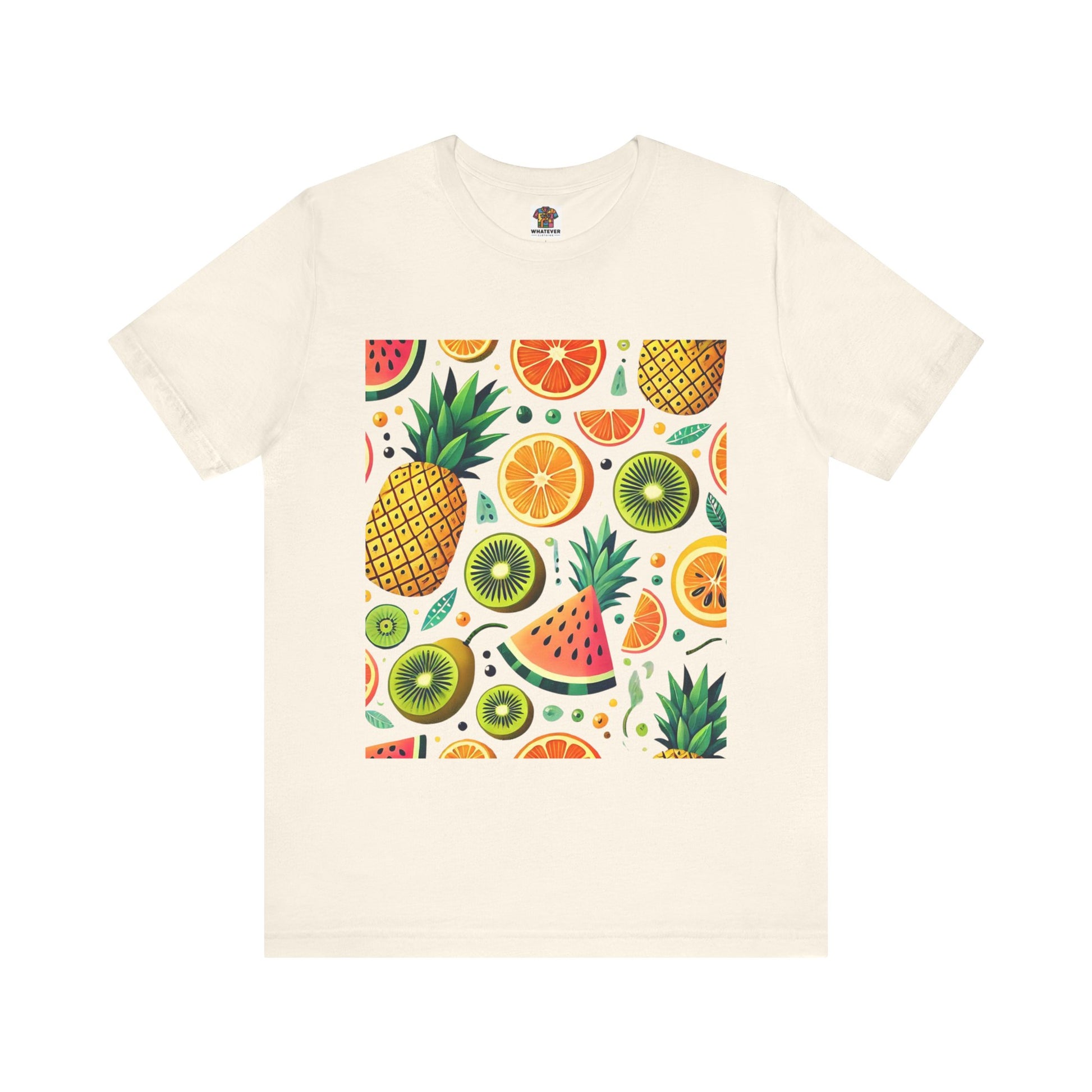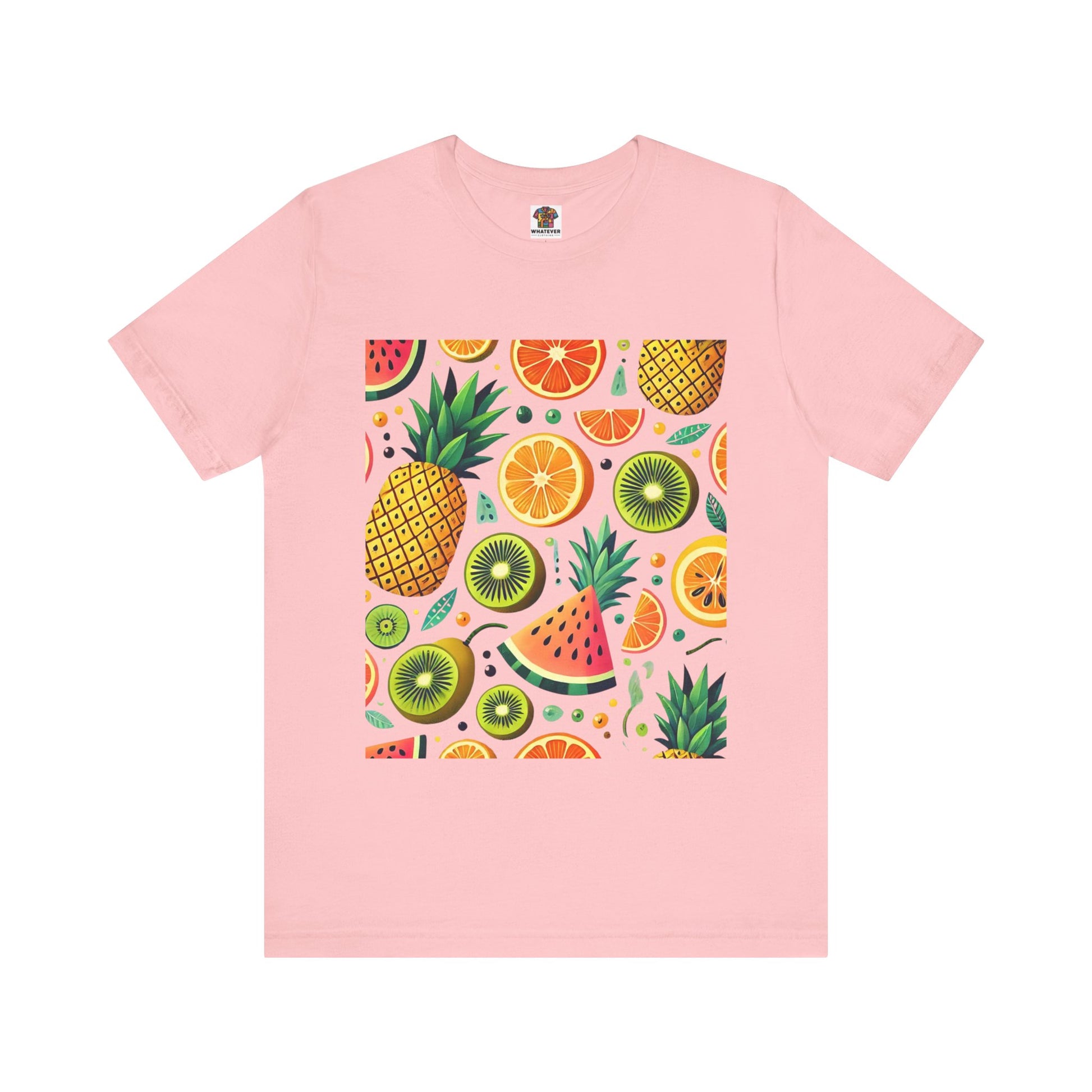 A playful pattern with vibrant tropical fruits like pineapples, oranges, and kiwis in bright colors, scattered randomly on a soft pastel background.