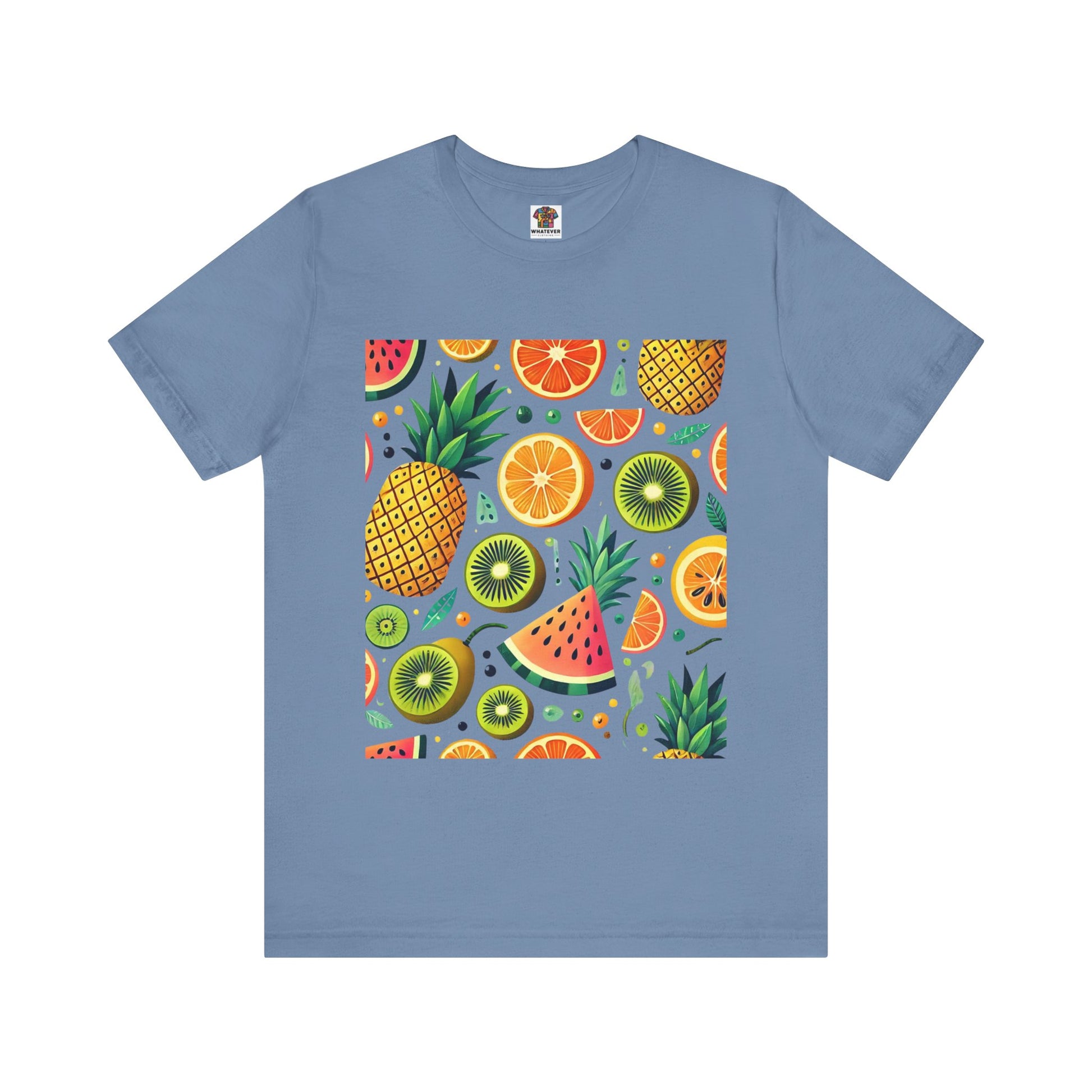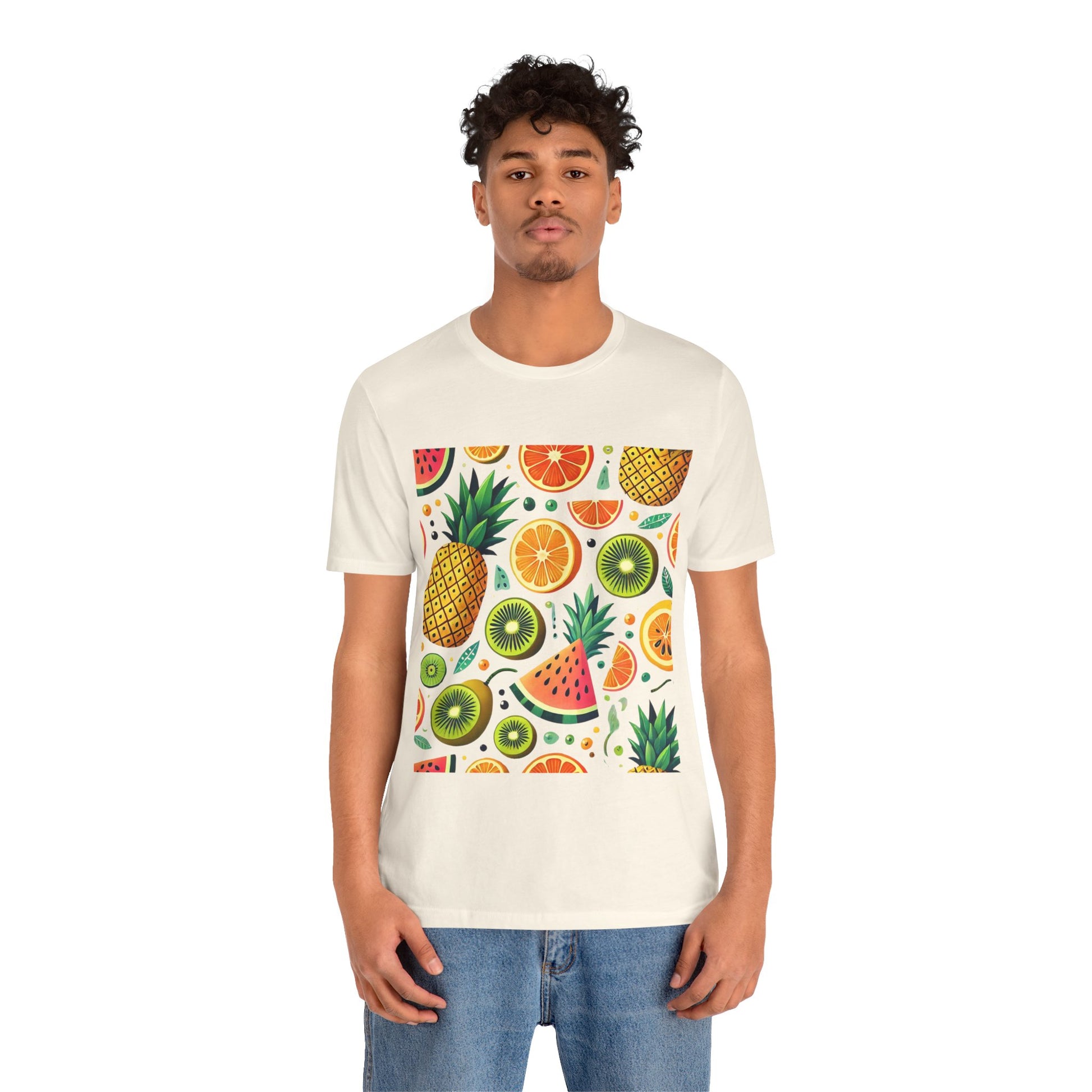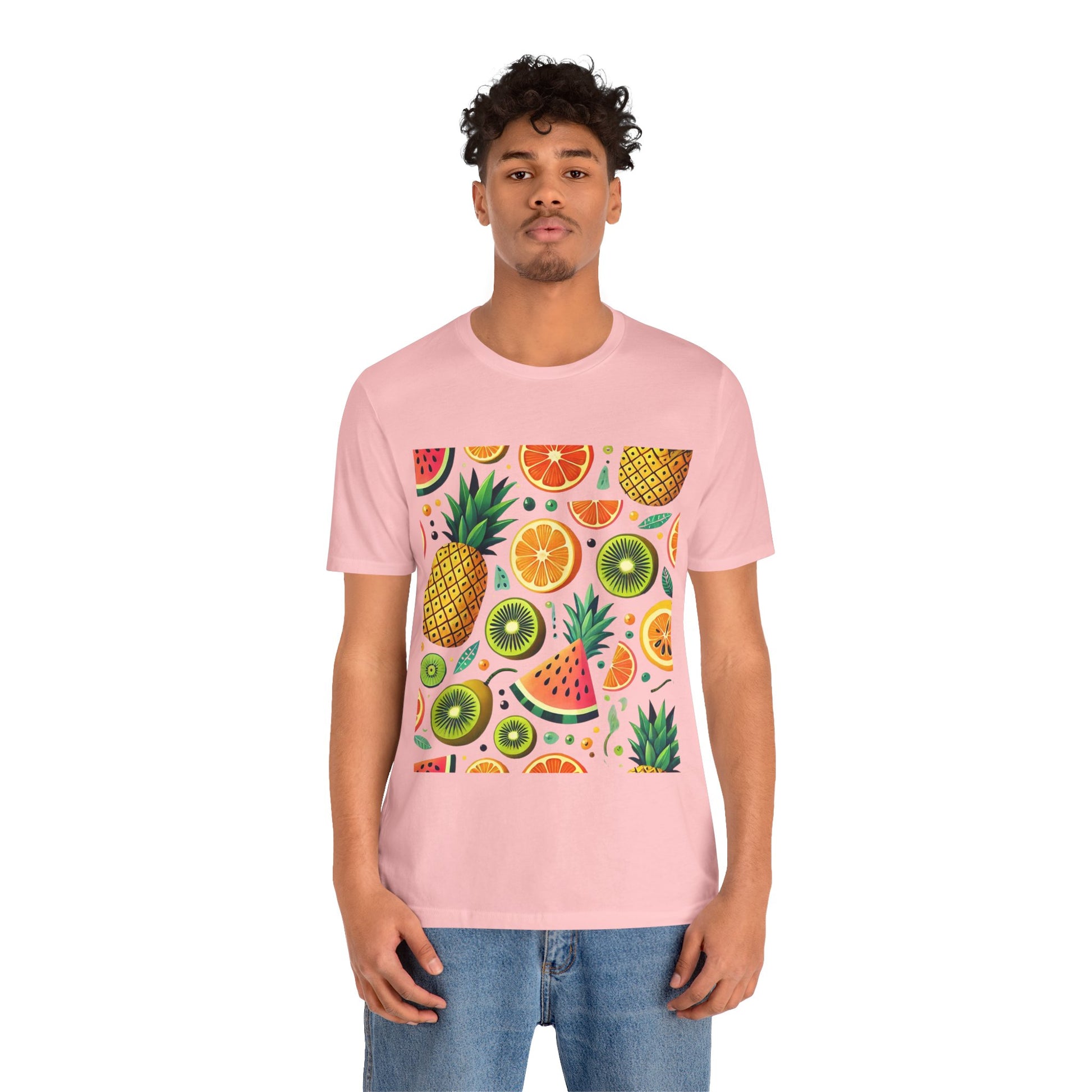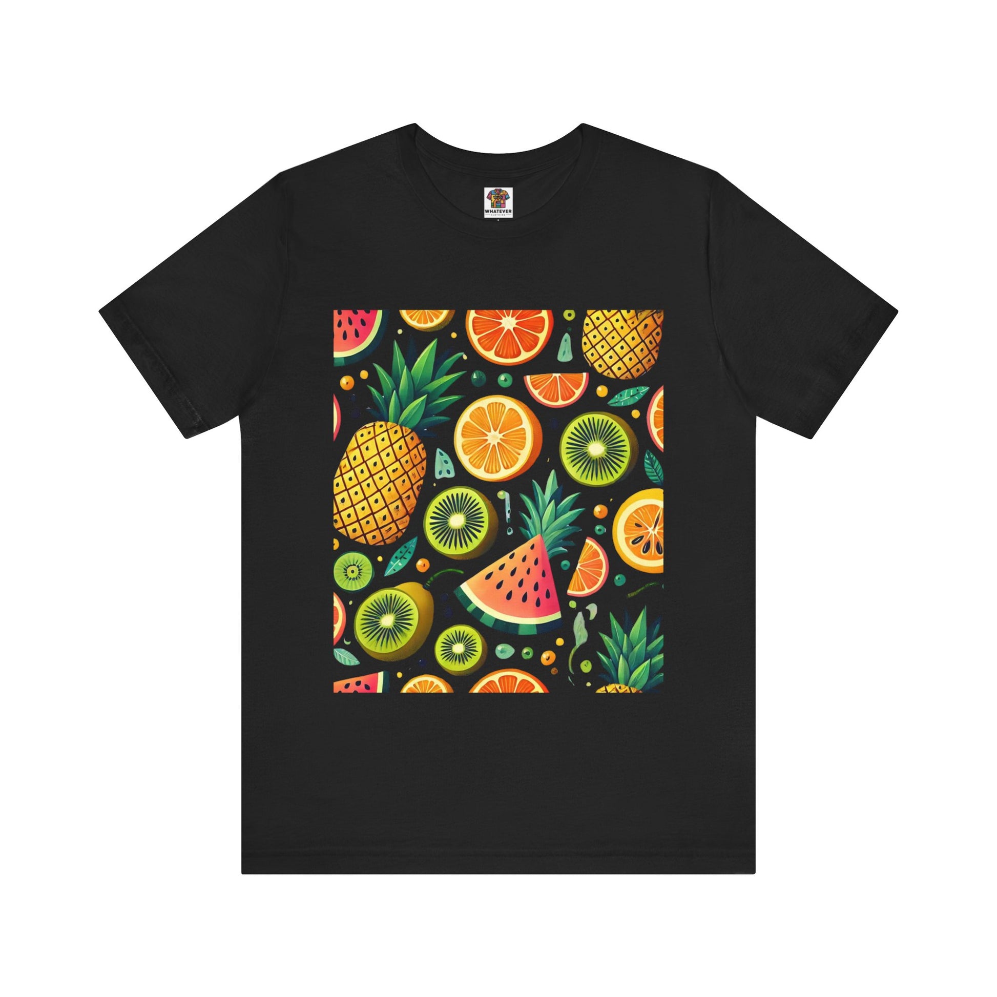 A playful pattern with vibrant tropical fruits like pineapples, oranges, and kiwis in bright colors, scattered randomly on a soft pastel background.