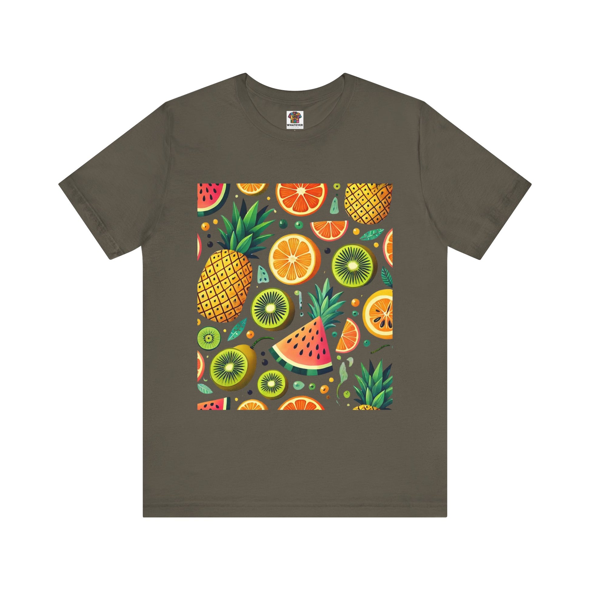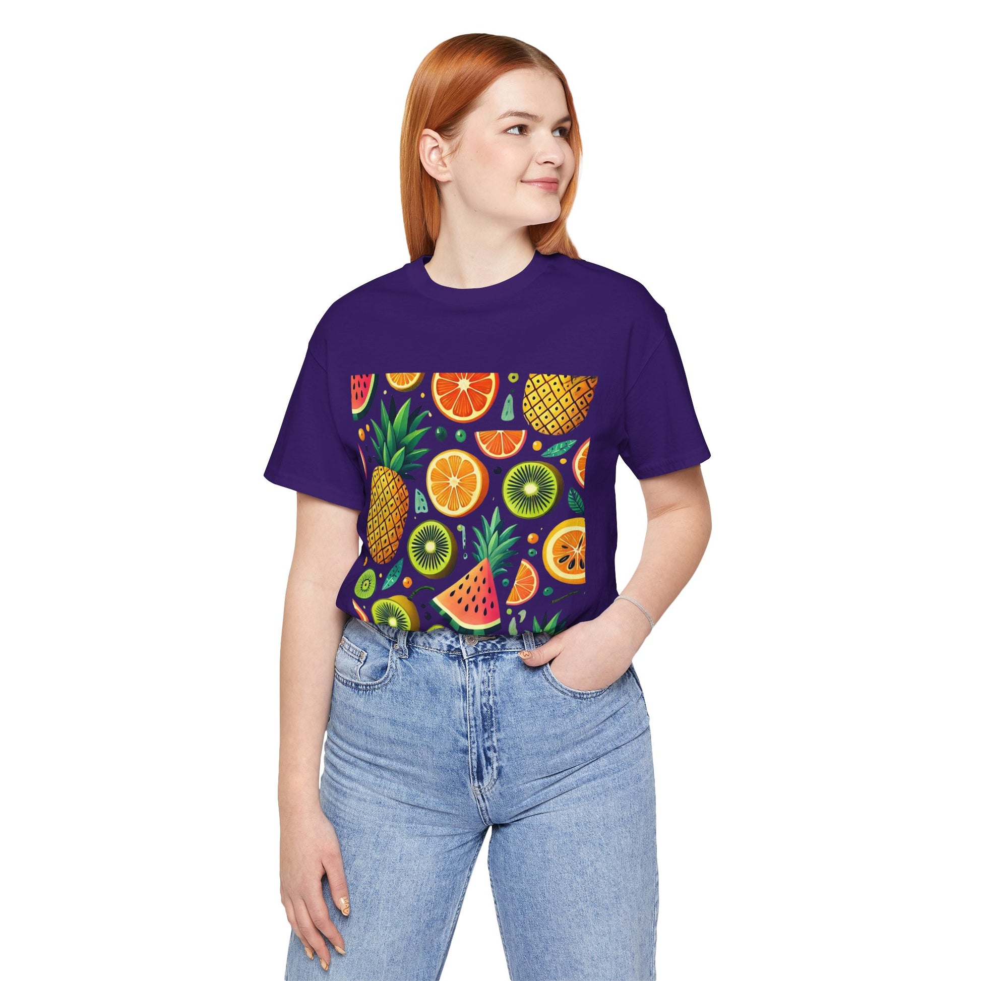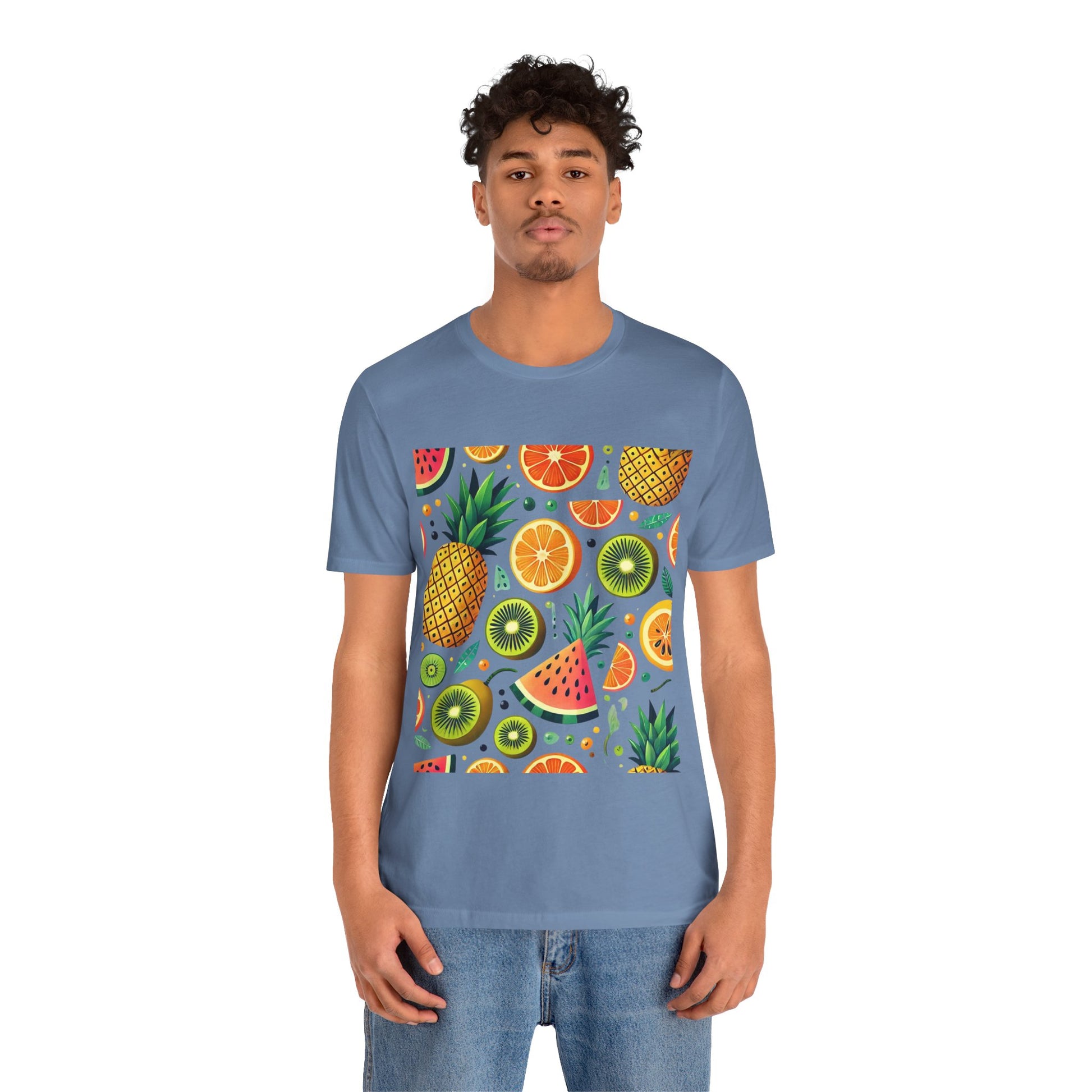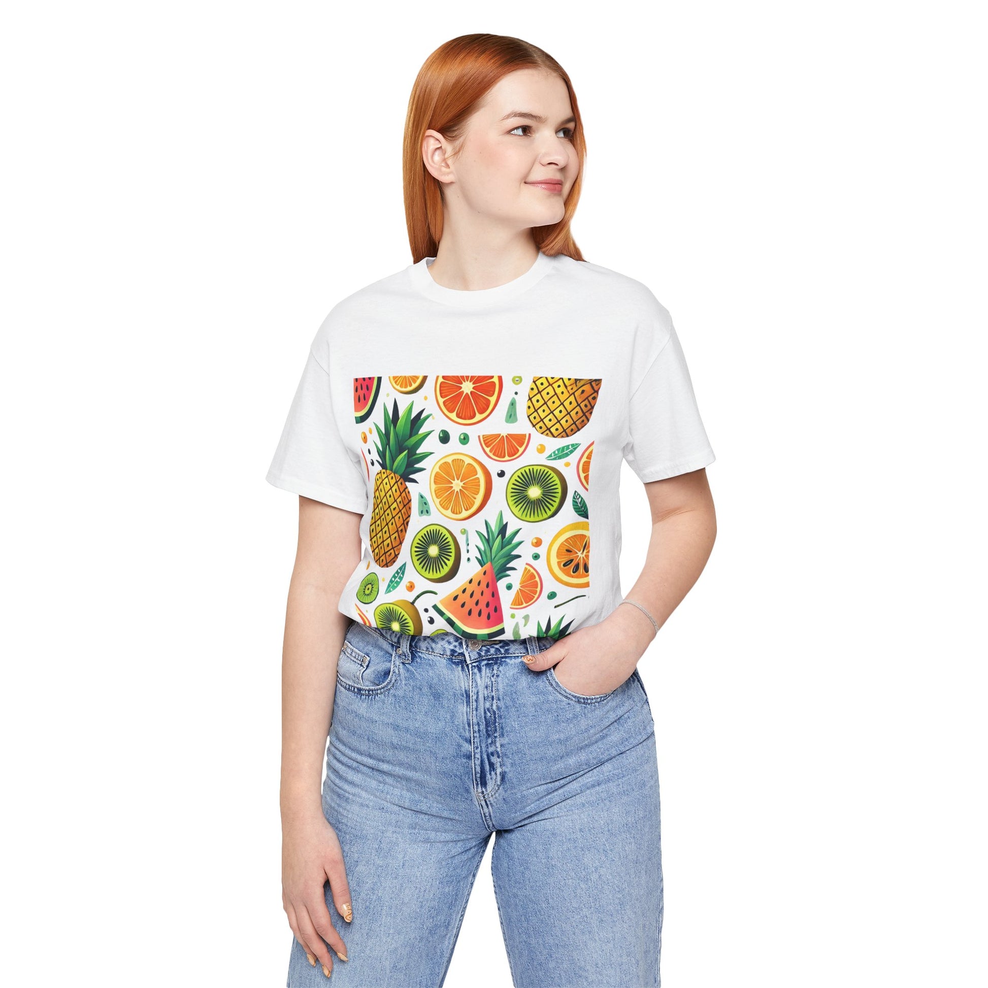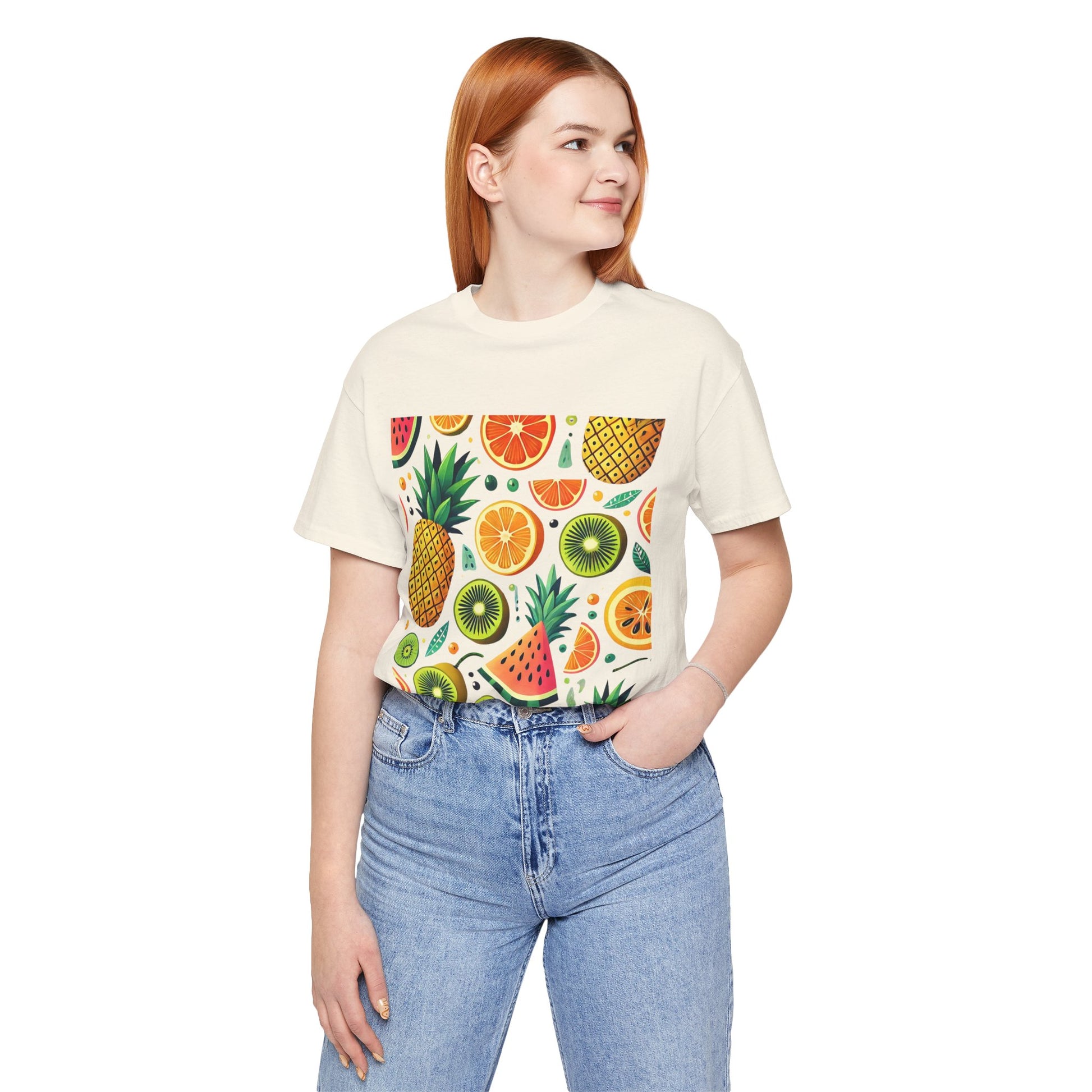 A playful pattern with vibrant tropical fruits like pineapples, oranges, and kiwis in bright colors, scattered randomly on a soft pastel background.