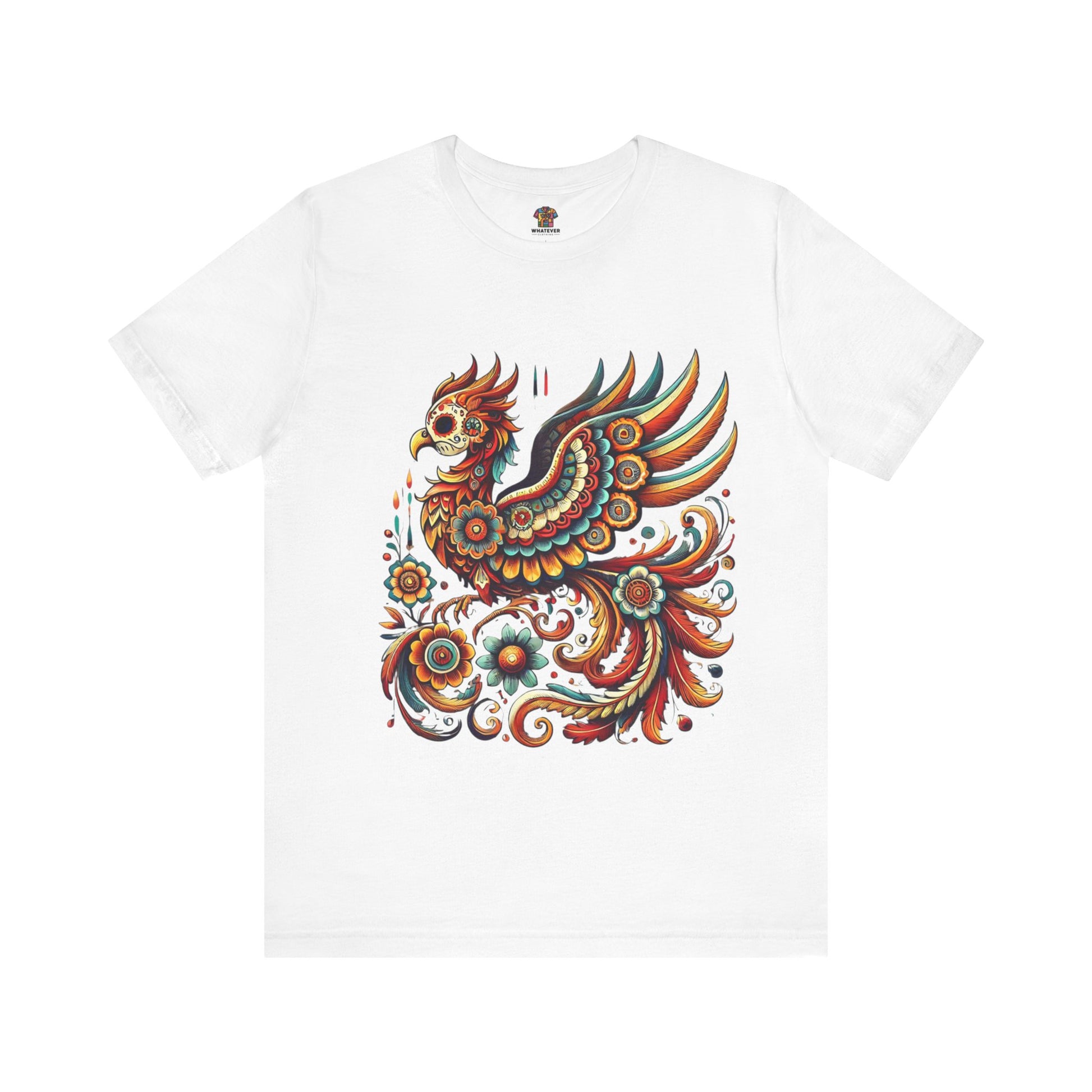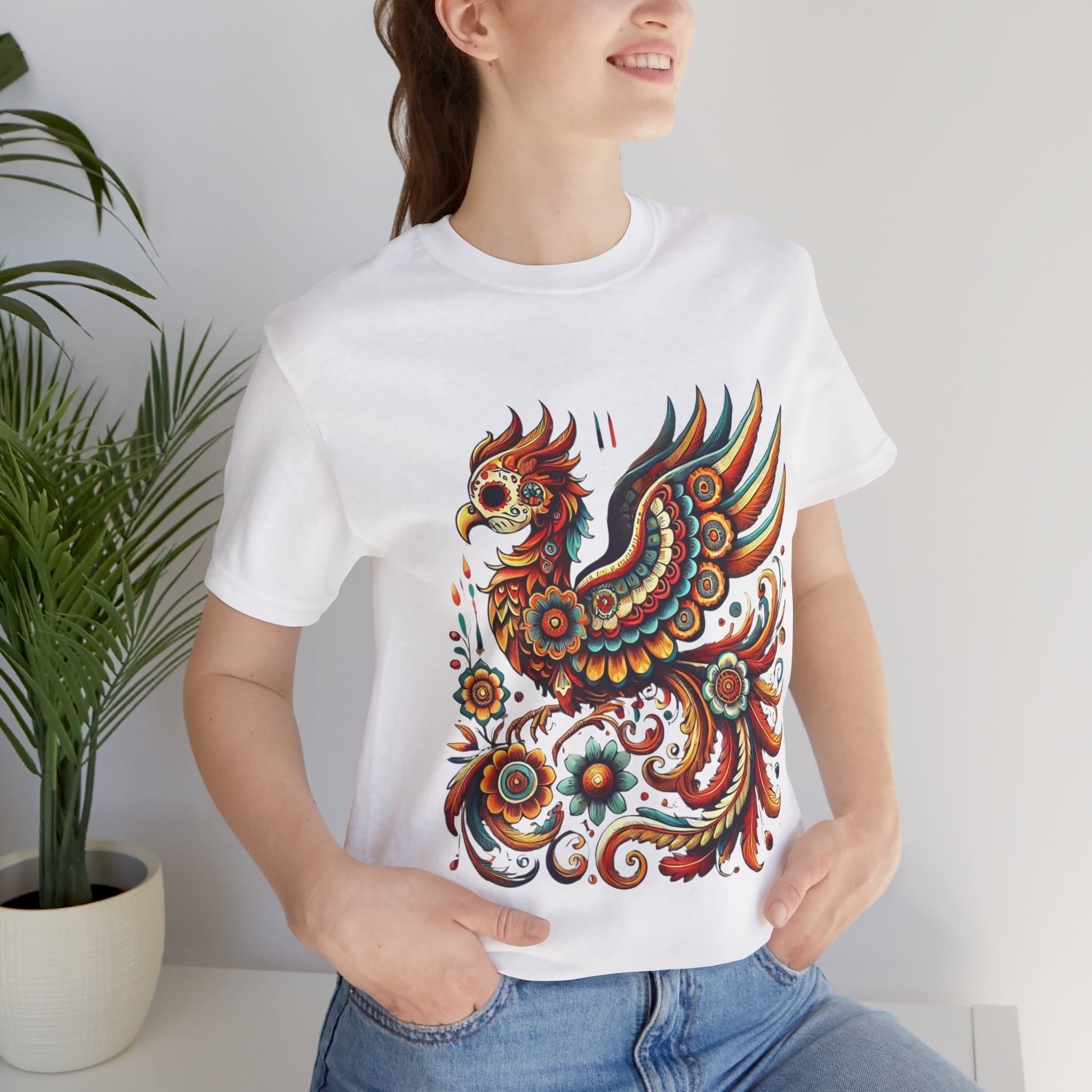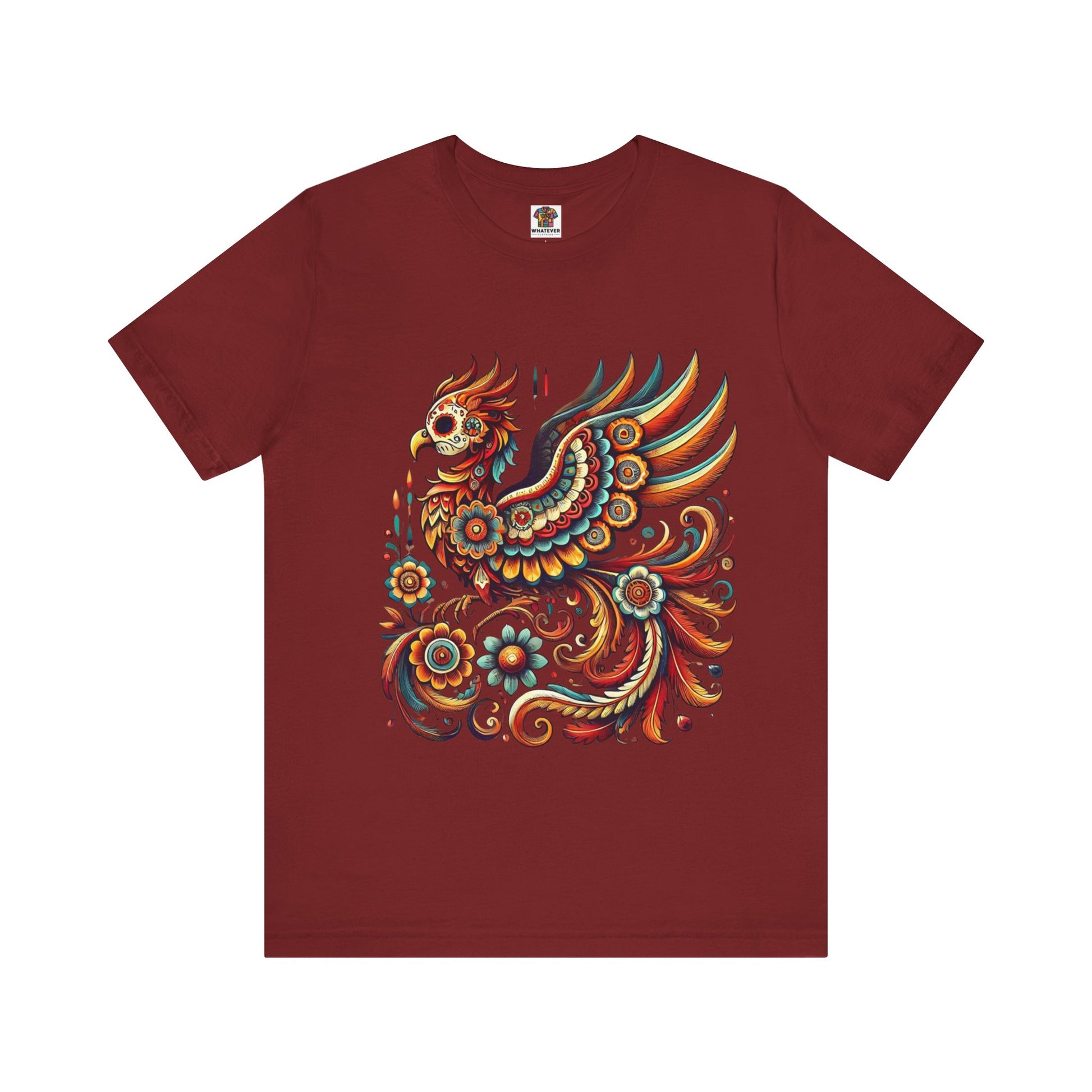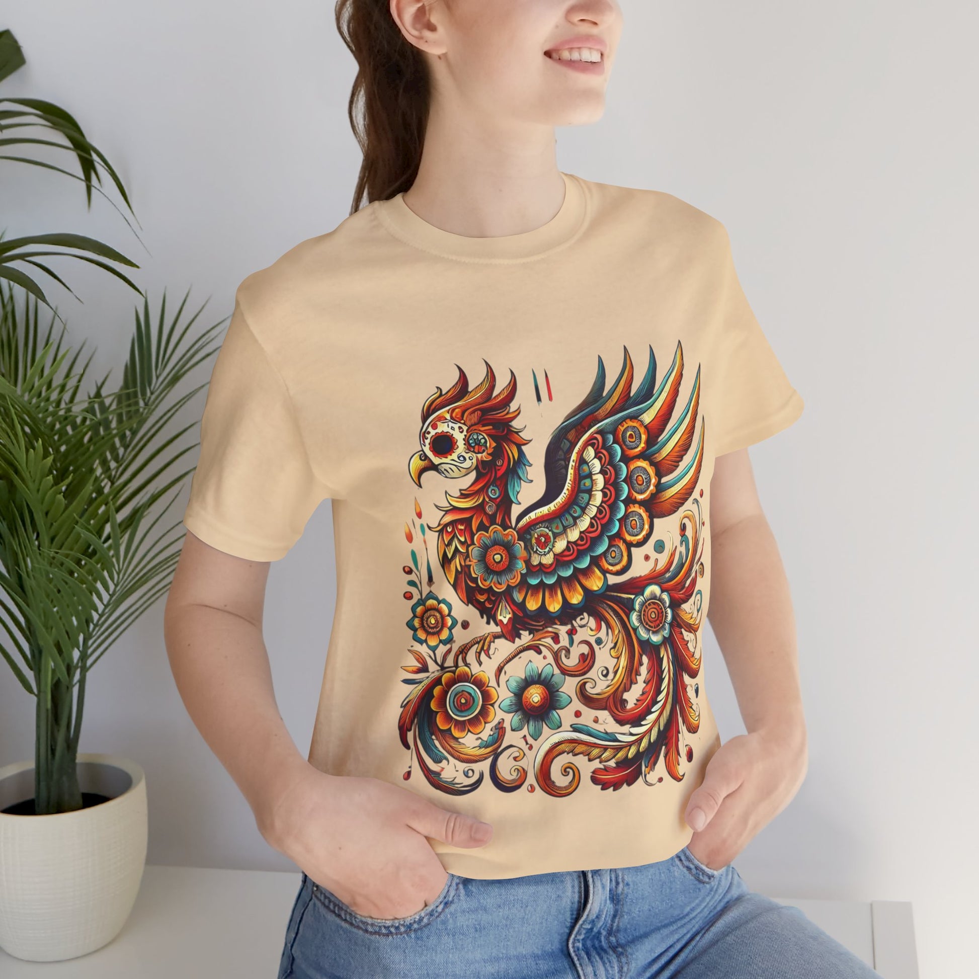 A mythical phoenix with intricate floral and geometric patterns, featuring vibrant colors like red, yellow, orange, and blue.