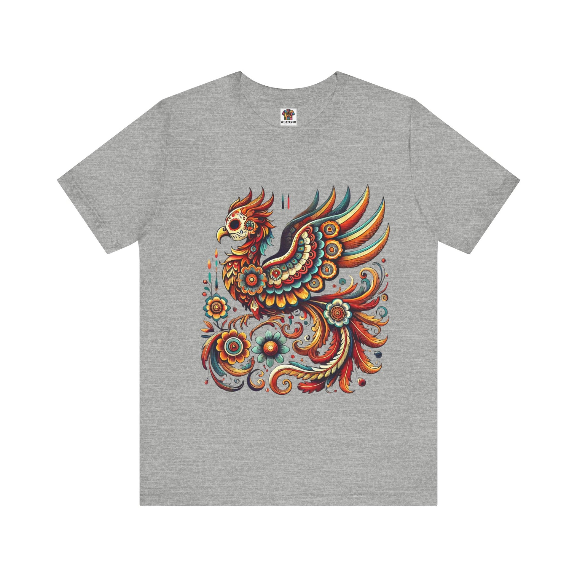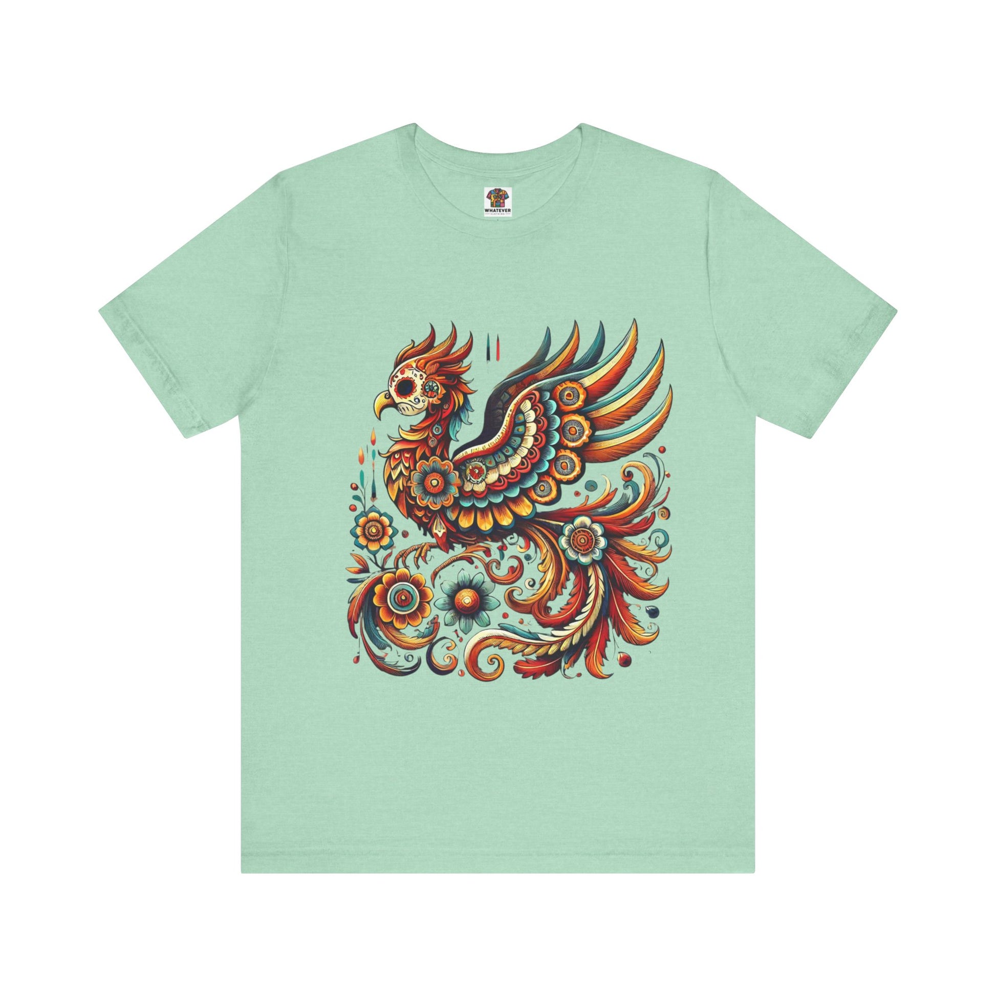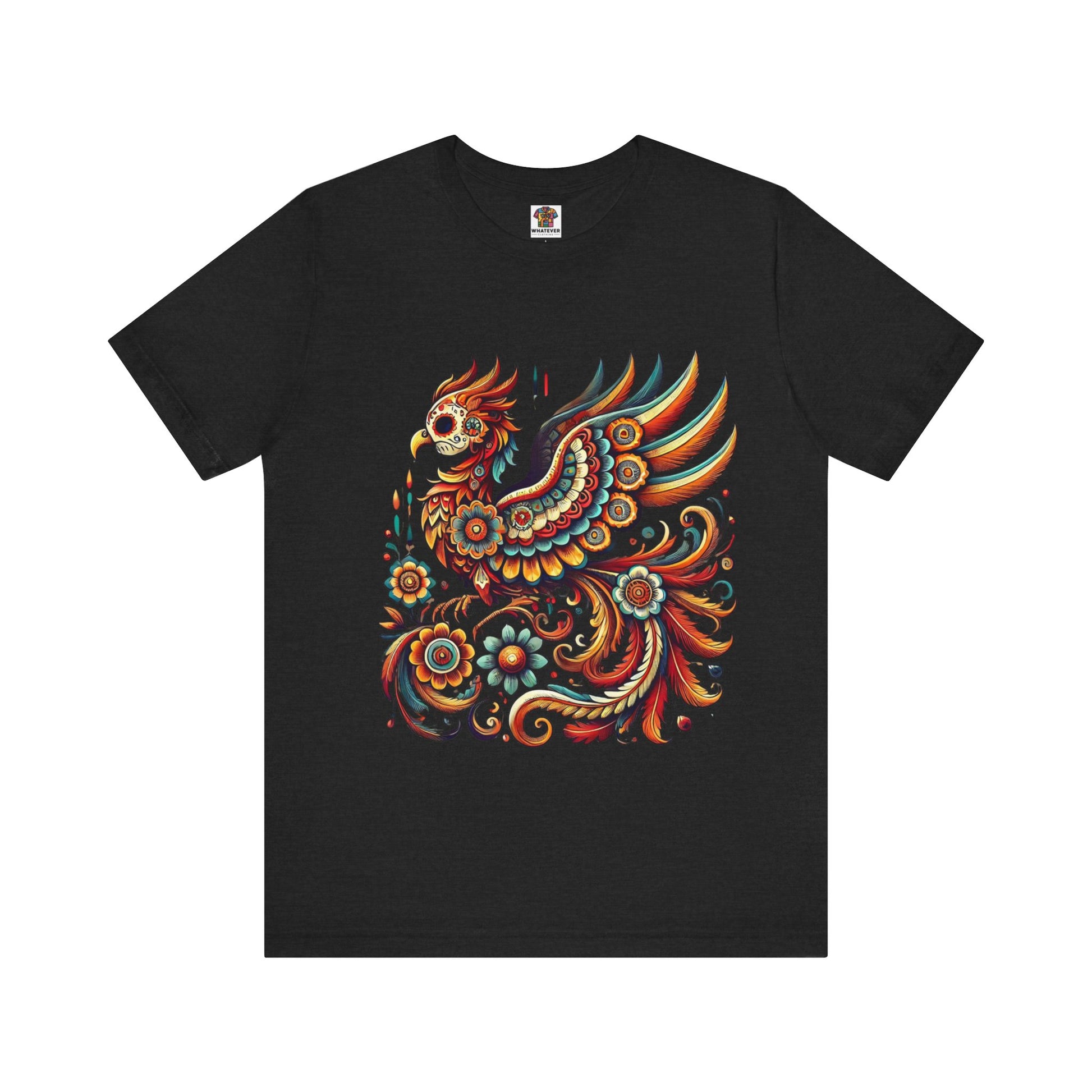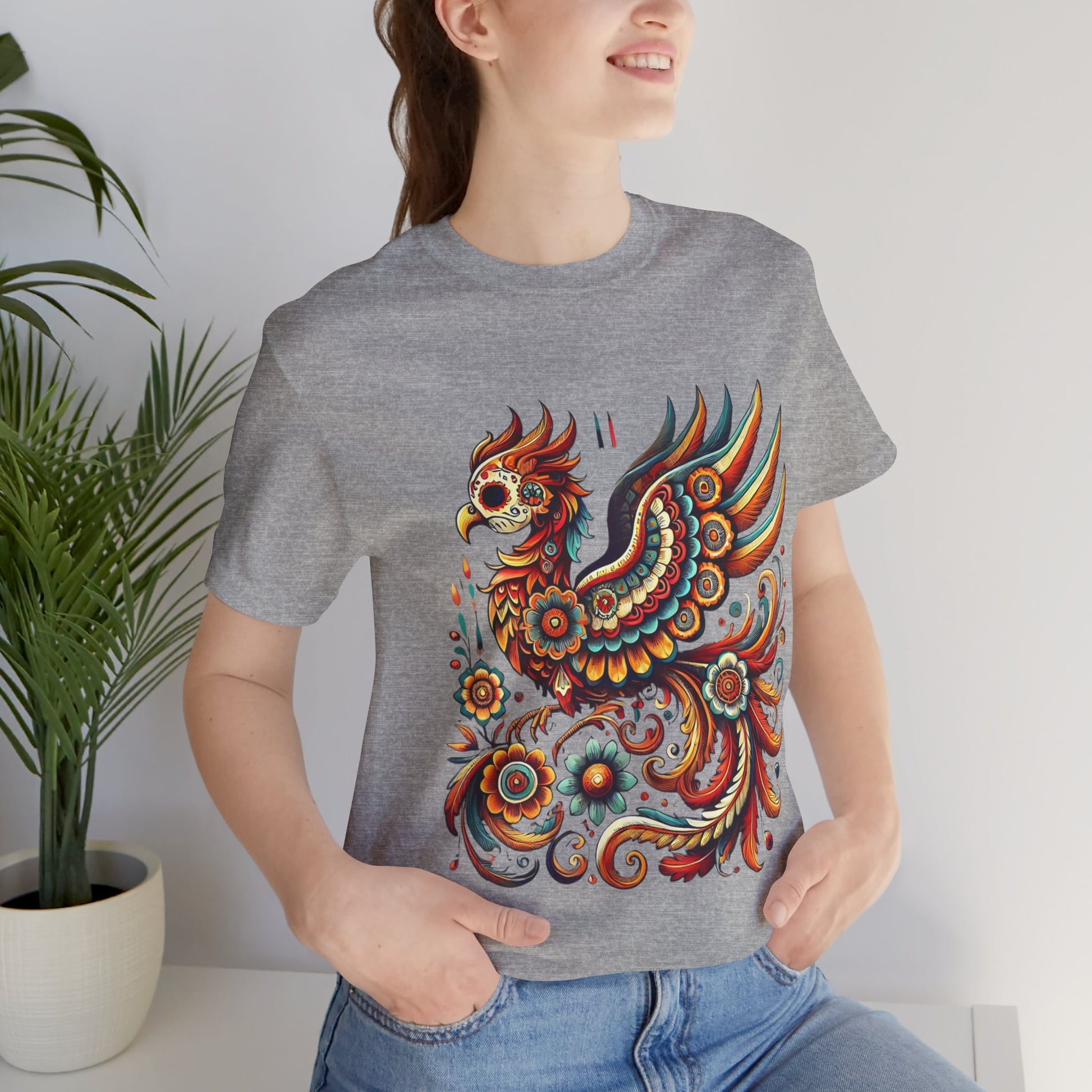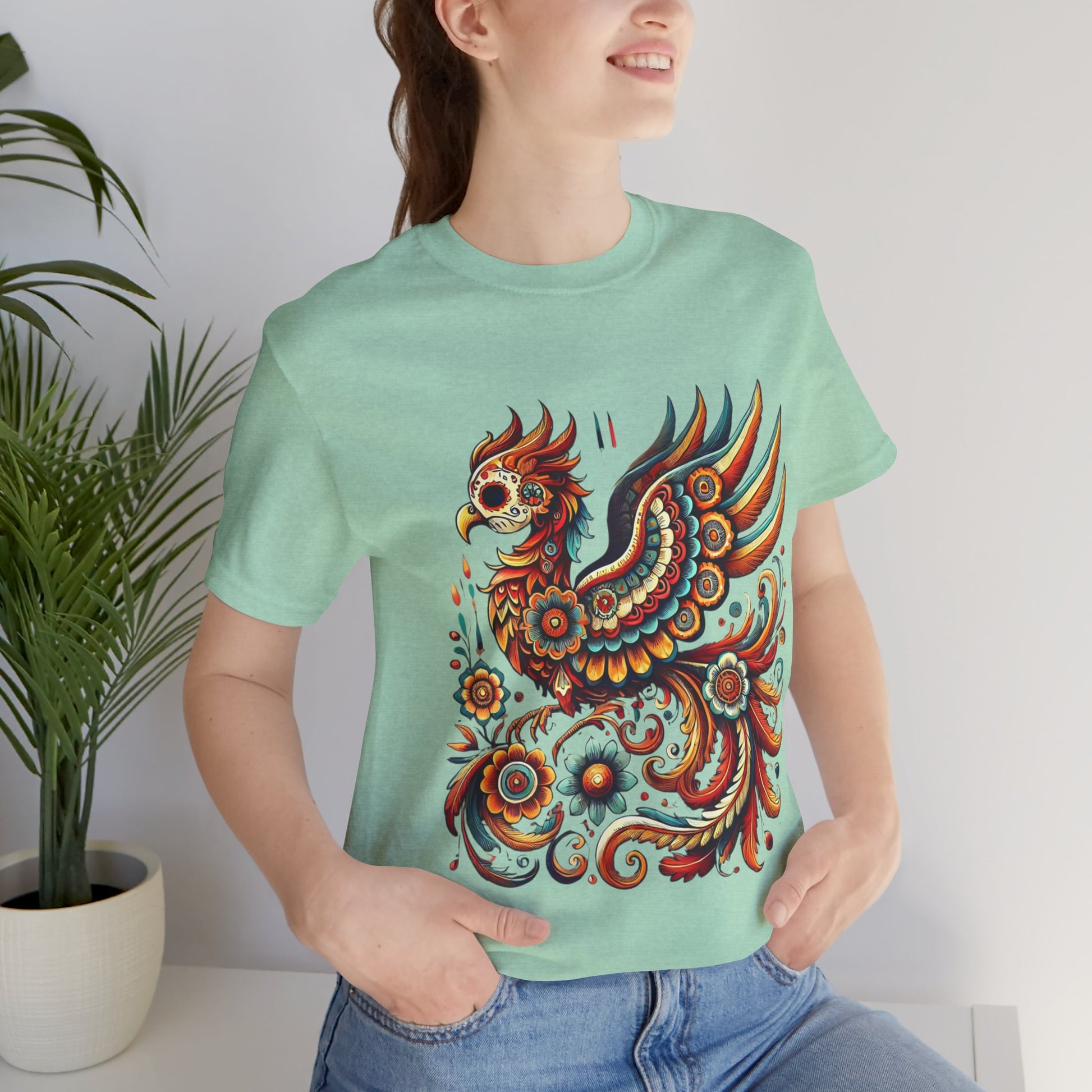 A mythical phoenix with intricate floral and geometric patterns, featuring vibrant colors like red, yellow, orange, and blue.
