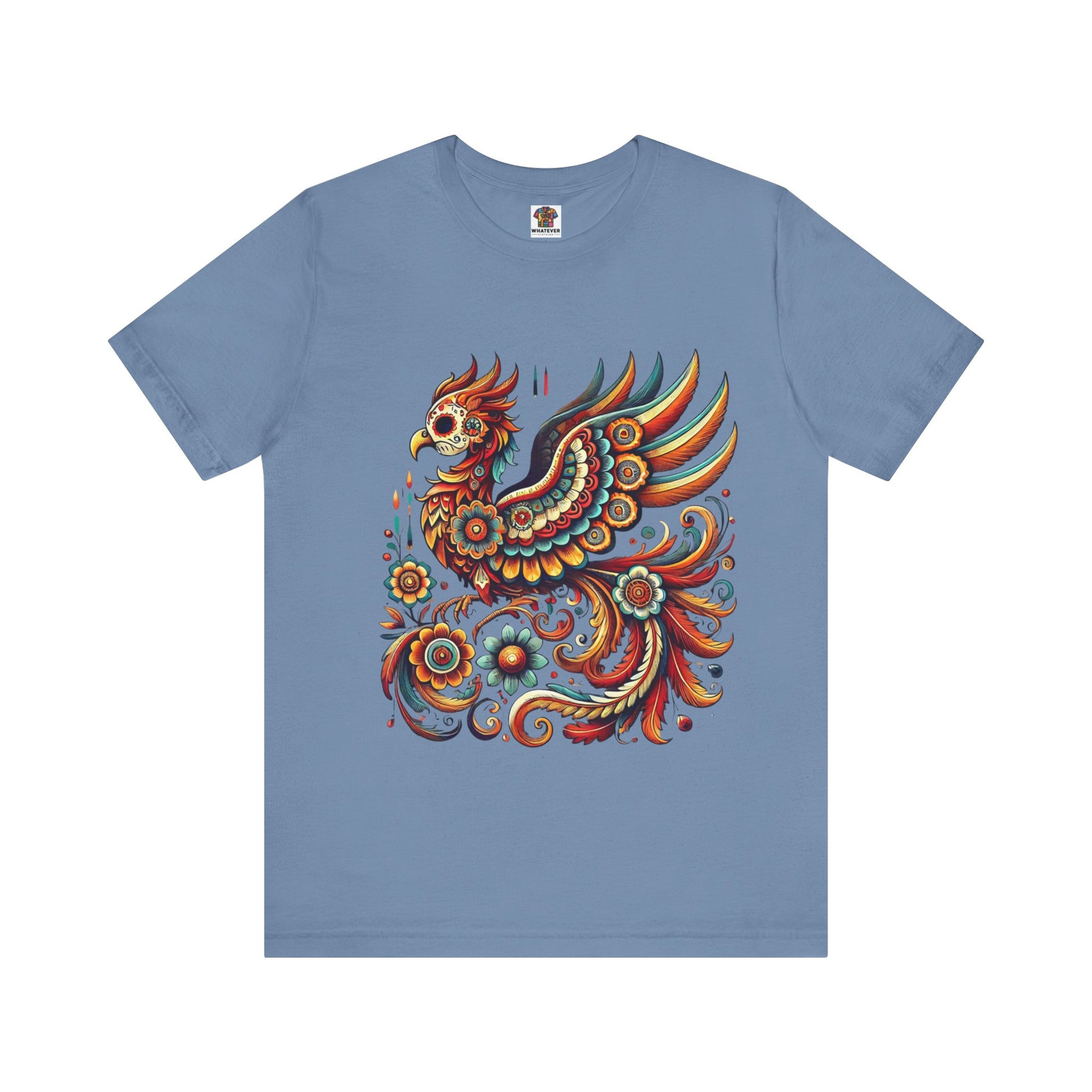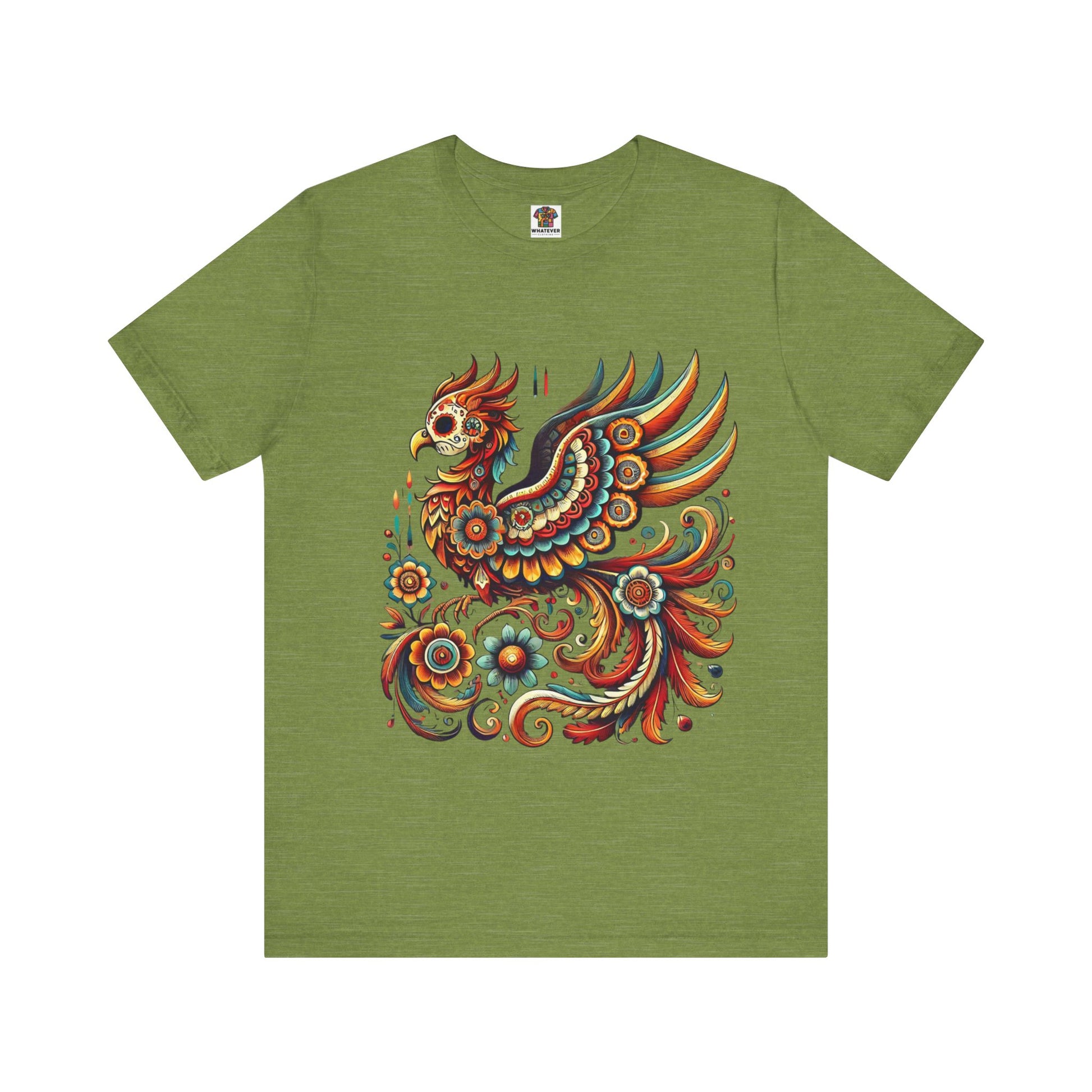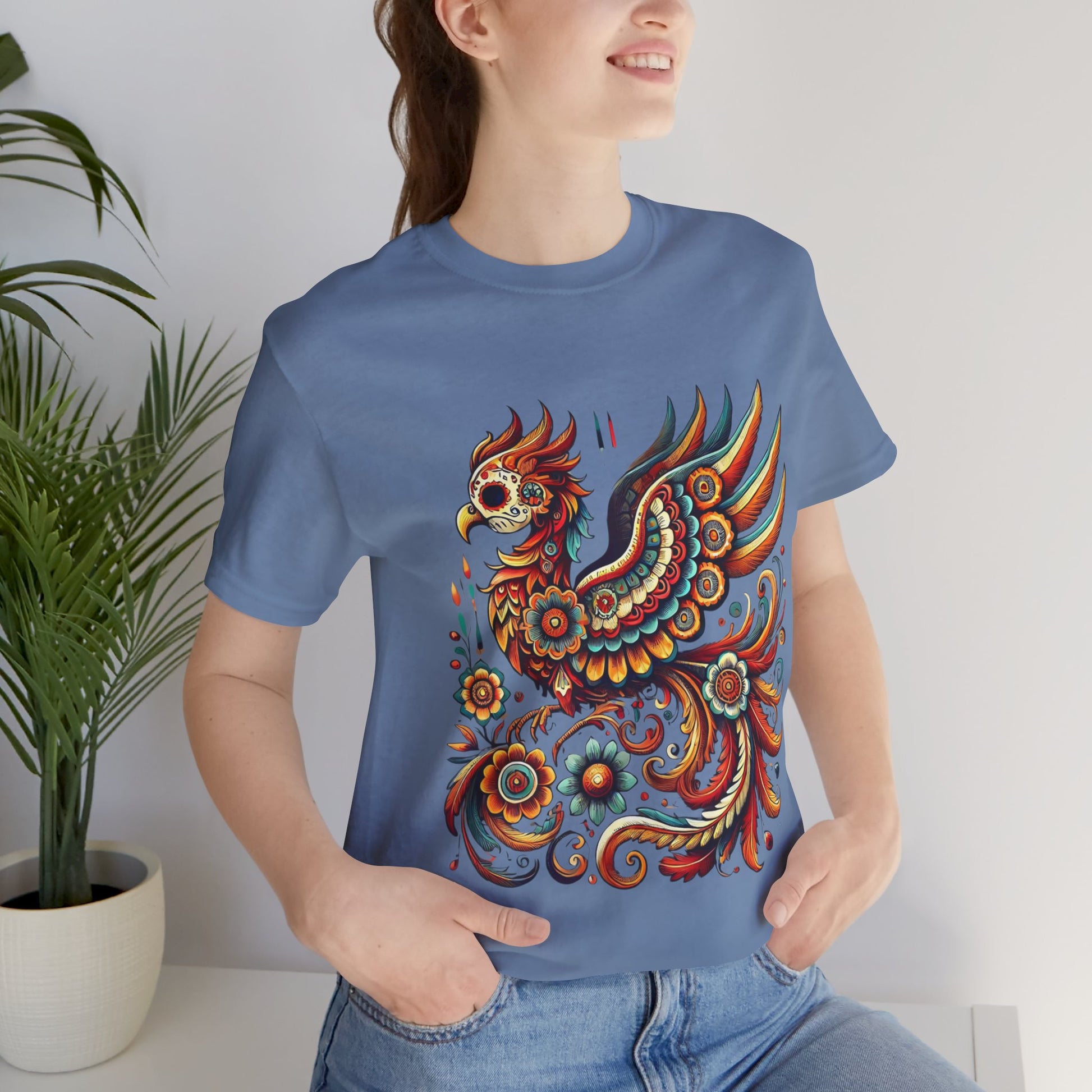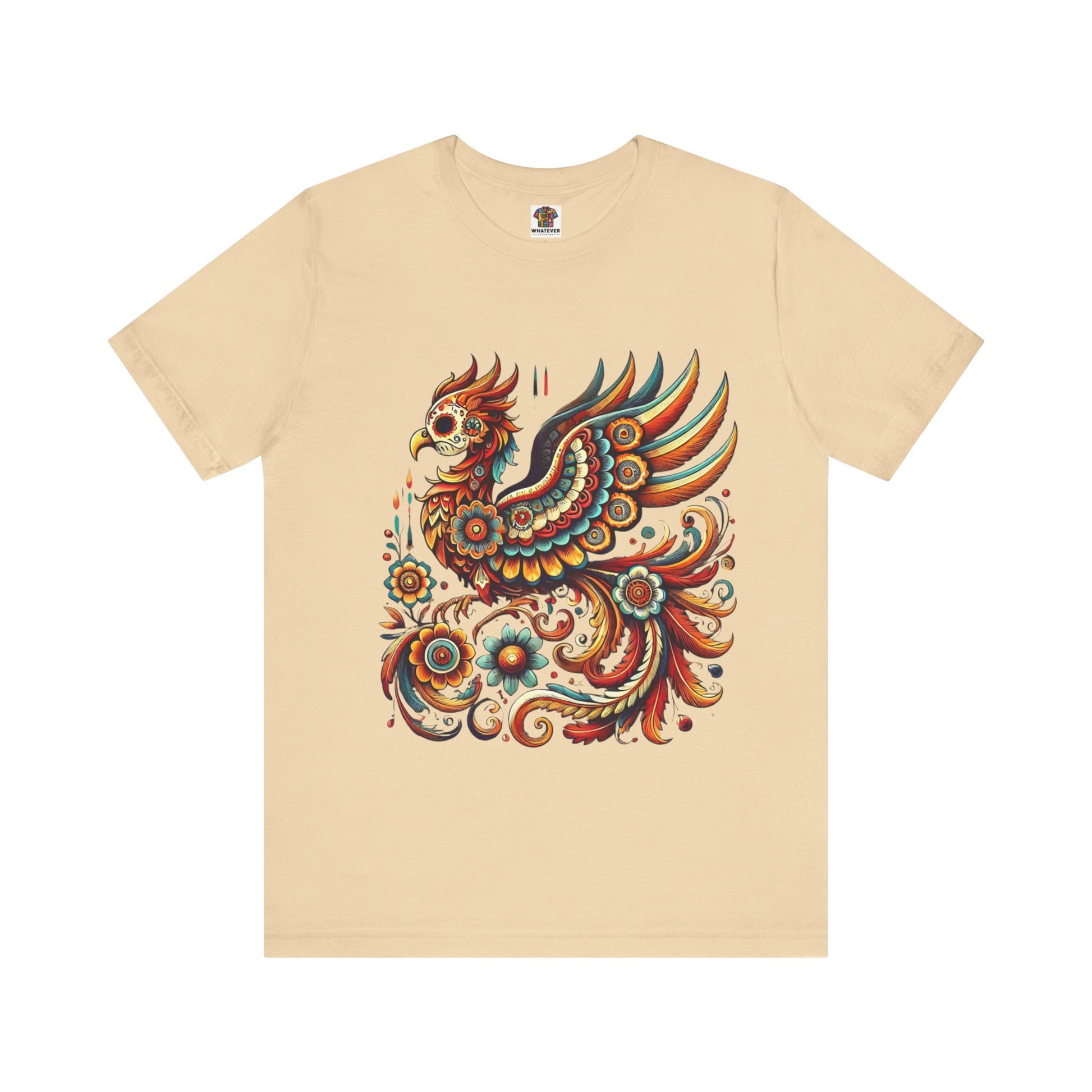 A mythical phoenix with intricate floral and geometric patterns, featuring vibrant colors like red, yellow, orange, and blue.
