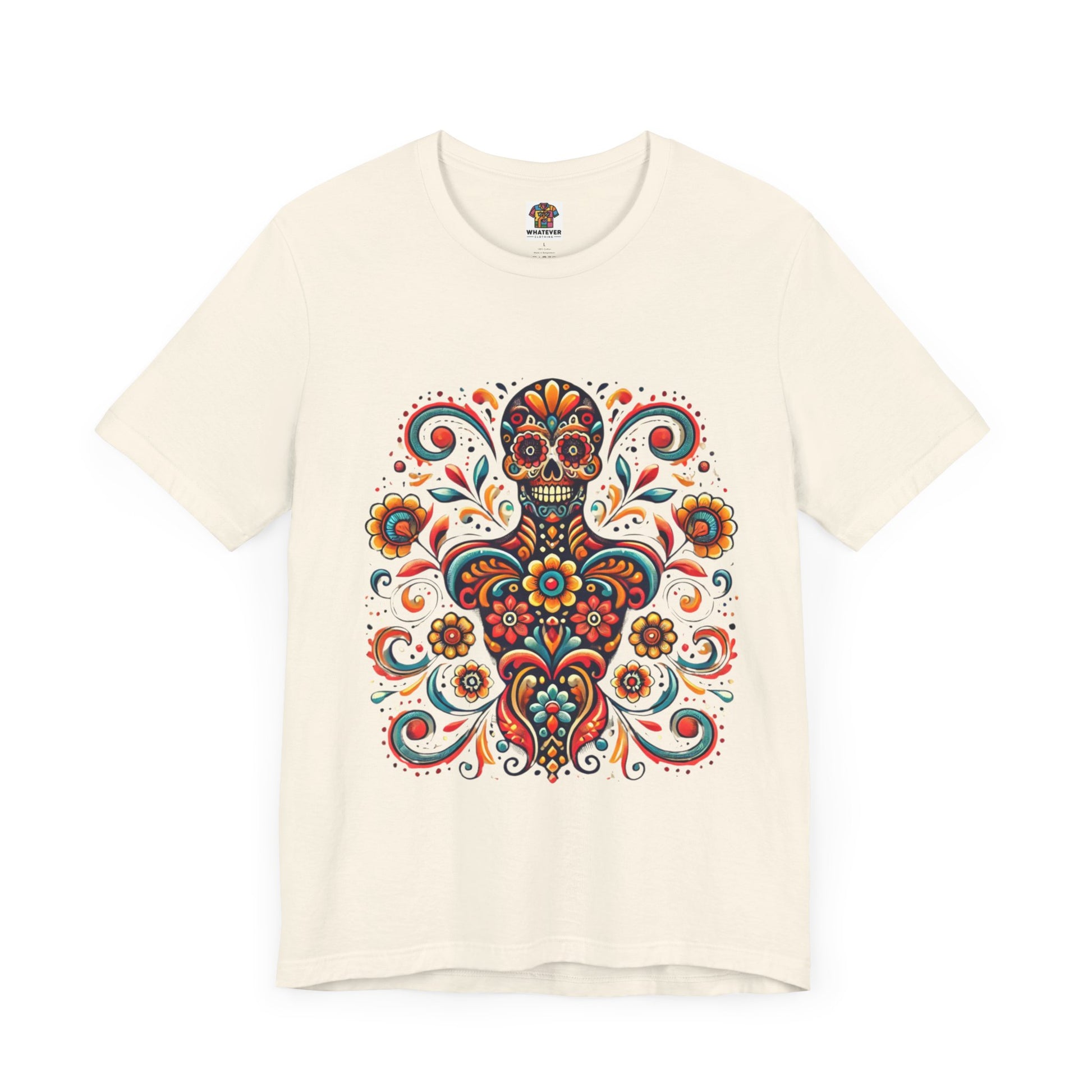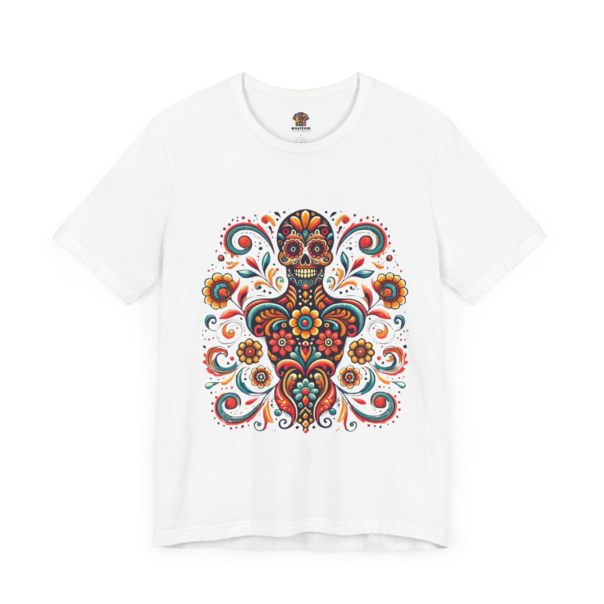 A stylized human figure adorned with floral and geometric patterns in vibrant colors like red, orange, yellow, and blue, evoking celebration.