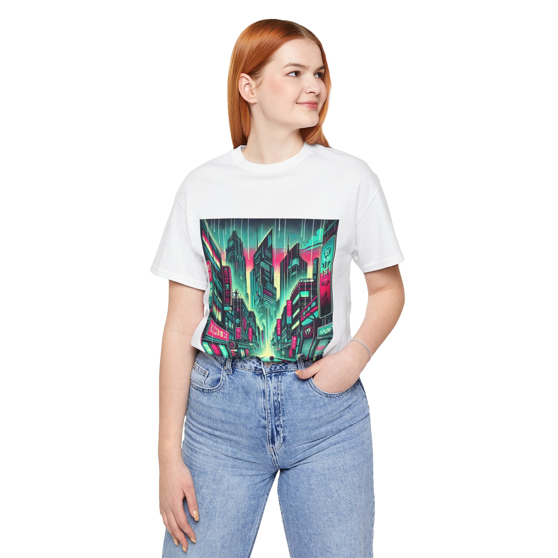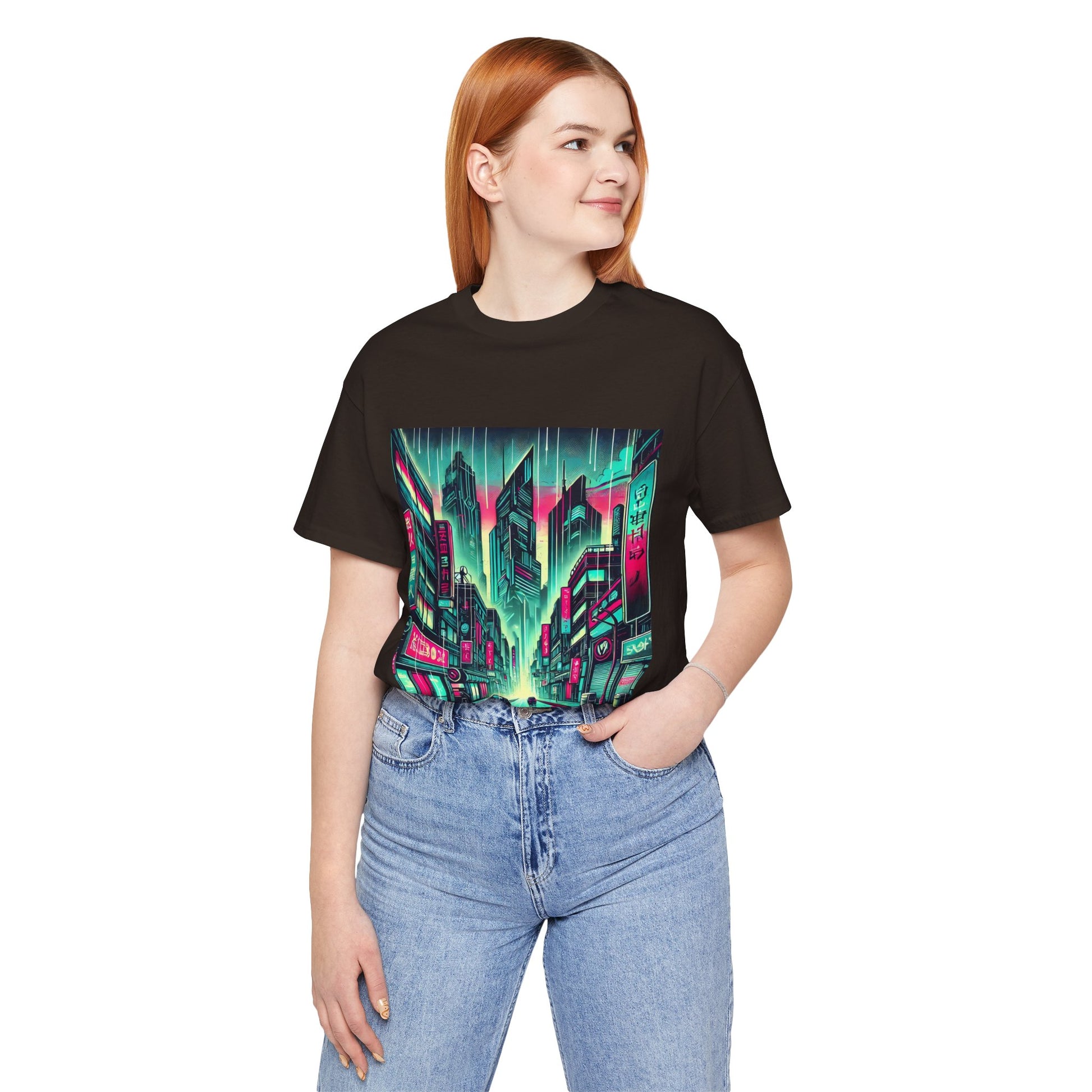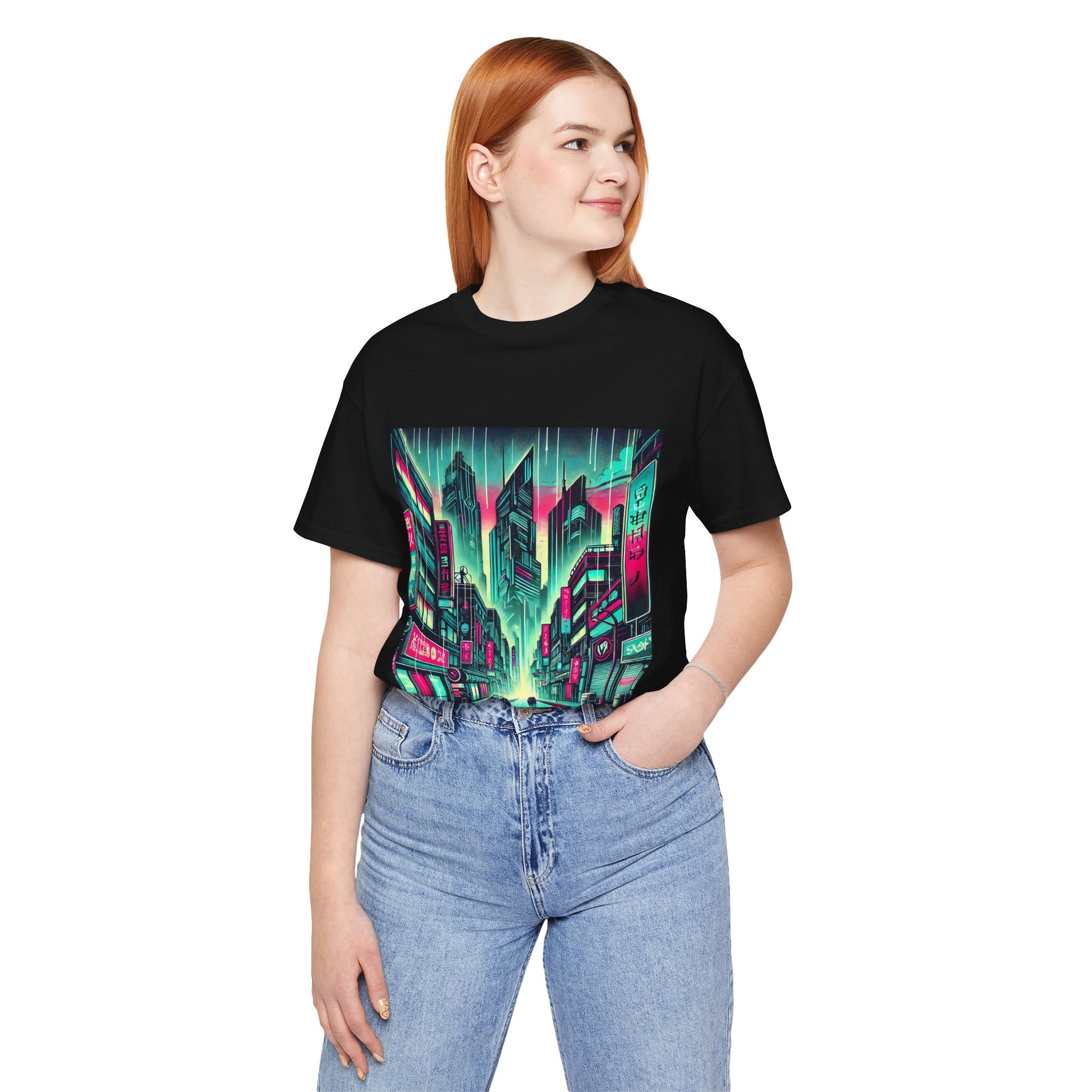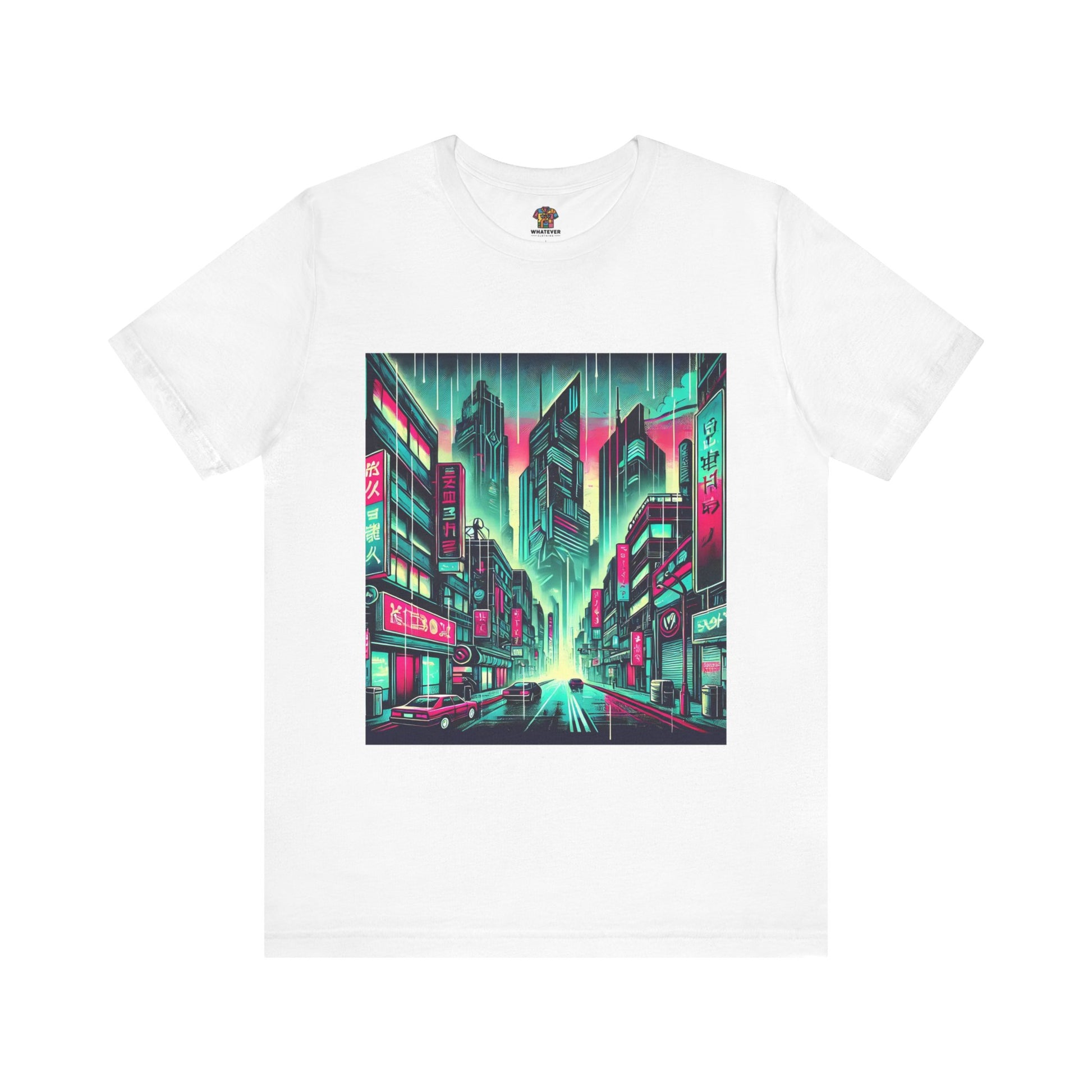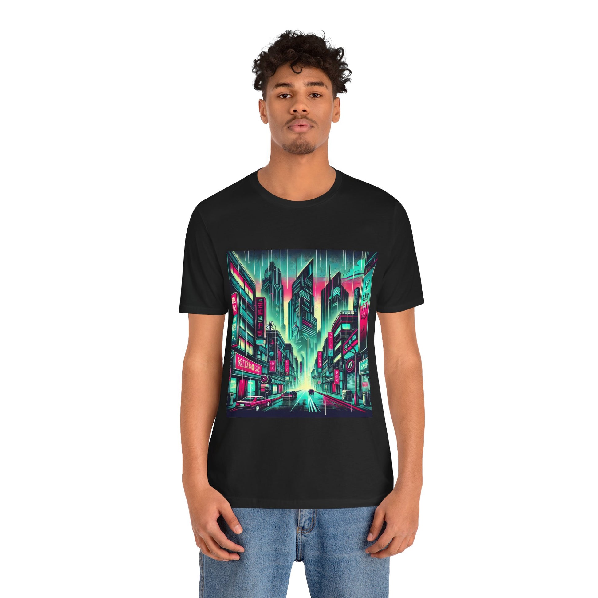 A cyberpunk urban landscape featuring towering skyscrapers, neon signs, and rain-soaked streets, creating a dystopian atmosphere.