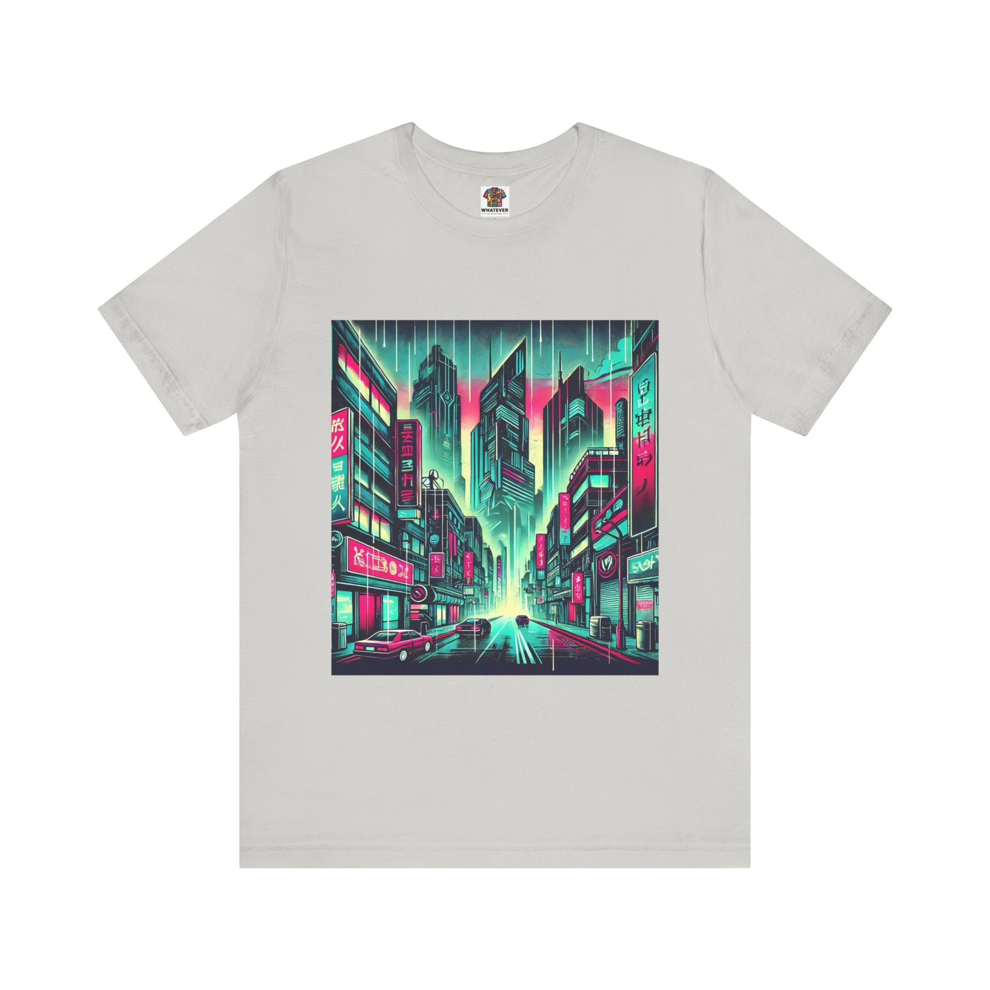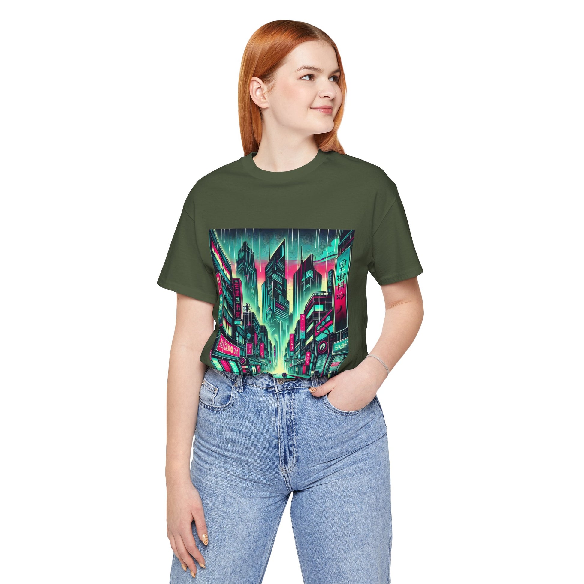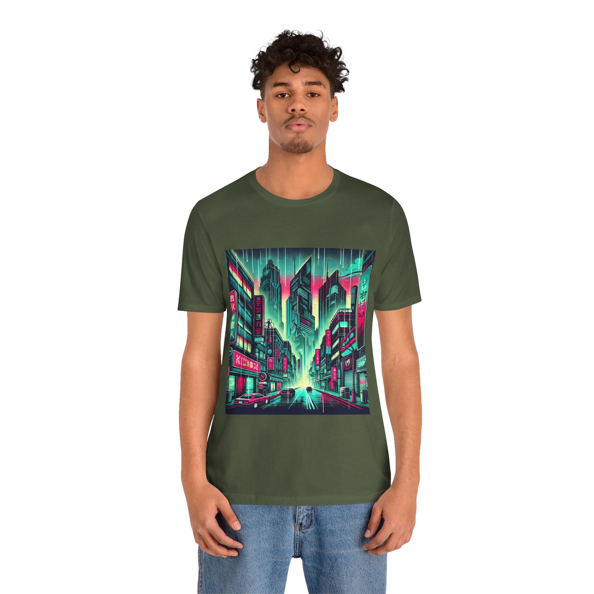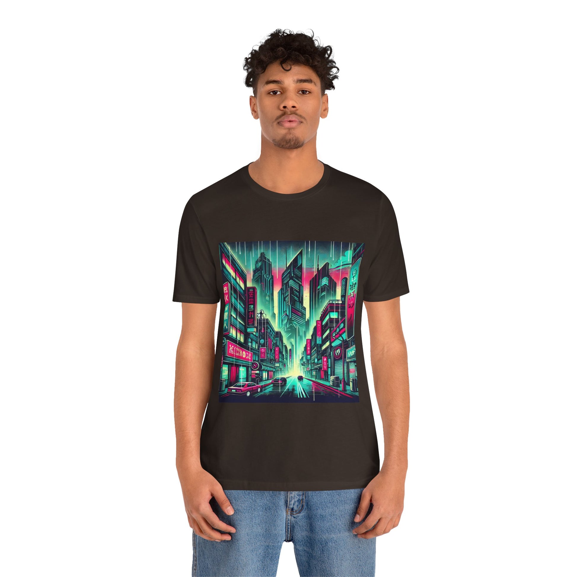 A cyberpunk urban landscape featuring towering skyscrapers, neon signs, and rain-soaked streets, creating a dystopian atmosphere.