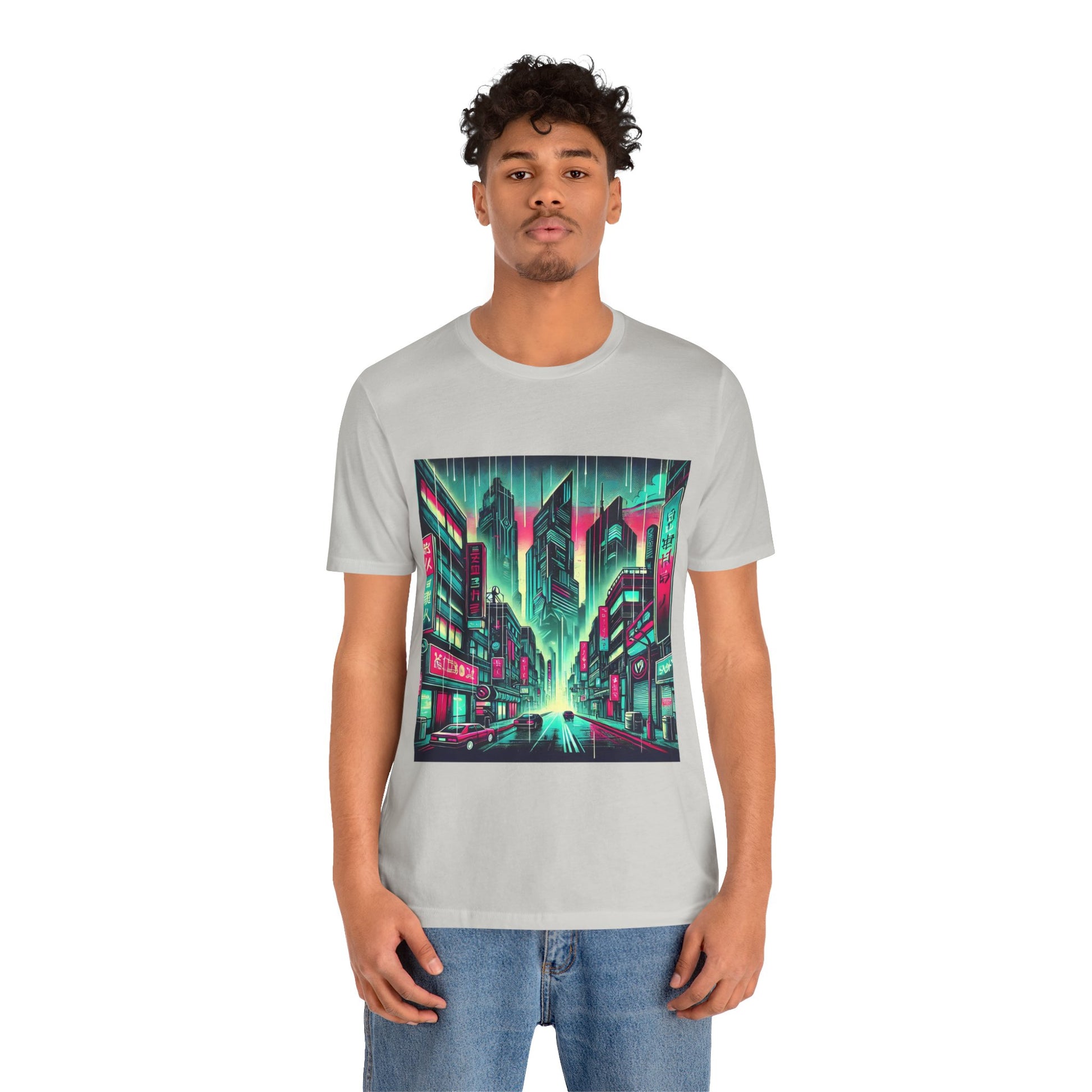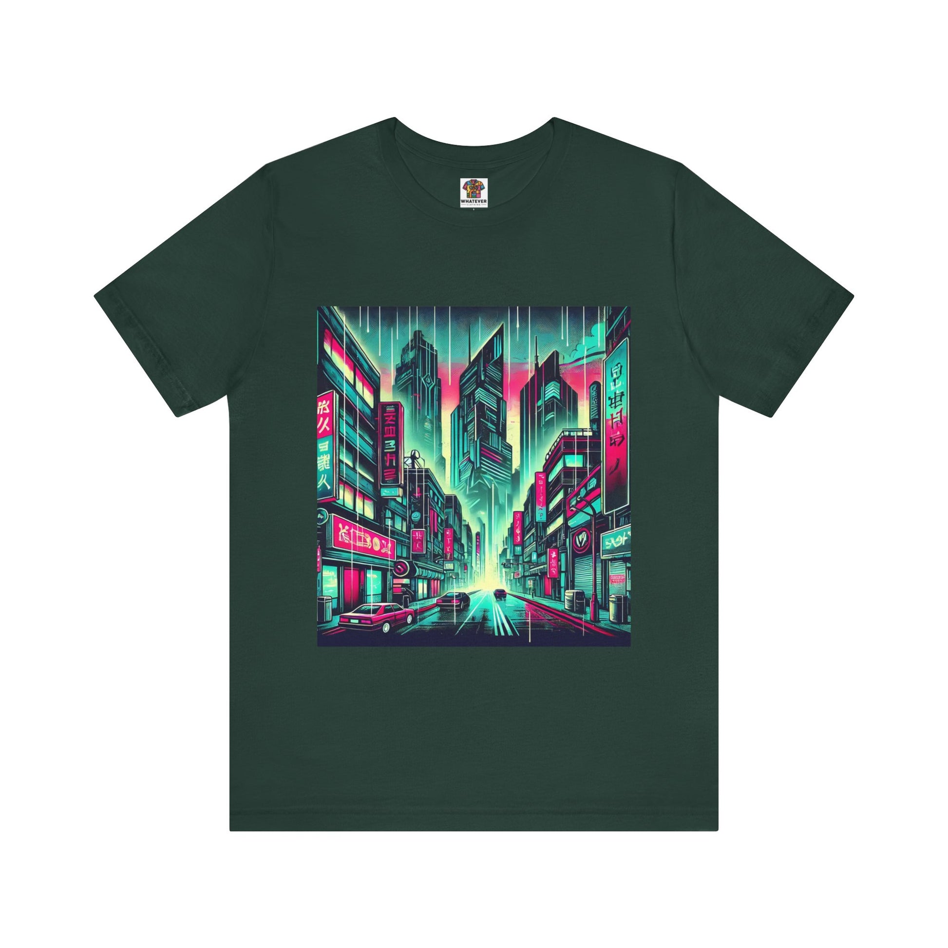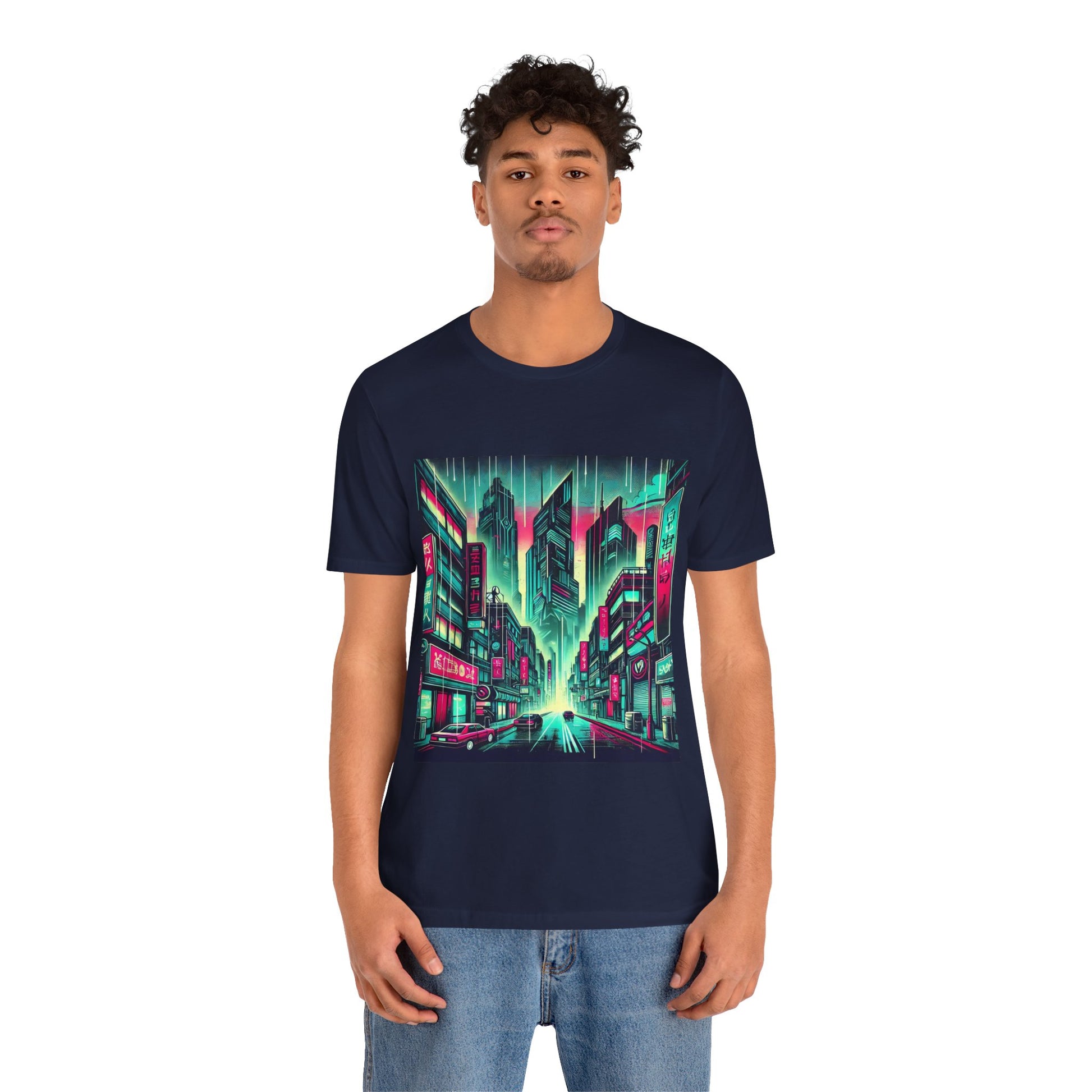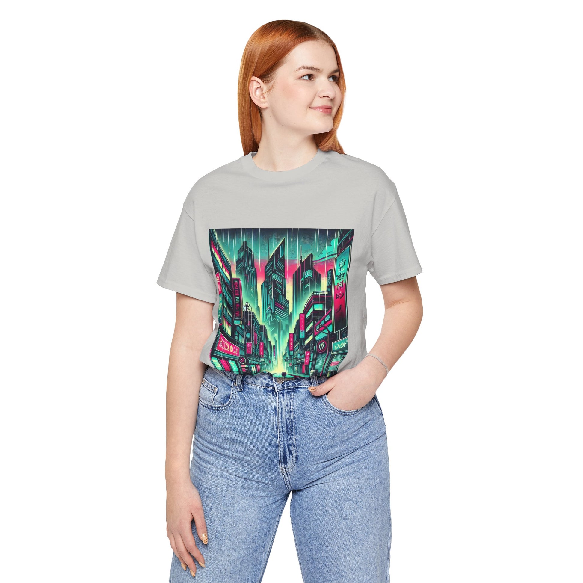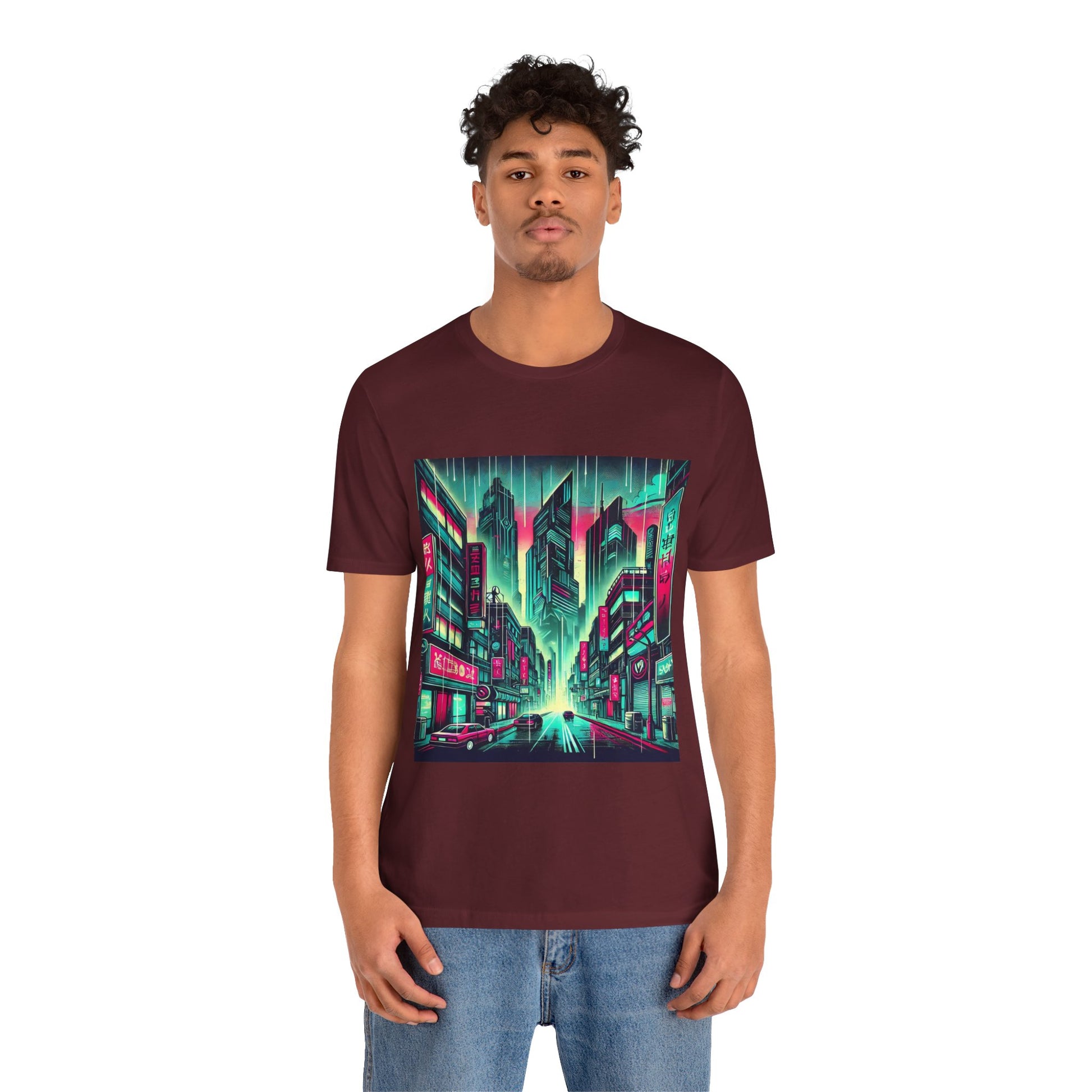 A cyberpunk urban landscape featuring towering skyscrapers, neon signs, and rain-soaked streets, creating a dystopian atmosphere.