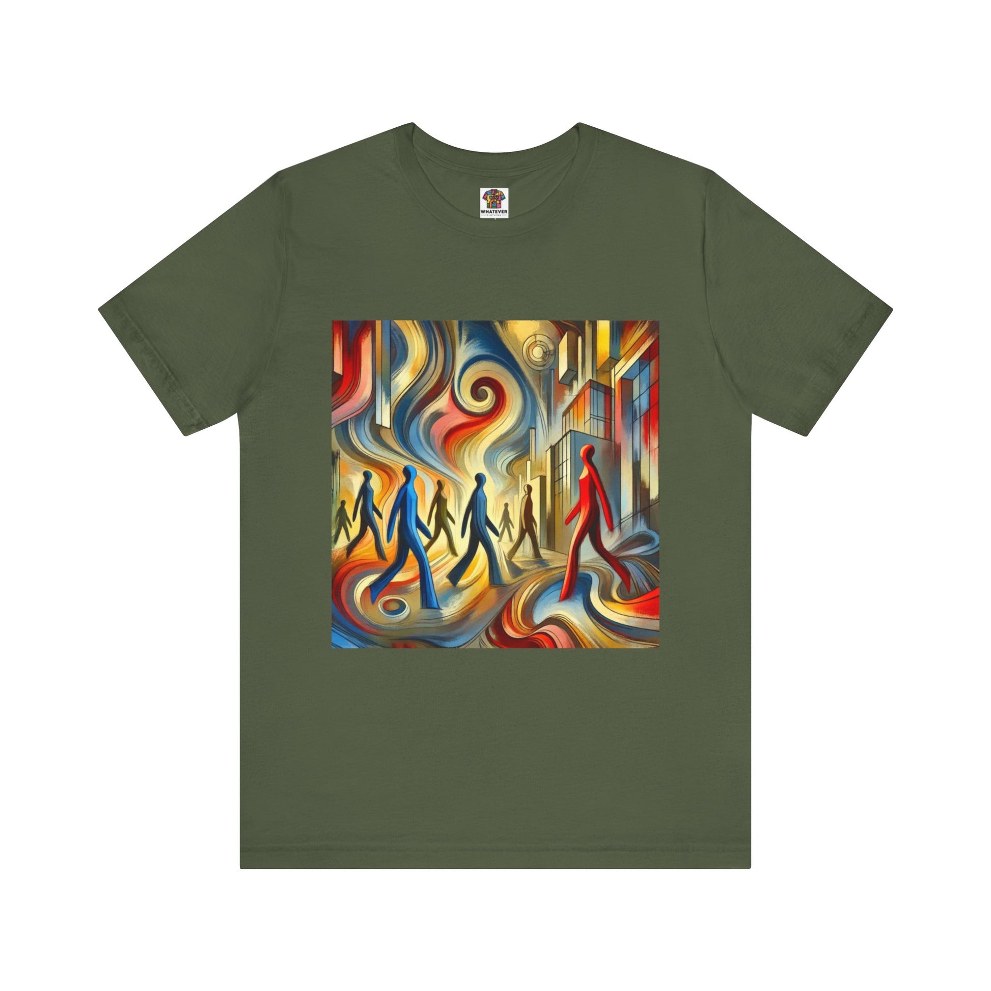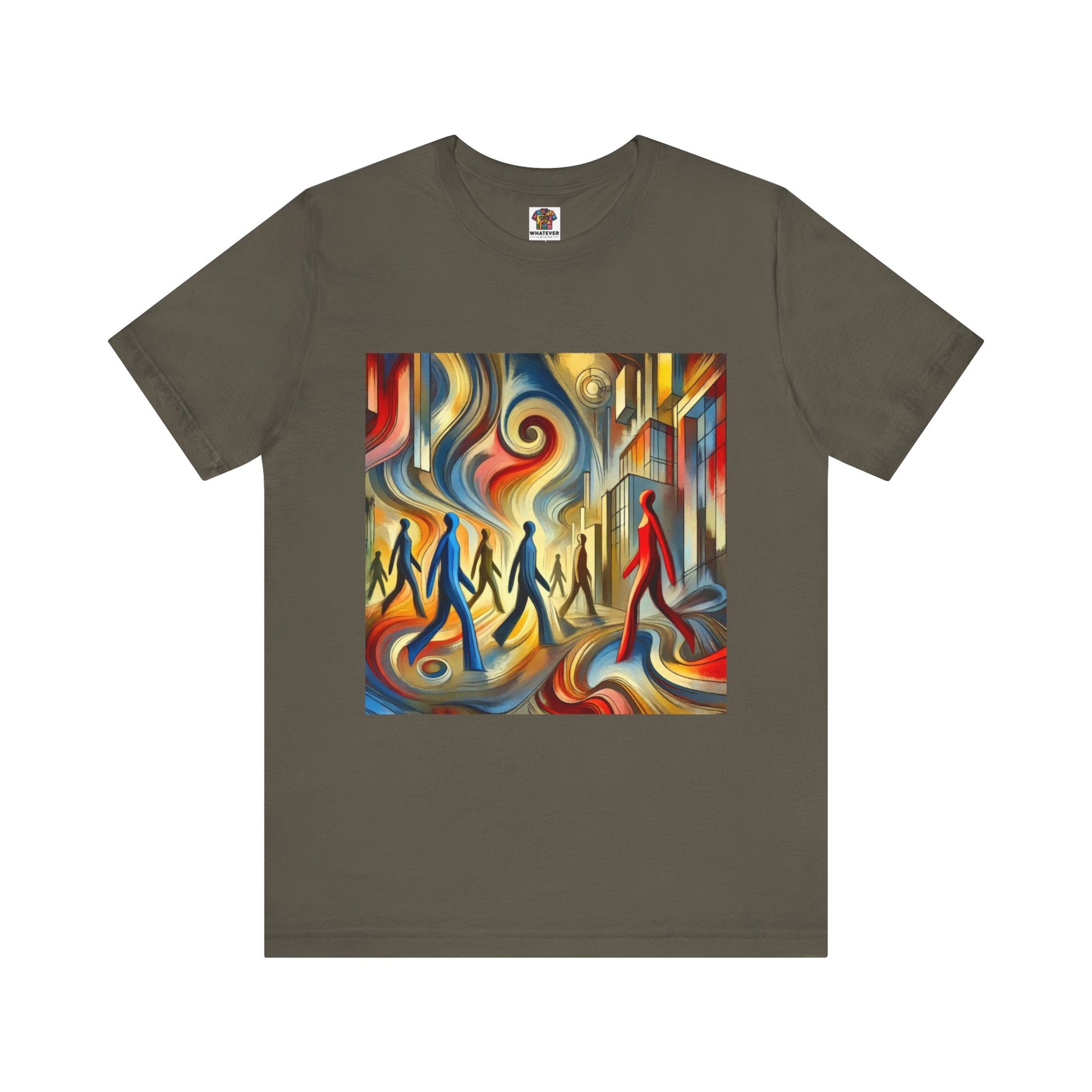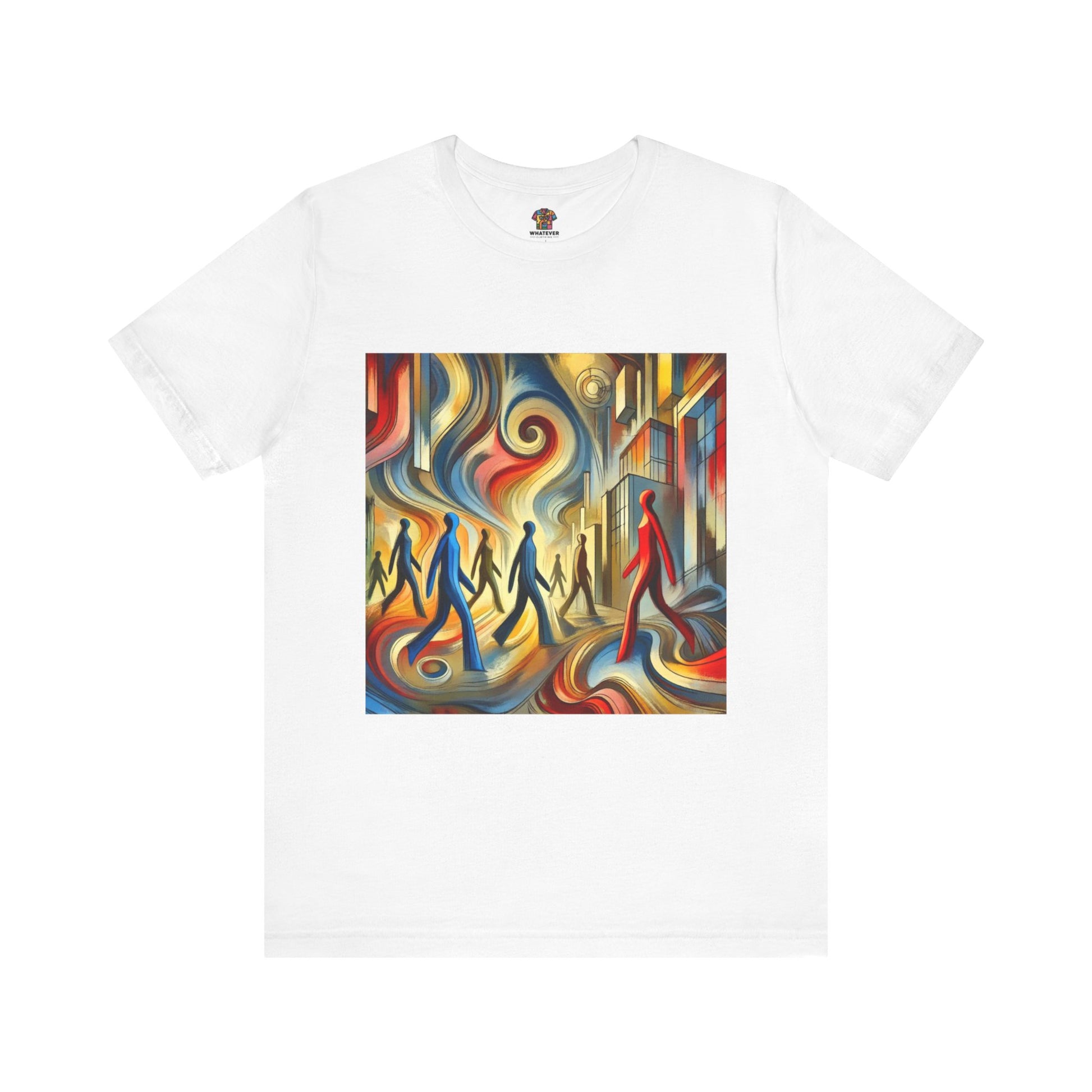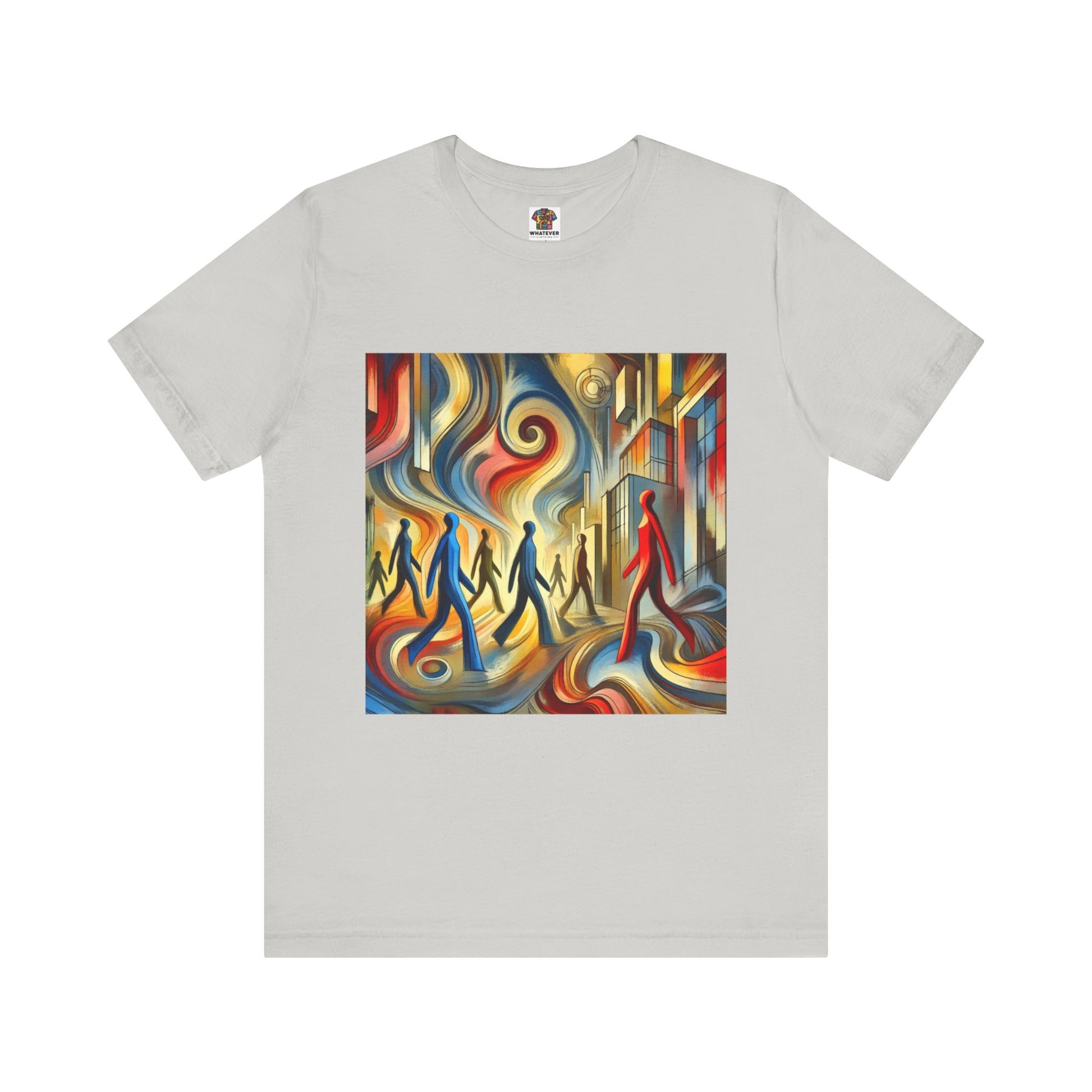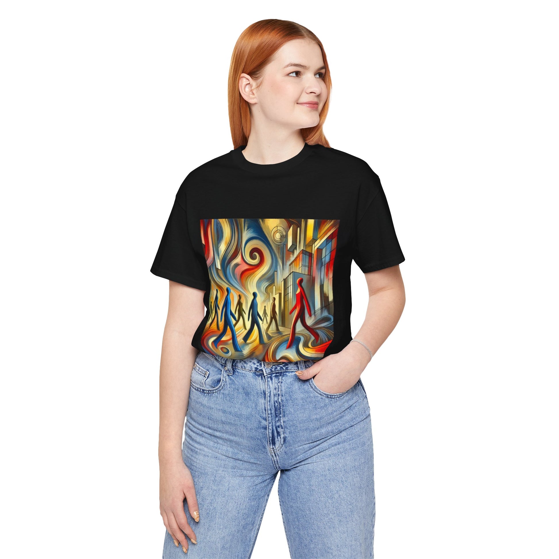 Elongated, flowing human figures walking through a chaotic, vibrant cityscape, emphasizing movement and anonymity.