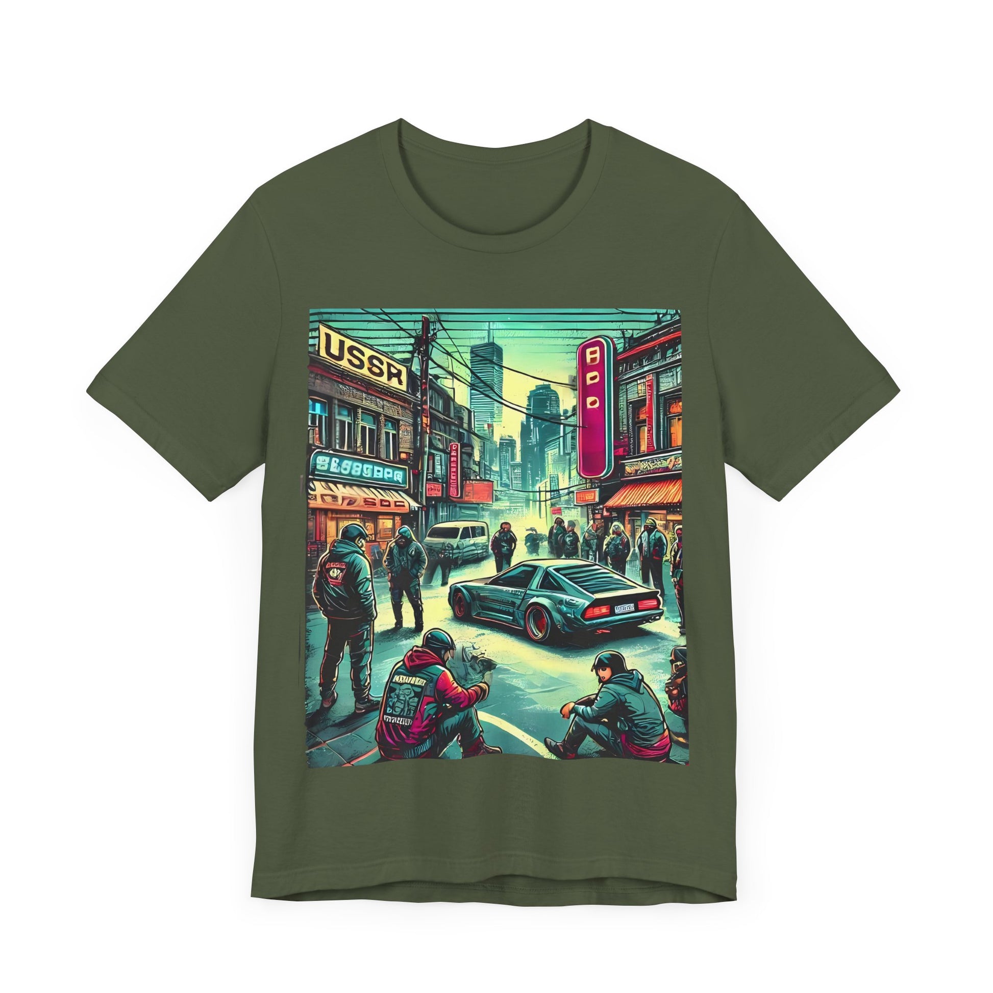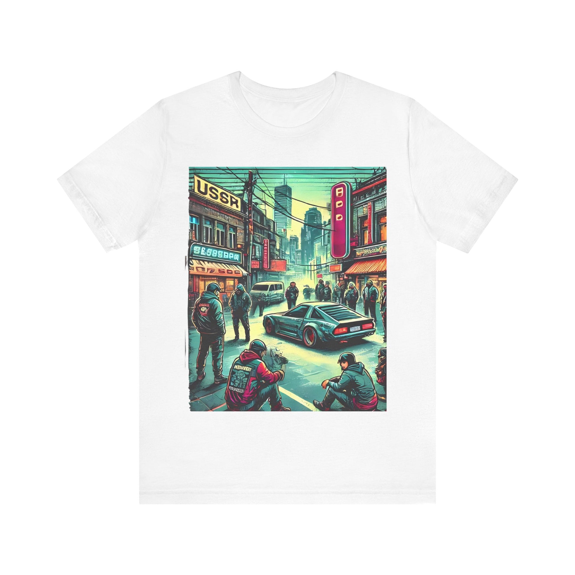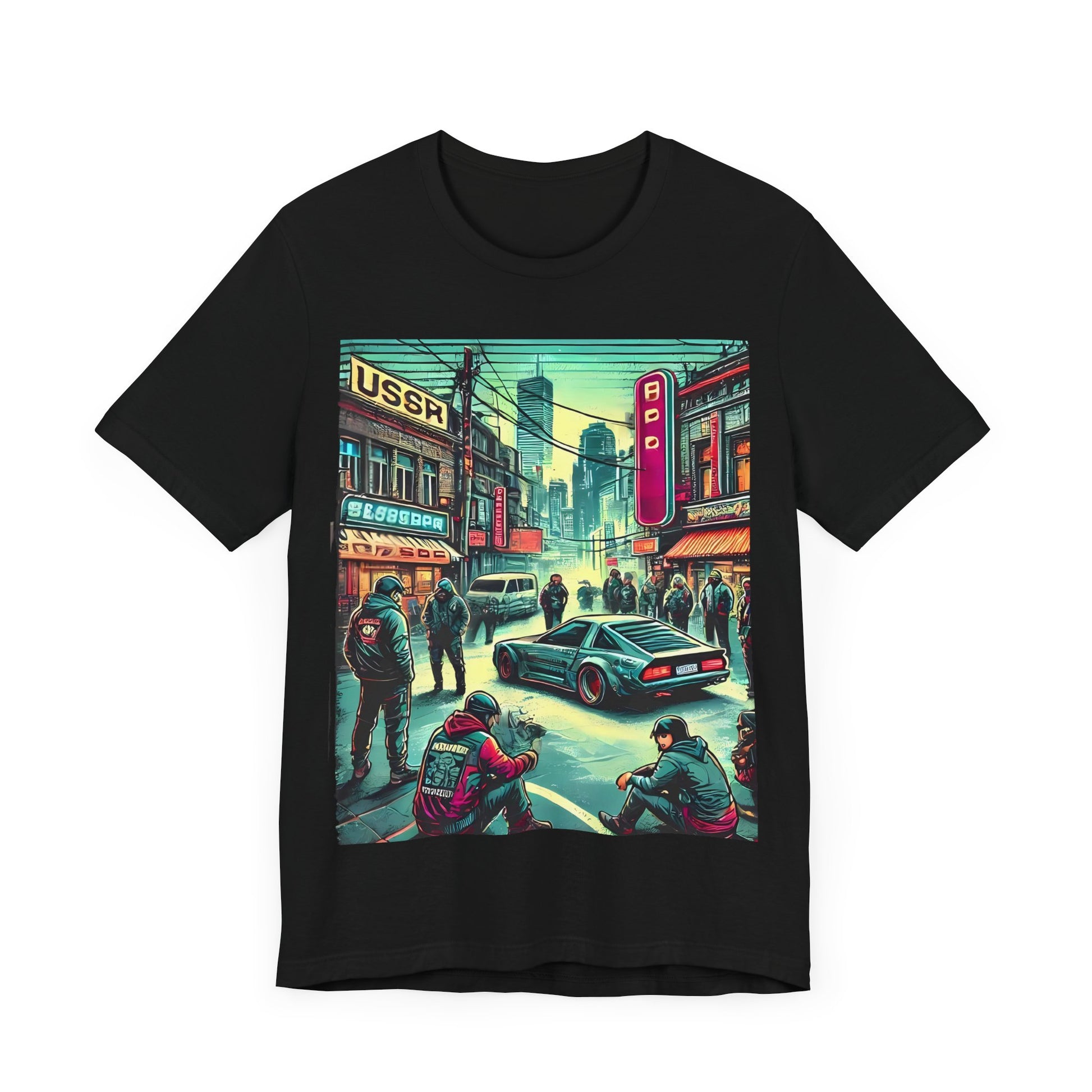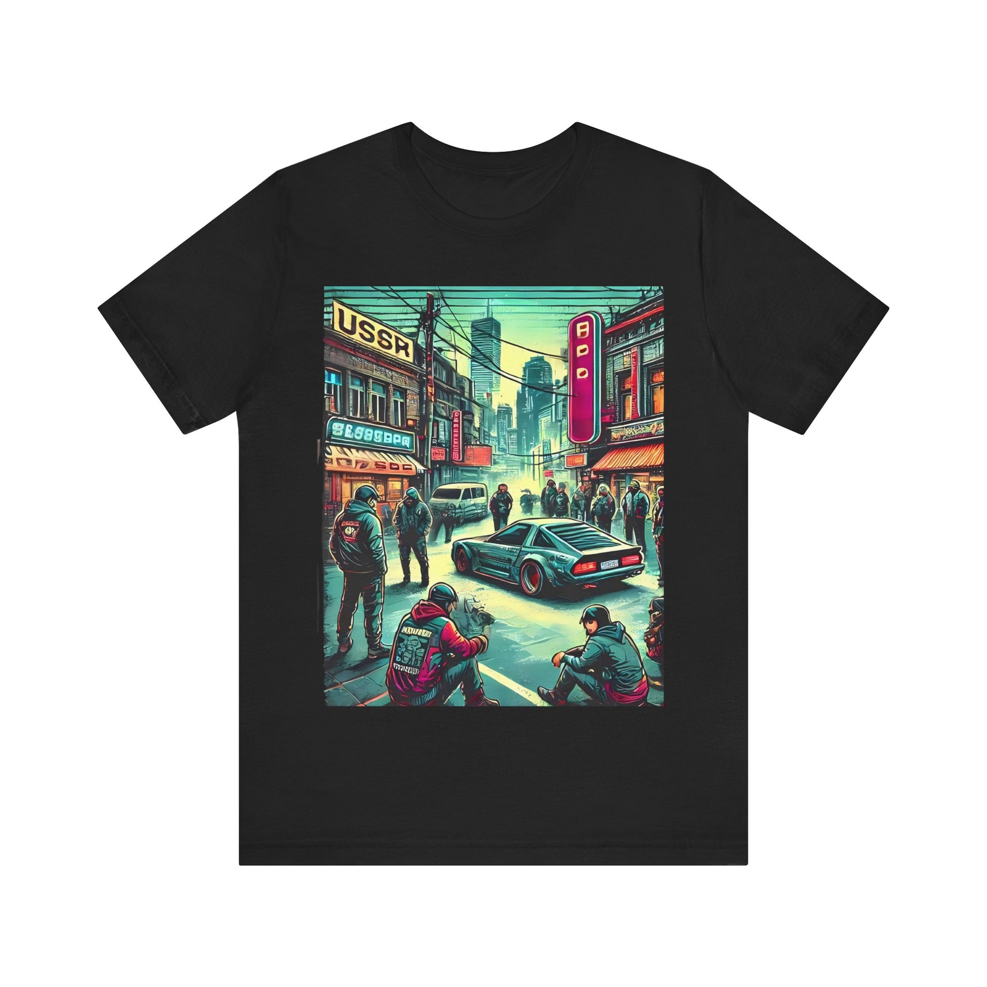 Crafted from soft, breathable fabric, this piece doesn't just speak to your unique style but also ensures comfort and durability. The design comes alive with characters in streetwear, neon-lit futuristic cars, and looming Soviet-era buildings—all rendered in dark, gritty tones that are ignited with bright neon highlights.
