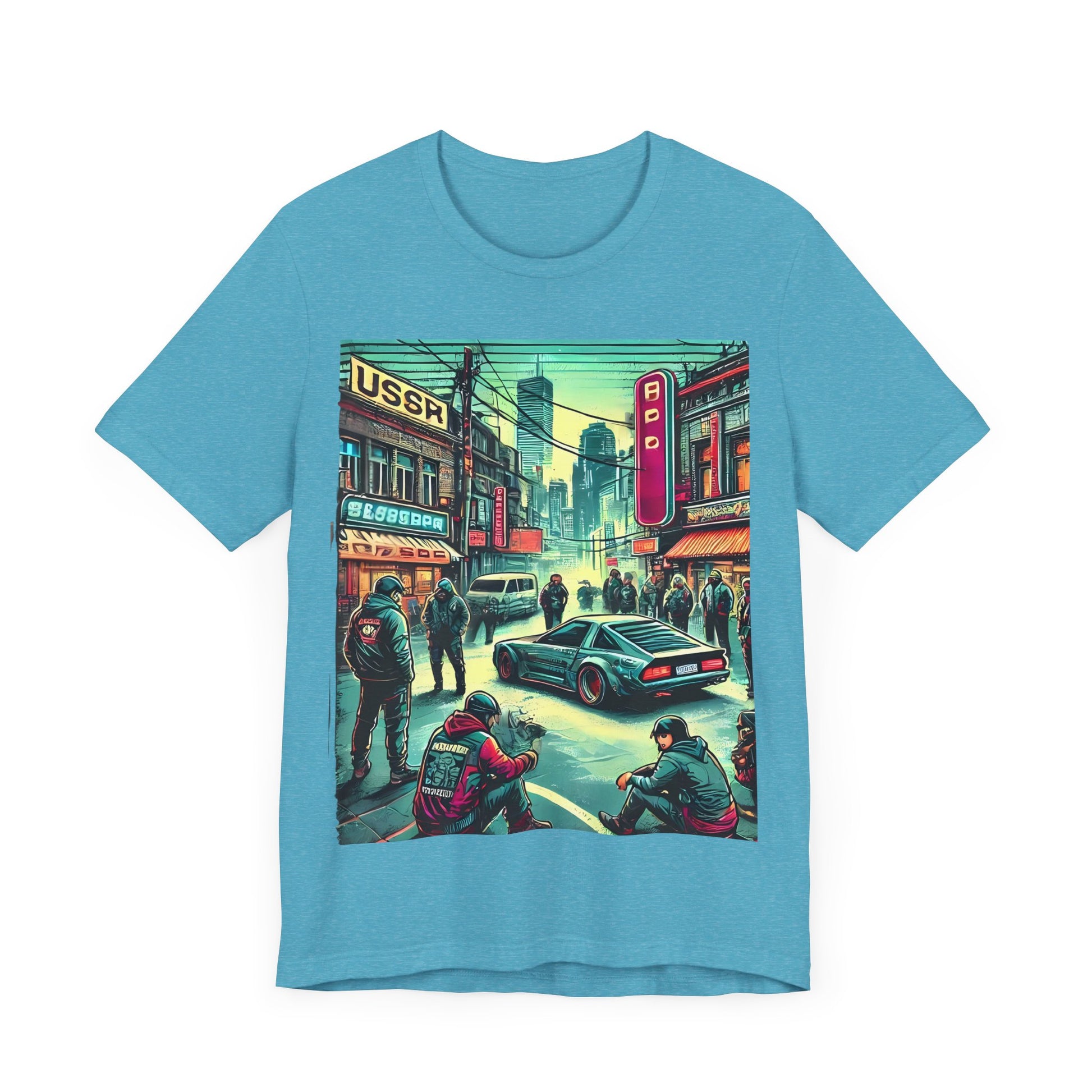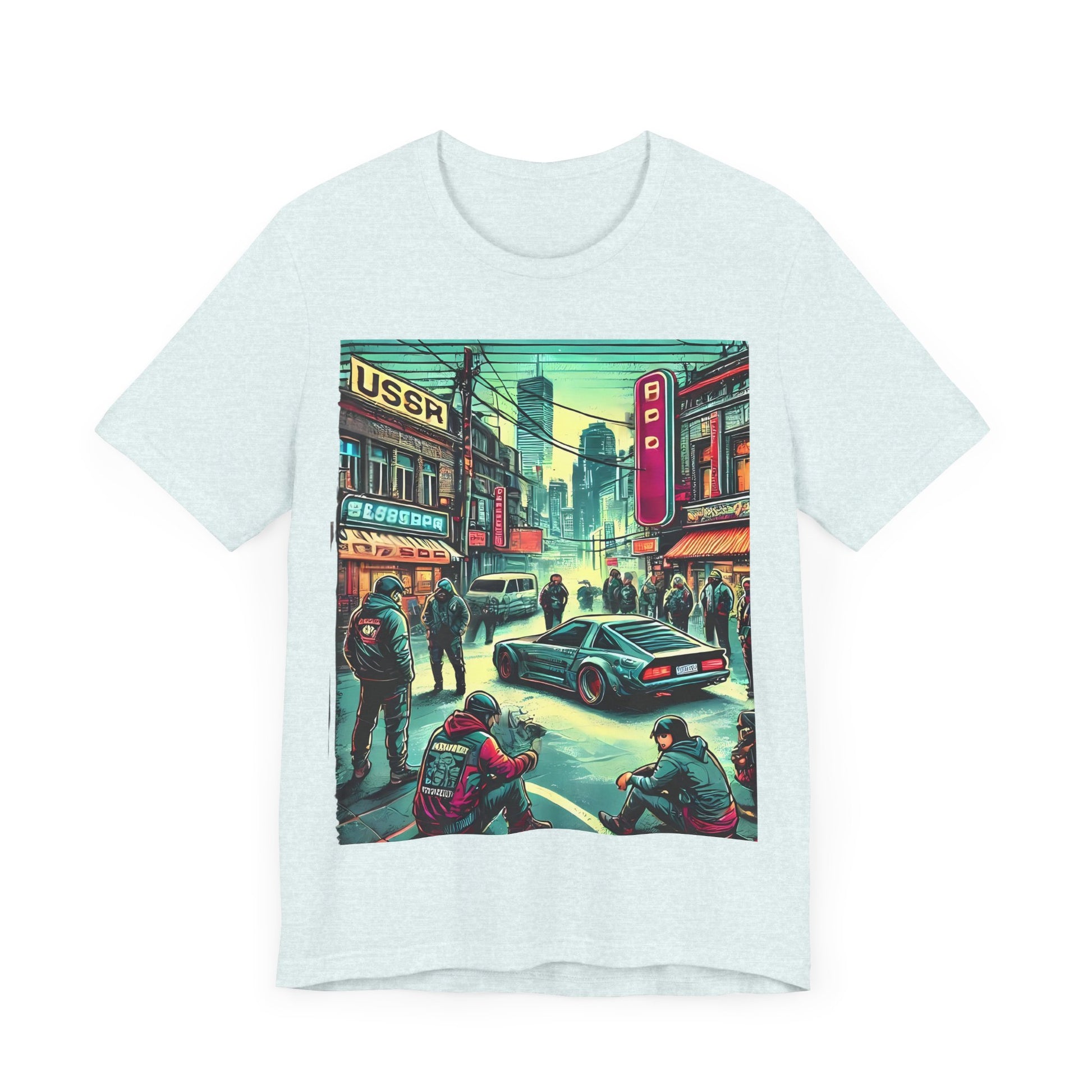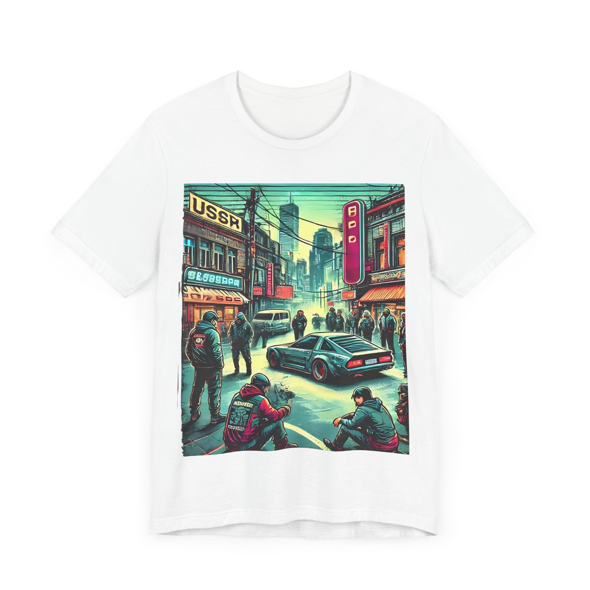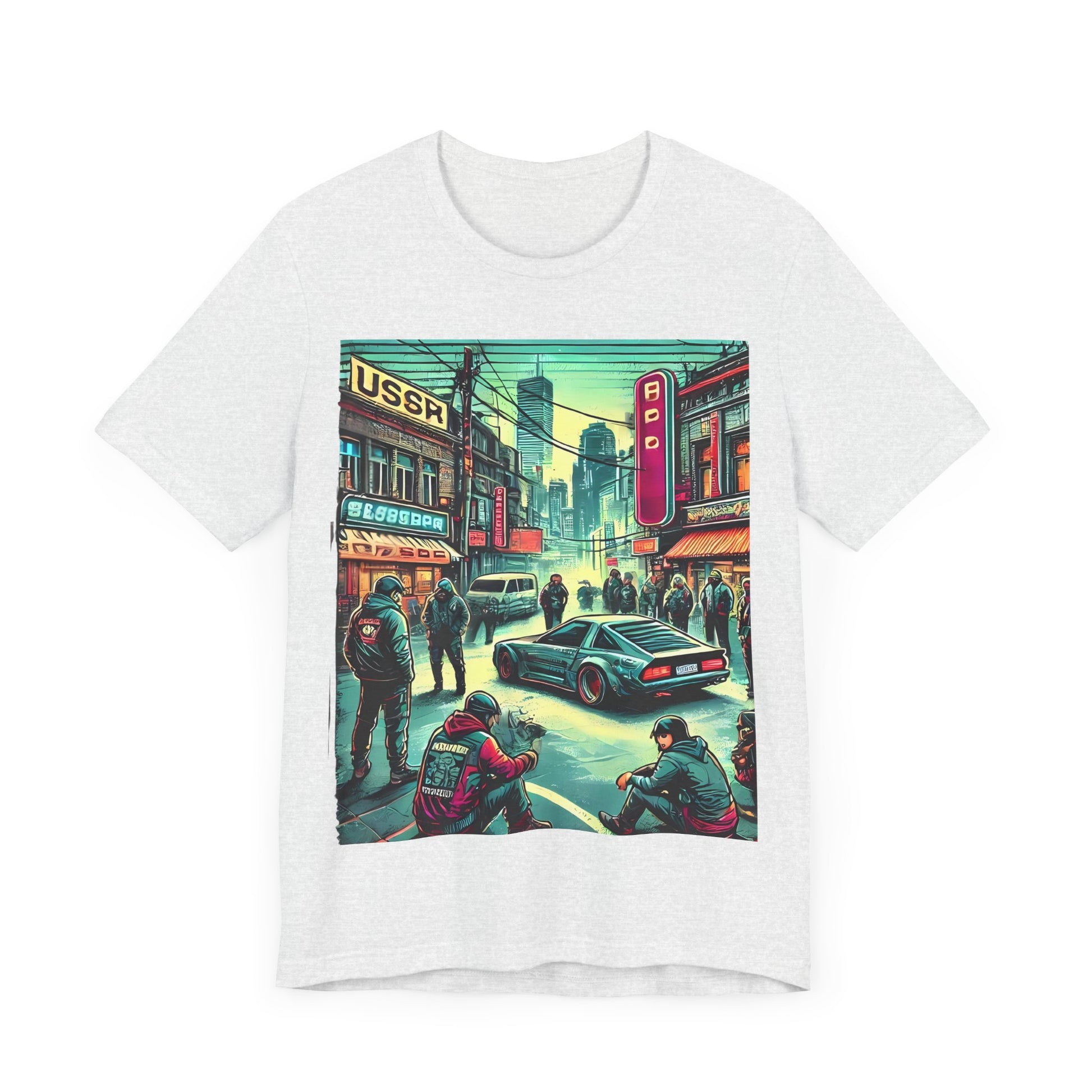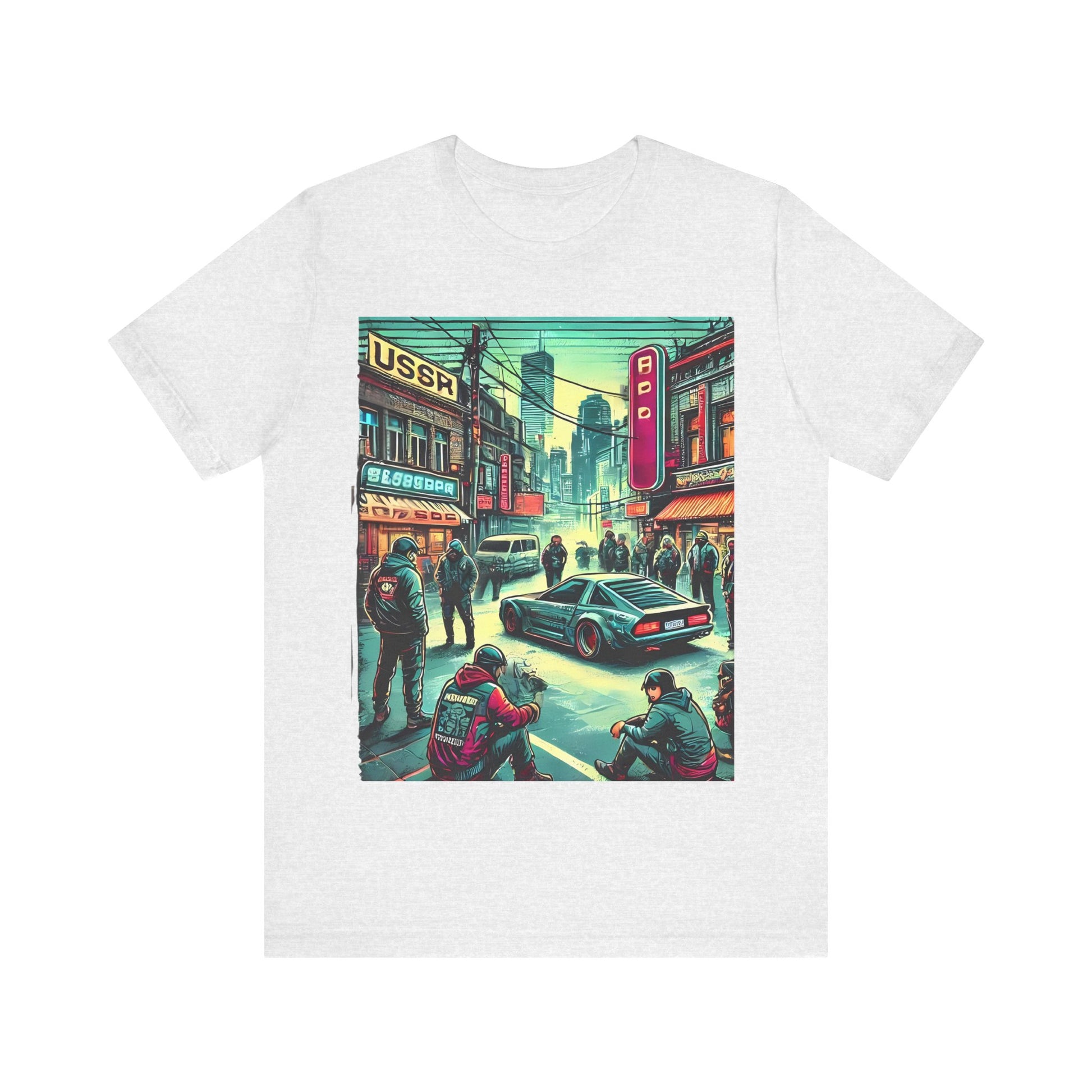 Crafted from soft, breathable fabric, this piece doesn't just speak to your unique style but also ensures comfort and durability. The design comes alive with characters in streetwear, neon-lit futuristic cars, and looming Soviet-era buildings—all rendered in dark, gritty tones that are ignited with bright neon highlights.