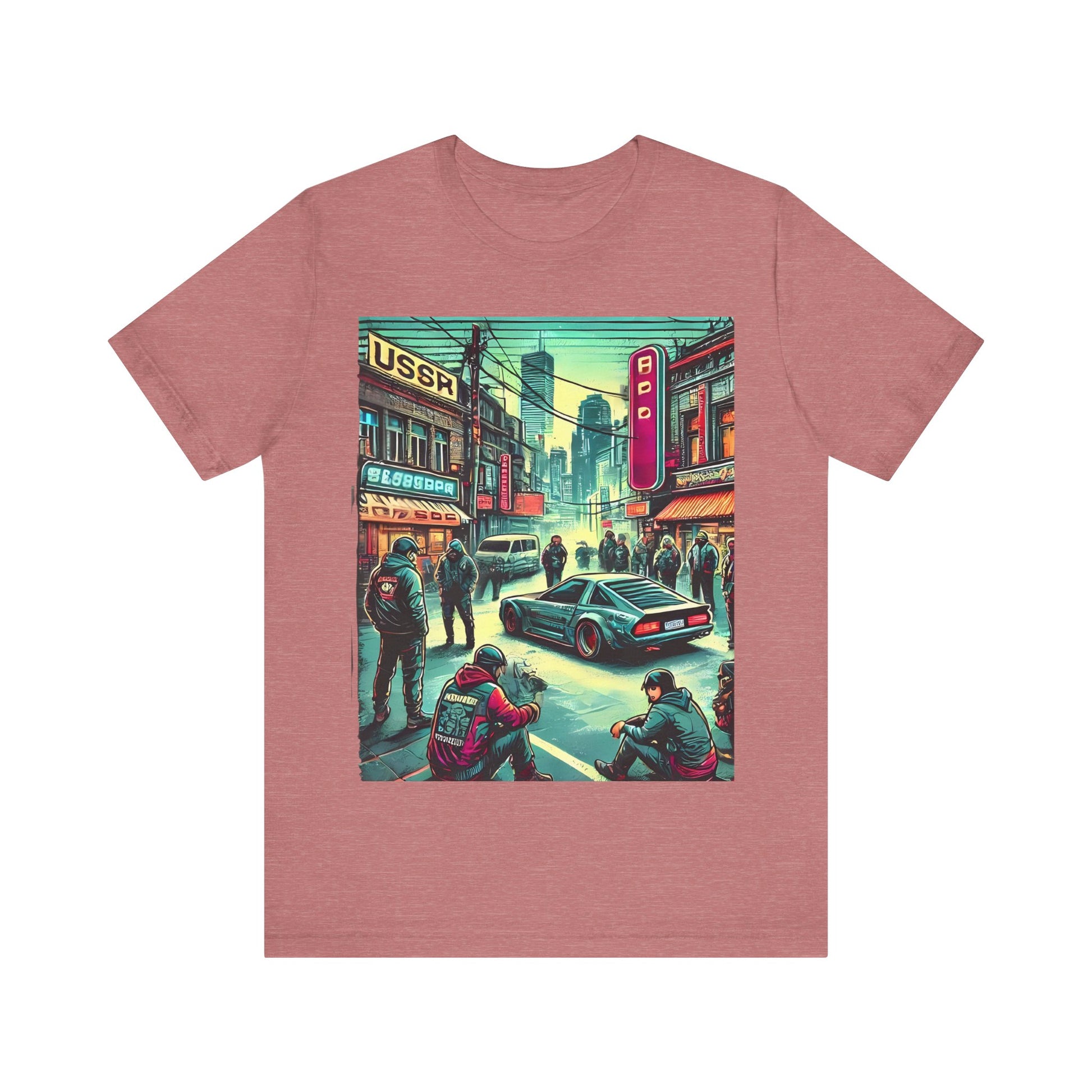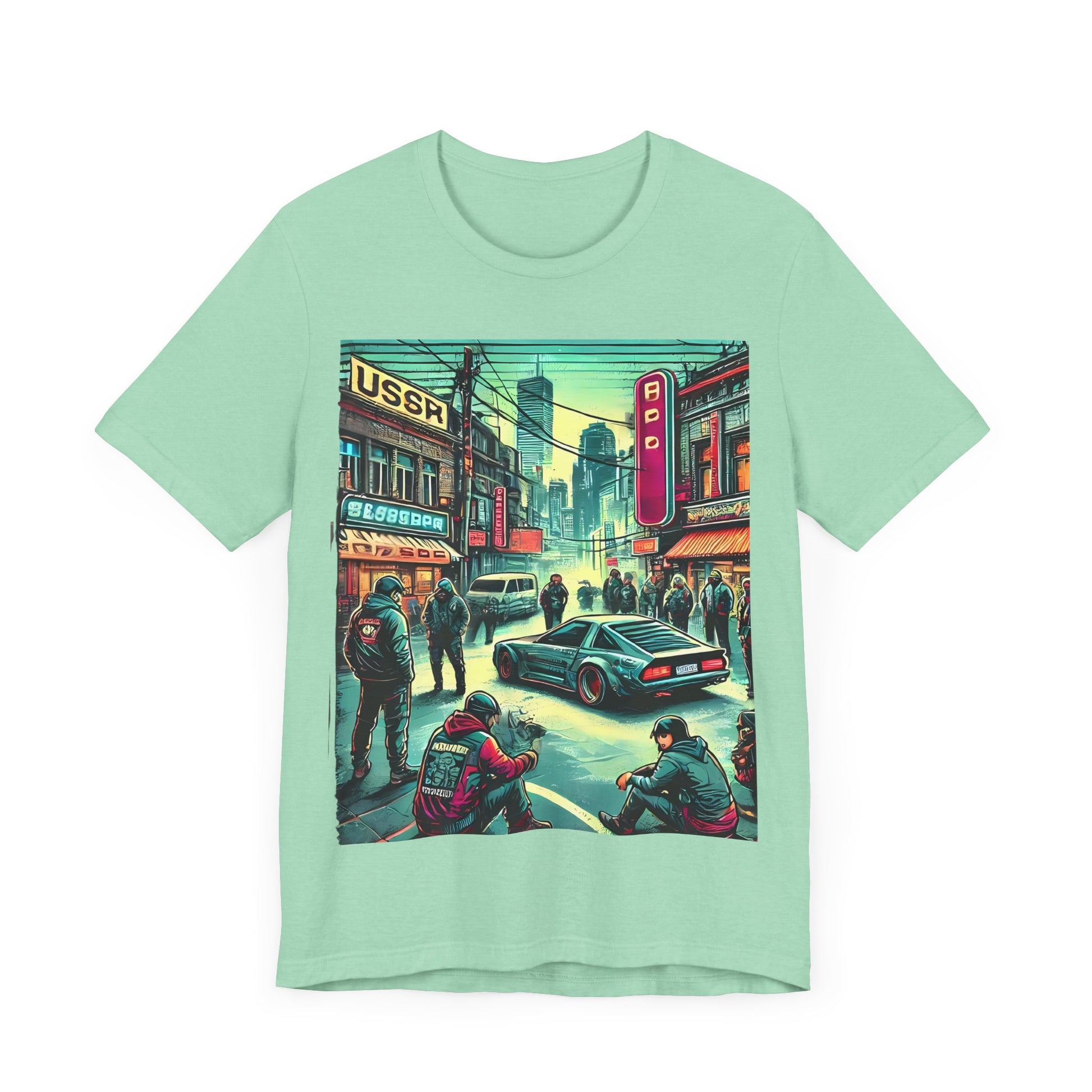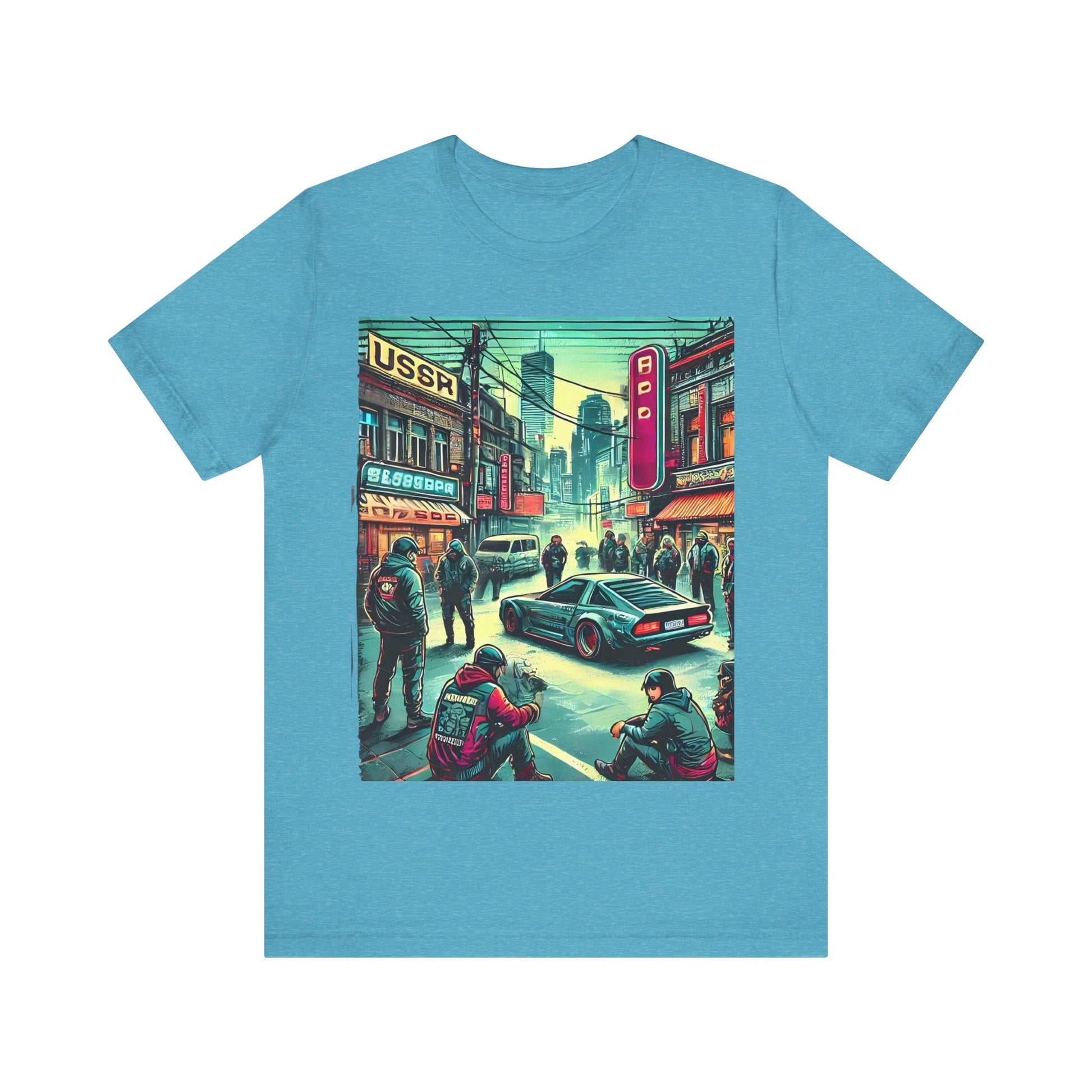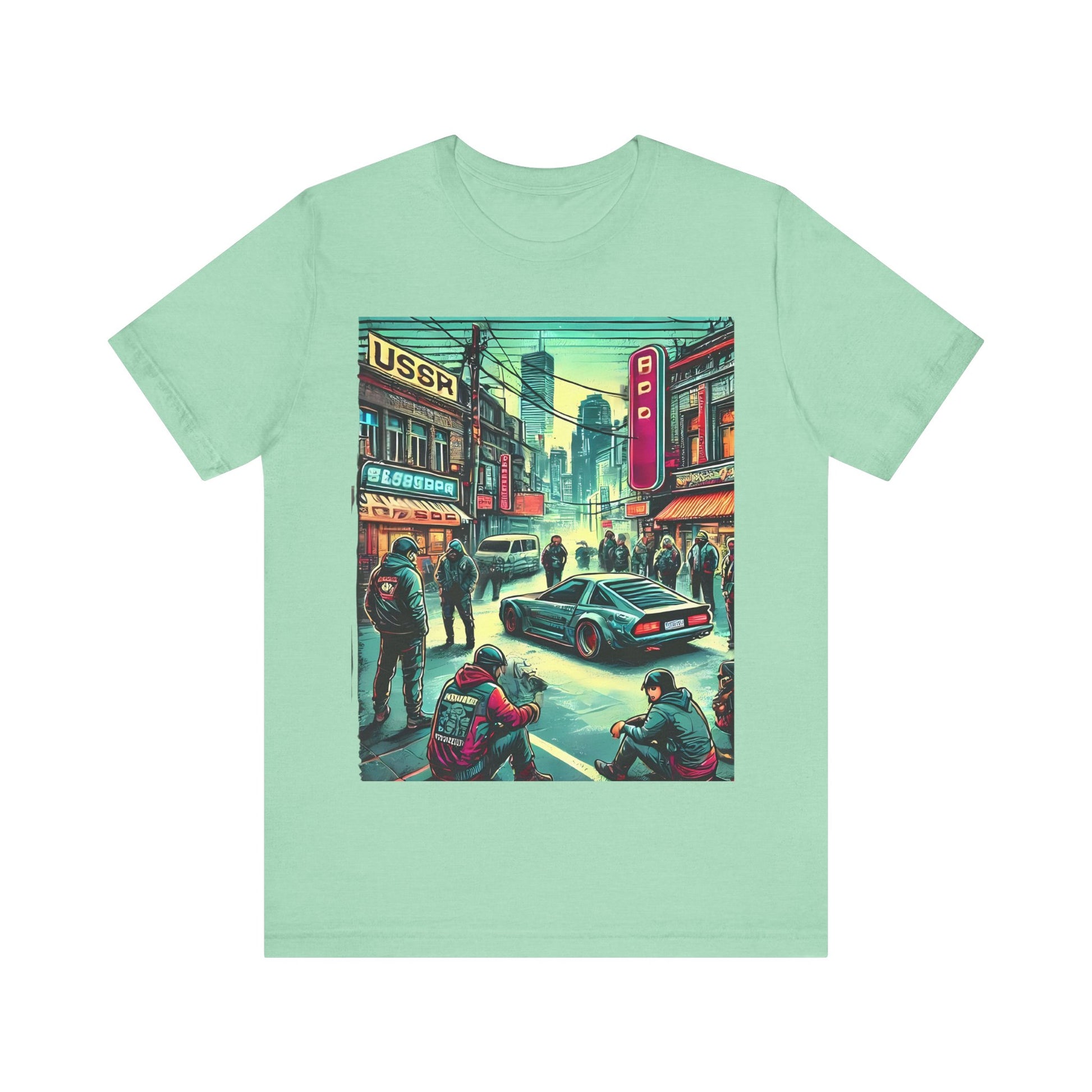 Crafted from soft, breathable fabric, this piece doesn't just speak to your unique style but also ensures comfort and durability. The design comes alive with characters in streetwear, neon-lit futuristic cars, and looming Soviet-era buildings—all rendered in dark, gritty tones that are ignited with bright neon highlights.