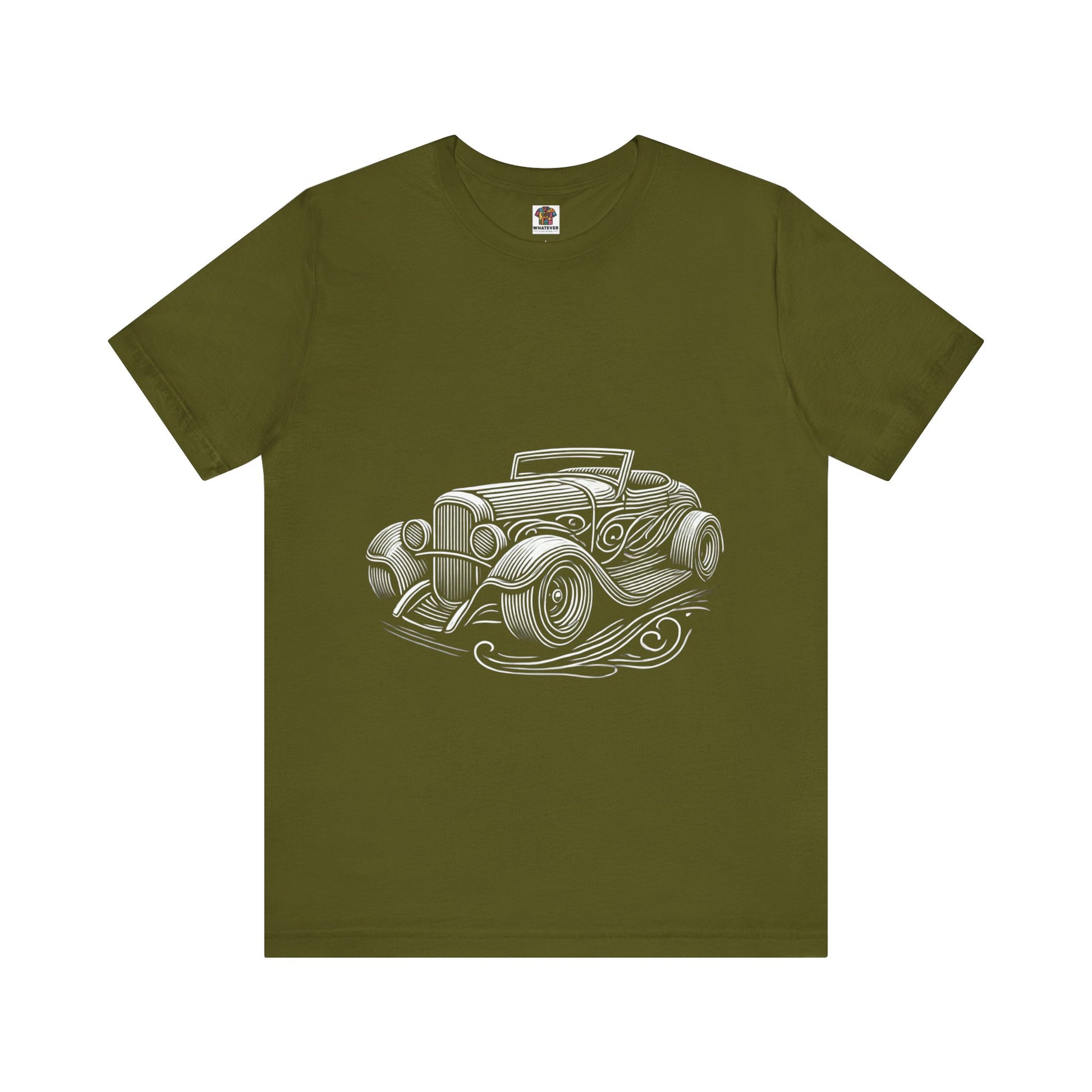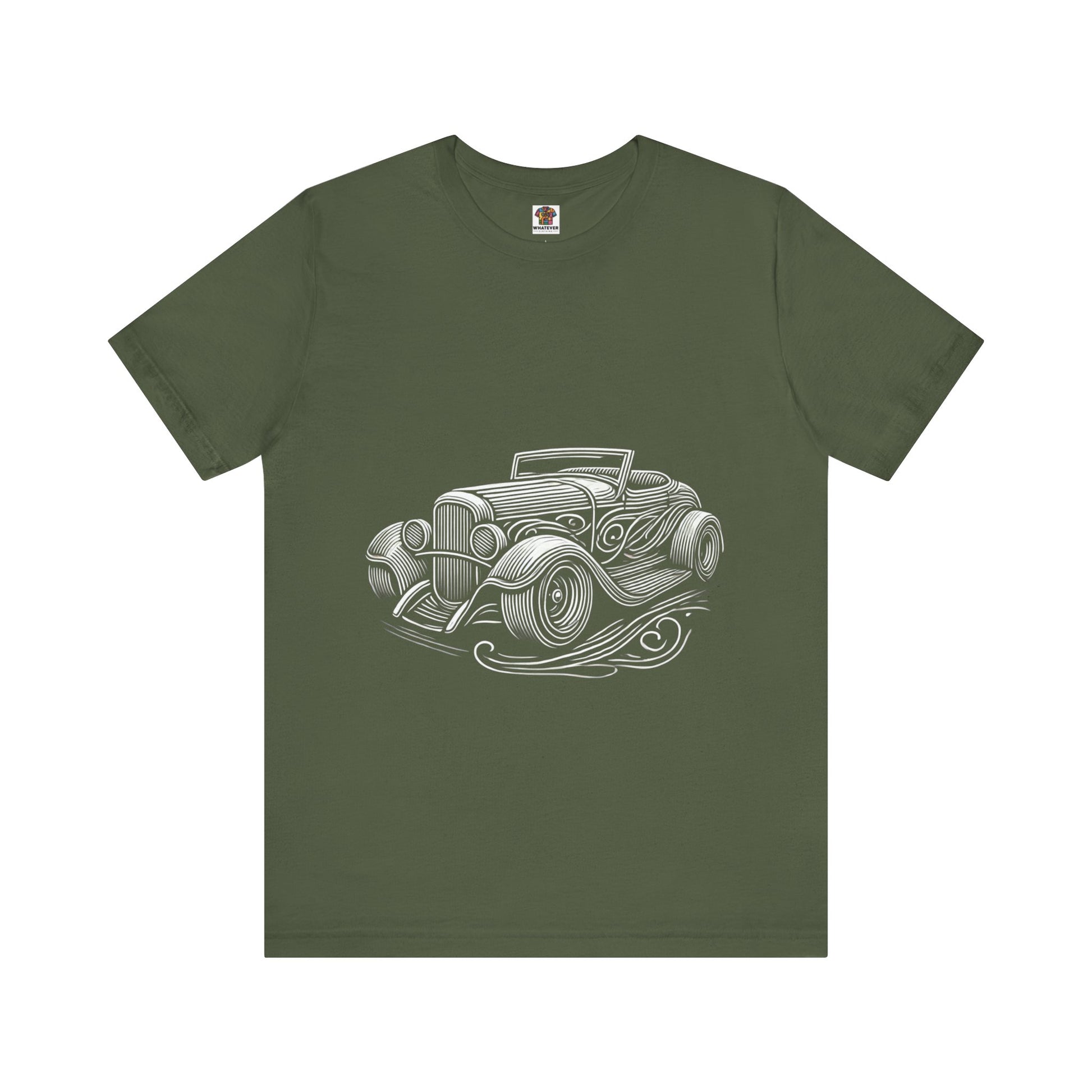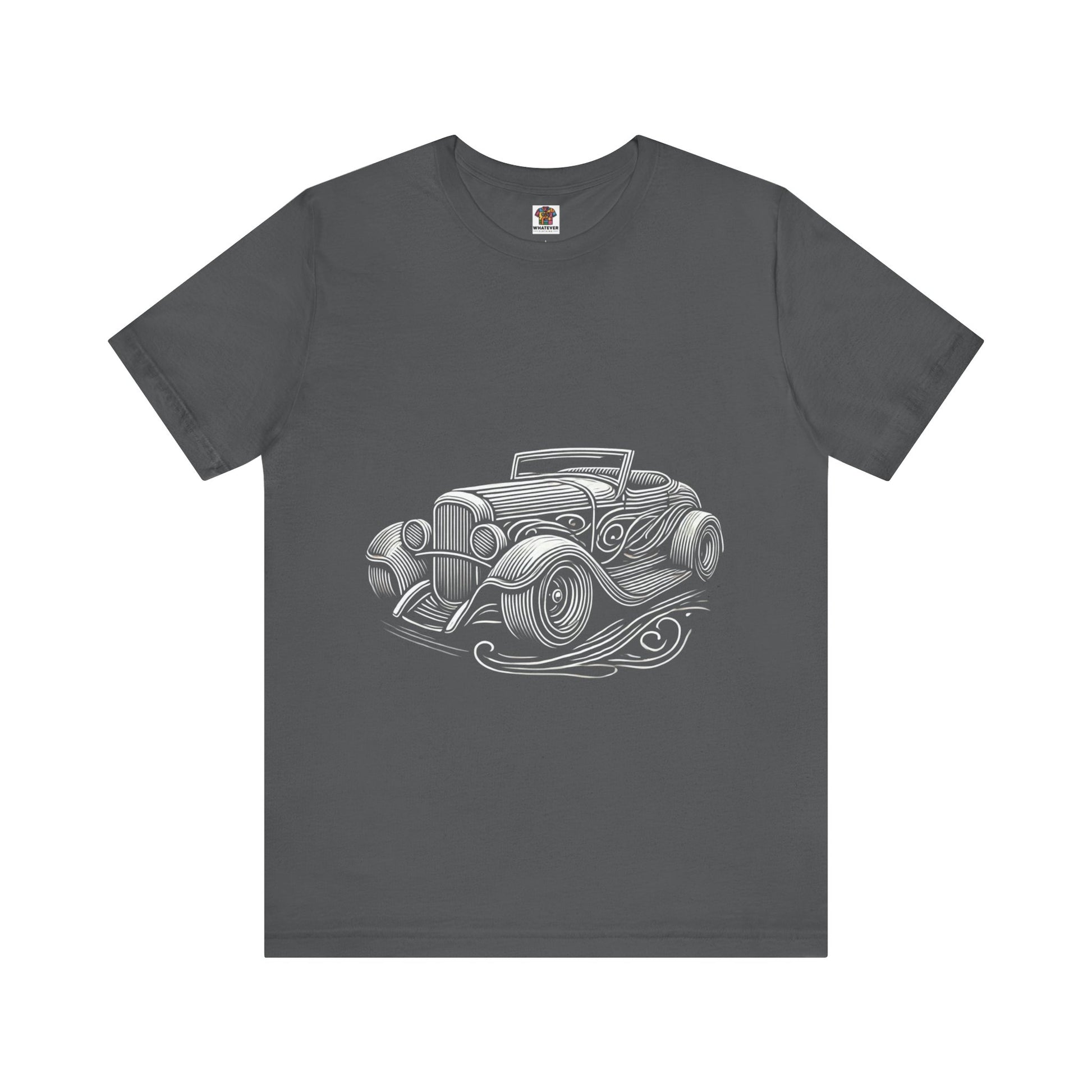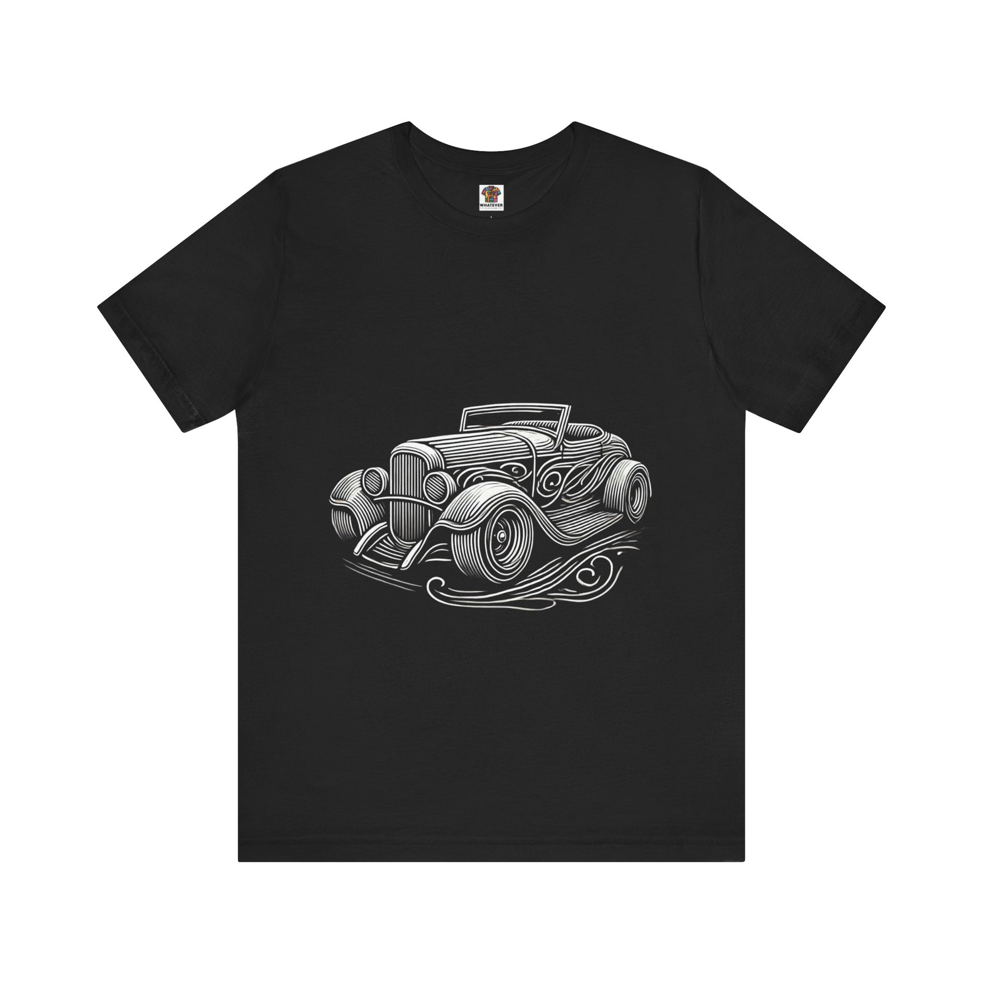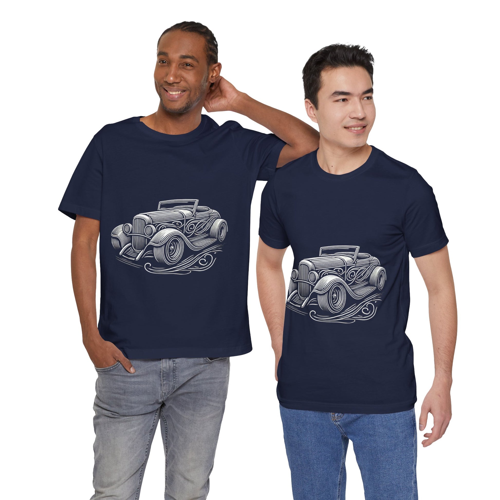 A sleek, minimalist vintage car in white linework against a black background, with intricate detailing, perfect for retro or urban-themed prints.