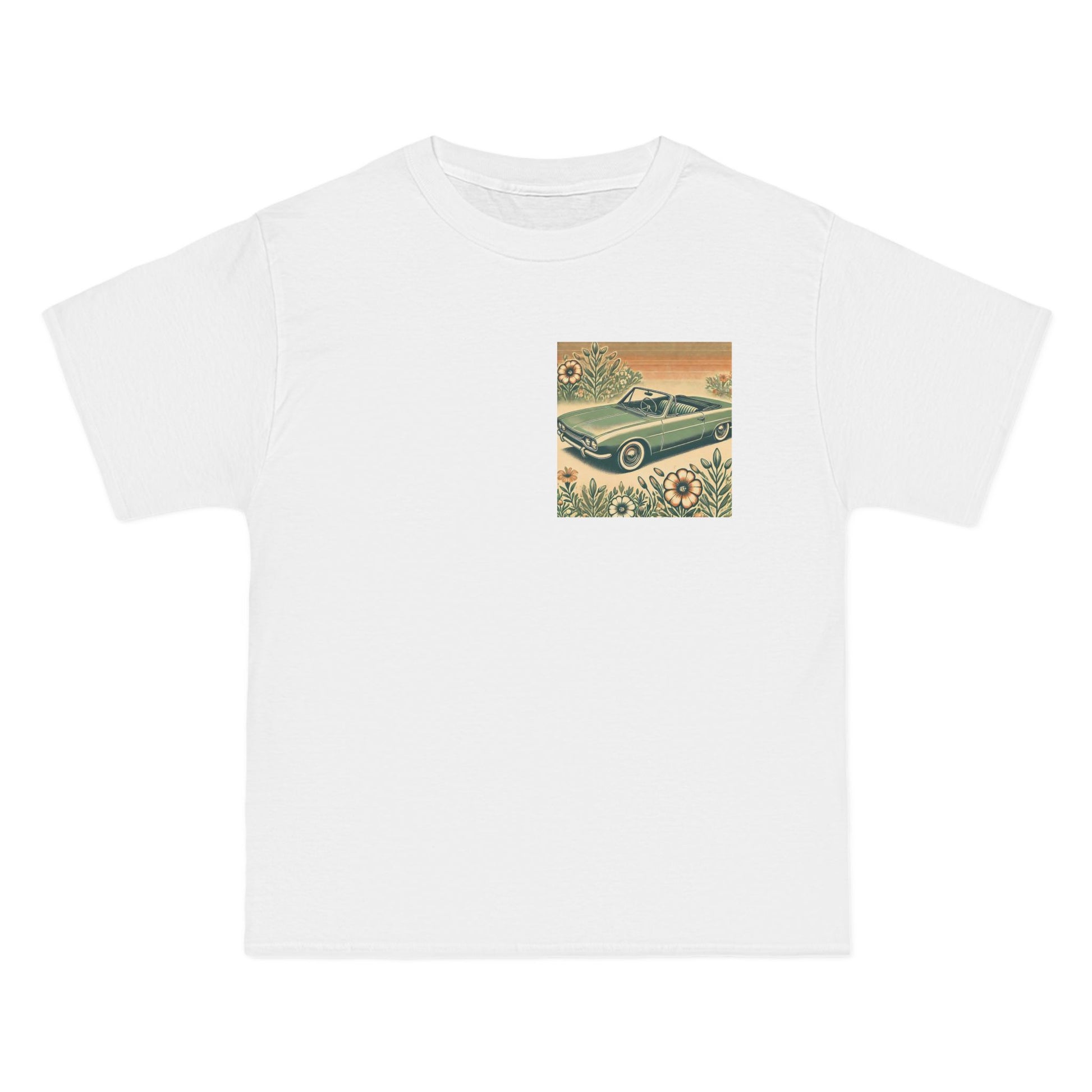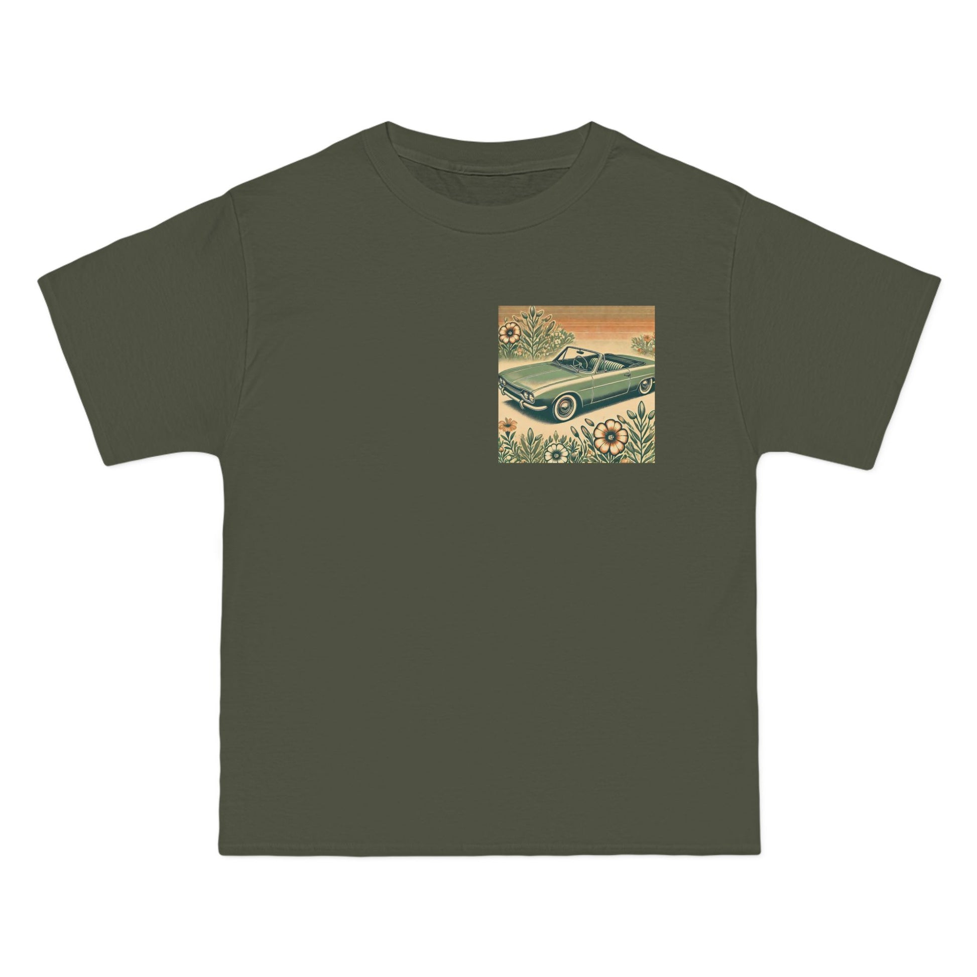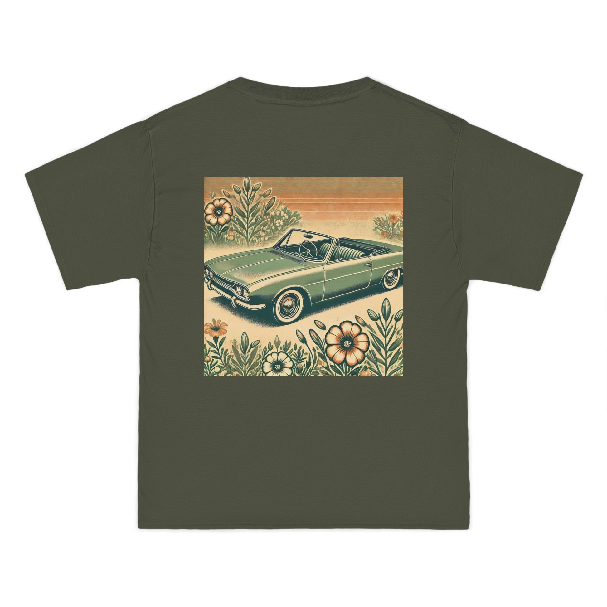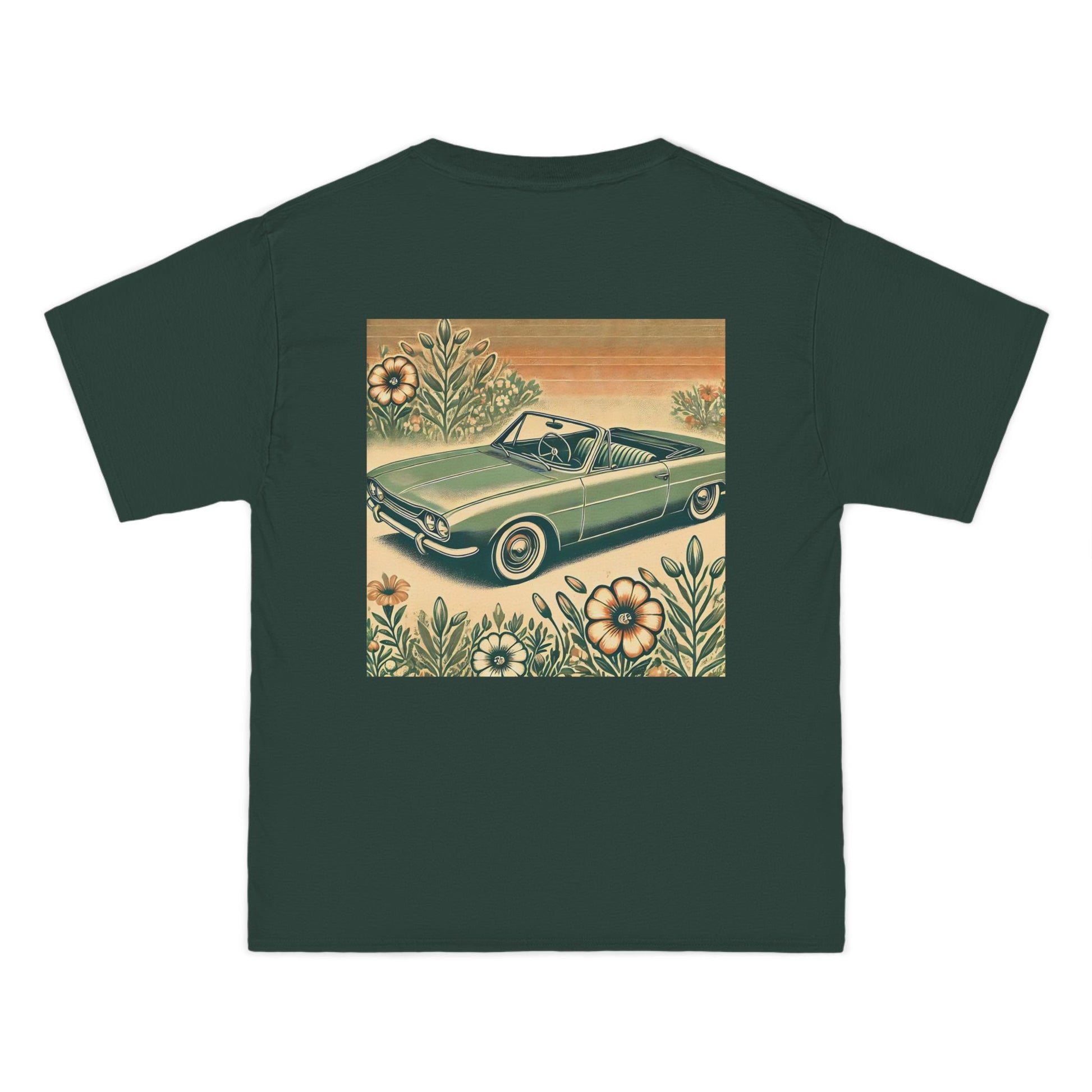 Get ready to "Wear Your World" with our Vintage Convertible: Floral Sepia tee! This design, a nostalgic nod to the 70s, paints a beautiful picture of a soft green convertible, accented with muted orange tones. Small floral details dance around the vintage car, whisking you back to a simpler time.