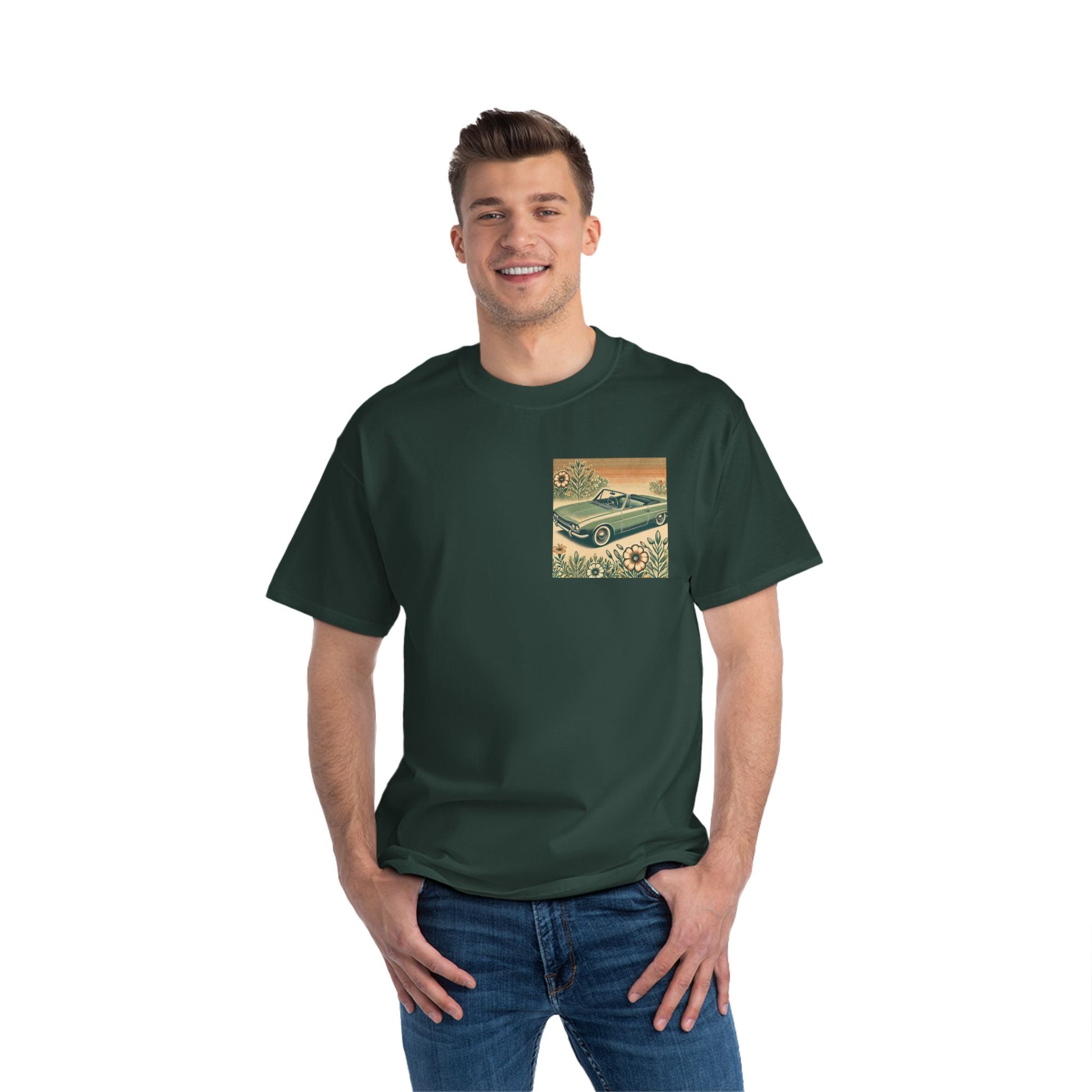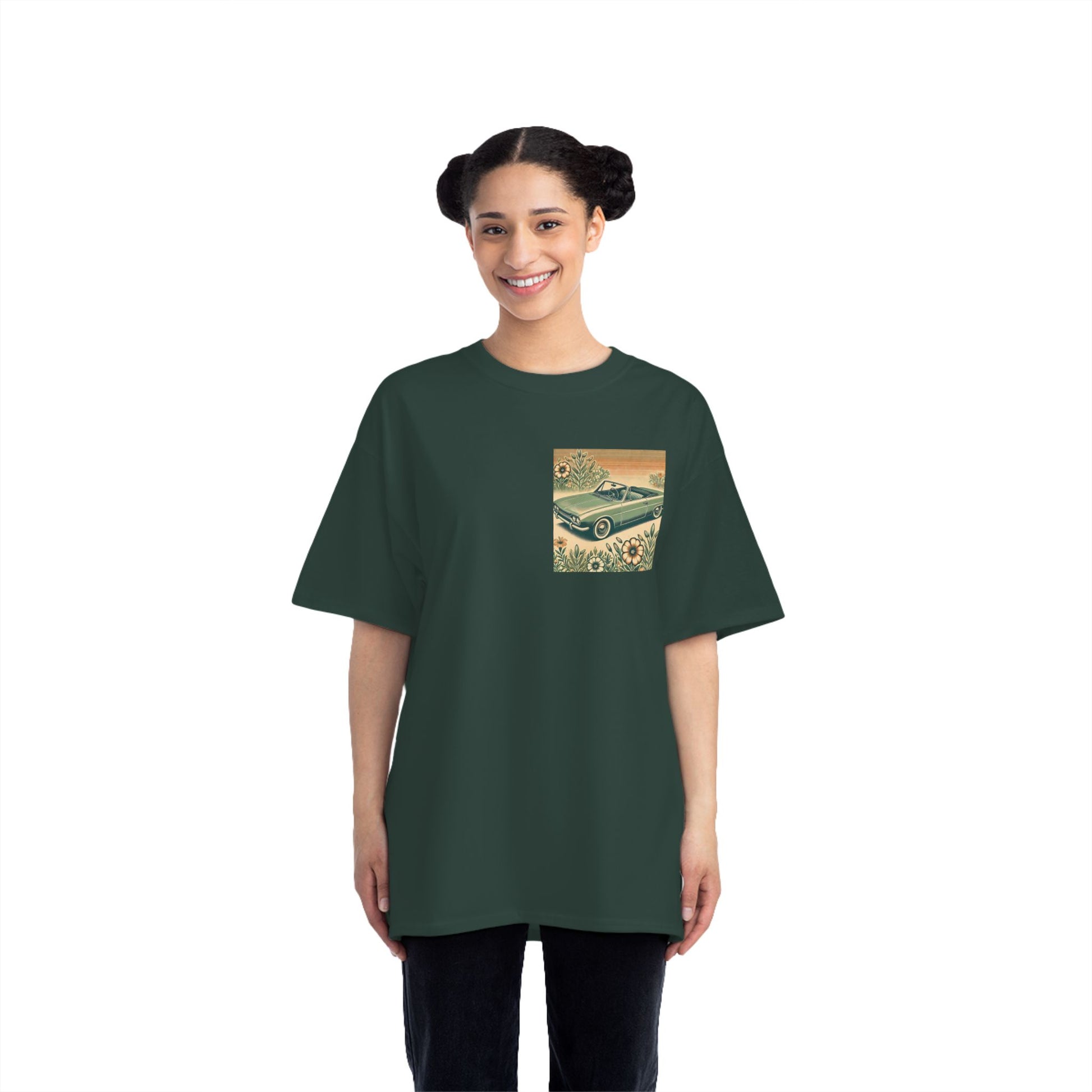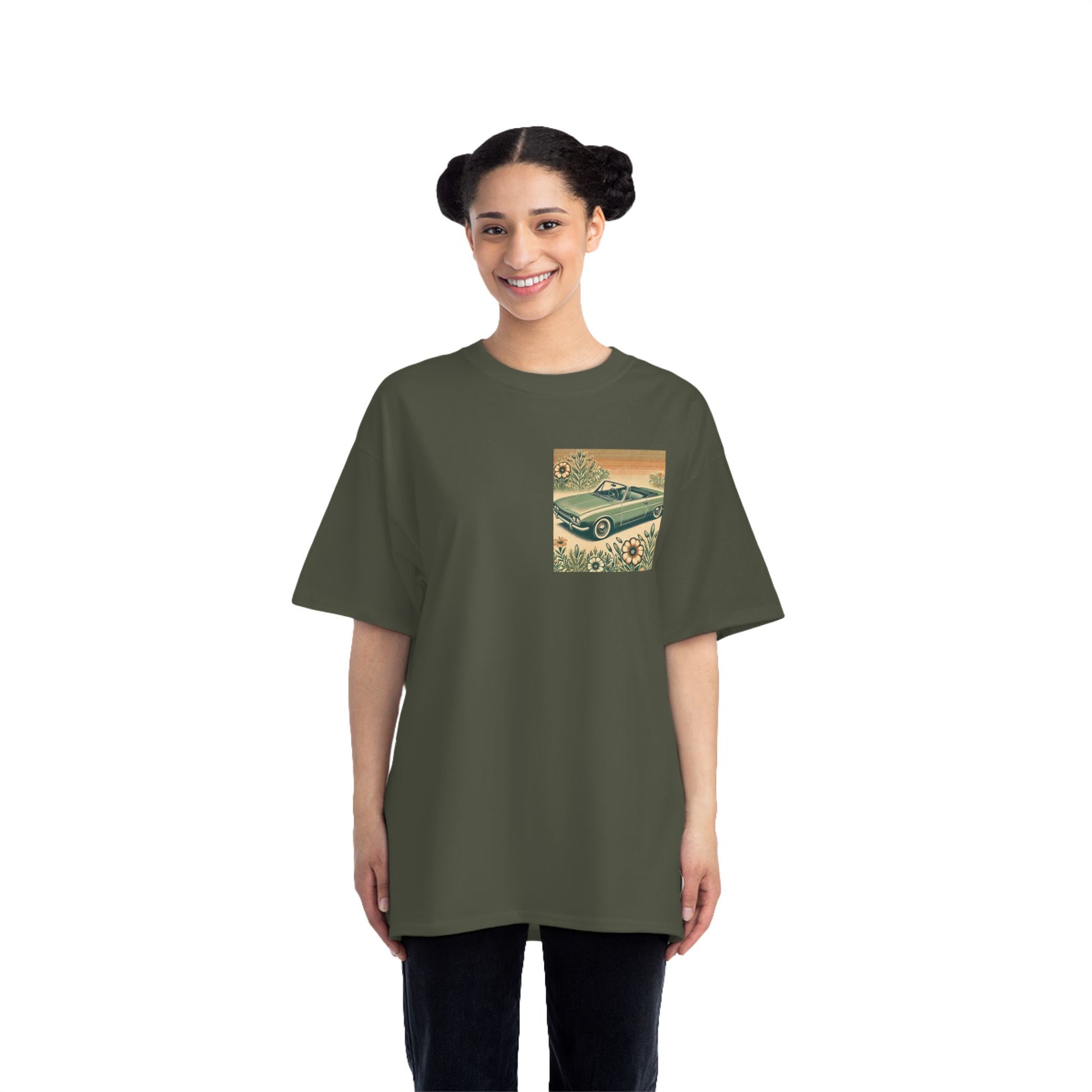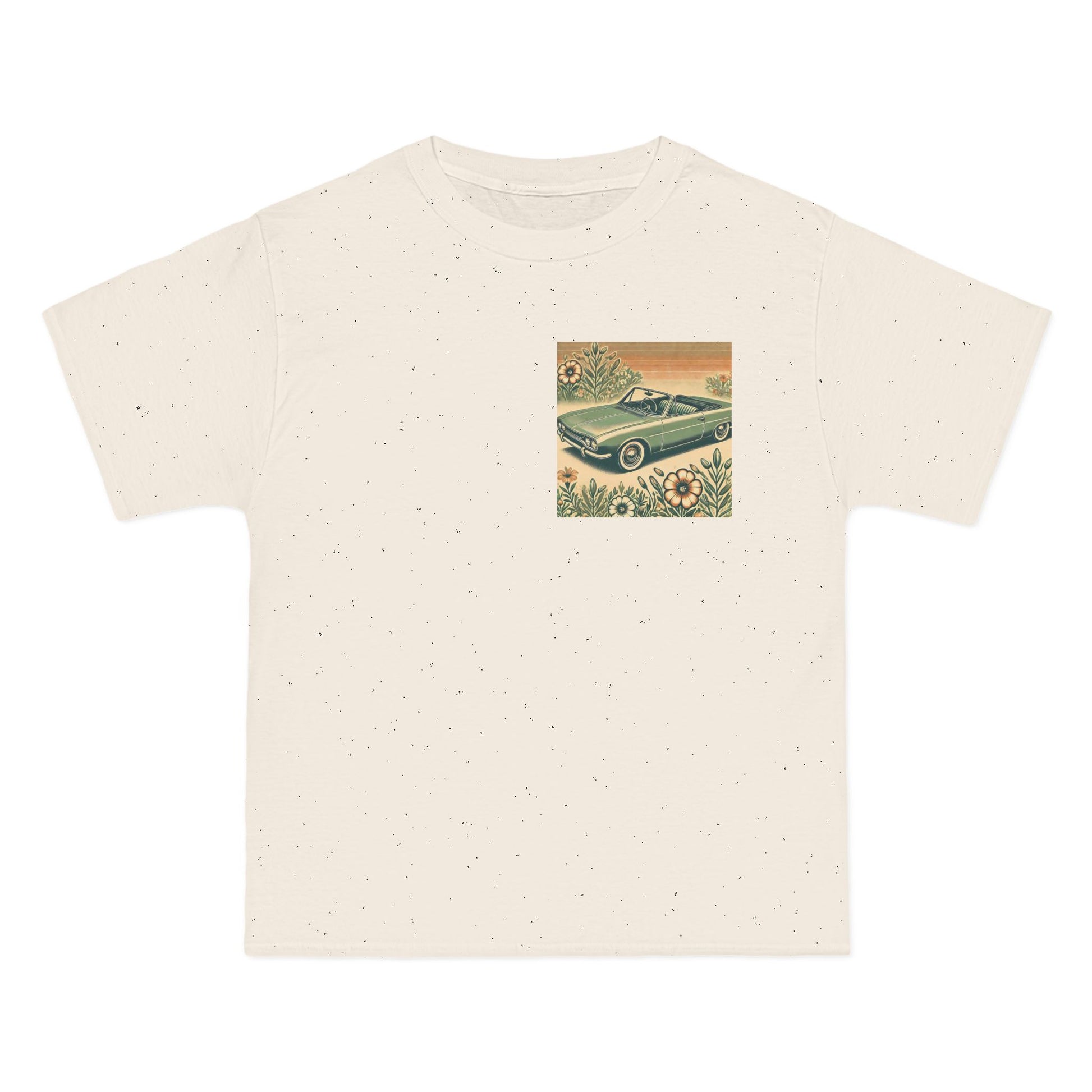 Get ready to "Wear Your World" with our Vintage Convertible: Floral Sepia tee! This design, a nostalgic nod to the 70s, paints a beautiful picture of a soft green convertible, accented with muted orange tones. Small floral details dance around the vintage car, whisking you back to a simpler time.