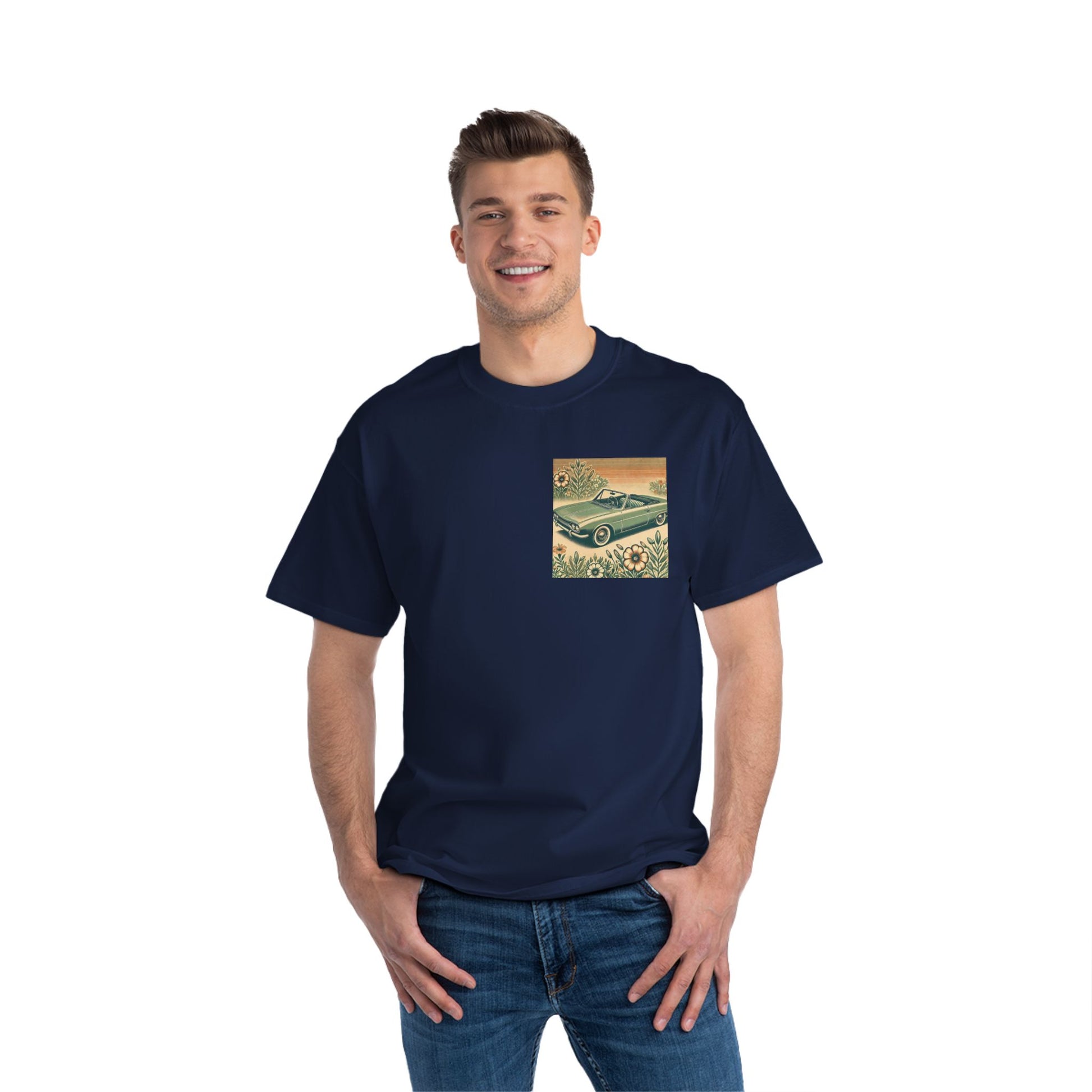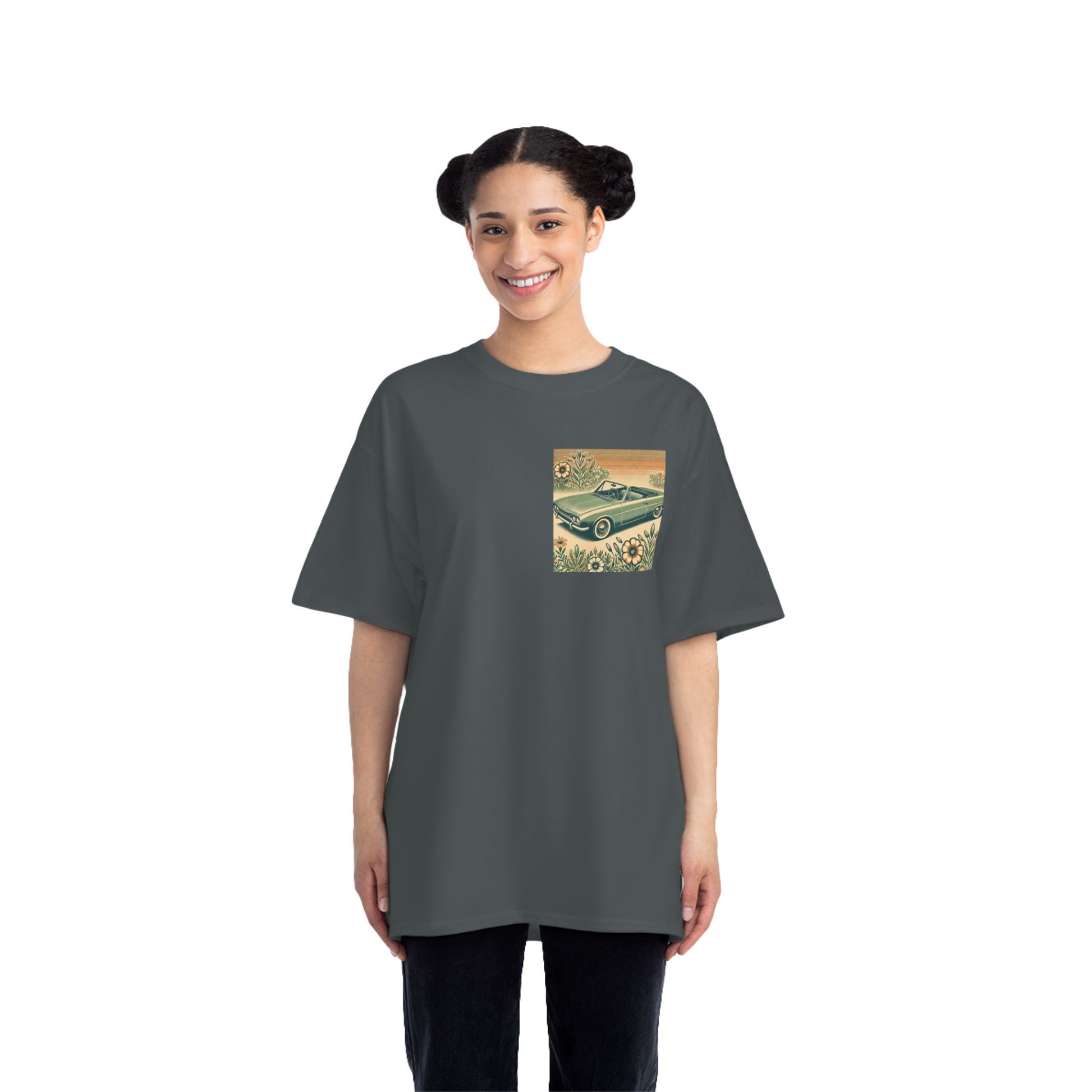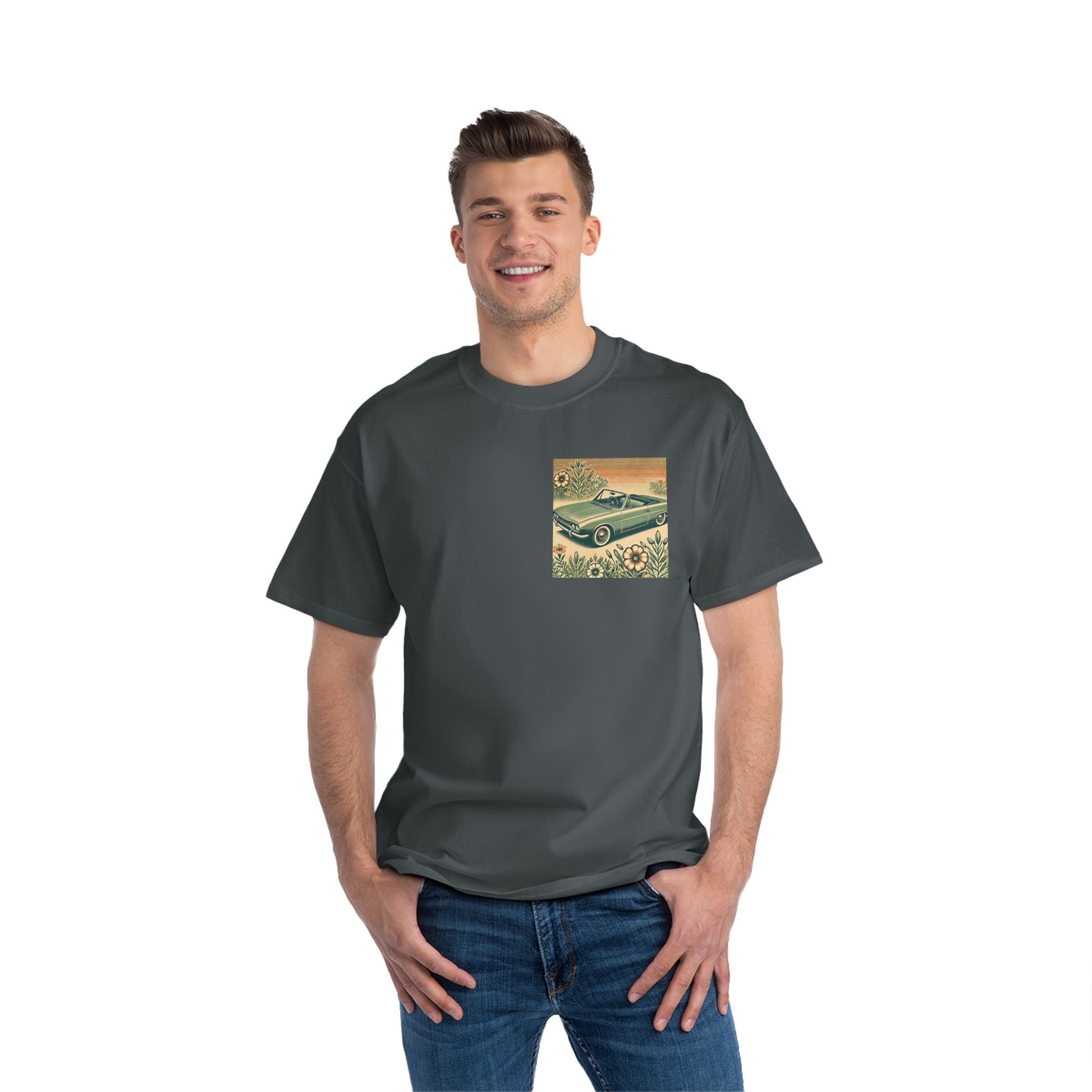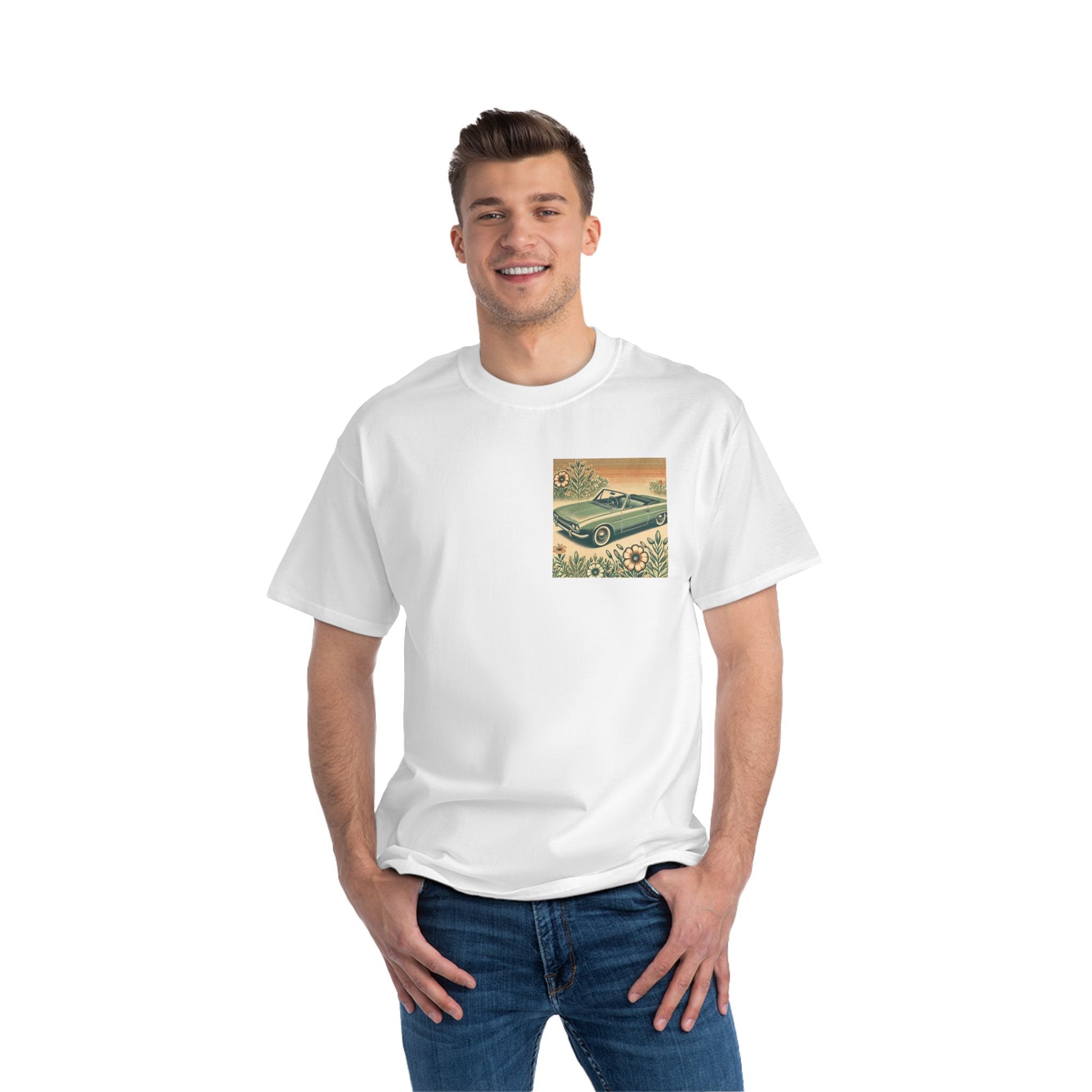 Get ready to "Wear Your World" with our Vintage Convertible: Floral Sepia tee! This design, a nostalgic nod to the 70s, paints a beautiful picture of a soft green convertible, accented with muted orange tones. Small floral details dance around the vintage car, whisking you back to a simpler time.