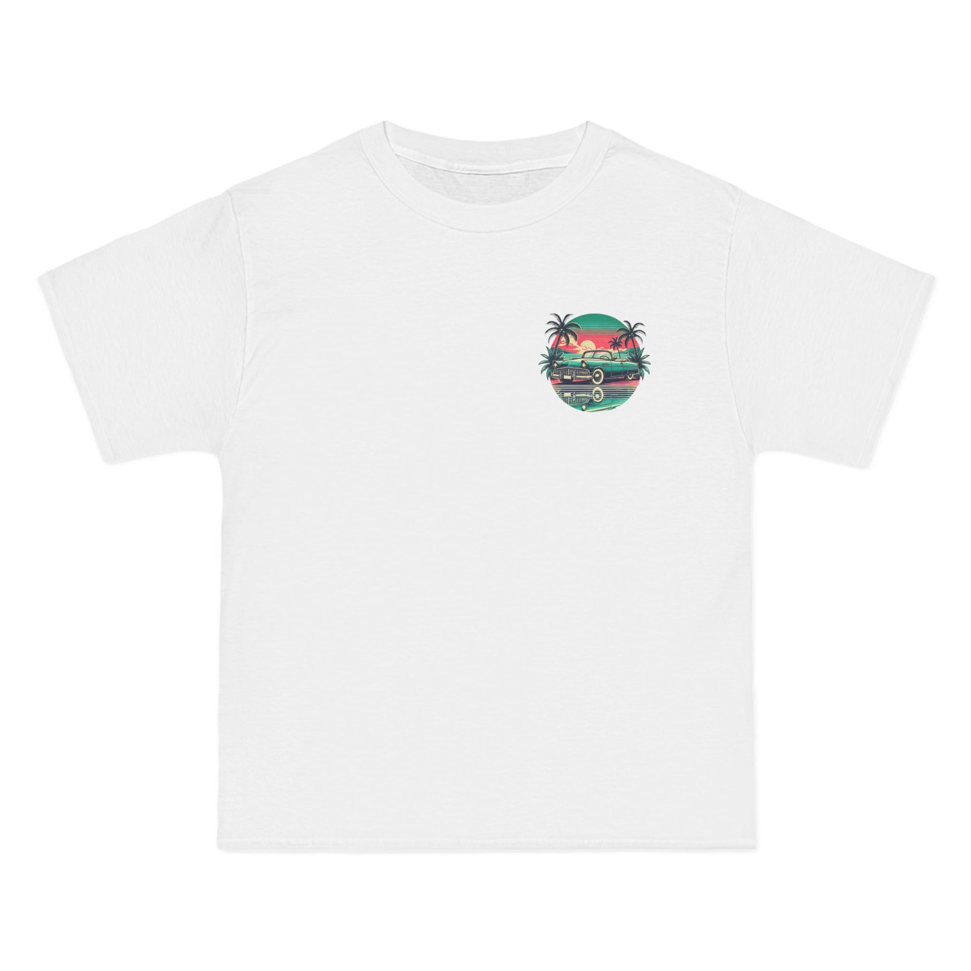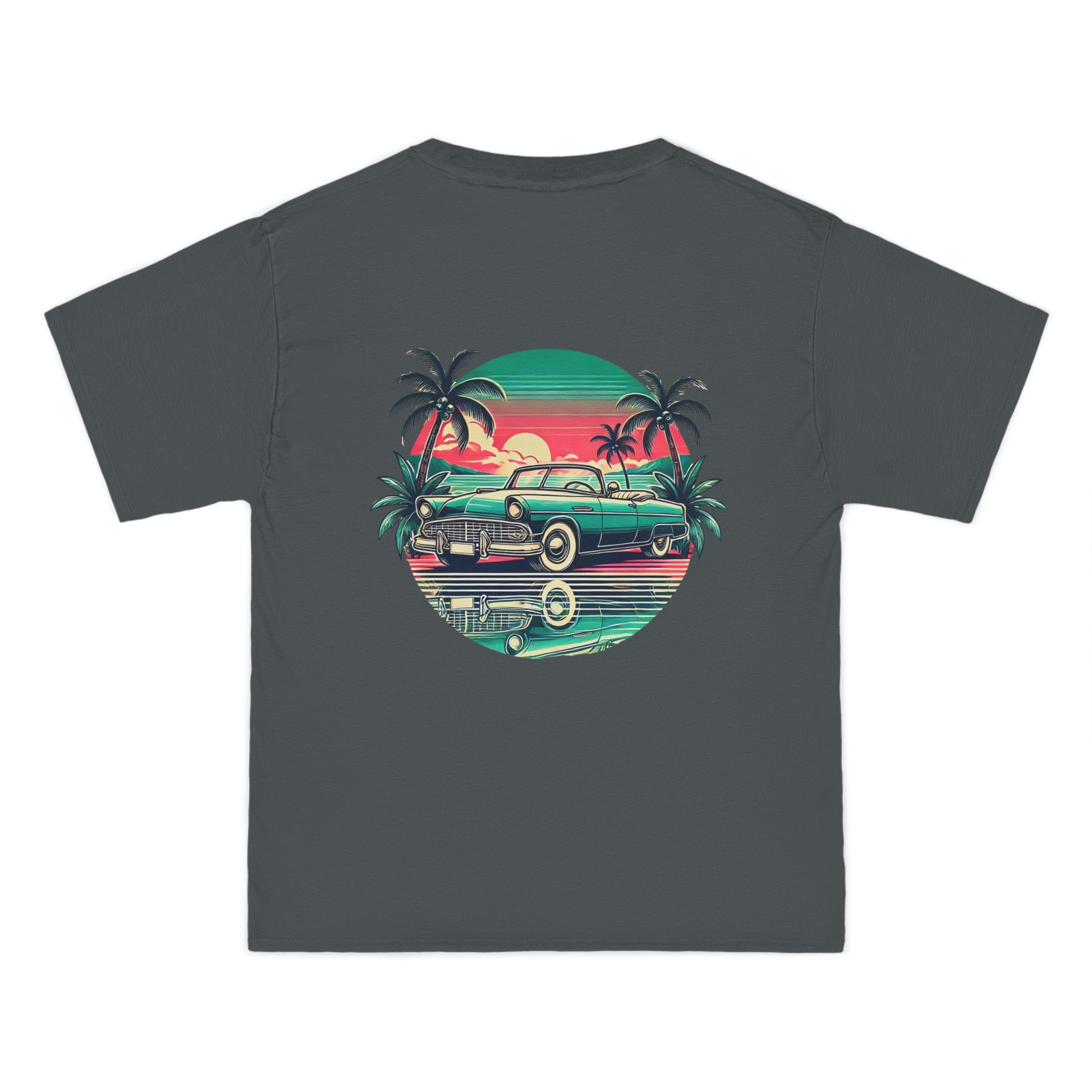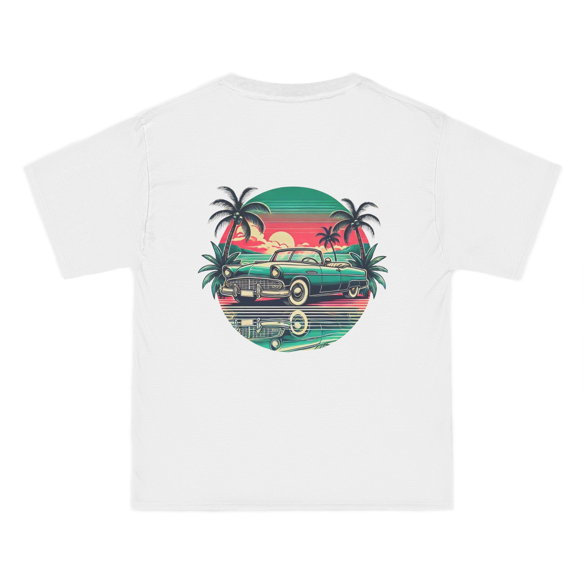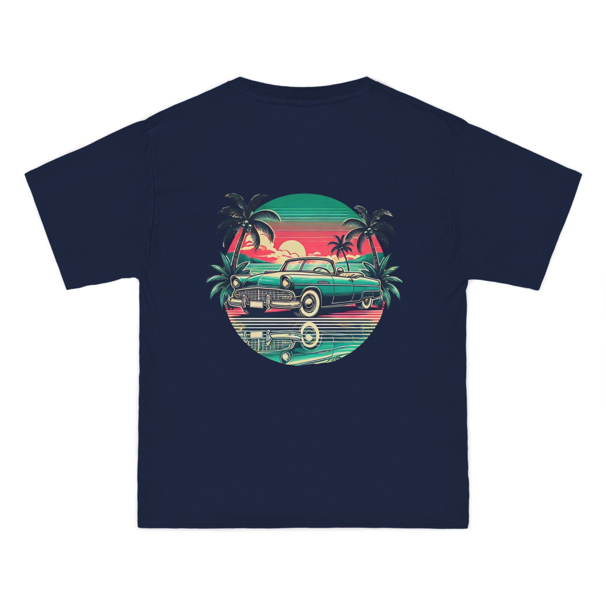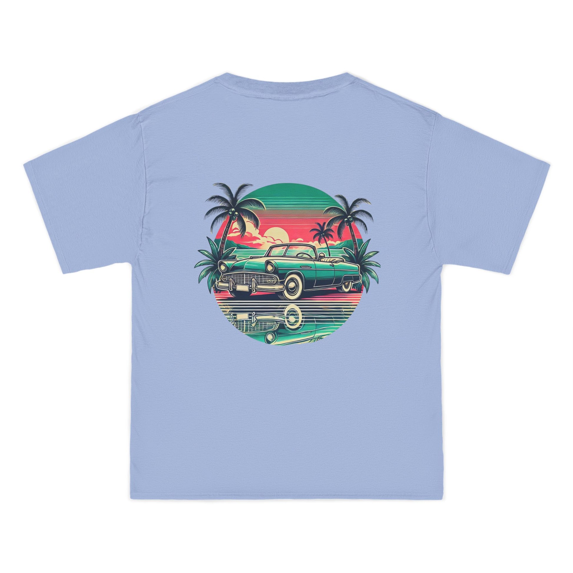 Crafted from the softest cotton mix, the tee is as comfortable as a balmy, coastal breeze. The AI-generated design features a stylized vintage convertible, palm trees swaying in the backdrop, all coming together to evoke the carefree spirit of a tropical getaway. It's a blast from the past, a slice of nostalgia, and a joyous celebration of the here and now.