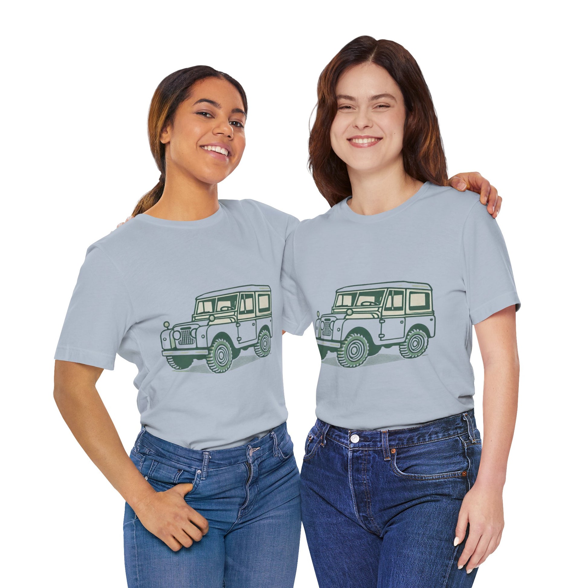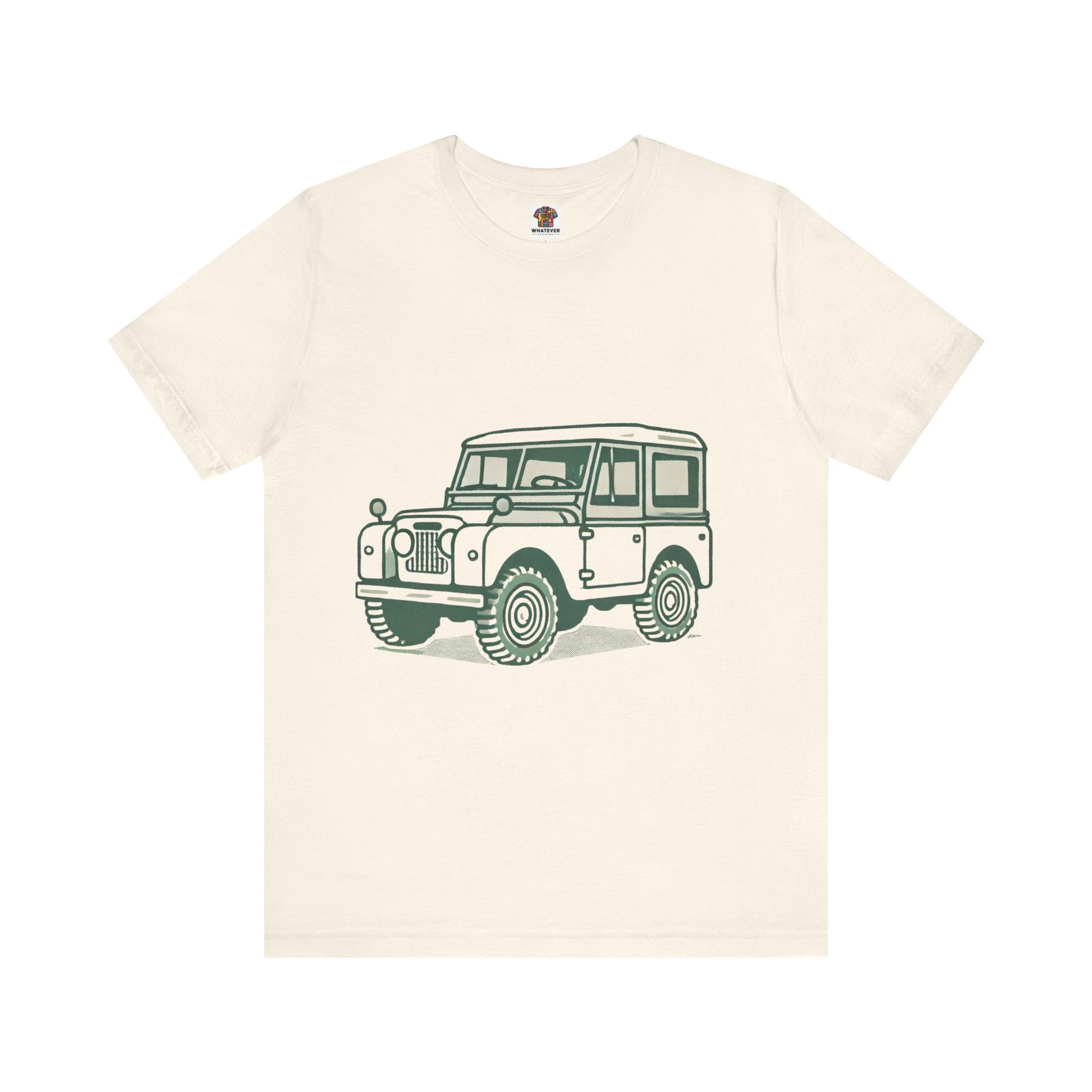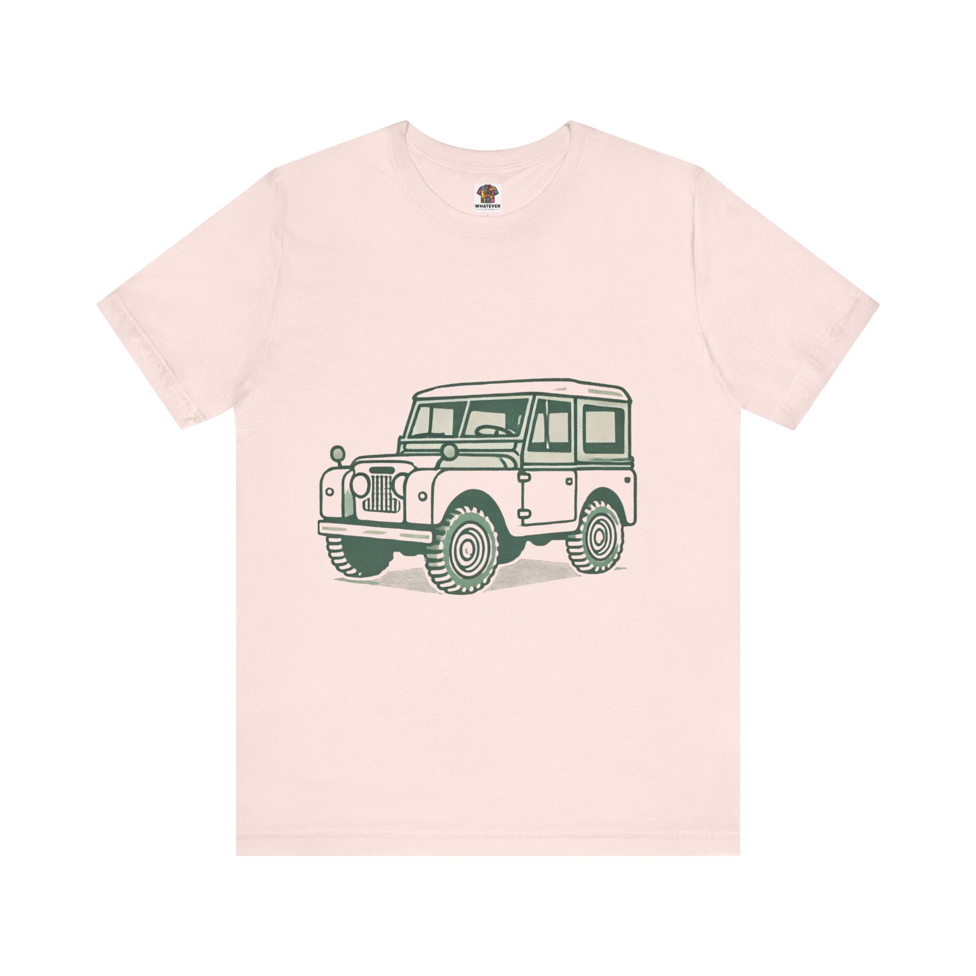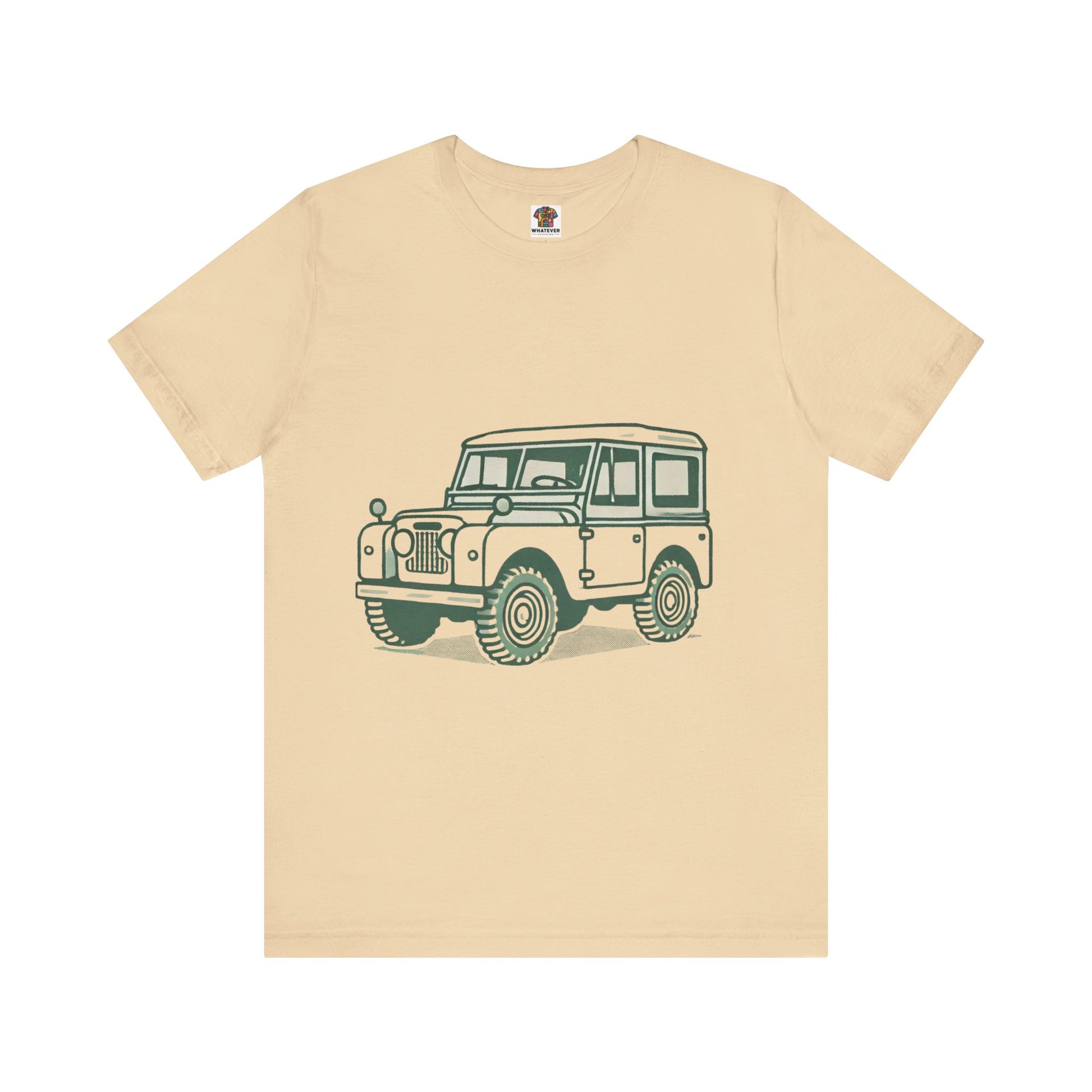 A stylized outline of a vintage off-road vehicle in pastel green and gray, evoking an outdoor, adventurous vibe.