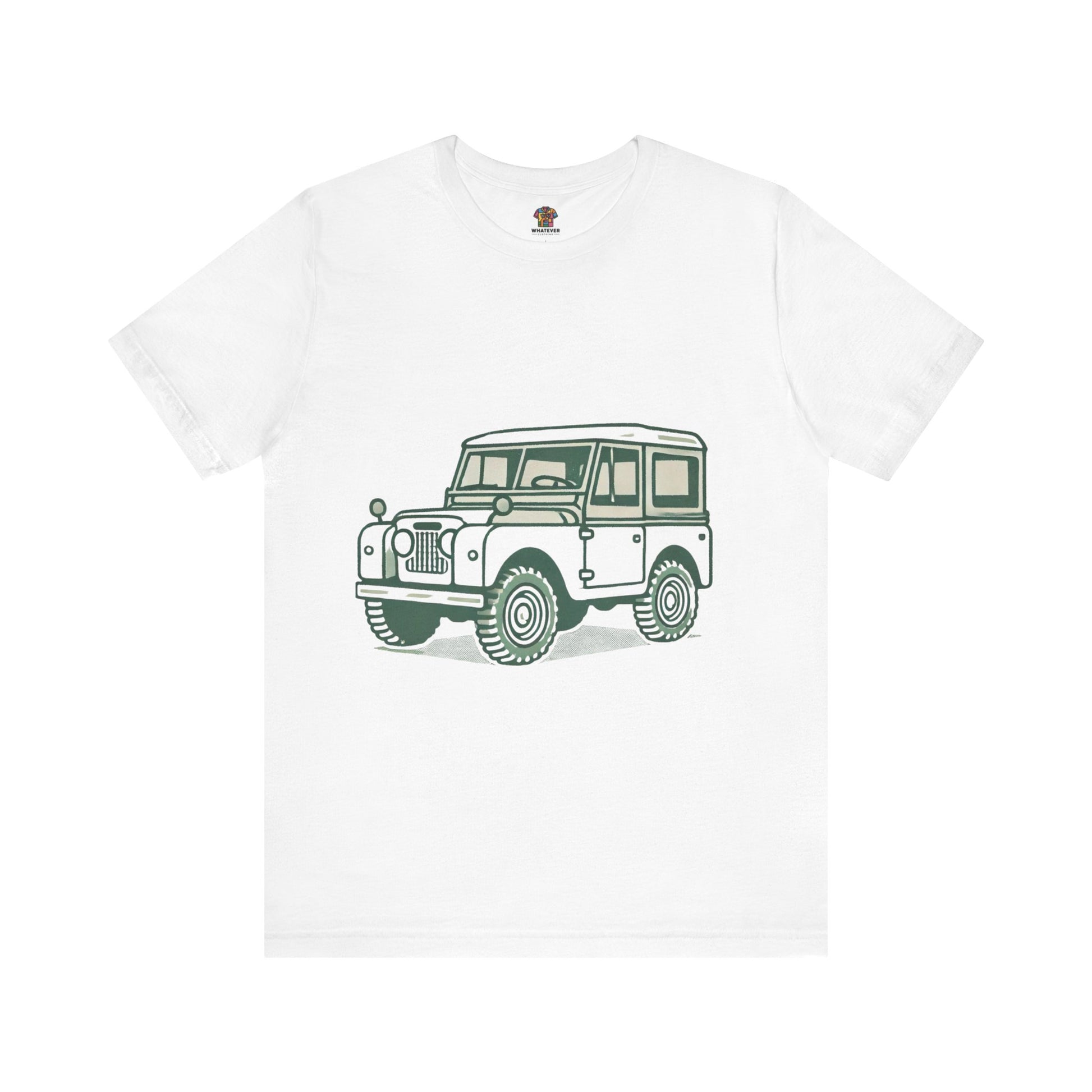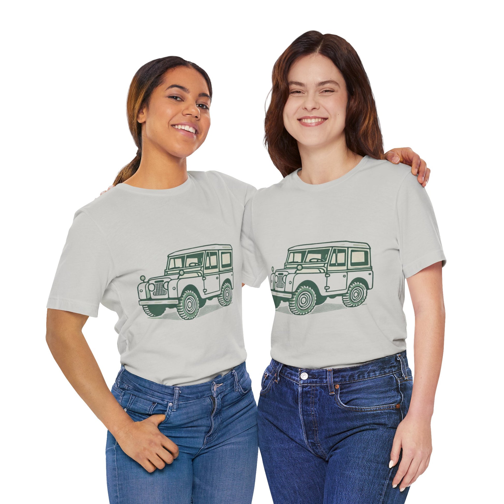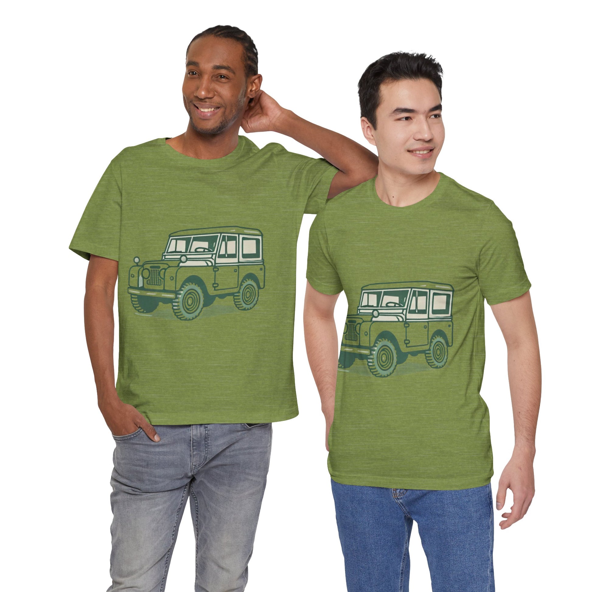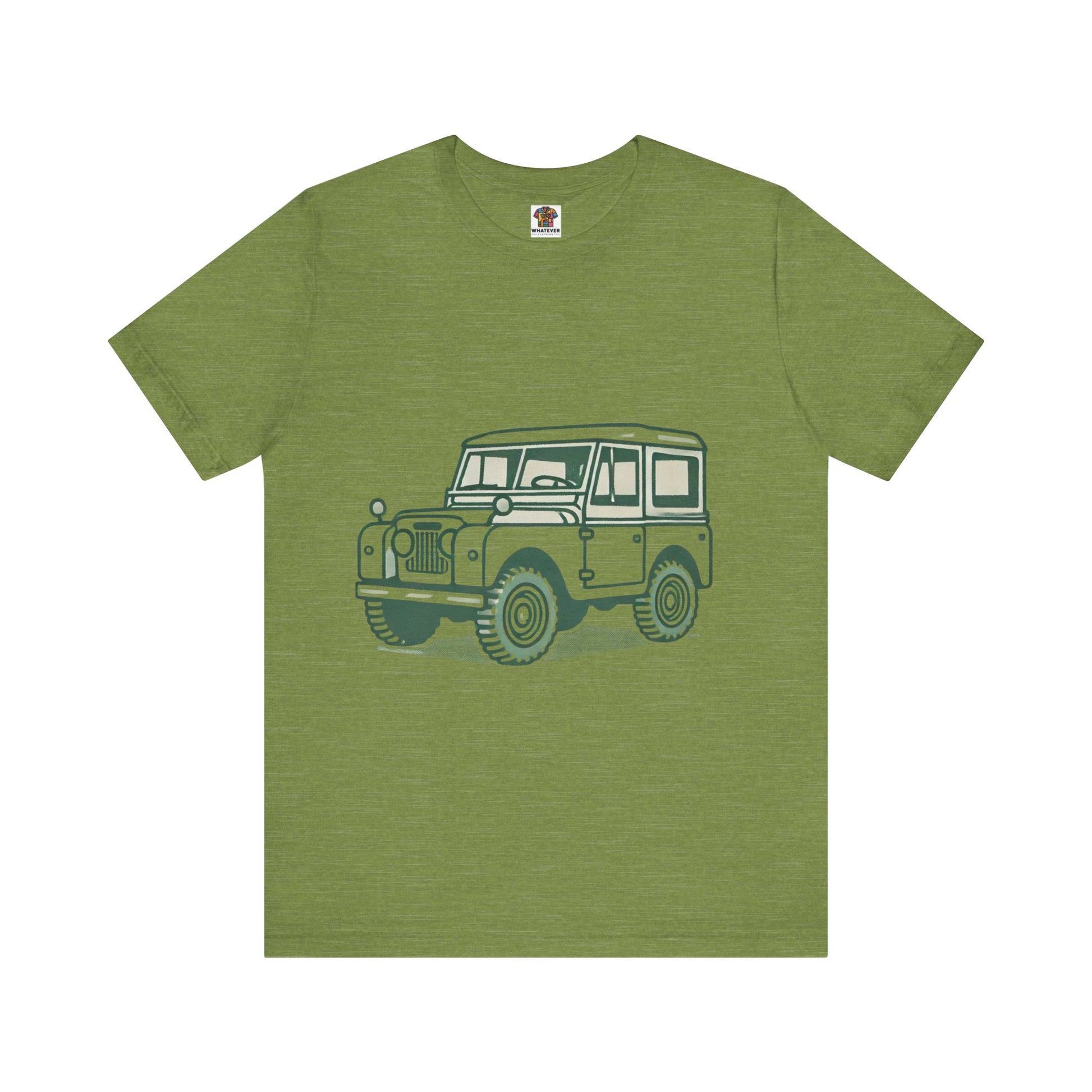 A stylized outline of a vintage off-road vehicle in pastel green and gray, evoking an outdoor, adventurous vibe.