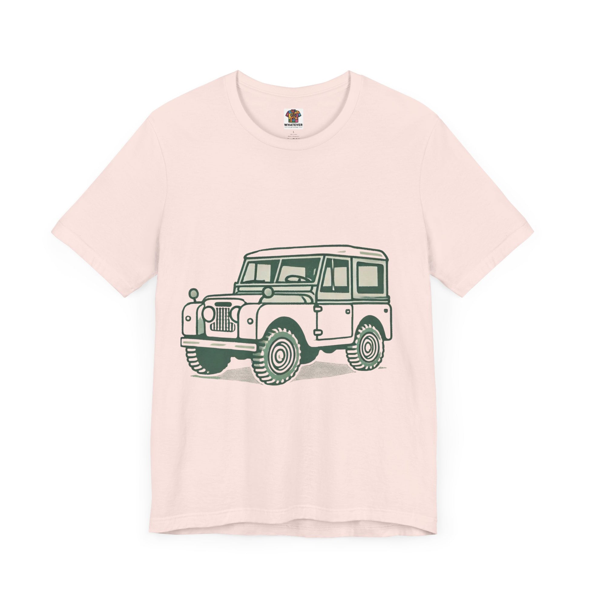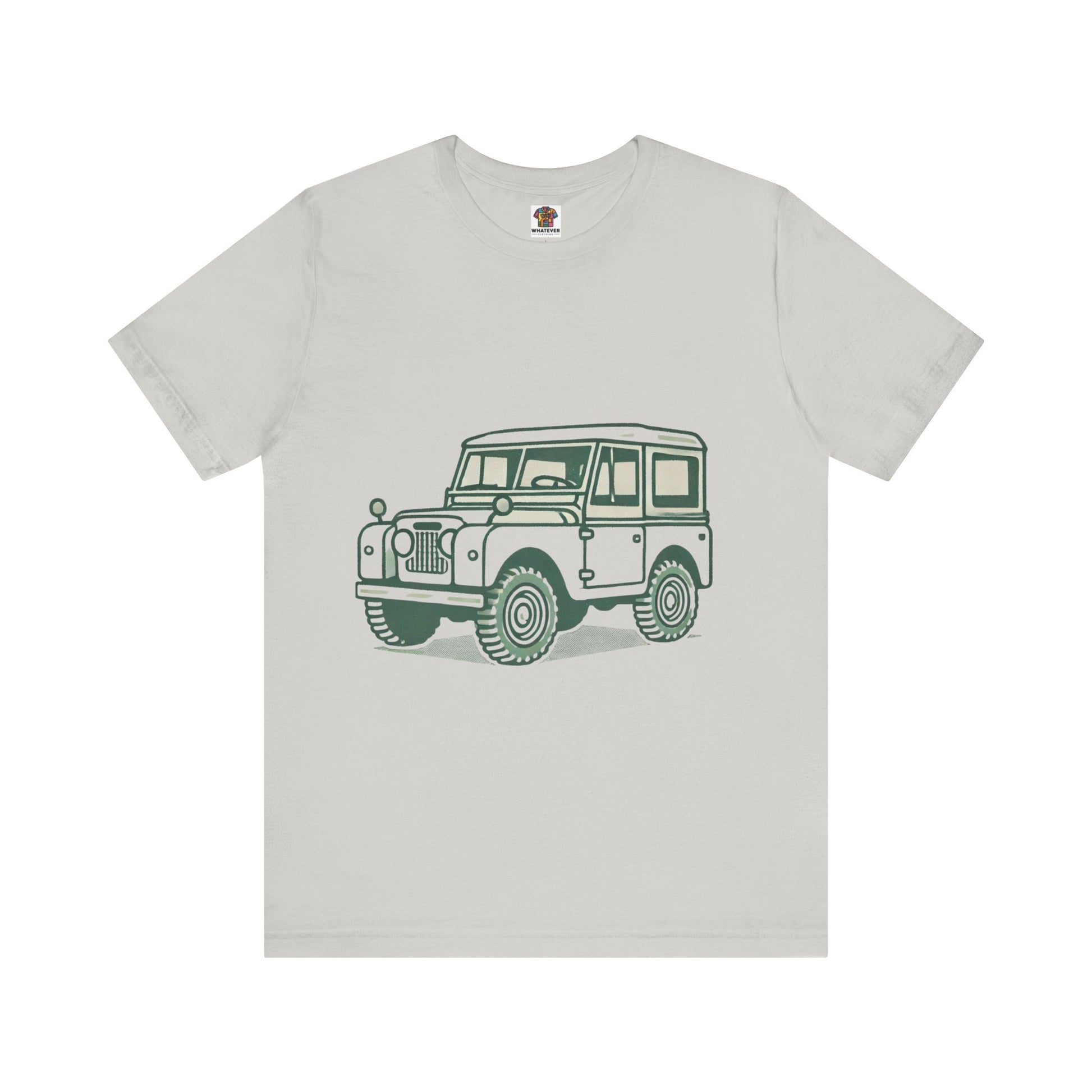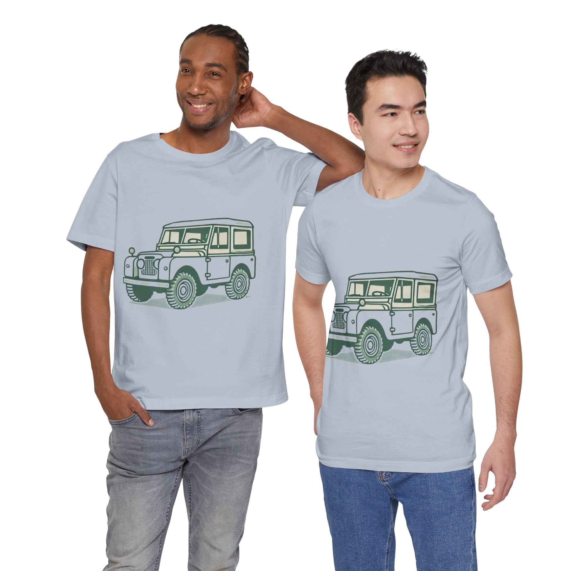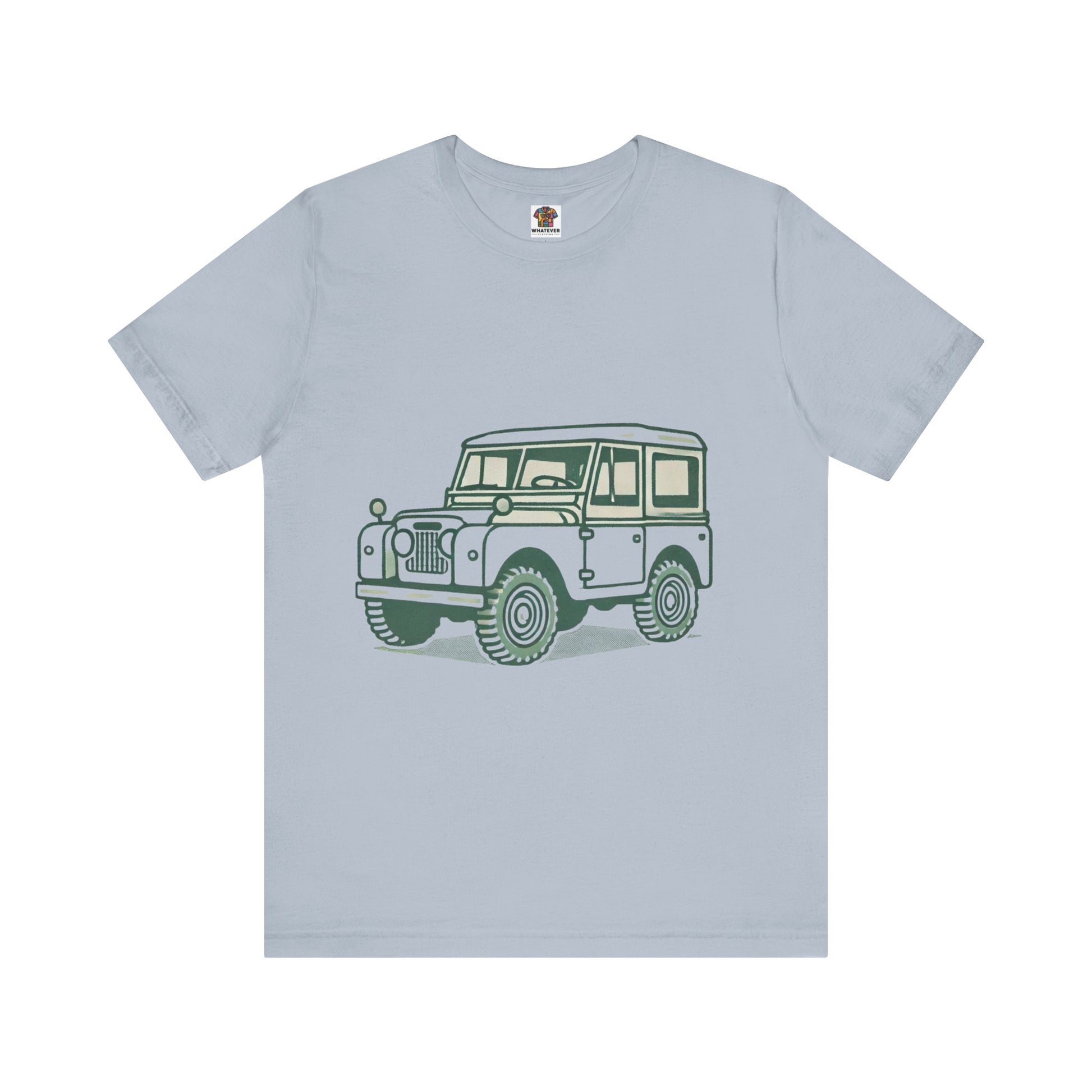 A stylized outline of a vintage off-road vehicle in pastel green and gray, evoking an outdoor, adventurous vibe.
