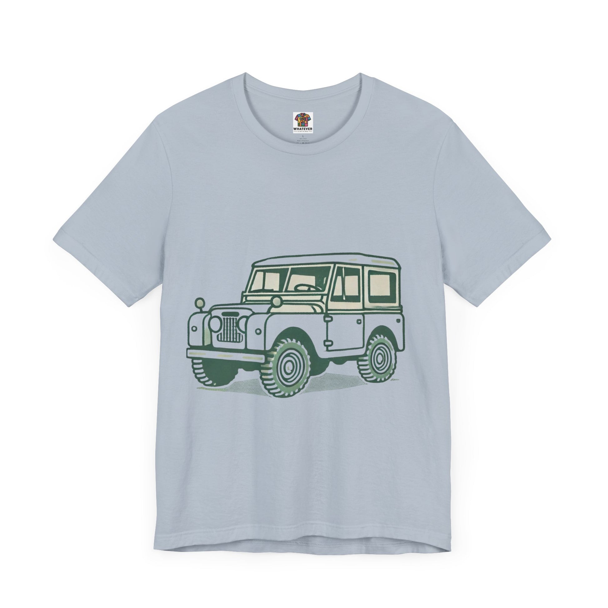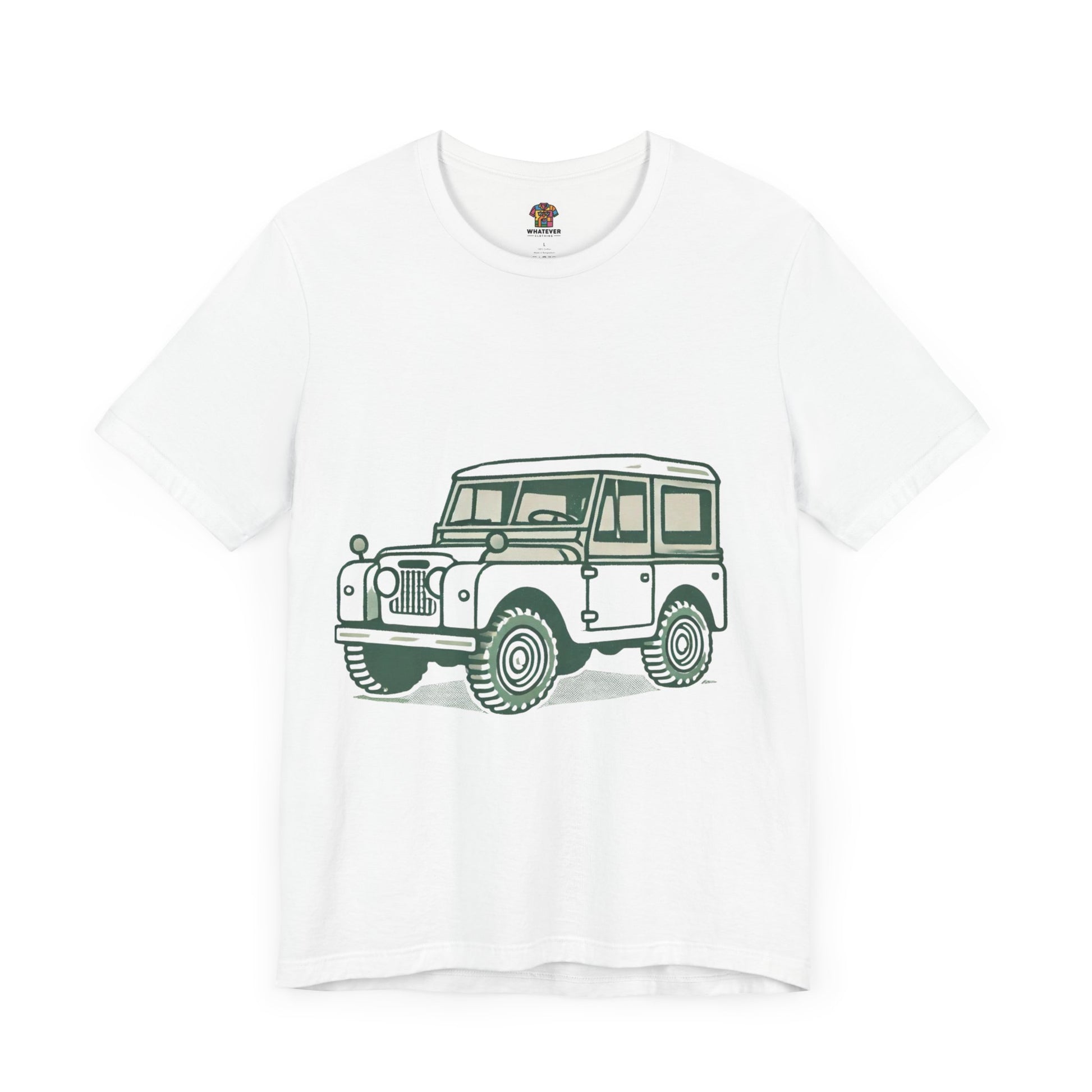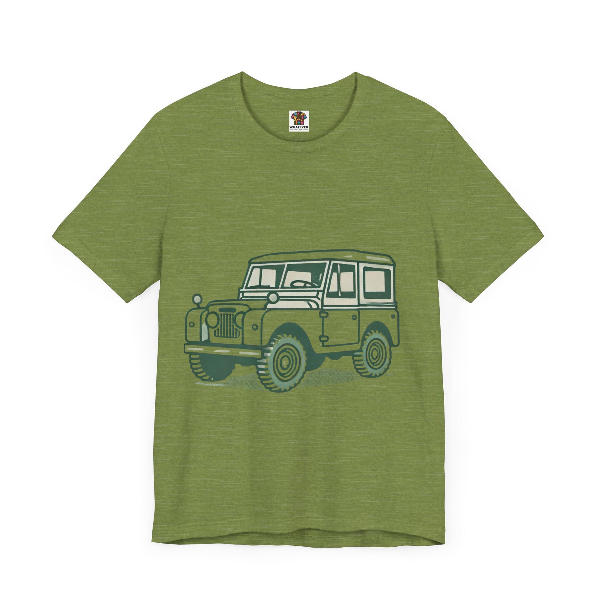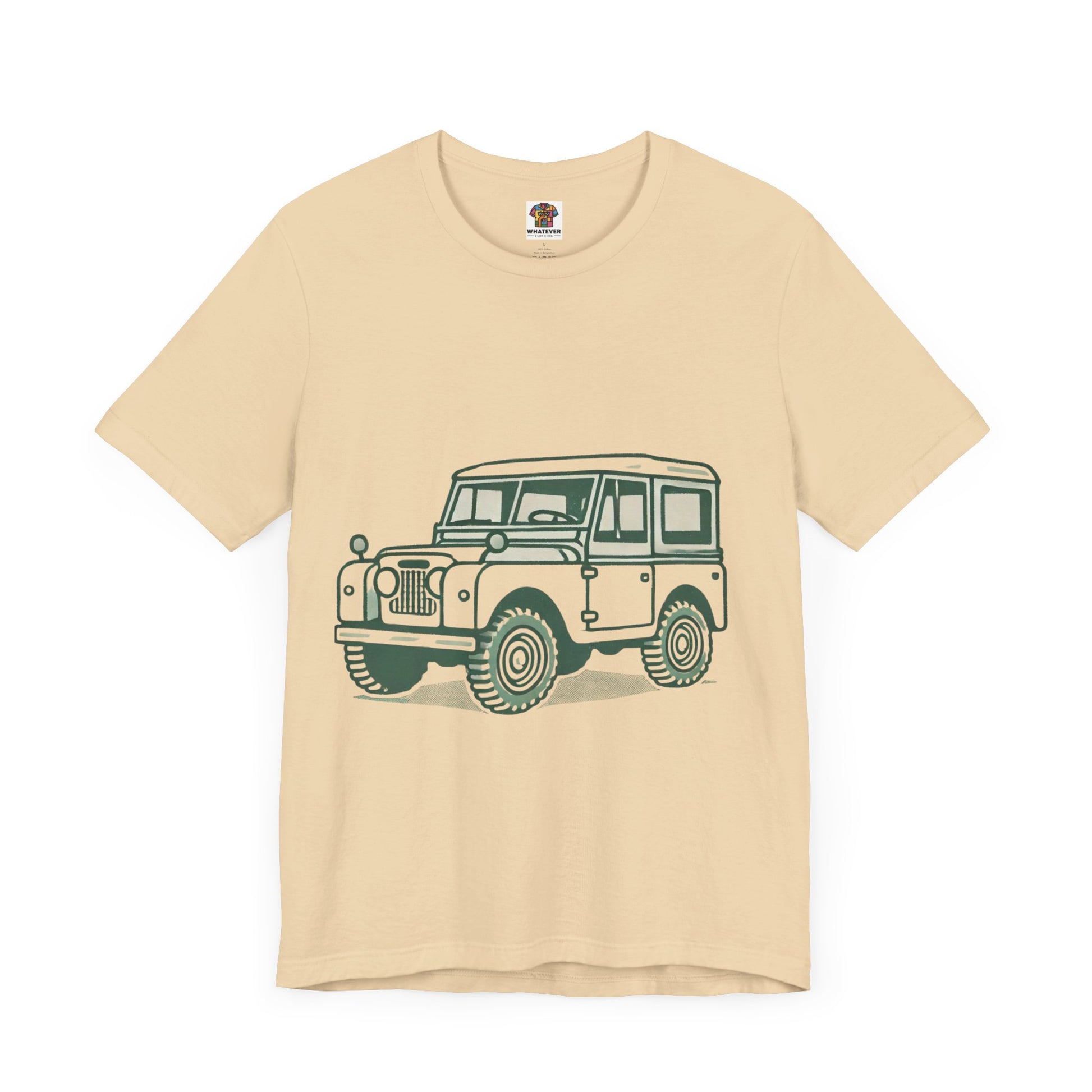 A stylized outline of a vintage off-road vehicle in pastel green and gray, evoking an outdoor, adventurous vibe.