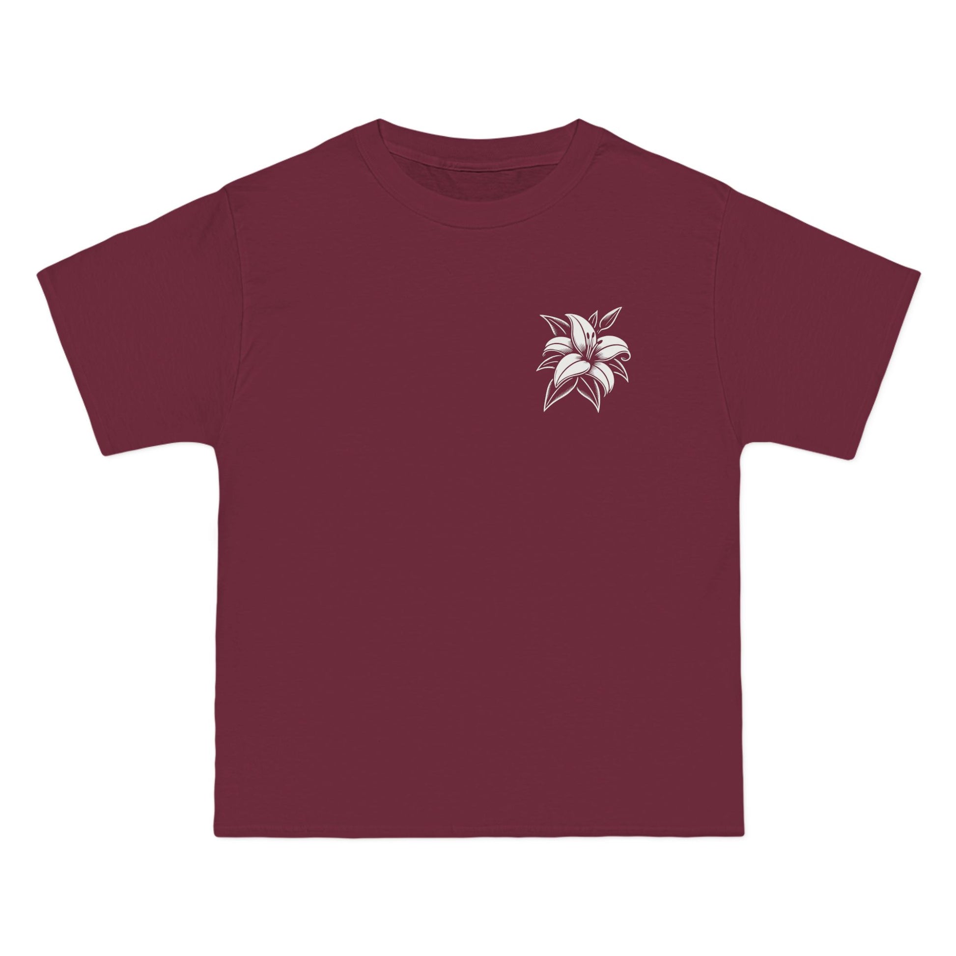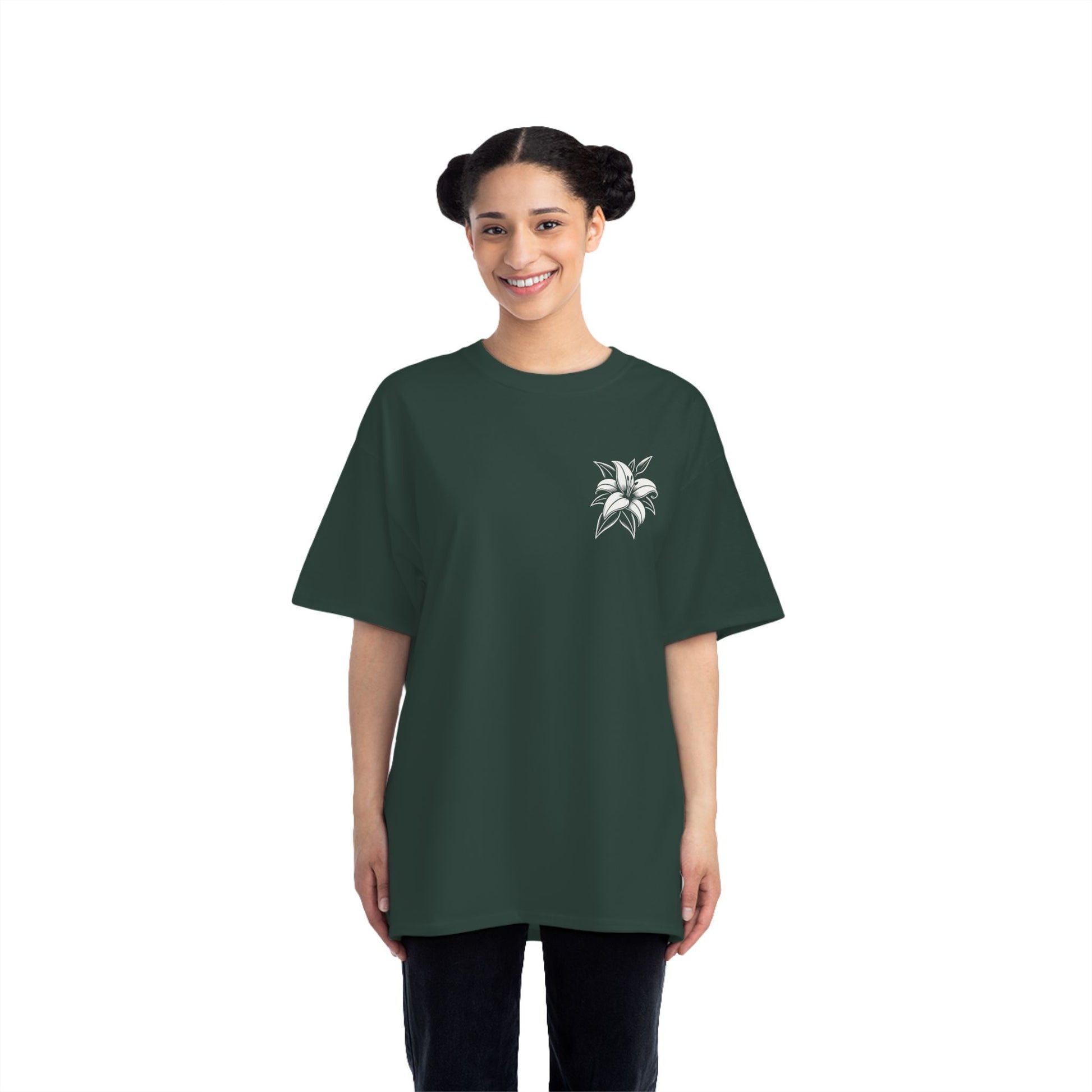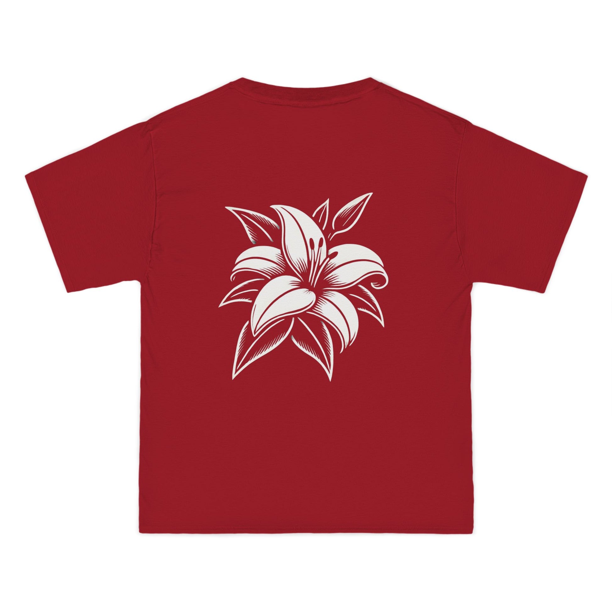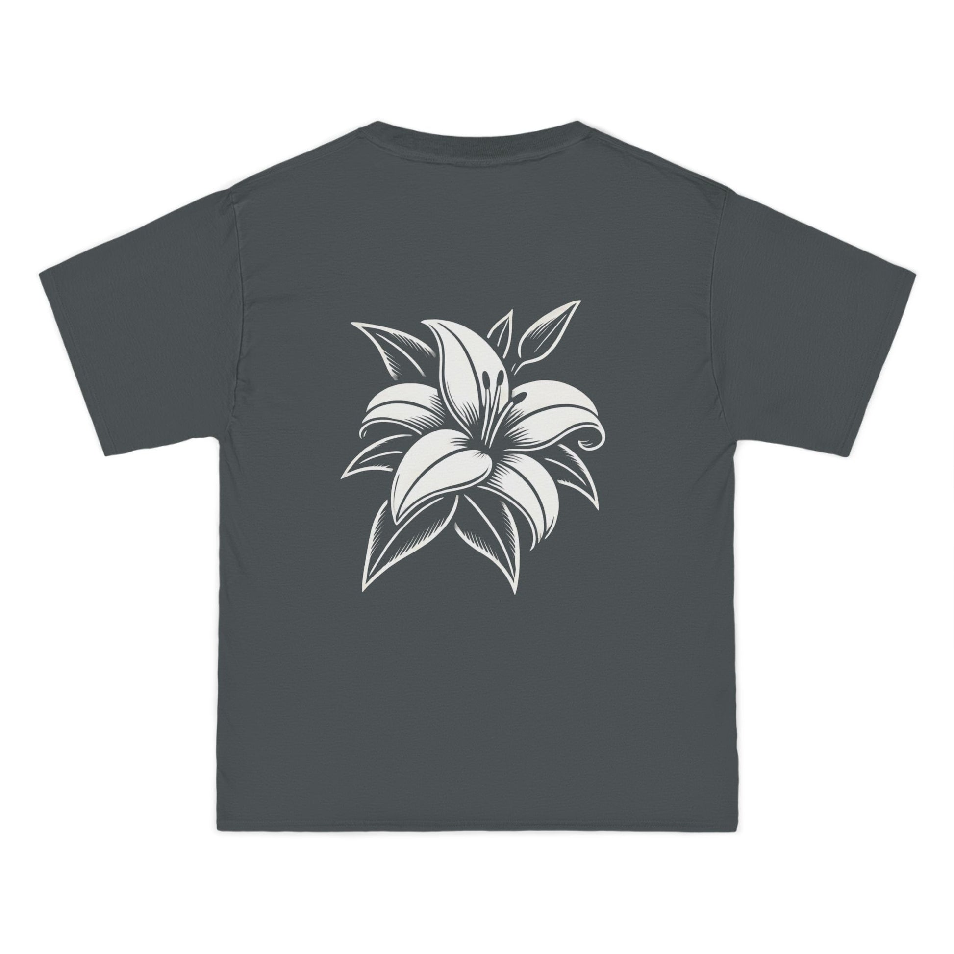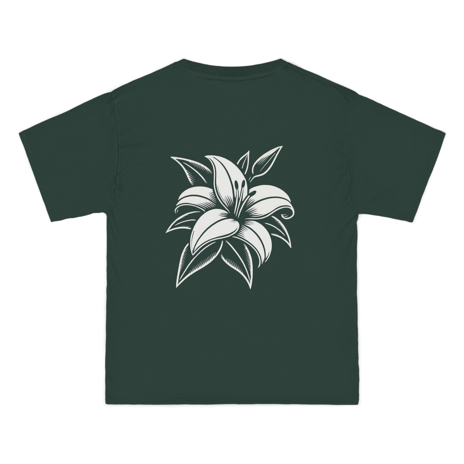 Introducing the White Lily: Gothic Streetwear. A piece that's more than just a top, it's wearable art, a canvas for your individuality. Let the striking white lily with its lush green leaves against a brooding dark background spark your creativity. Rendered in bold, clean lines, it's a design that marries the beauty of nature with the edgy appeal of gothic aesthetic.